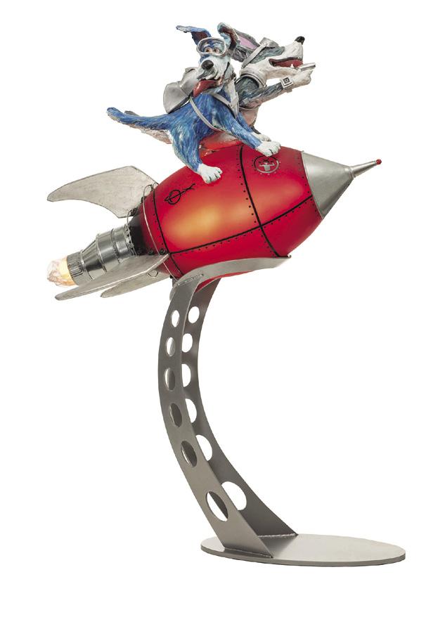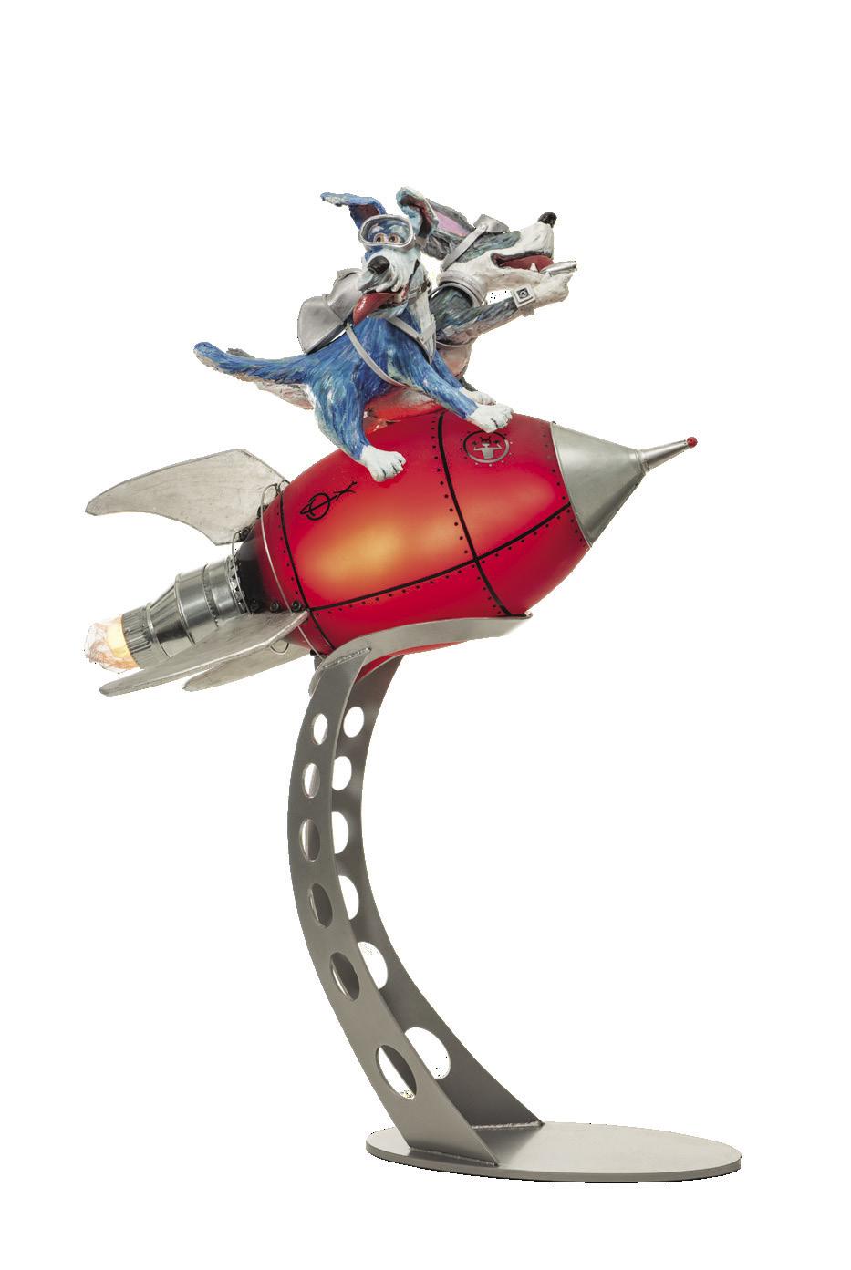 Artist Joyce Curvin works with Duncan McClellan on a glass urn that becomes part of a rocket ship in her whimsical piece called Marz Roverz, left.
