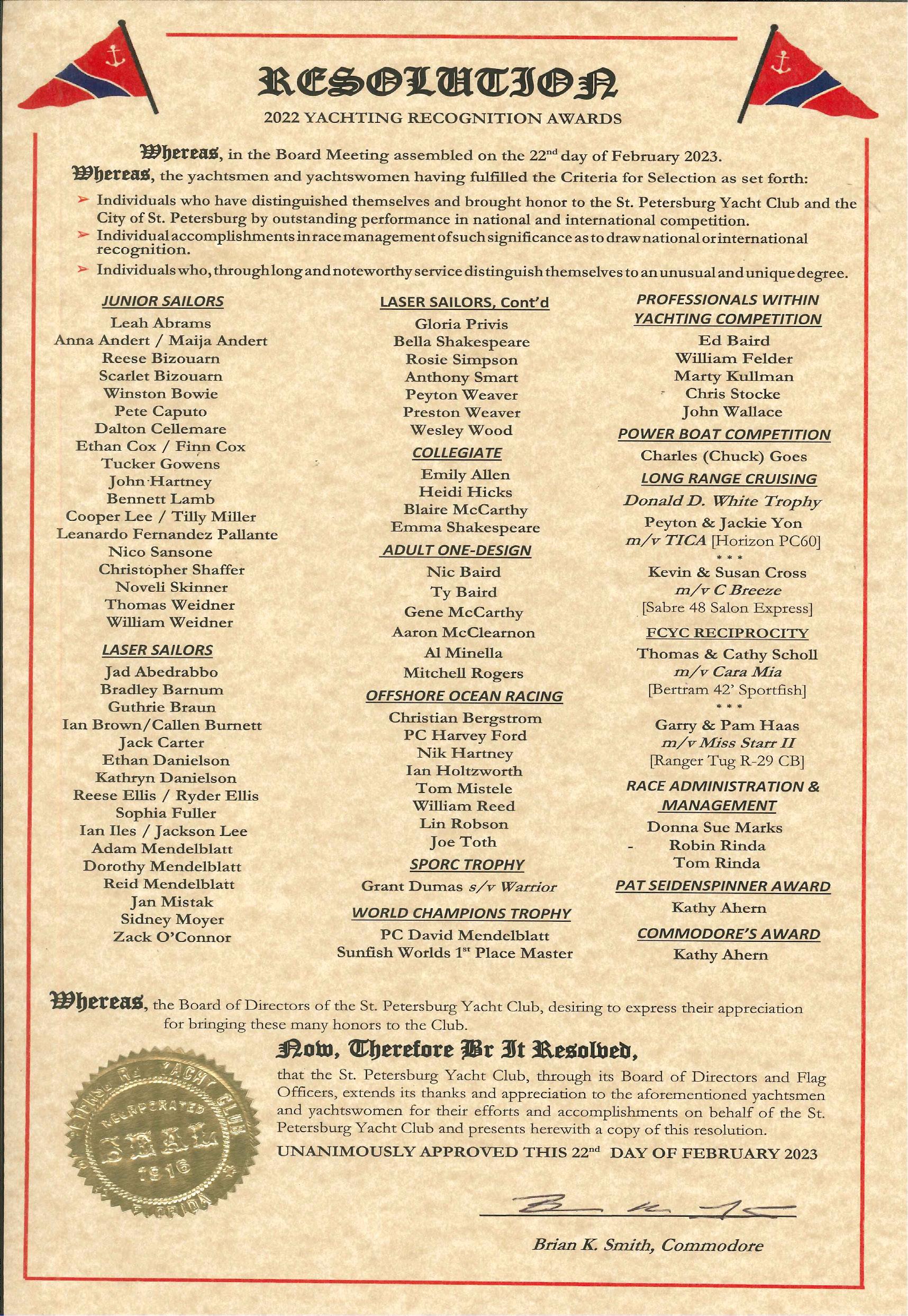 Wbtttas, in the Board Meeting assembled on the 22 nd day of February 2023. Wbtttas, the yachtsmen and yachtswomen having fulfilled the Criteria for Selection as set forth:
