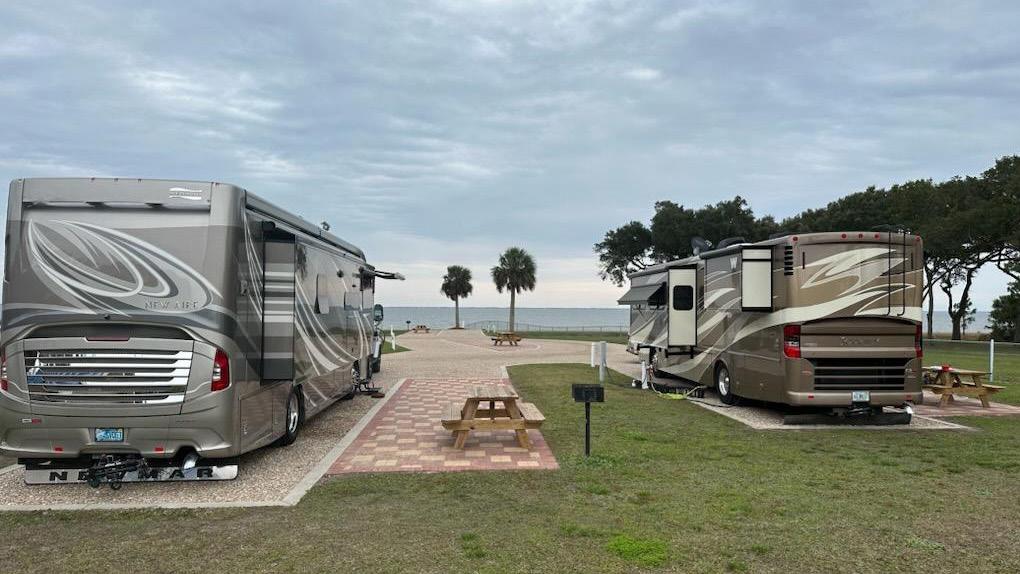 Next stop, Coastline RV Resort up in the panhandle near Apalachicola. There’s nothing like an RV site with a view of the bay! Nearby, they “dined” at a festive Mexican restaurant to celebrate Ken’s Birthday!! You know when it’s your birthday, there’s nothing like a fancy hat and beverage to celebrate!