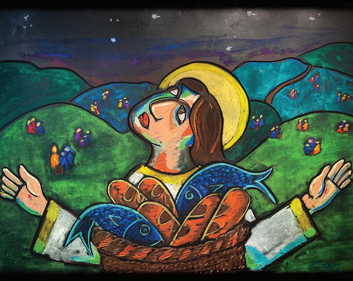 ‘Blessing the Gifts’ (pastel on blackboard): Drawn during a Chapel service on the feeding of the five thousand. As bread and fish overflow in the basket, the image points to God’s abundance — how what we place in his hands becomes more than enough to meet the needs of many.