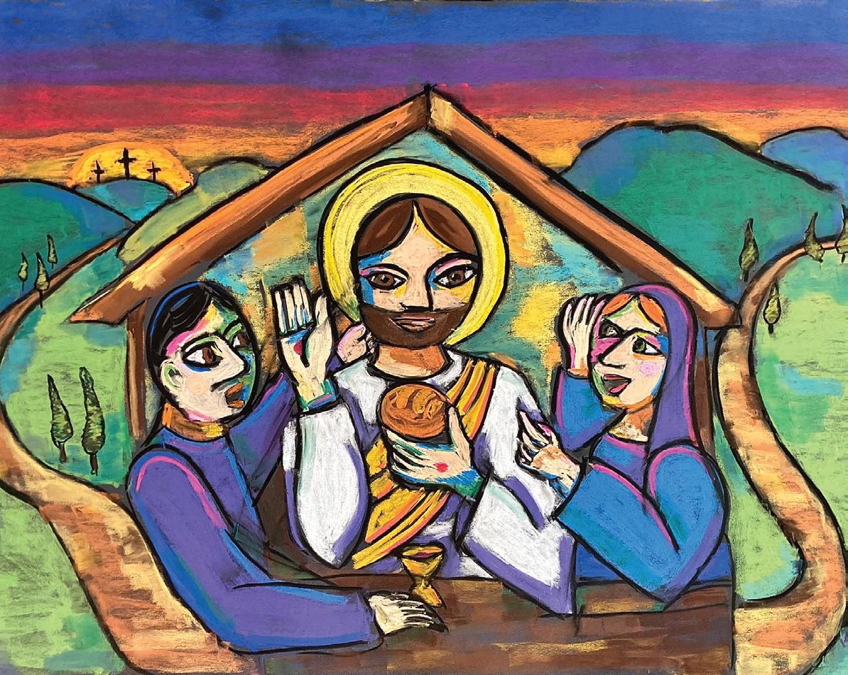 Right from top: ‘Made Known in the Breaking of the Bread’ (pastel on blackboard). Illustrated in real time at a Boarding breakfast as we explored the Emmaus Road encounter. The sunset sky and empty road frame the moment when the risen Jesus is revealed in the breaking of the bread — a reminder that He meets us in the ordinary acts of faith.