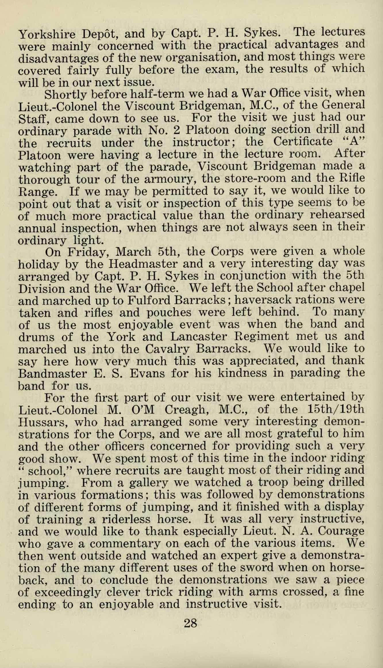 On Friday, March 5th, the Corps were given a whole holiday by the Headmaster and a very interesting day was arranged by Capt. P. H. Sykes in conjunction with the 5th Division and the War Office. We left the School after chapel and marched up to Fulford Barracks ; haversack rations were taken and rifles and pouches were left behind. To many of us the most enjoyable event was when the band and drums of the York and Lancaster Regiment met us and marched us into the Cavalry Barracks. We would like to say here how very much this was appreciated, and thank Bandmaster E. S. Evans for his kindness in parading the band for us.