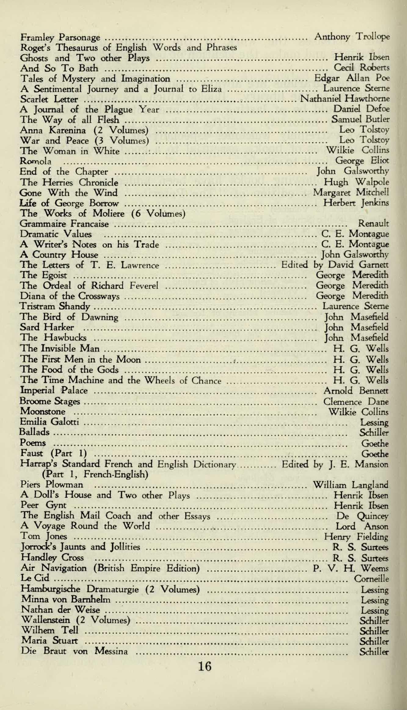 Rognola End of the Chapter The Herries Chronicle Gone With the Wind Life of George Borrow The Works of Moliere (6 Volumes) Grammaire Francaise Dramatic Values A Writer's Notes on his Trade A Country House The Letters of T. E. Lawrence The Egoist The Ordeal of Richard Feverel Diana of the Crossways Tristram Shandy The Bird of Dawning Sard Harker The Hawbucks Henrik Ibsen Cecil Roberts Edgar Allan Poe Laurence Sterne Nathaniel Hawthorne Daniel Defoe Samuel Butler Leo Tolstoy Leo Tolstoy Wilkie Collins George Eliot John Galsworthy Hugh Walpole Margaret Mitchell Herbert Jenkins