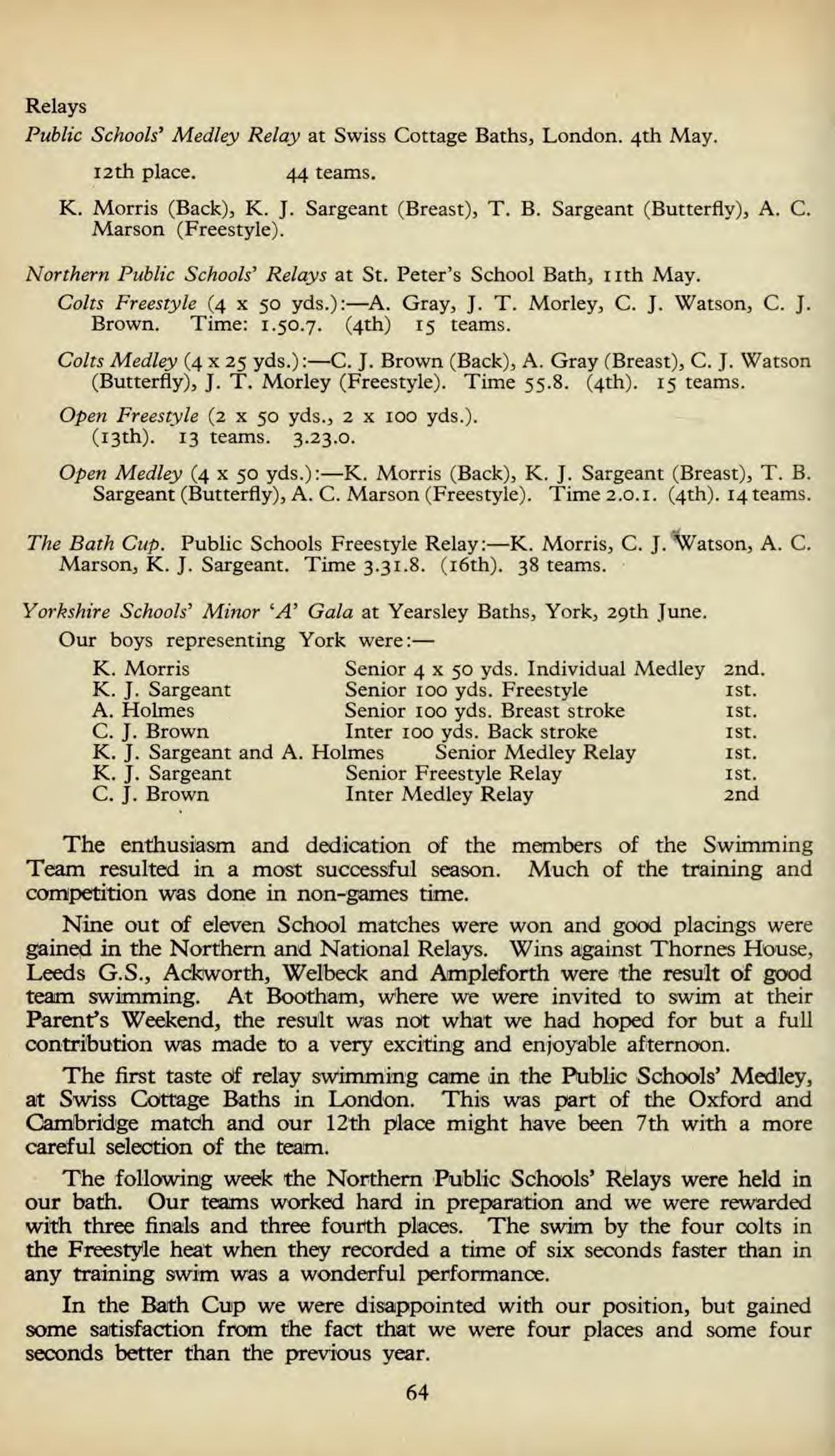 Nine out of eleven School matches were won and good placings were gained in the Northern and National Relays. Wins against Thornes House, Leeds G.S., Ackworth, Welbeck and Ampleforth were the result of good team swimming. At Bootham, where we were invited to swim at their Parent's Weekend, the result was not what we had hoped for but a full contribution was made to a very exciting and enjoyable afternoon.