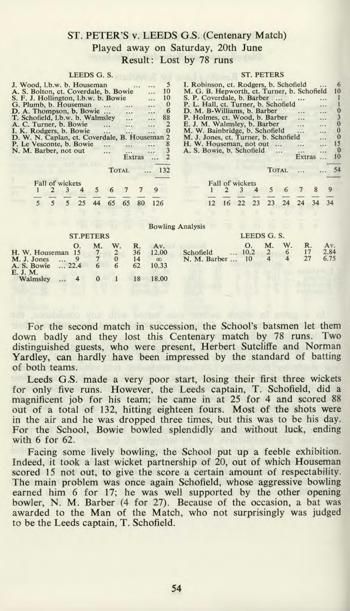 Facing some lively bowling, the School put up a feeble exhibition. Indeed, it took a last wicket partnership of 20, out of which Houseman scored 15 not out, to give the score a certain amount of respectability. The main problem was once again Schofield, whose aggressive bowling earned him 6 for 17; he was well supported by the other opening bowler, N. M. Barber (4 for 27). Because of the occasion, a bat was awarded to the Man of the Match, who not surprisingly was judged to be the Leeds captain, T. Schofield.