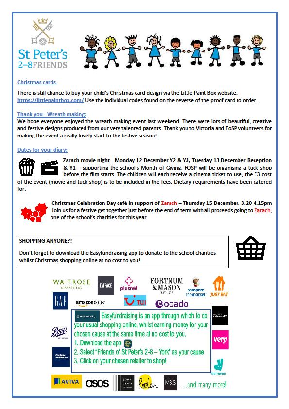 Children should bring £3 for the film and tuck shop. Friends of ST Peter’s 2-8 will run the tuck shop. School will provide treats for children with allergies.