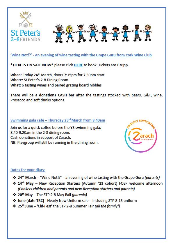 Next Friday we will be celebrating Red Nose Day by wearing home clothes. We will place a donation bucket on the reception counter and we are suggesting that children can give a £1 donation in support of Comic Relief. The Friends of St Peter’s 2-8 have also organised a Wine Tasting evening on Friday 24th March in the dining hall. This promises to be a very enjoyable evening, and should you wish to pop along you can purchase a ticket here.
