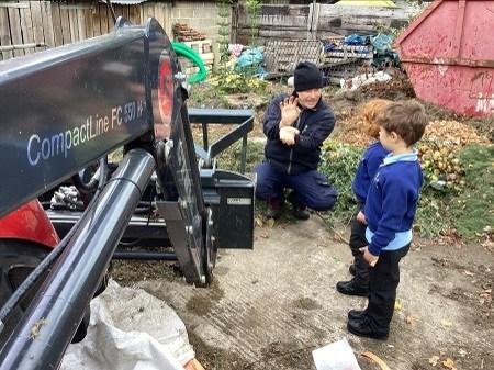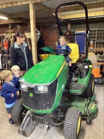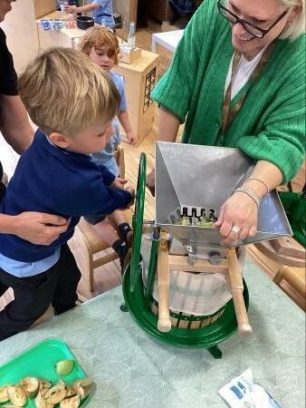 We’ve practised our cutting skills with spaghetti and mask making, searched for signs of Autumn, taken photos with the iPads, collected more apples, picked blackberries AND got to sample them straight away! Yum! We even made our very own apple juice this week, with an apple press kindly brought in by our friend Rowan. To top off the week we had a spontaneous visit over to the yard where all the tractors are kept. The lovely Facilities Assistants gave us a tour of the sheds and all the different vehicles, and best of all we got to press the VERY loud horn!