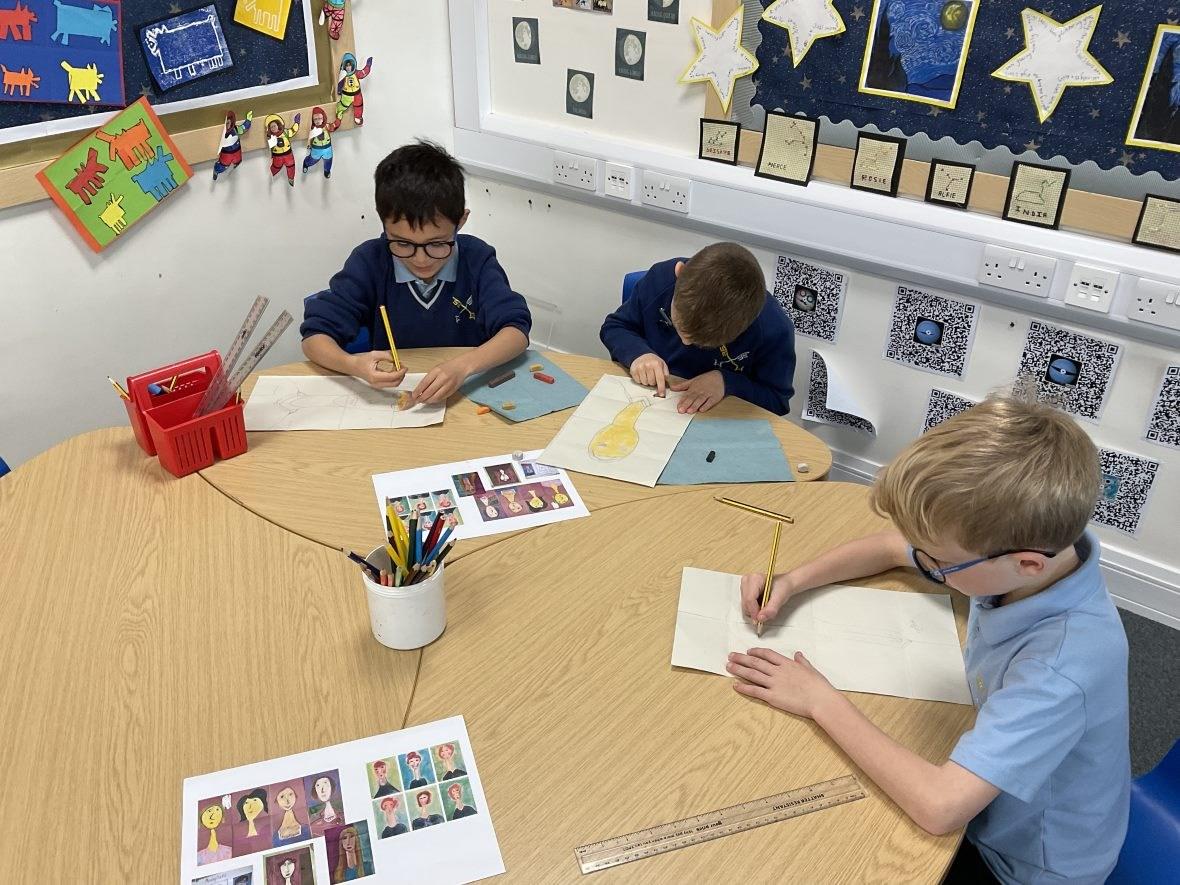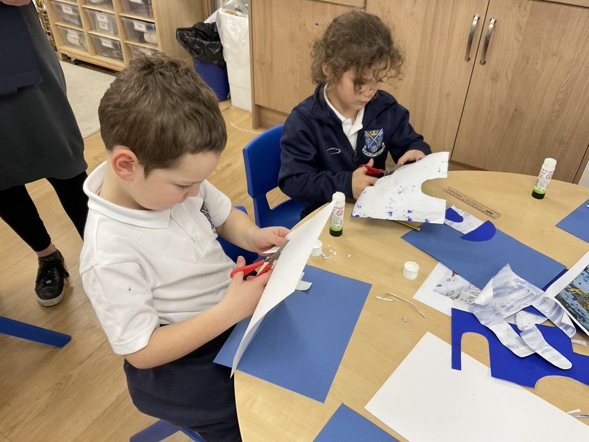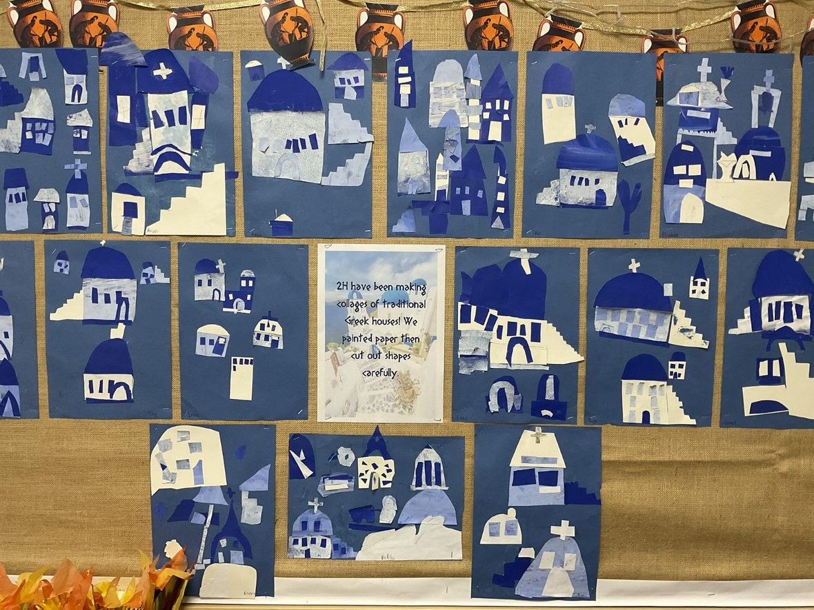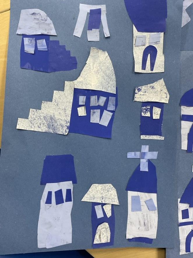 Yesterday 2J excitedly visited the 13 18 Art Department for their clay workshop and they can't wait to get their fired back from the kiln. In art this week we were inspired by the blue and white villages of the Greek islands like Santorini. children used different shades of blue and white paper to create village collages which I think you'll all agree look striking.