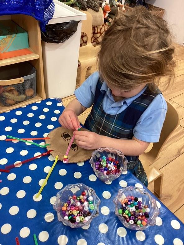 The Acorns have had an extraordinary week. Each of them has been involved in the making of our filmed Nativity. We cannot wait to see the end result! We took the film crew, the packed lunches (to keep the energy levels up as filming is tiring business!), the cast and all the props to the Museum gardens for the making of the film. It was such a brilliant experience. There are still some final touches needing to be made but we are getting very excited for the production in just over a weeks time. Along side our filming, we have been making dens in the classroom and playing with the toys inside the den. We have done some very complicated threading which has helped our fine motor skills. The Acorns have loved giving their little people some coloured beads for a groovy hairstyle.