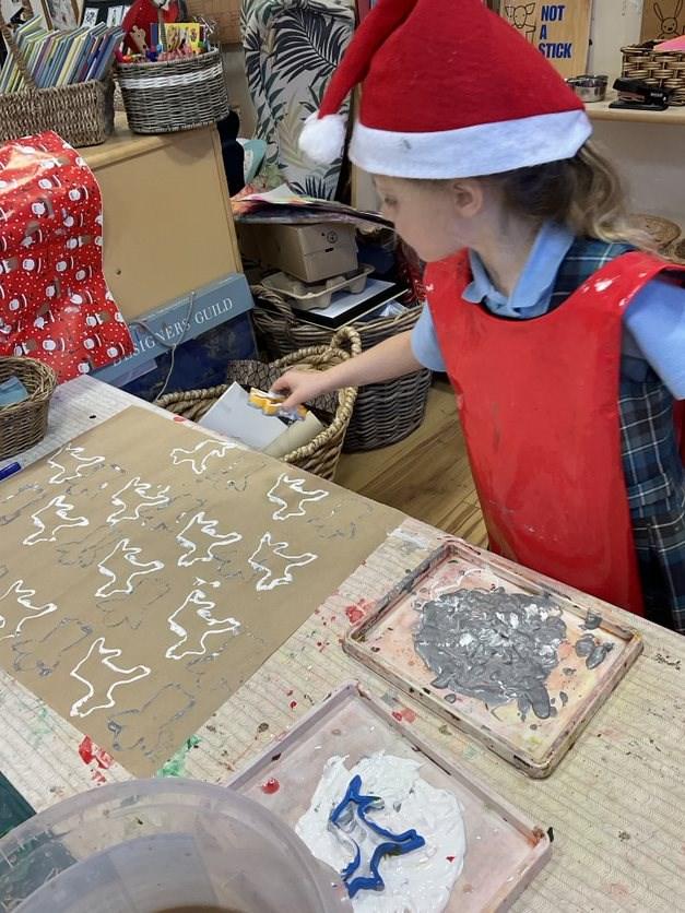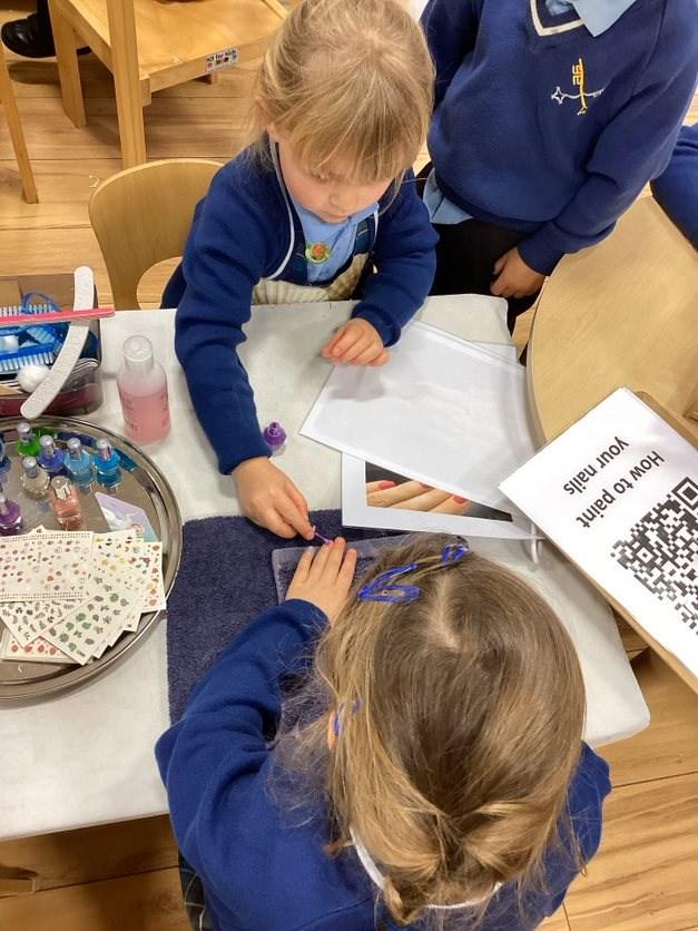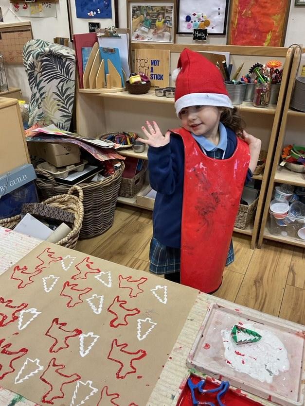 Apologies! We regret to inform you that there are no appointments left at the Conkers nail salon. The independent play, that started in the home corner last week, has certainly taken centre stage this week. The children took turns on reception, painting their friends nails, or best of all being pampered ourselves with the real nail varnish and snazzy nail stickers. Whilst waiting for their appointments the Conkers have not been sitting idle, we have made our own Christmas wrapping paper, baked pizzas and also been spotted sneaking around school finding shapes. Phew!