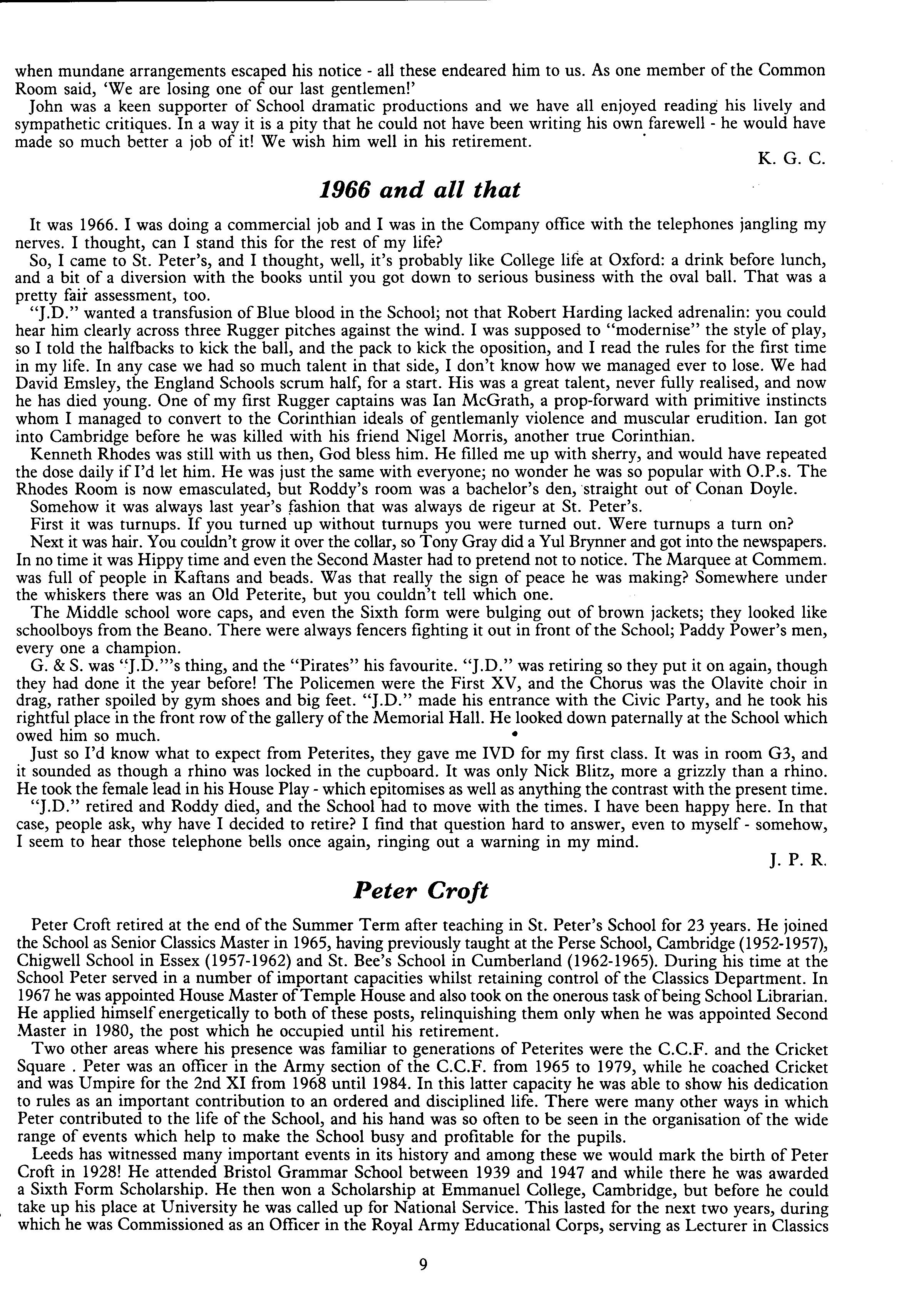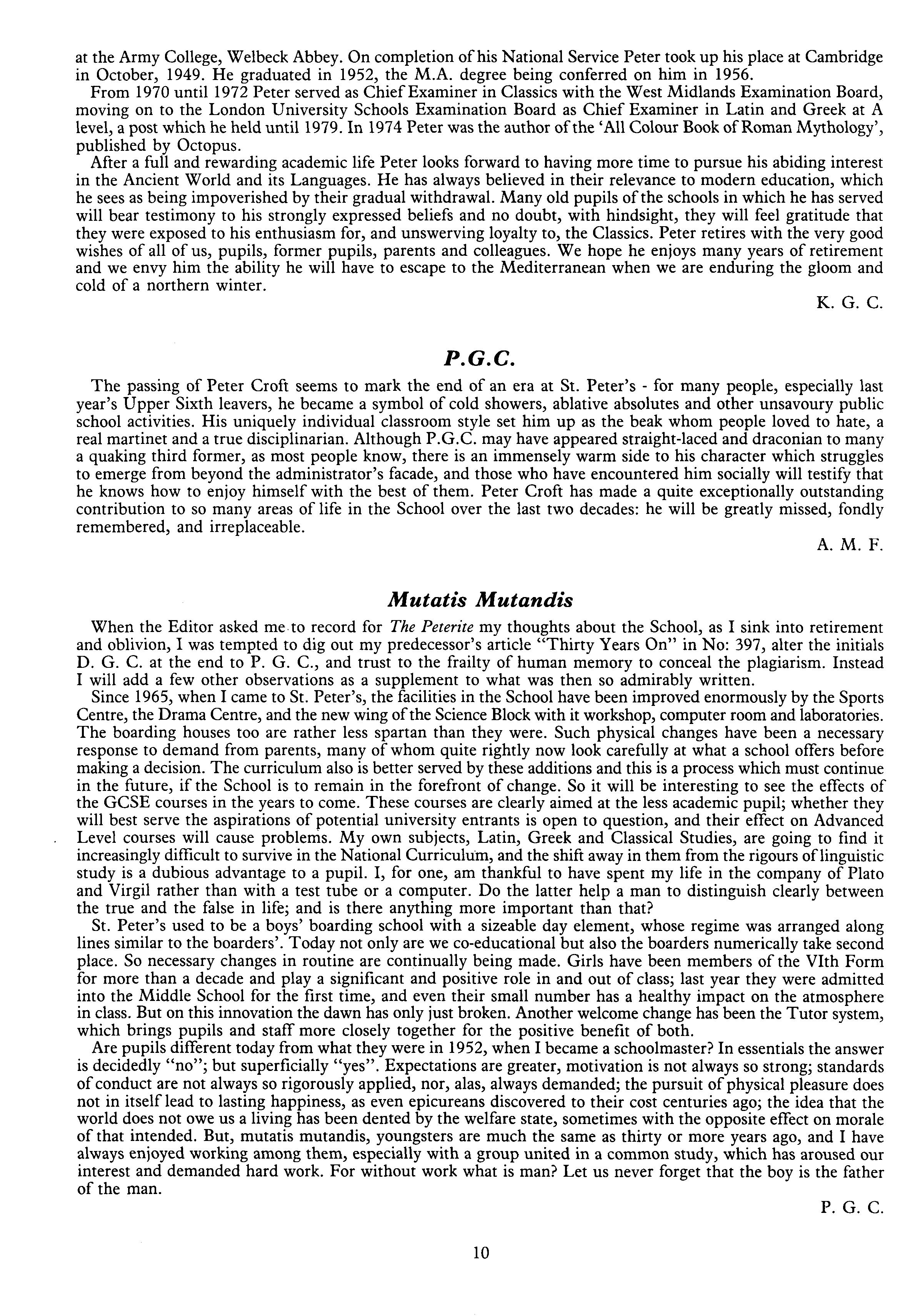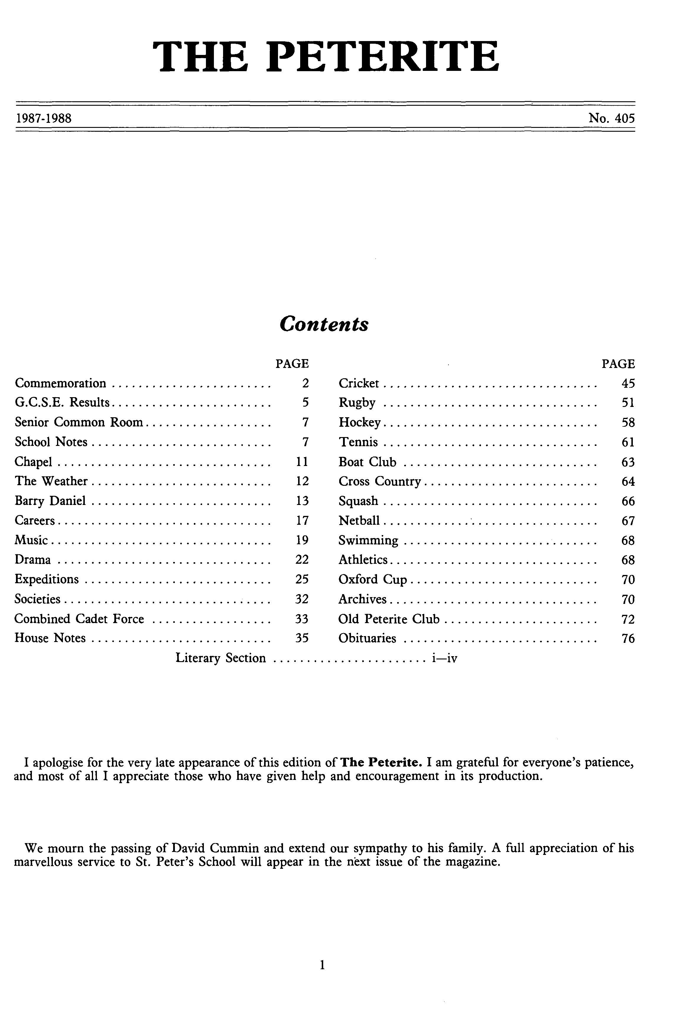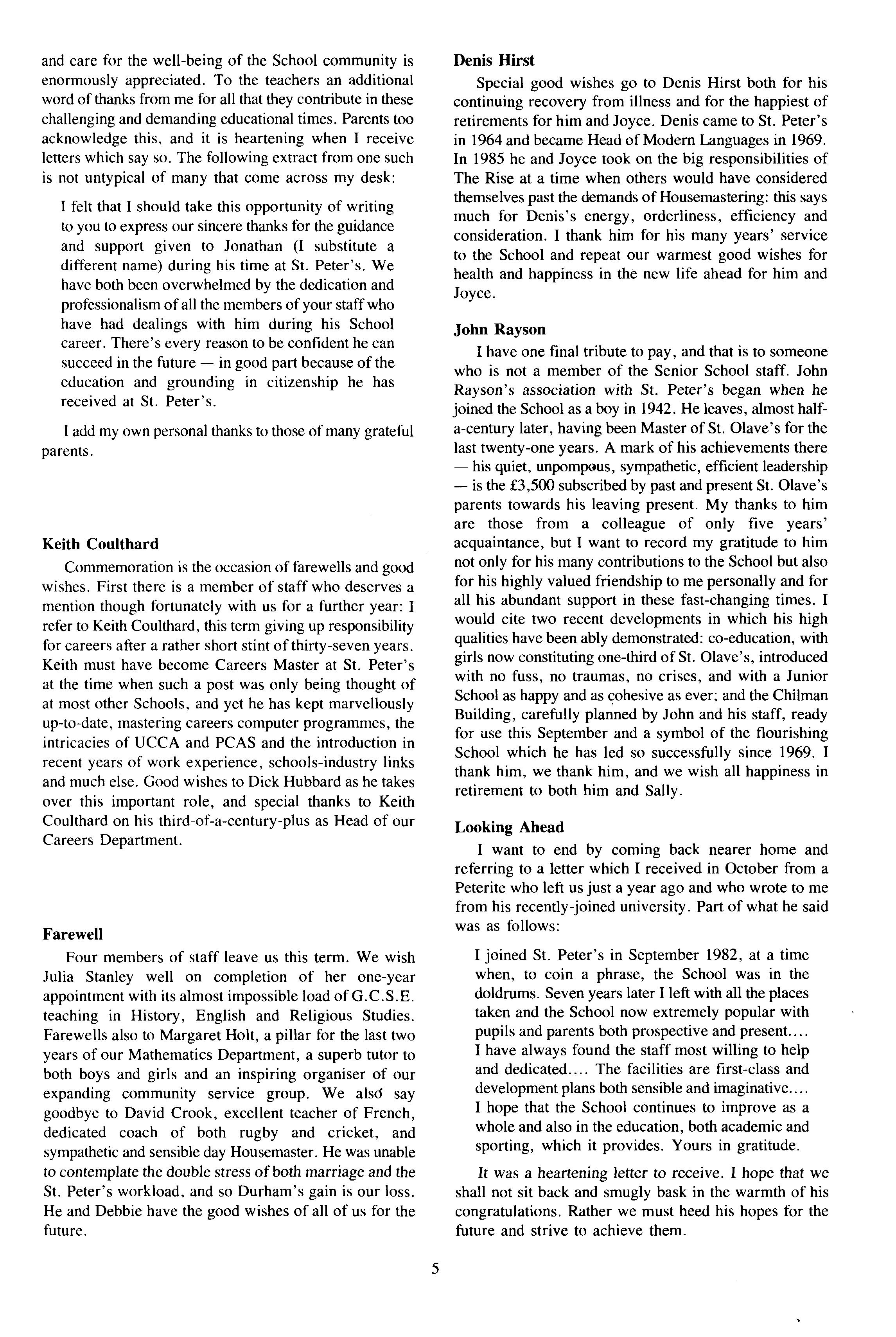 These then are exciting times to be concerned with education: nationally we have new exams, new ideas, new professional demands; and at St Peter's the future beckons with new challenges and new opportunities to be recognised, responded to and developed To preserve alone and not to improve - there lies the easy, complacent path which will surely lead to atrophy and eventual ruin We cannot keep things fixed when all the world (not least the world of education) is in eternal progress And it is to this task - the continuing improvement ofthis great and ancient school - that I as Head Master am dedicated."