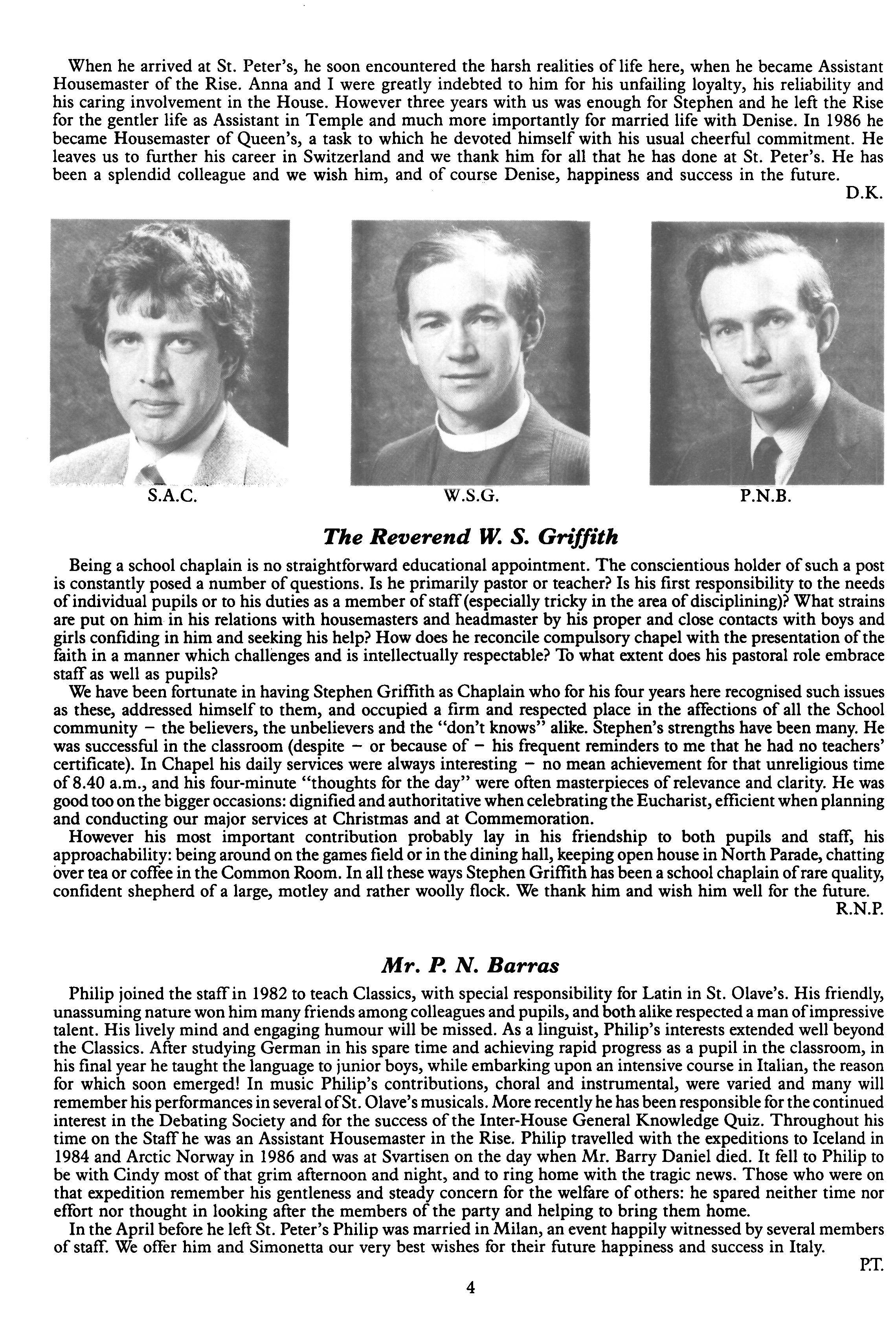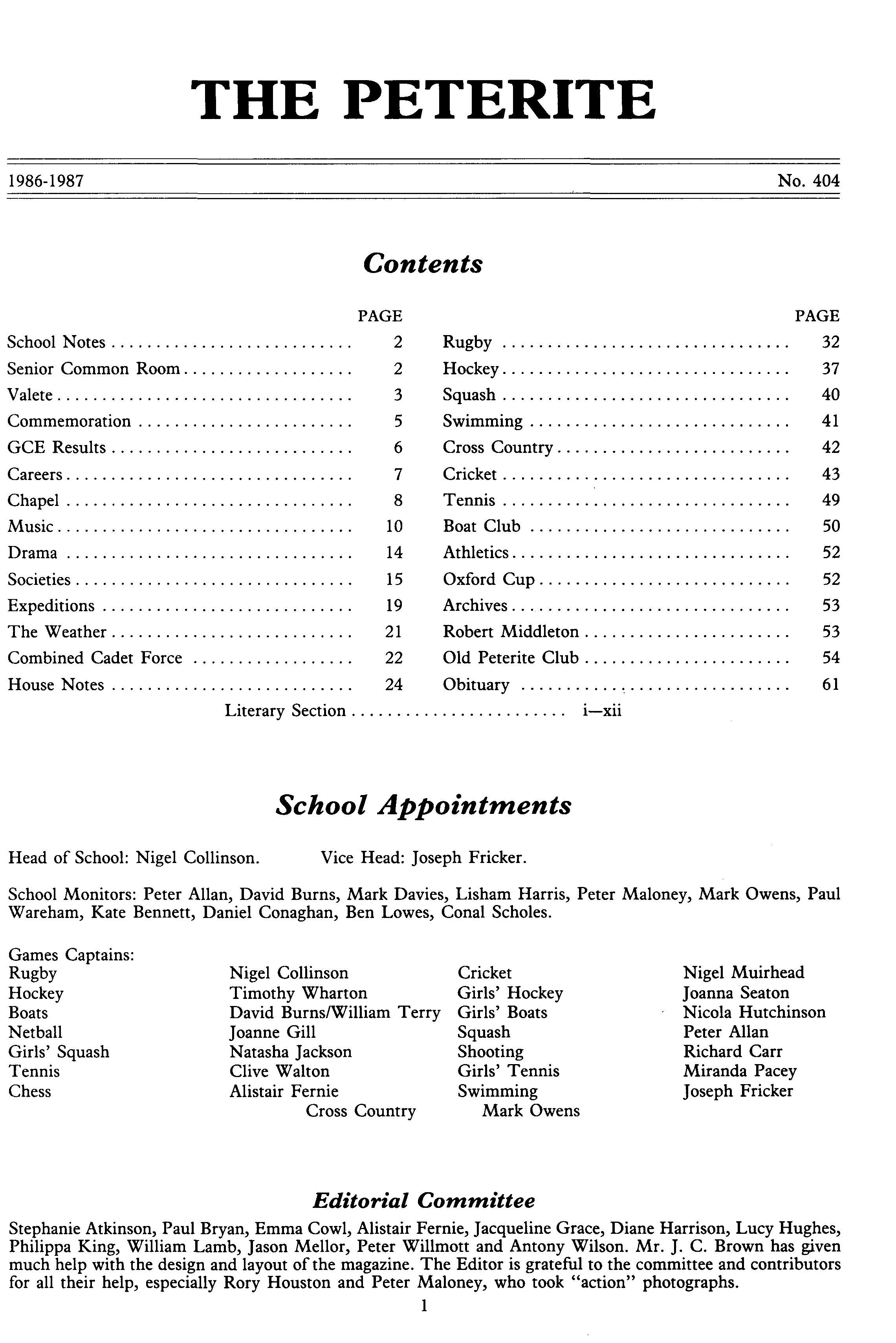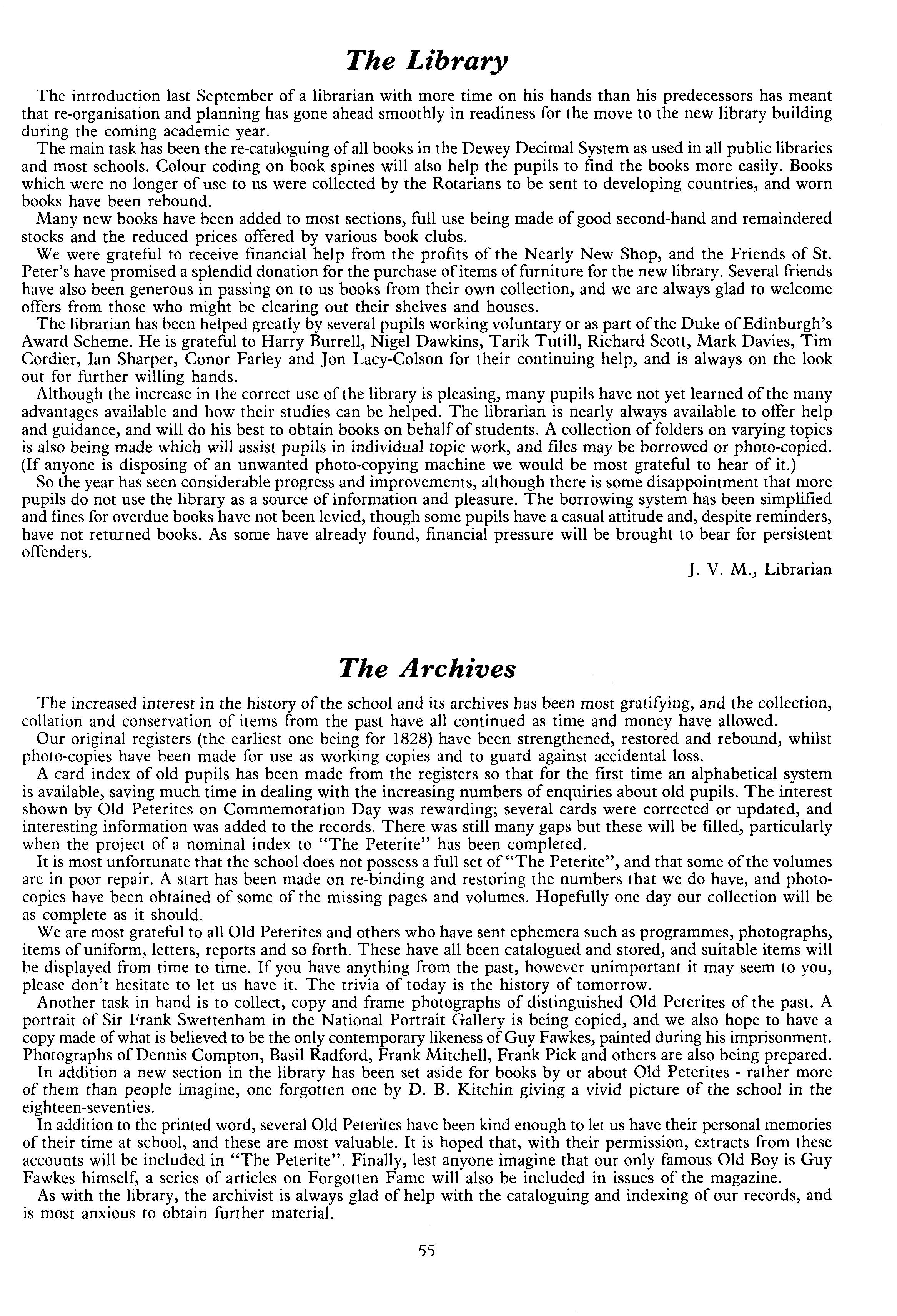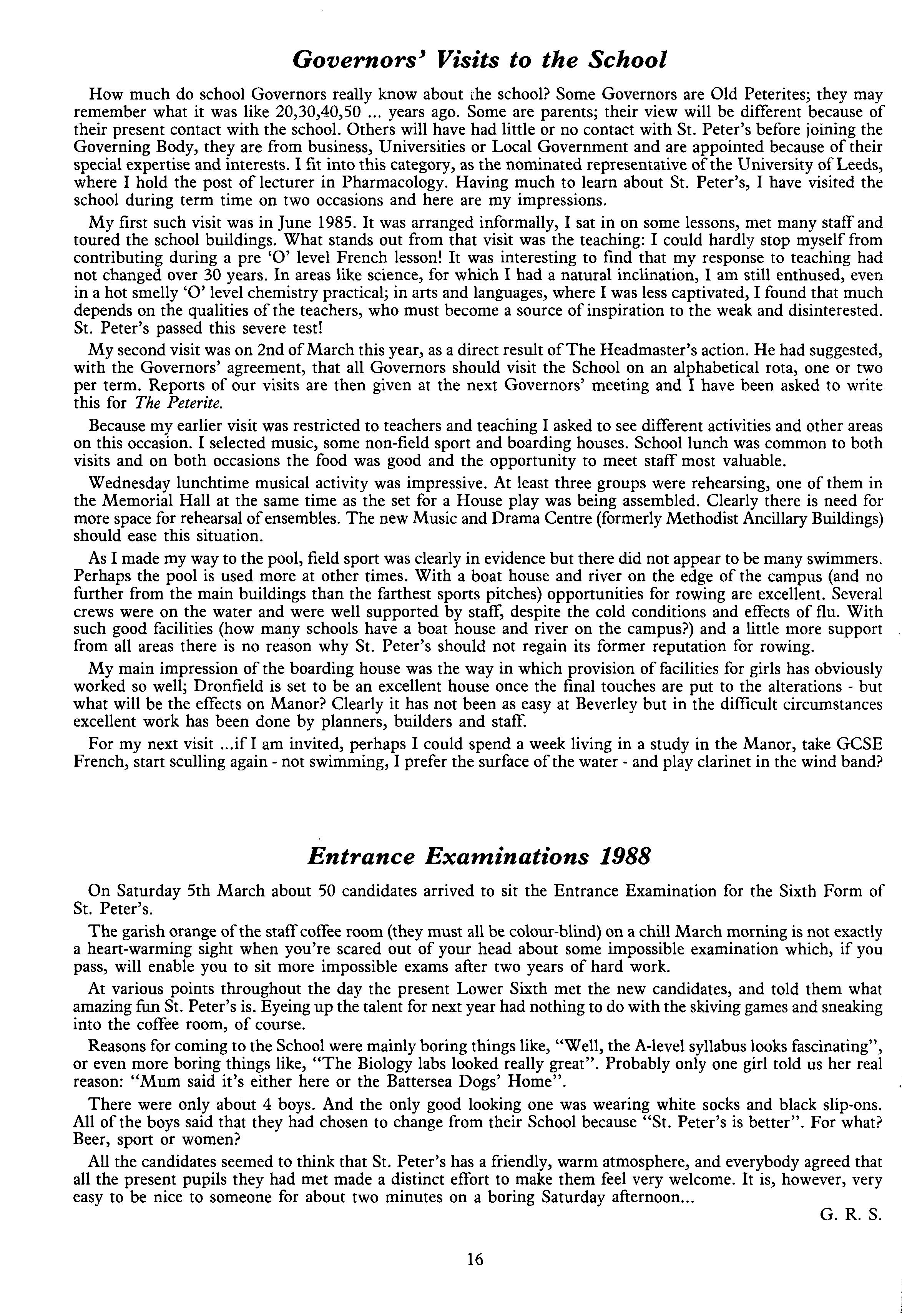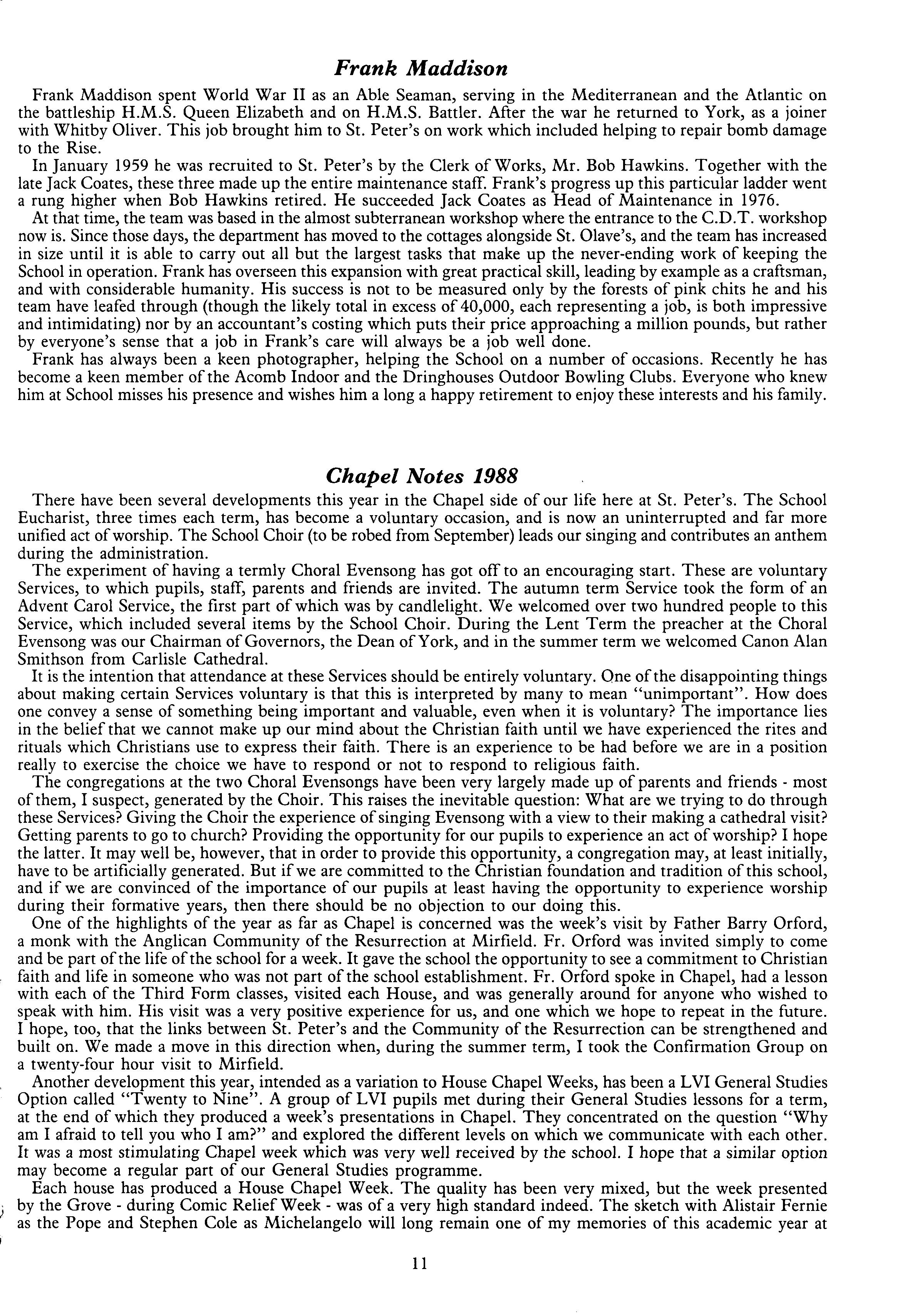 These then are exciting times to be concerned with education: nationally we have new exams, new ideas, new professional demands; and at St Peter's the future beckons with new challenges and new opportunities to be recognised, responded to and developed To preserve alone and not to improve - there lies the easy, complacent path which will surely lead to atrophy and eventual ruin We cannot keep things fixed when all the world (not least the world of education) is in eternal progress And it is to this task - the continuing improvement ofthis great and ancient school - that I as Head Master am dedicated."