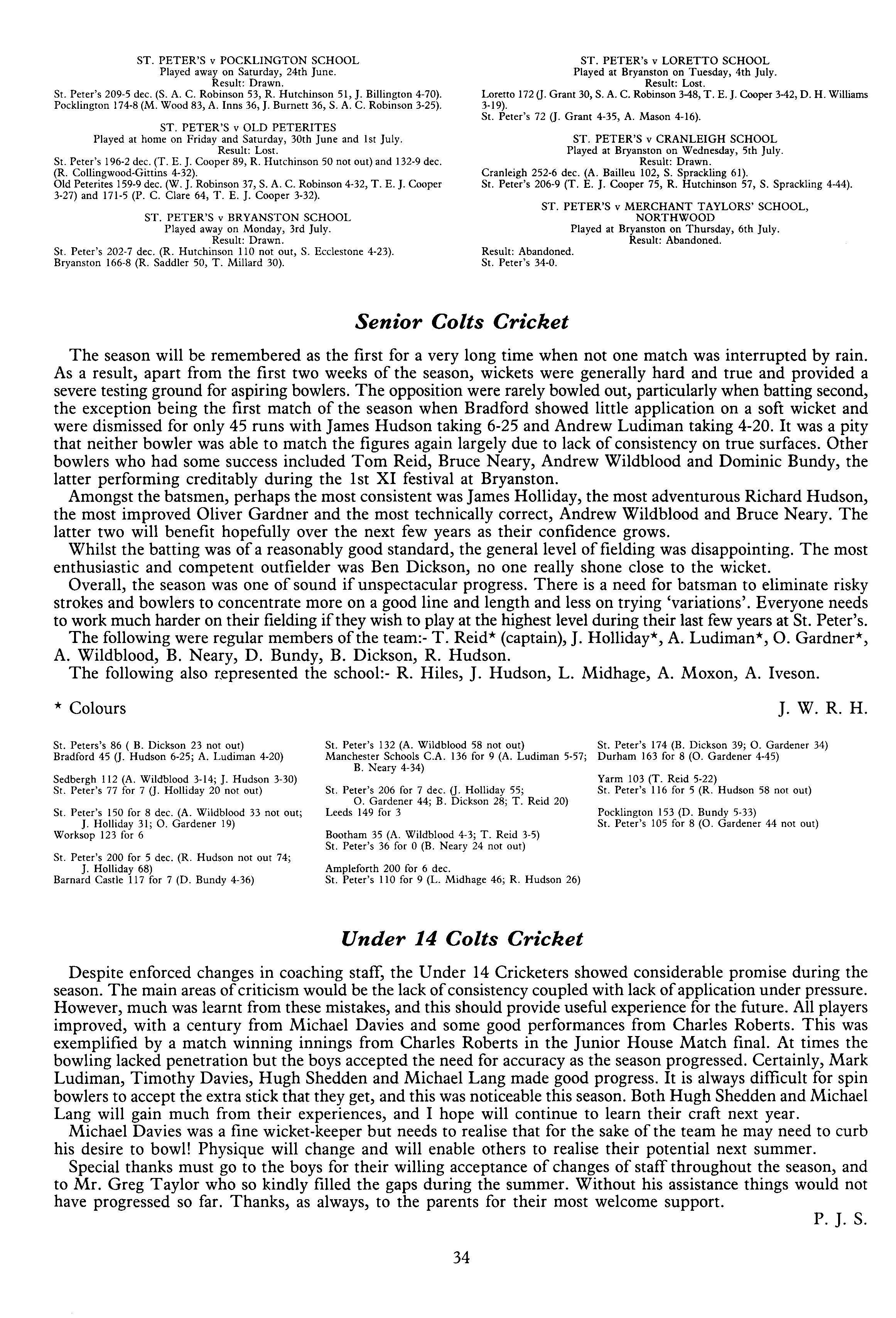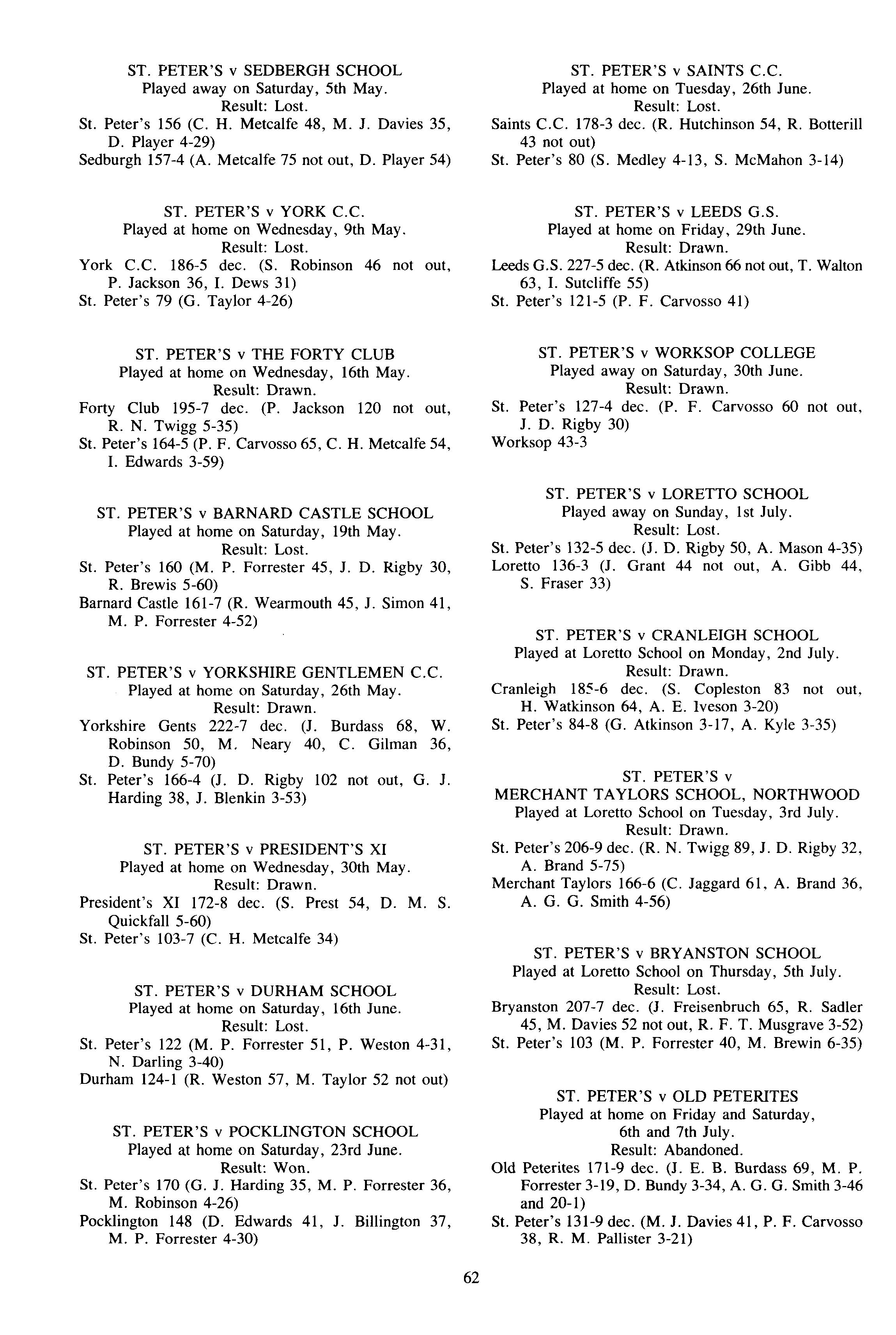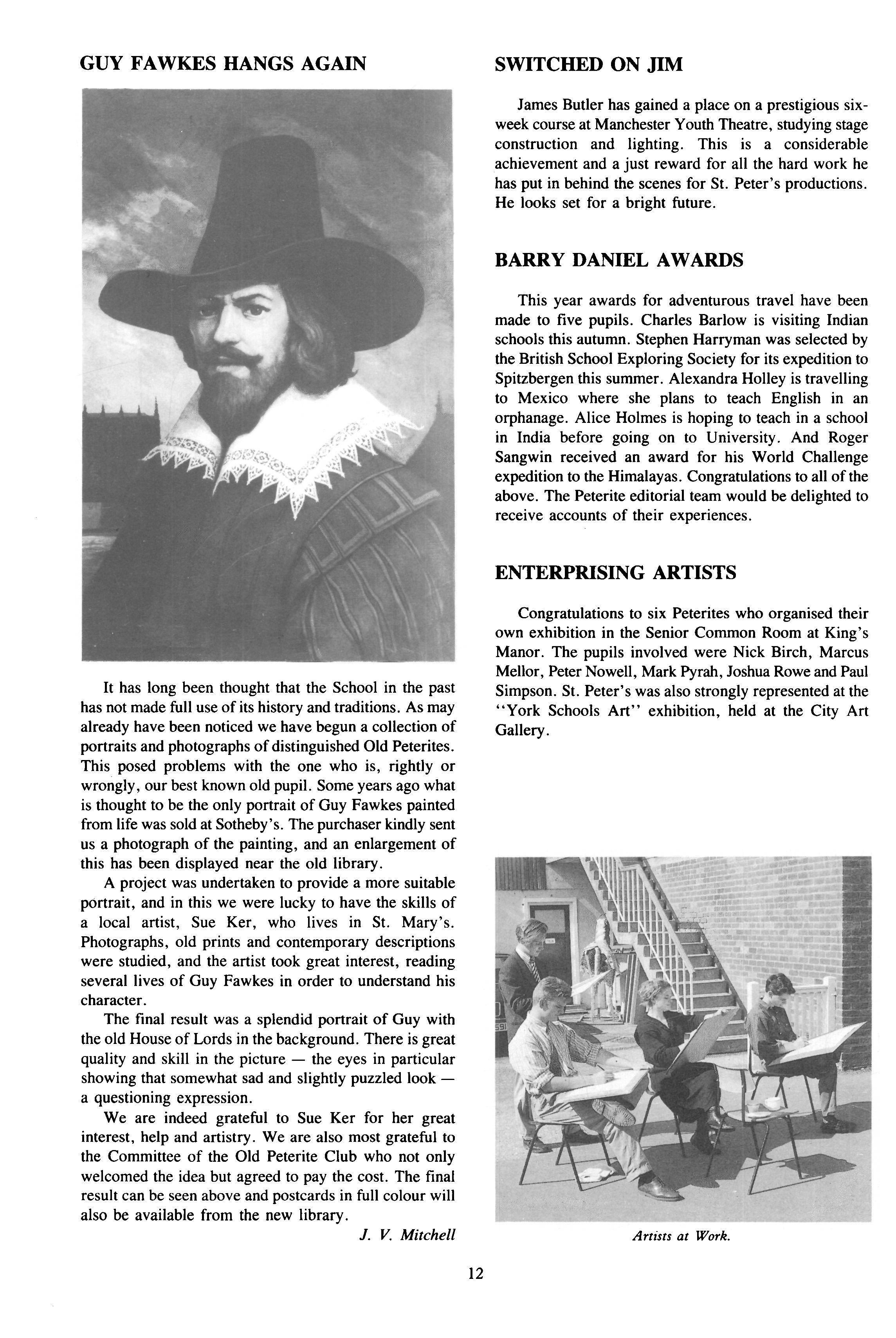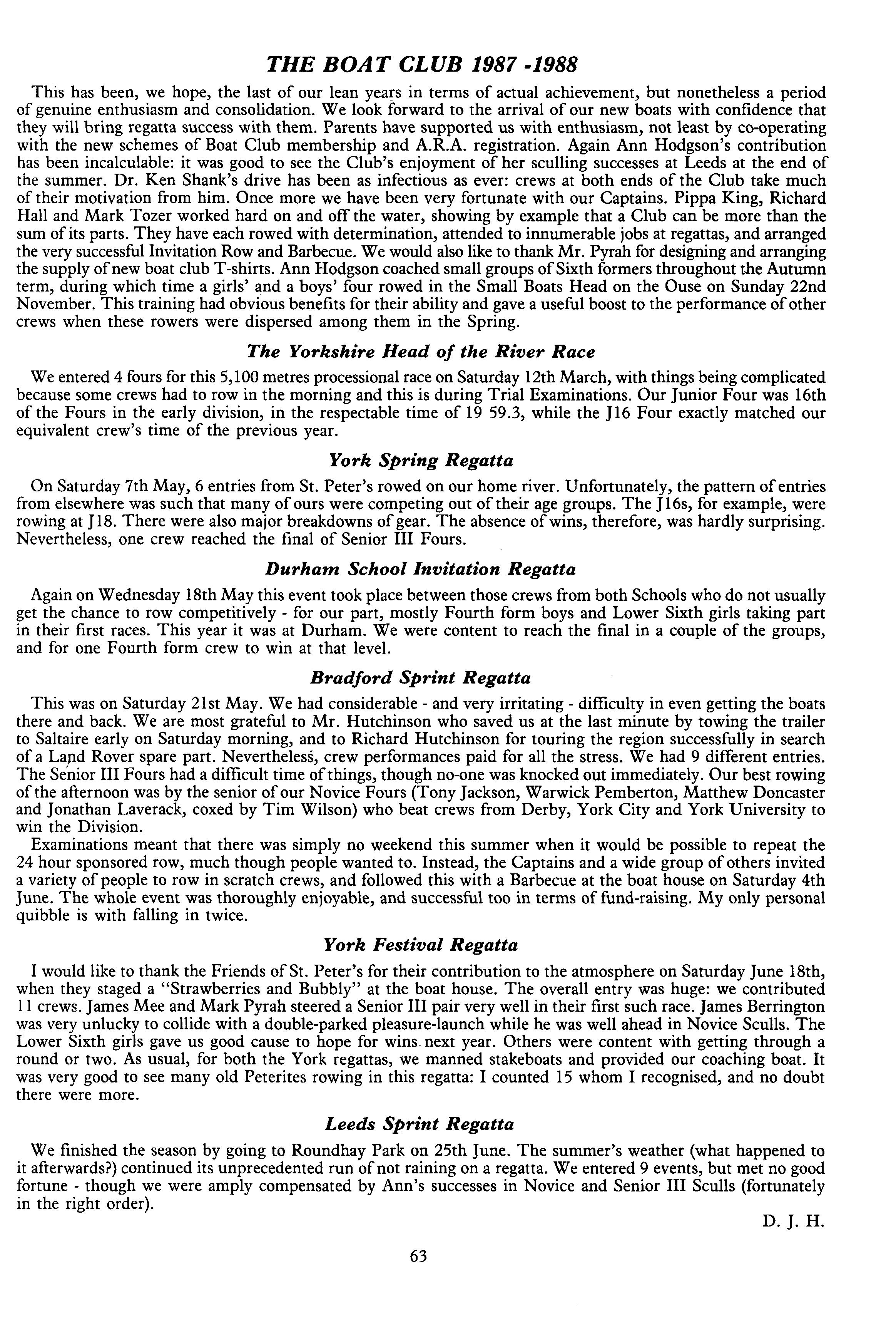 These then are exciting times to be concerned with education: nationally we have new exams, new ideas, new professional demands; and at St Peter's the future beckons with new challenges and new opportunities to be recognised, responded to and developed To preserve alone and not to improve - there lies the easy, complacent path which will surely lead to atrophy and eventual ruin We cannot keep things fixed when all the world (not least the world of education) is in eternal progress And it is to this task - the continuing improvement ofthis great and ancient school - that I as Head Master am dedicated."