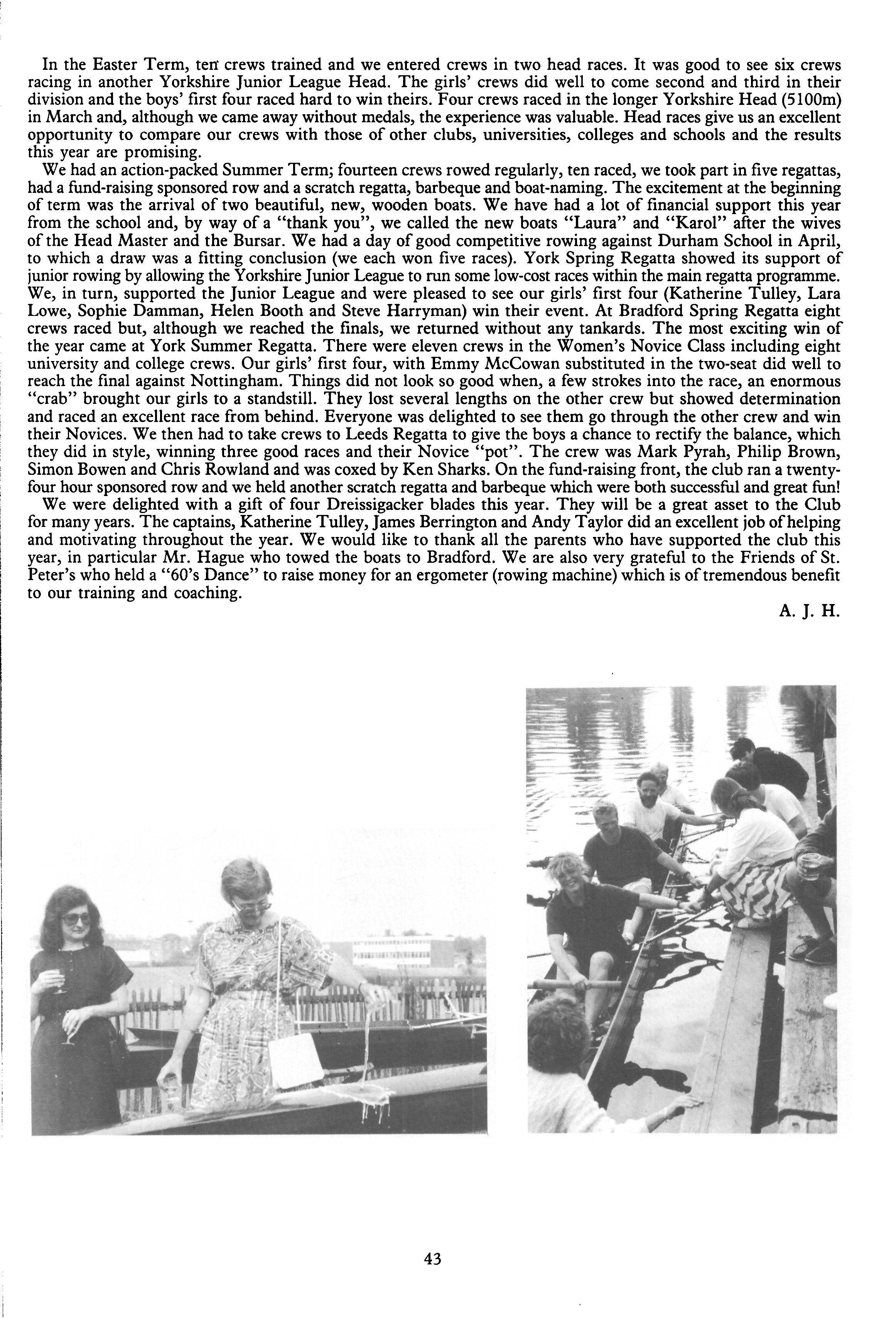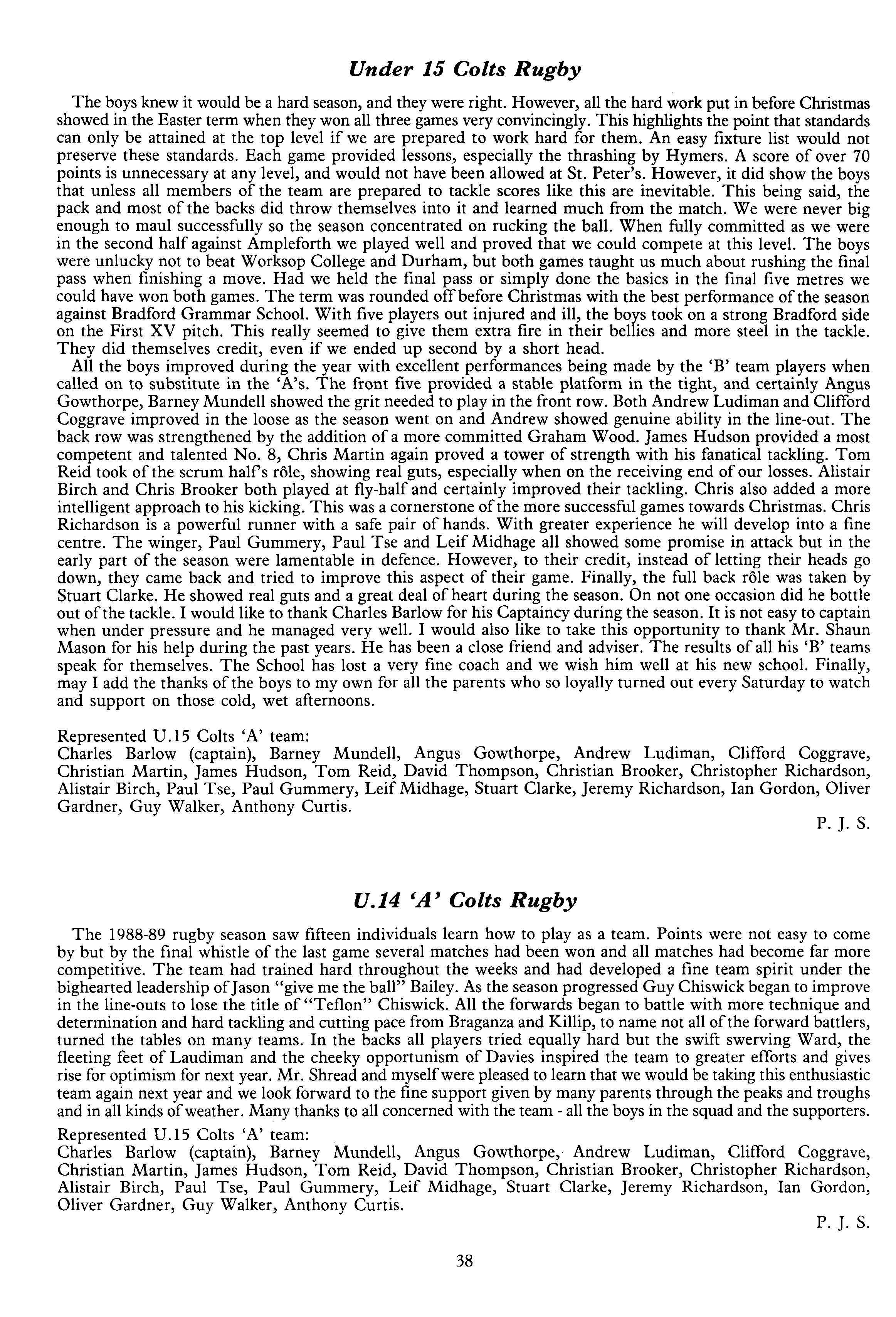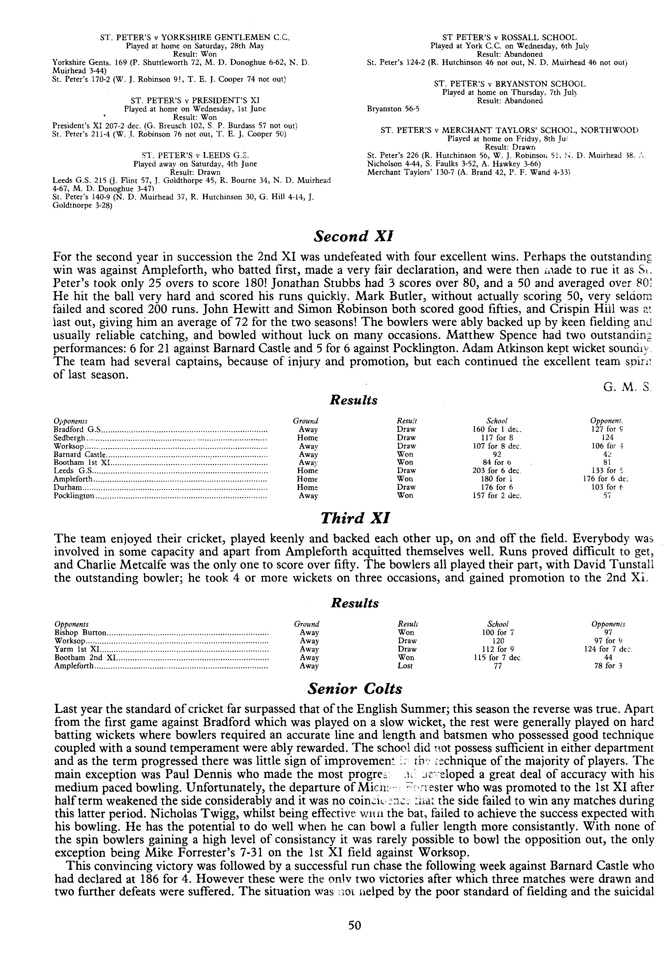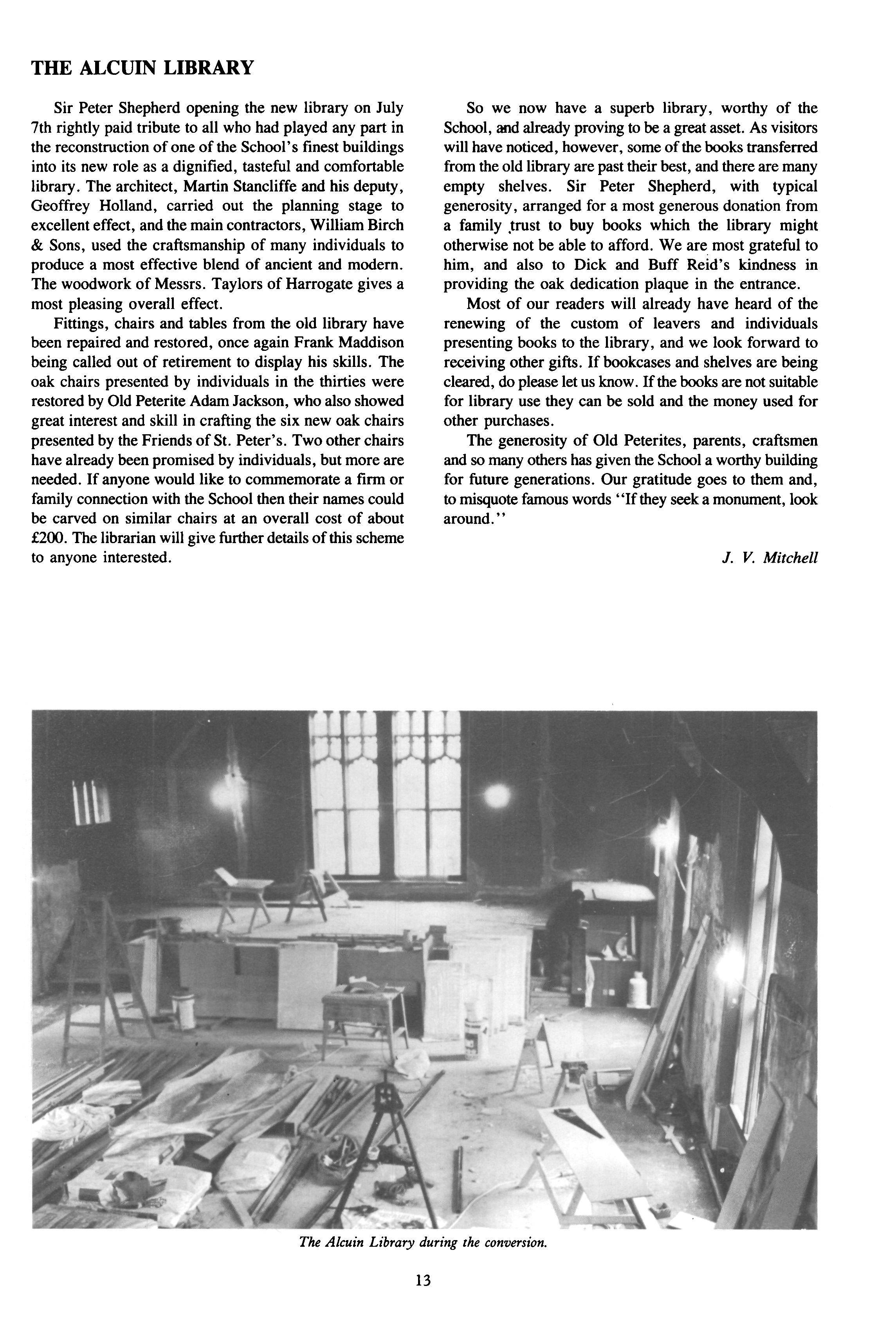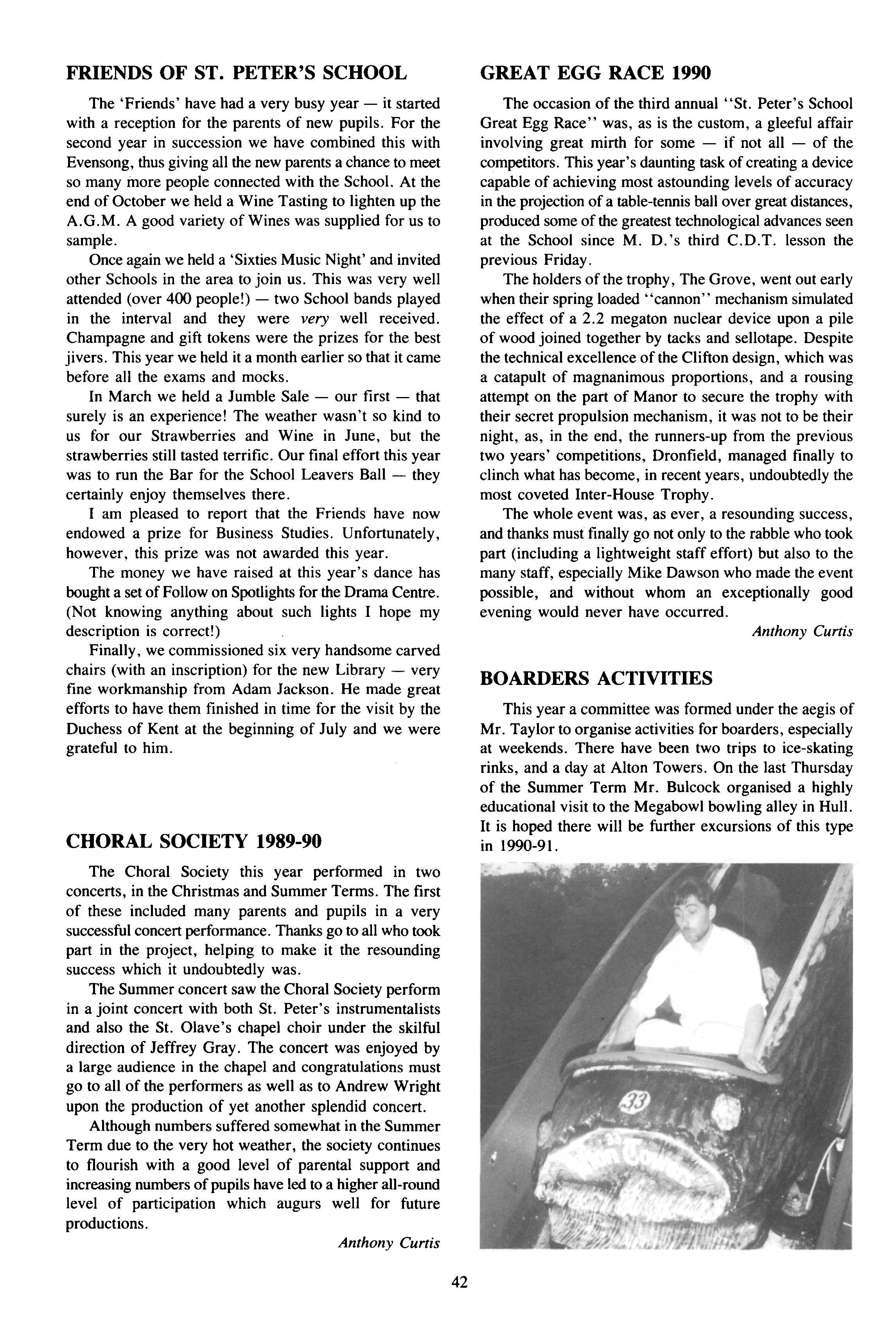 These then are exciting times to be concerned with education: nationally we have new exams, new ideas, new professional demands; and at St Peter's the future beckons with new challenges and new opportunities to be recognised, responded to and developed To preserve alone and not to improve - there lies the easy, complacent path which will surely lead to atrophy and eventual ruin We cannot keep things fixed when all the world (not least the world of education) is in eternal progress And it is to this task - the continuing improvement ofthis great and ancient school - that I as Head Master am dedicated."