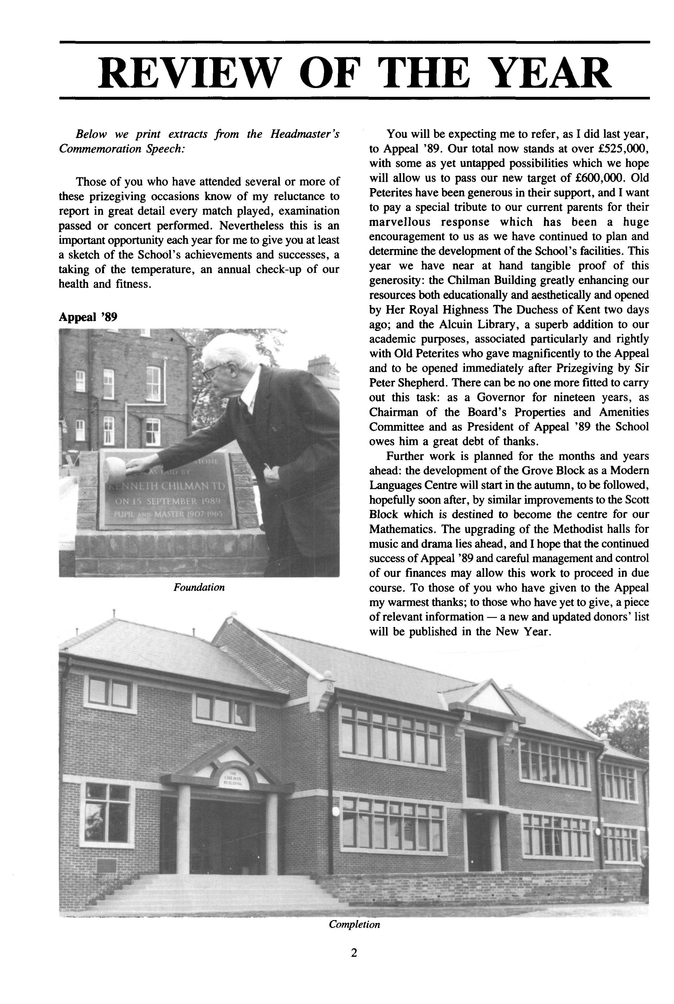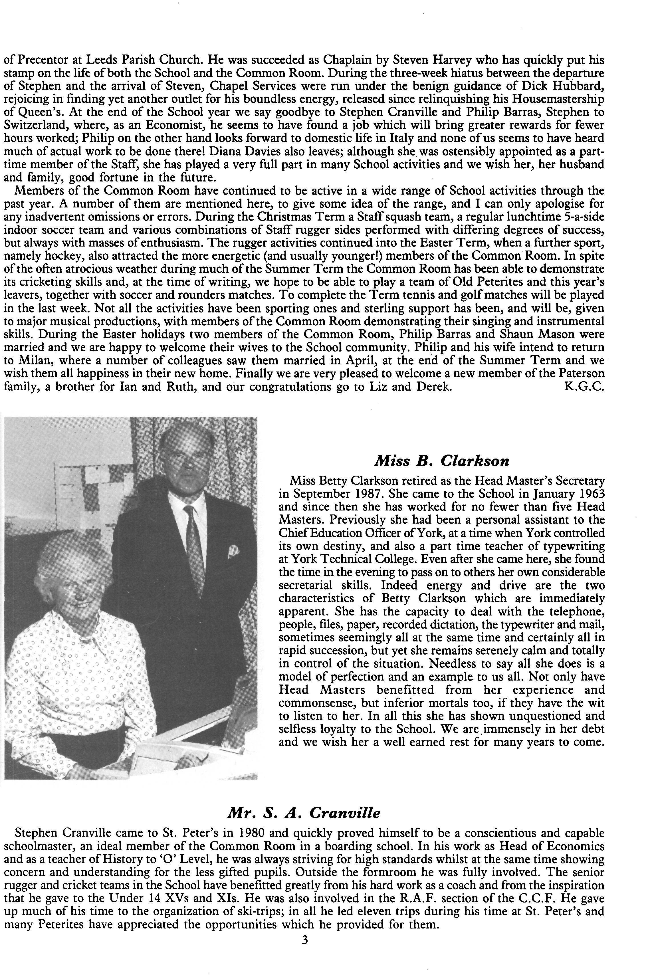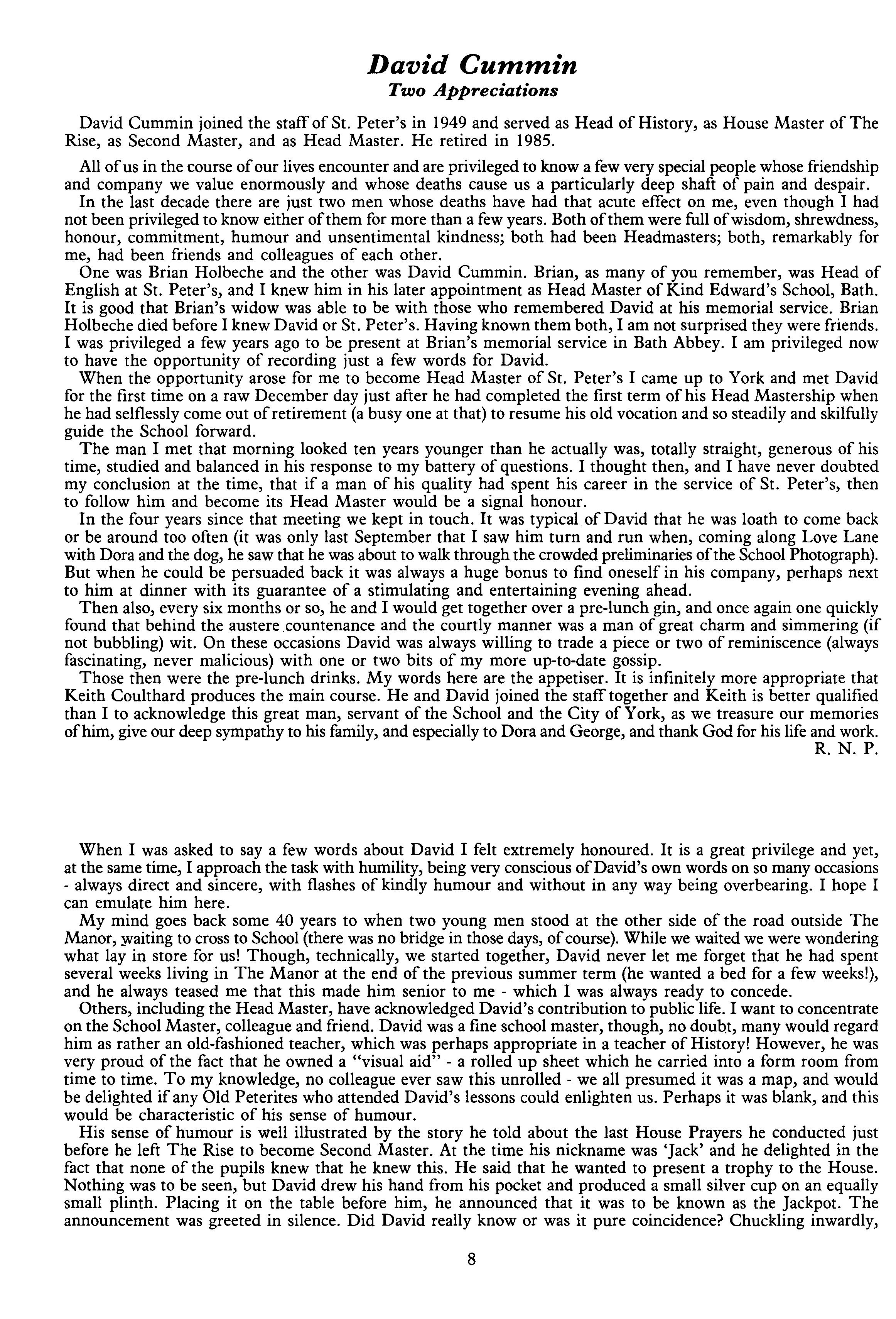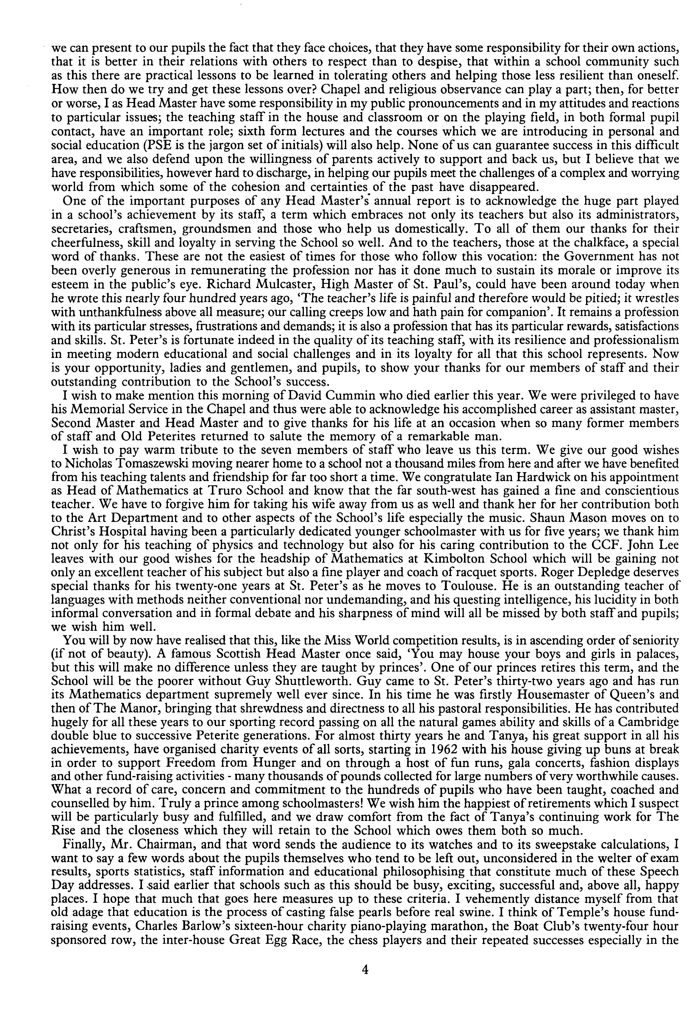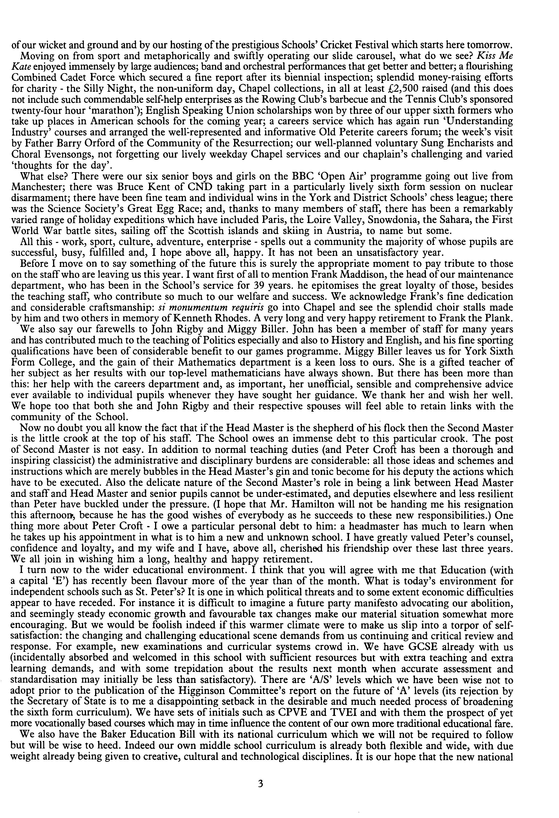 Before moving to mytheme - to improve rather then preserve - I have one pleasant and necessary task to fulfil in paying tribute to my immediate predecessor as Head Master, David Cummin, because improvement was surely the hall-mark ofhis four terms in office Iwant to acknowledge his immense contribution to St Peter's over many years as teacher of history, as housemaster and latterly as Head Master, when he selflessly returned from retirement to guide the School with steady wisdom and great loyalty St Peter's oweshim ahuge debt, and weare glad that he and hiswife are enjoying what wehope willbeaverylong and happy second retirement