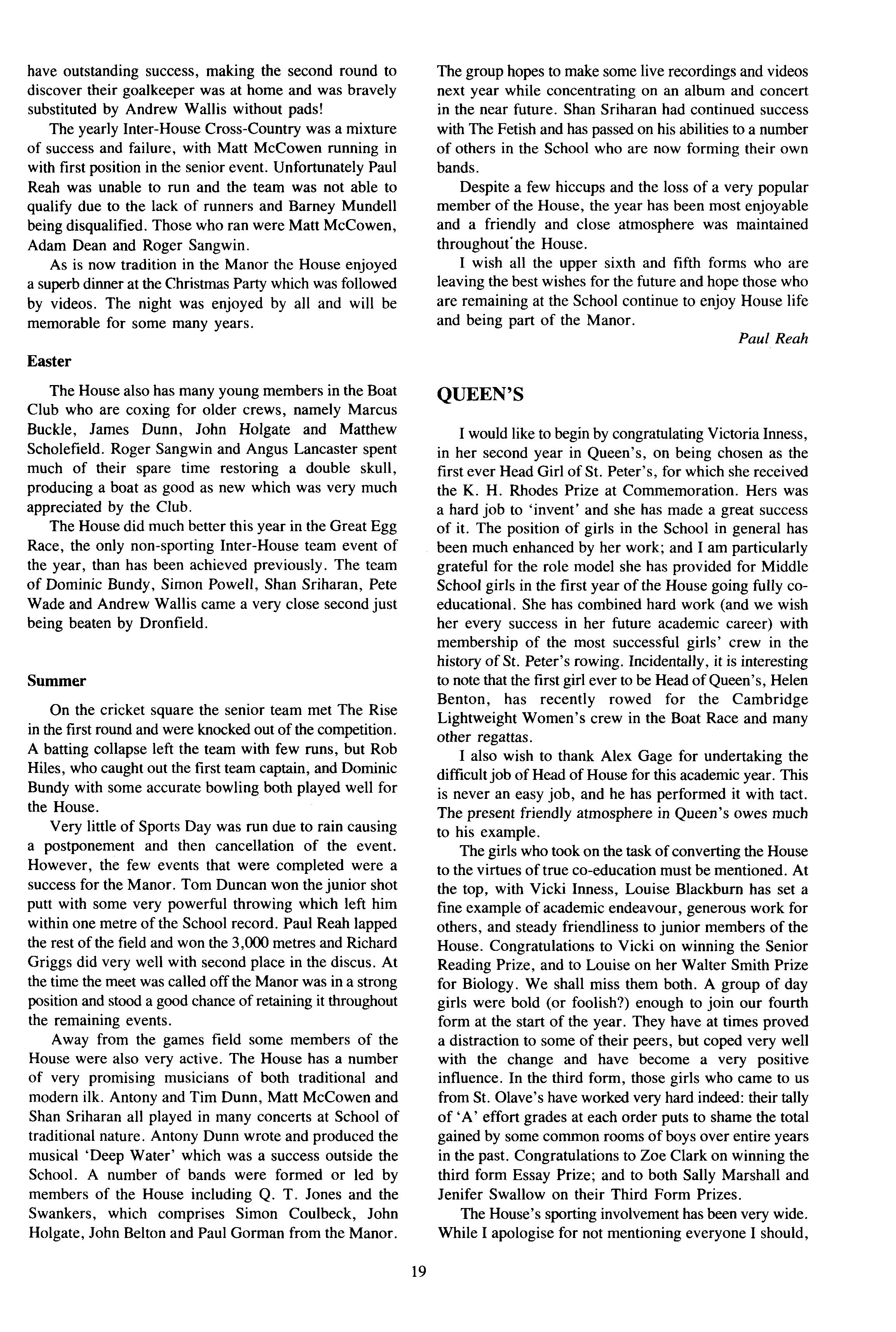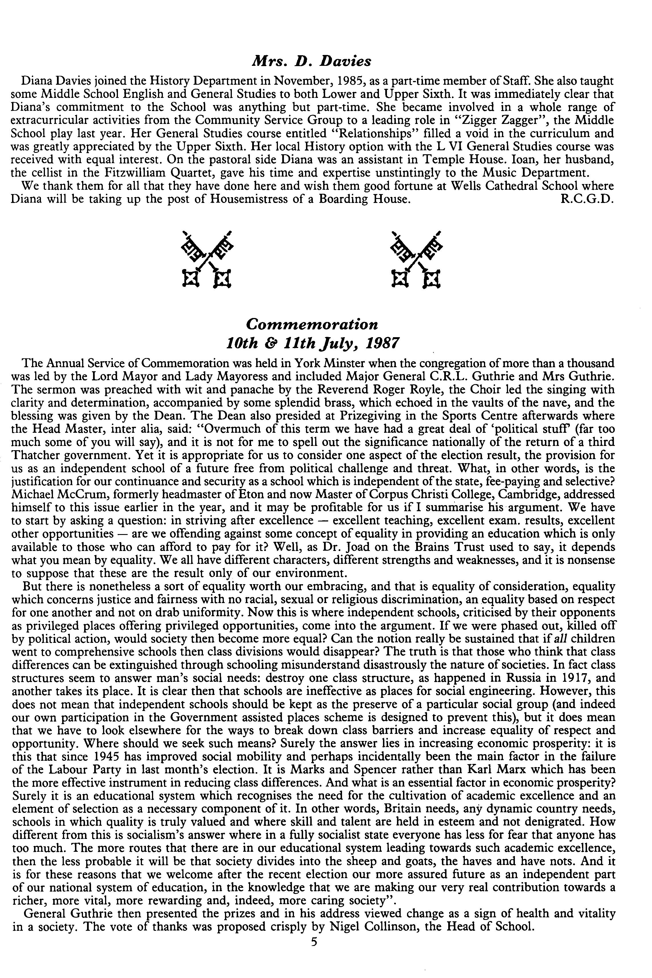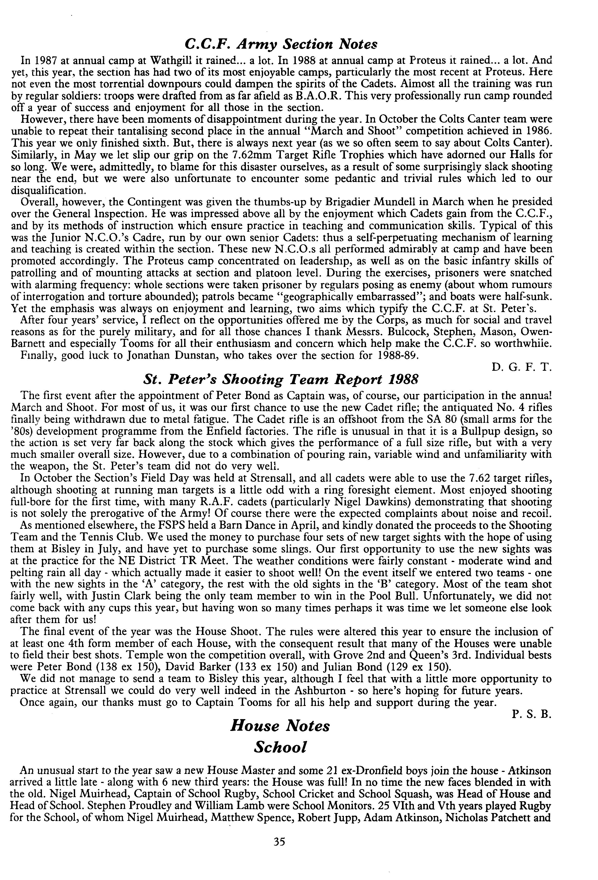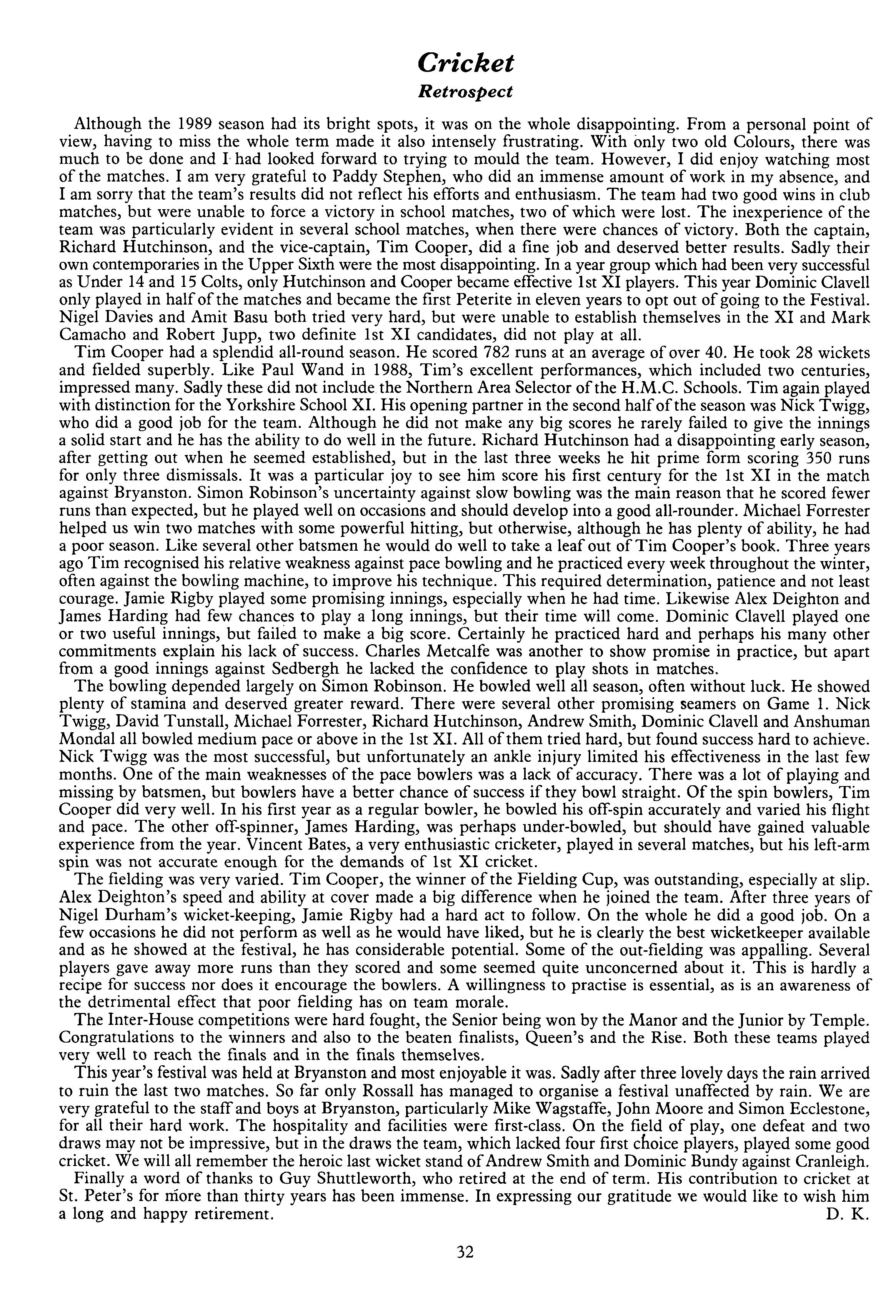 Before moving to mytheme - to improve rather then preserve - I have one pleasant and necessary task to fulfil in paying tribute to my immediate predecessor as Head Master, David Cummin, because improvement was surely the hall-mark ofhis four terms in office Iwant to acknowledge his immense contribution to St Peter's over many years as teacher of history, as housemaster and latterly as Head Master, when he selflessly returned from retirement to guide the School with steady wisdom and great loyalty St Peter's oweshim ahuge debt, and weare glad that he and hiswife are enjoying what wehope willbeaverylong and happy second retirement