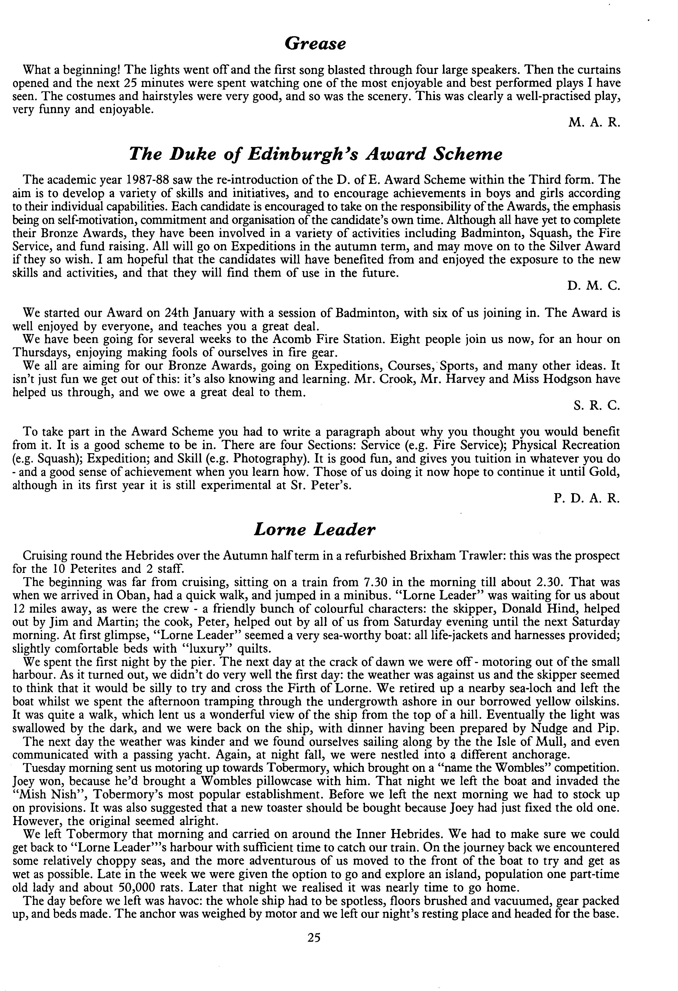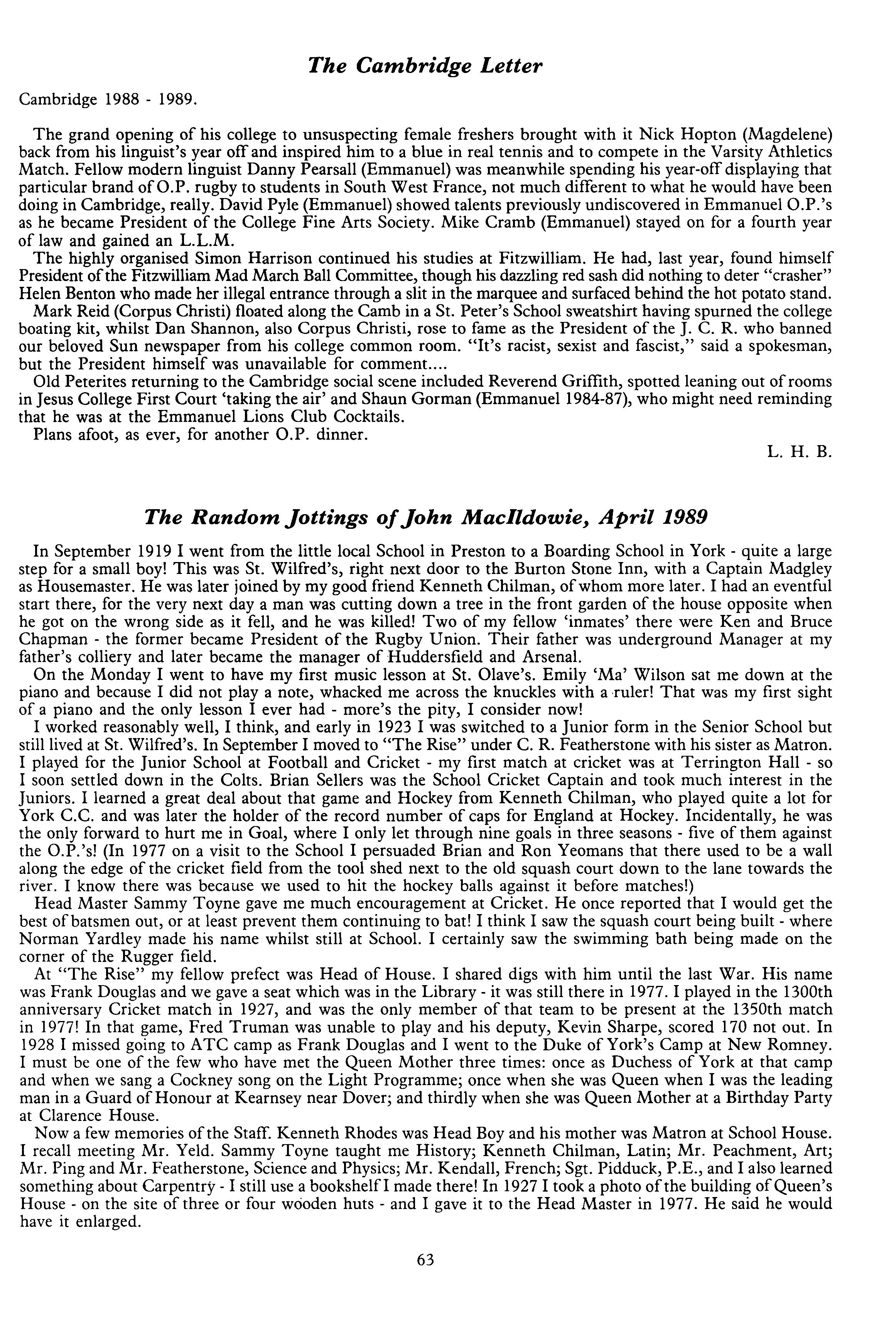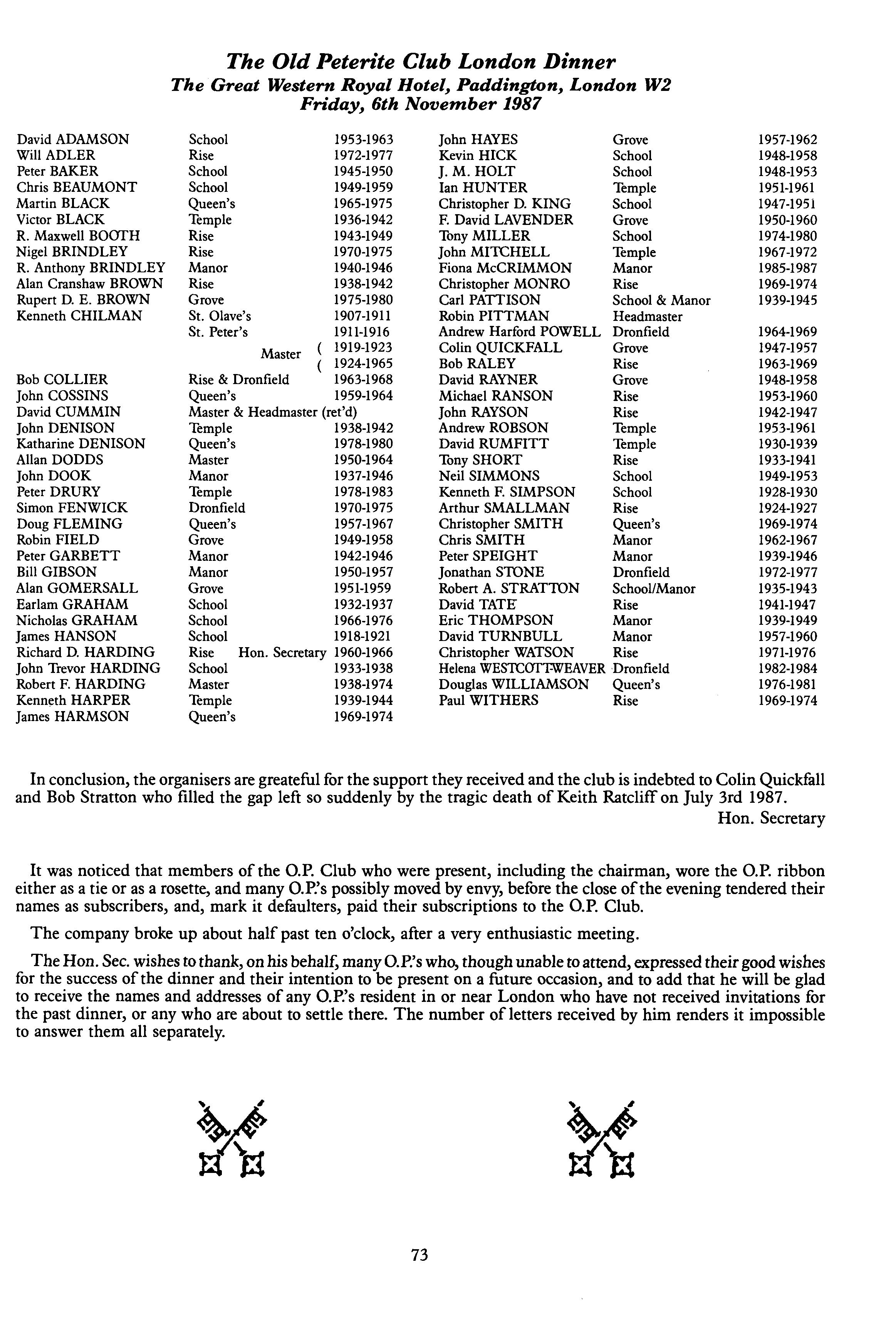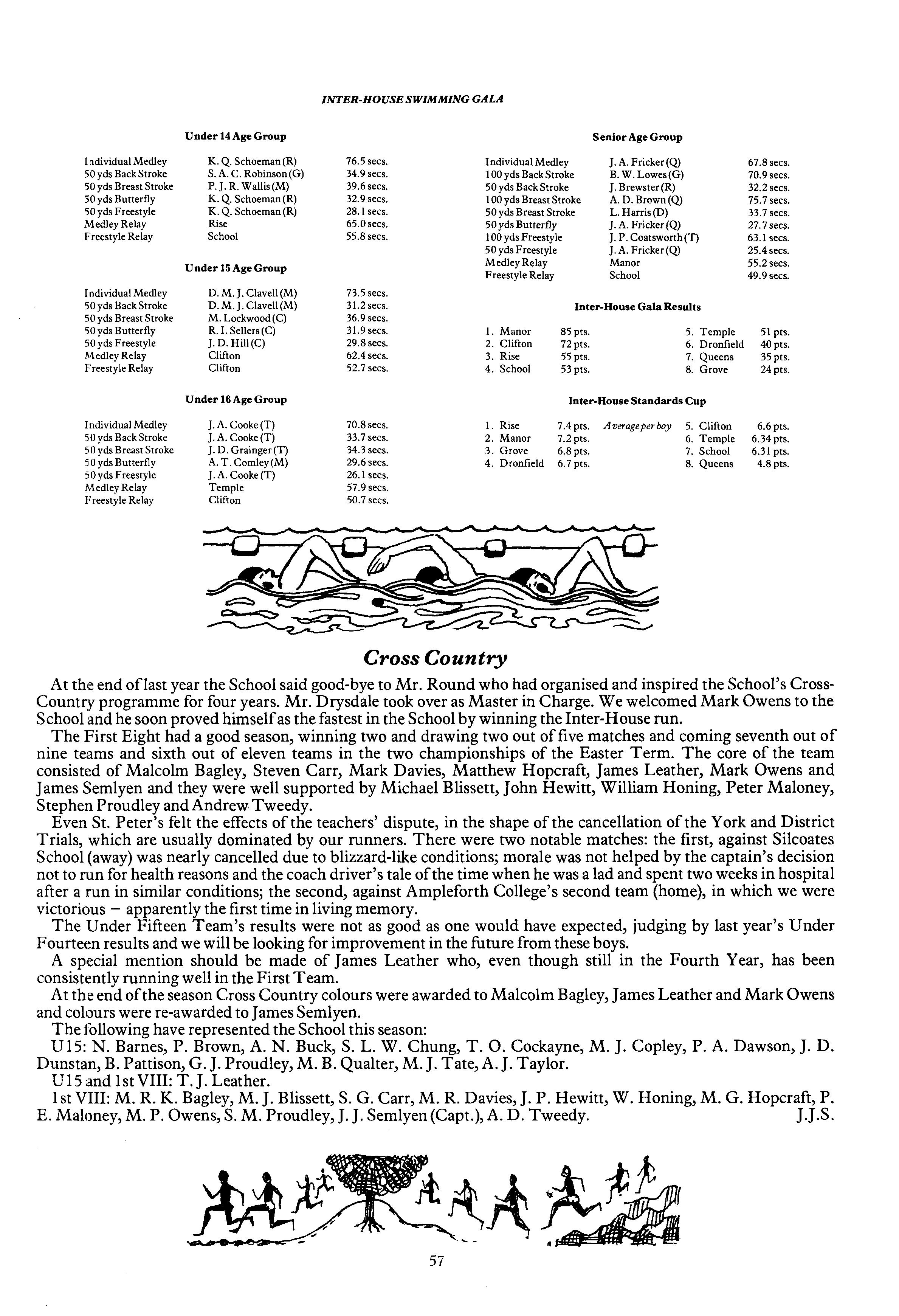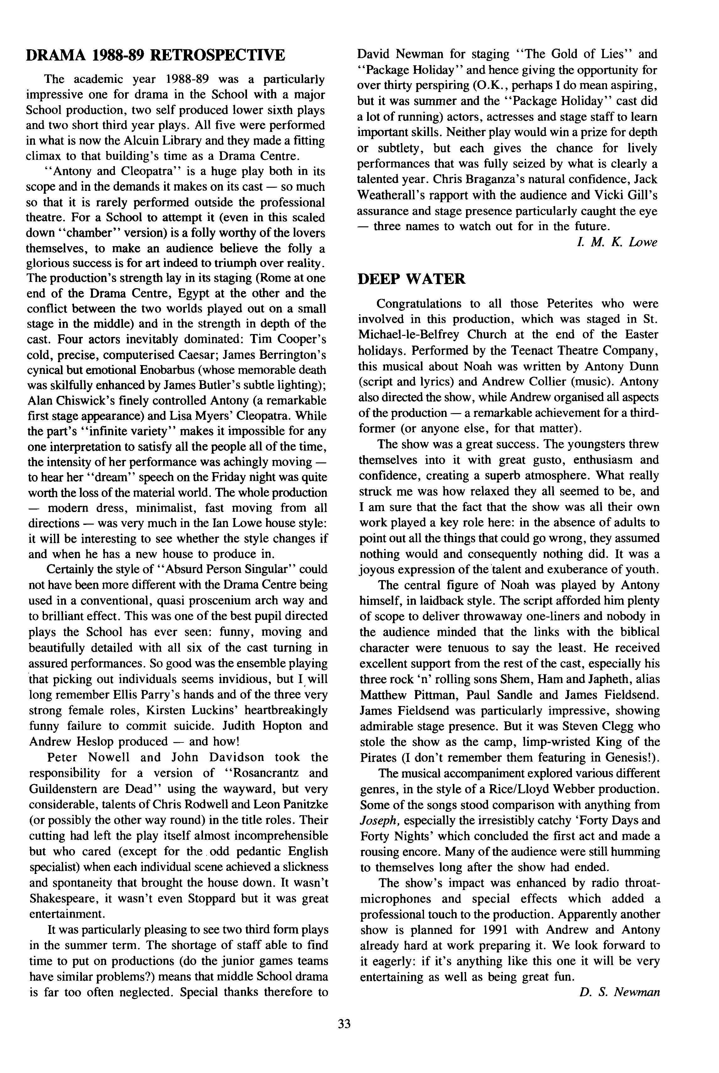 Before moving to mytheme - to improve rather then preserve - I have one pleasant and necessary task to fulfil in paying tribute to my immediate predecessor as Head Master, David Cummin, because improvement was surely the hall-mark ofhis four terms in office Iwant to acknowledge his immense contribution to St Peter's over many years as teacher of history, as housemaster and latterly as Head Master, when he selflessly returned from retirement to guide the School with steady wisdom and great loyalty St Peter's oweshim ahuge debt, and weare glad that he and hiswife are enjoying what wehope willbeaverylong and happy second retirement