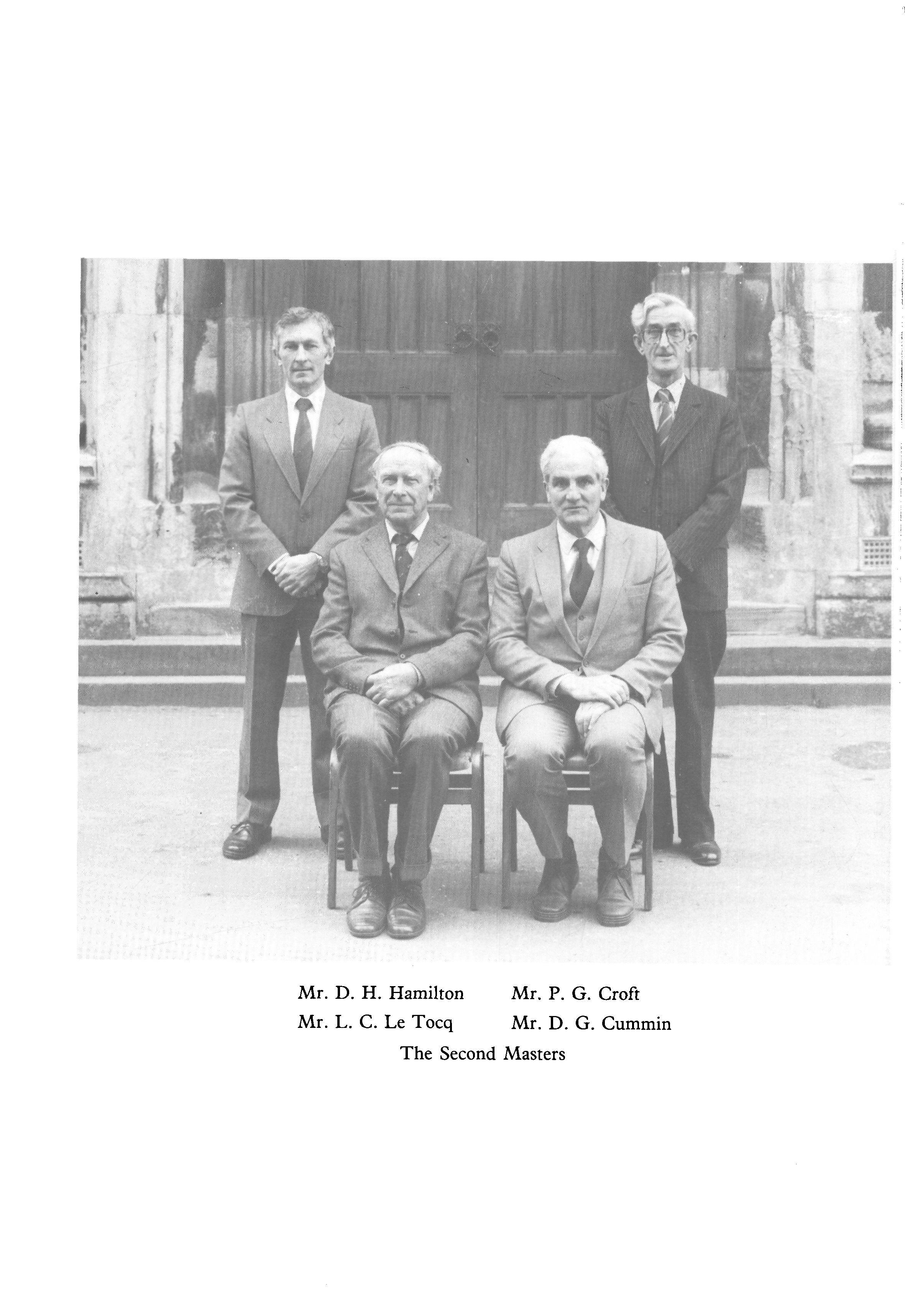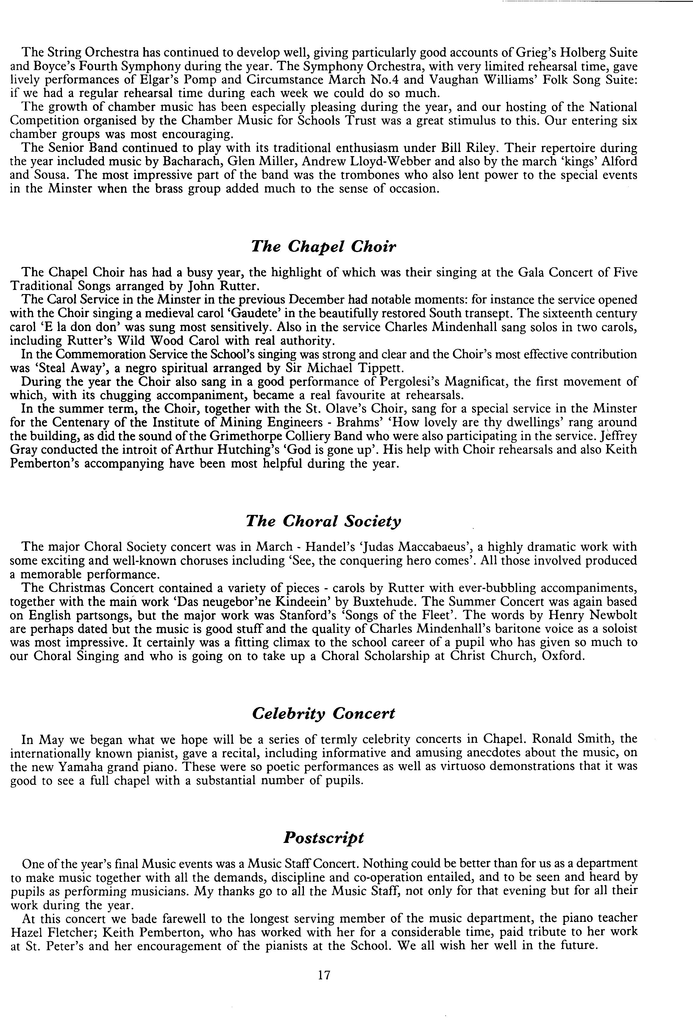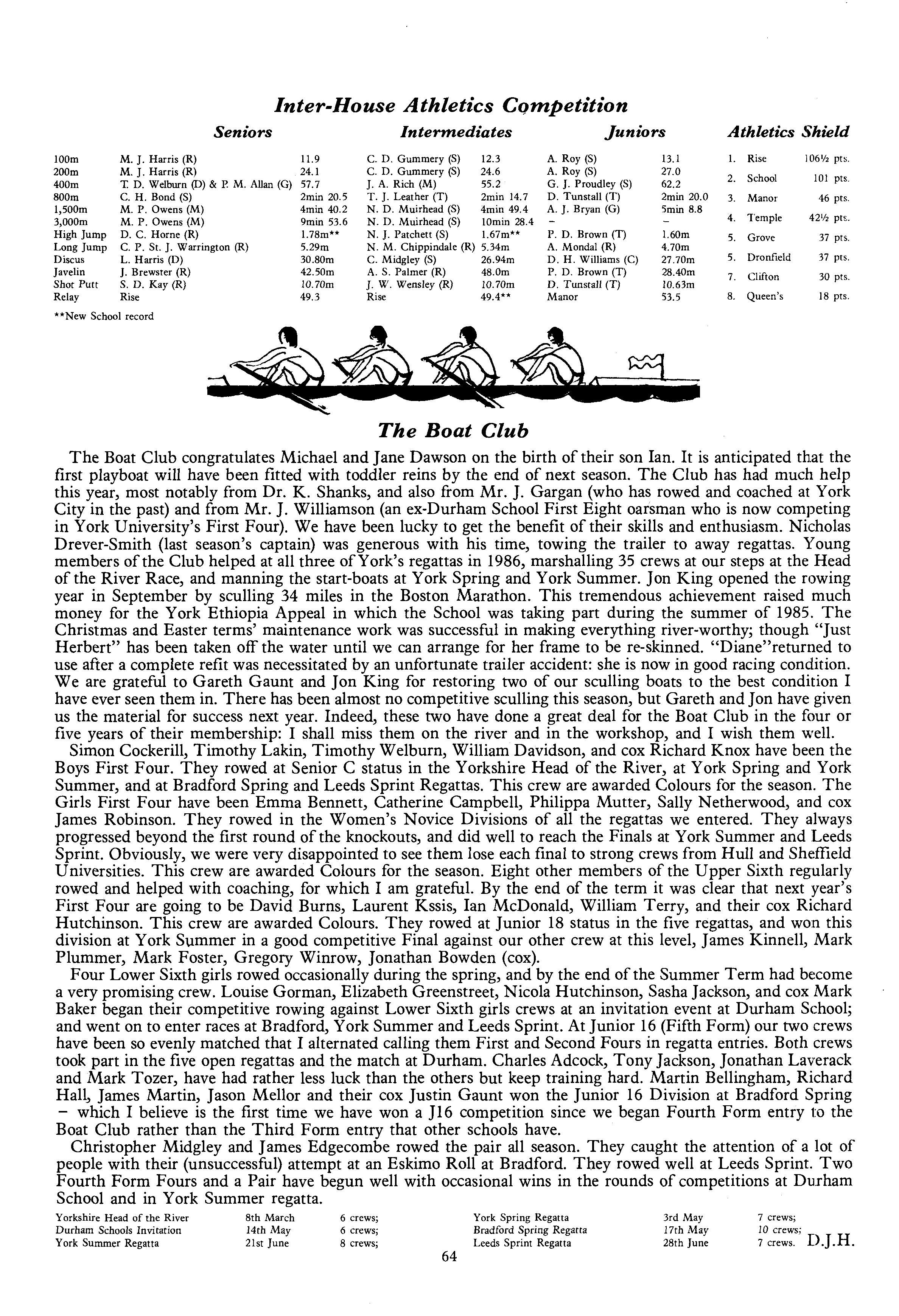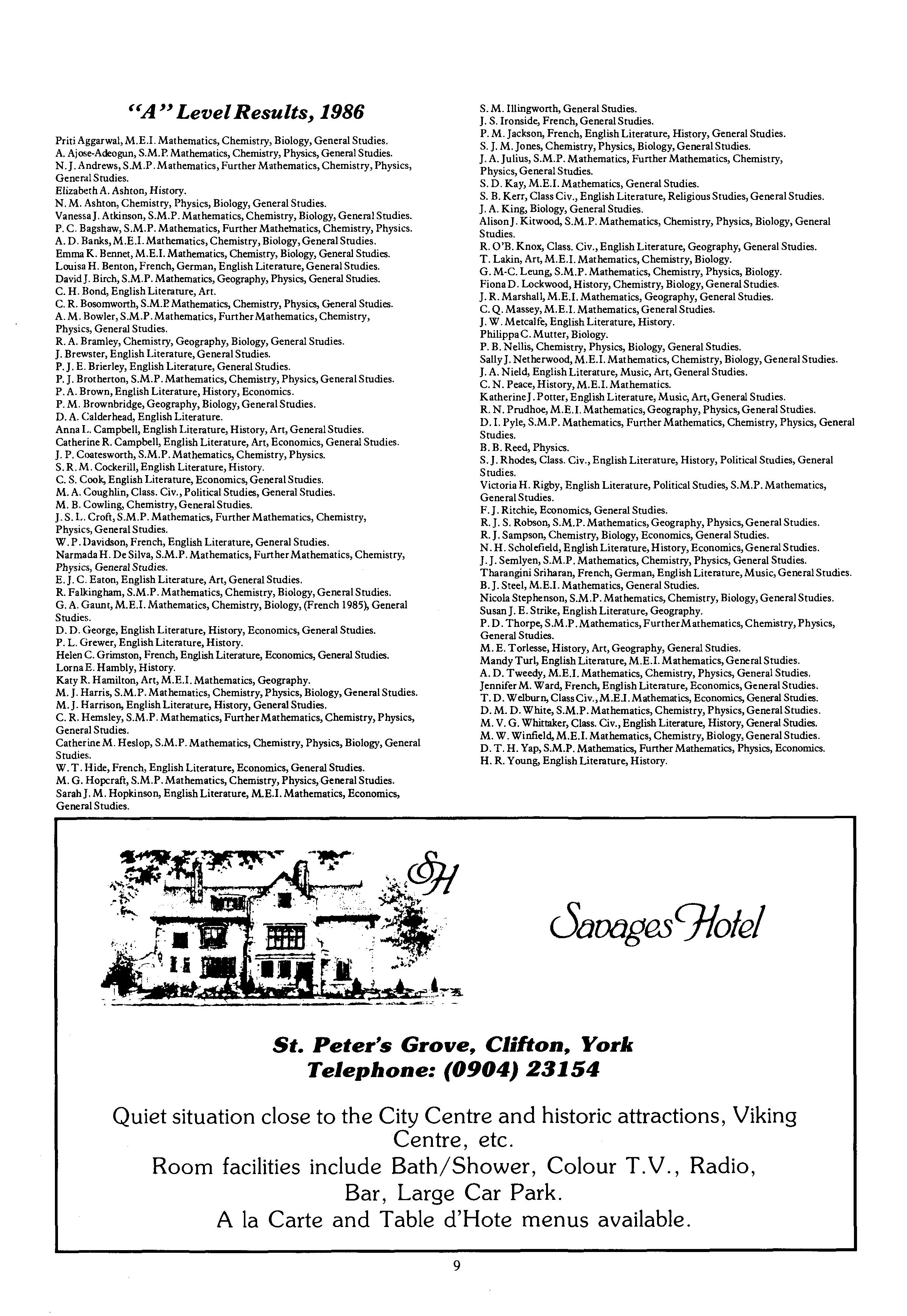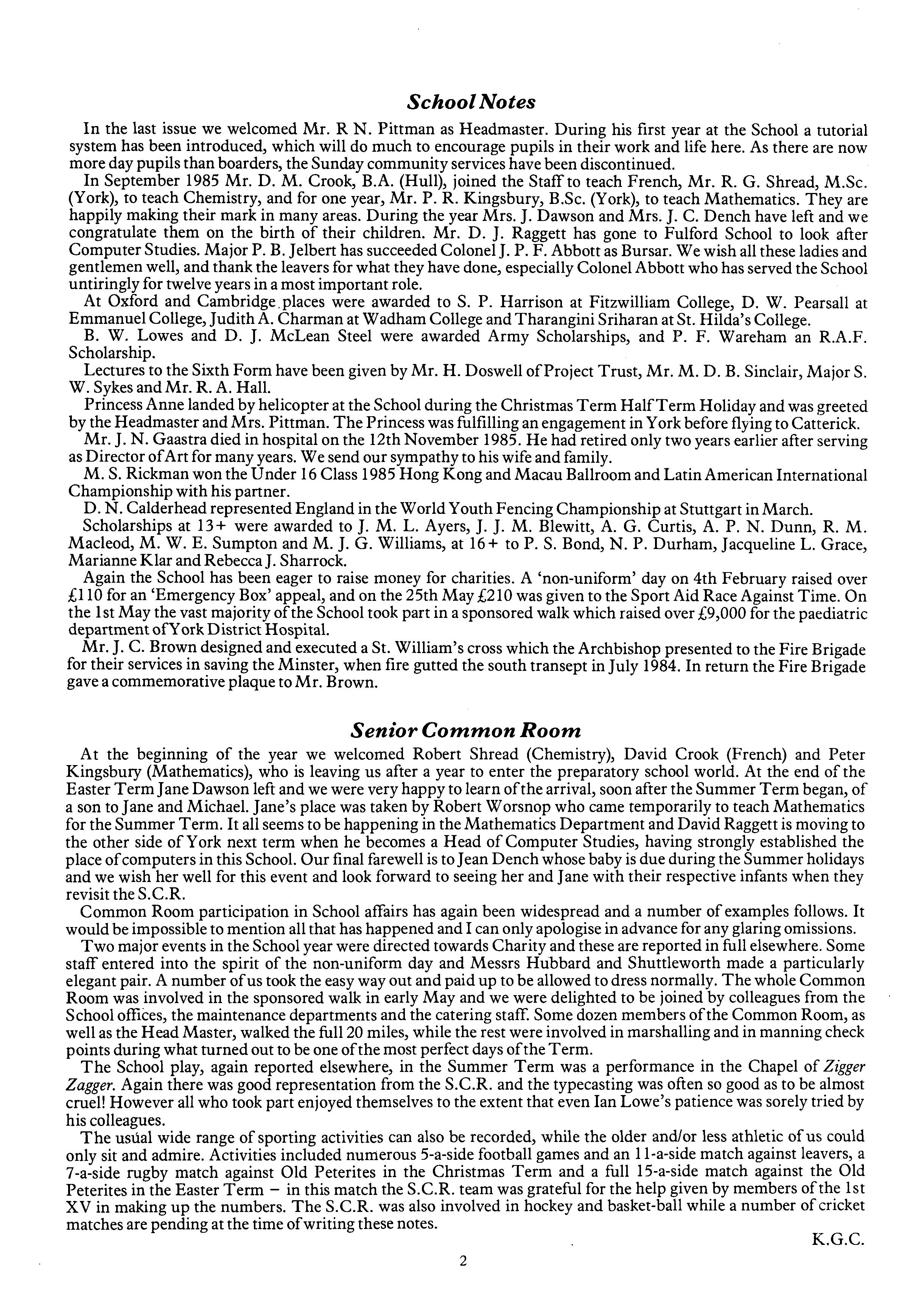 In September 1985 Mr. D. M. Crook, B.A. (Hull), joined the Staff to teach French, Mr. R. G. Shread, M.Sc. (York), to teach Chemistry, and for one year, Mr. P. R. Kingsbury, B.Sc. (York), to teach Mathematics. They are happily making their mark in many areas. During the year Mrs. J. Dawson and Mrs. J. C. Dench have left and we congratulate them on the birth of their children. Mr. D. J. Raggett has gone to Fulford School to look after Computer Studies. Major P. B. Jelbert has succeeded Colonel J. P. F. Abbott asBursar. Wewish all these ladies and gentlemen well, and thank the leavers for what they have done, especially Colonel Abbott who has served the School untiringly for twelve yearsin a most important role.
