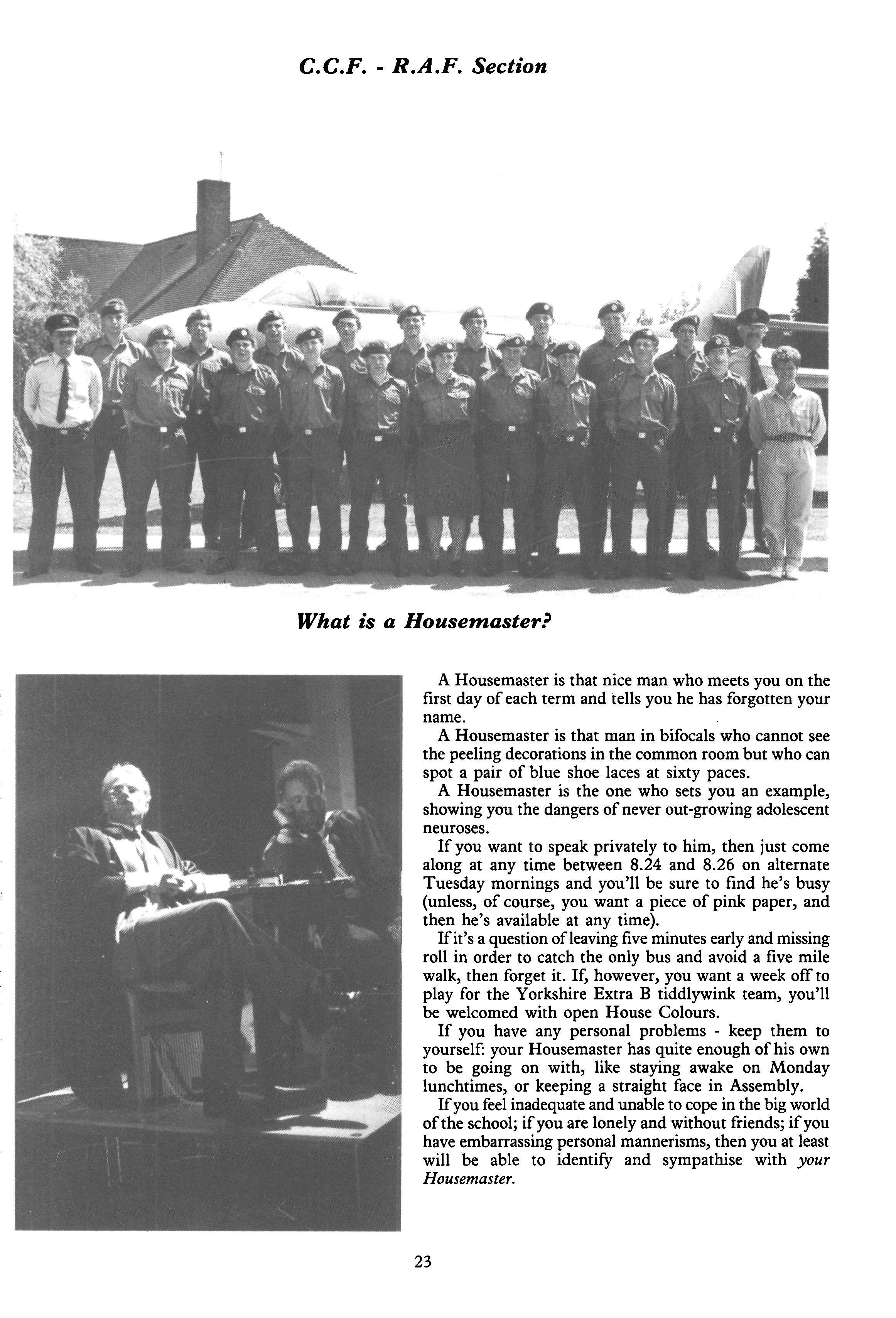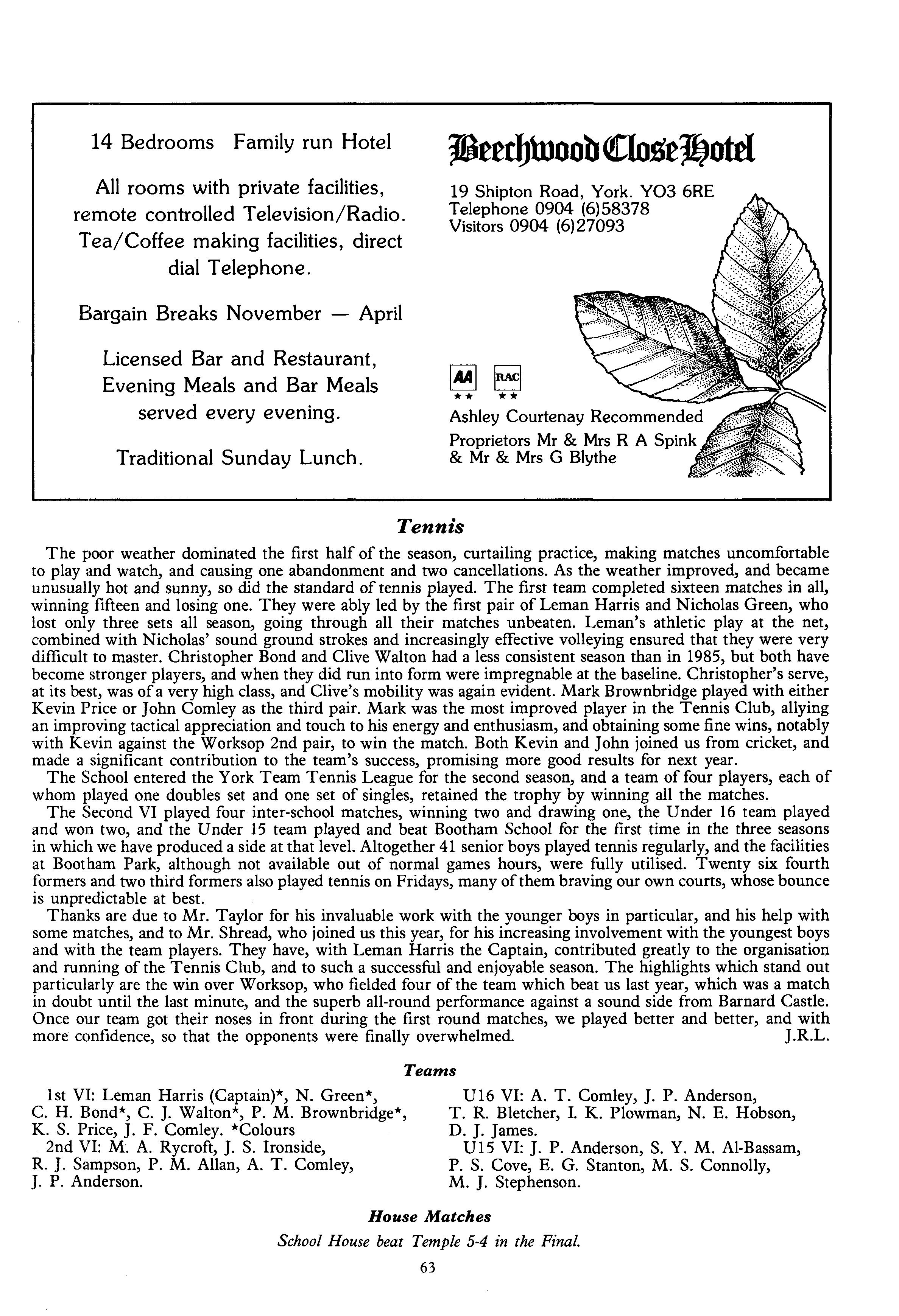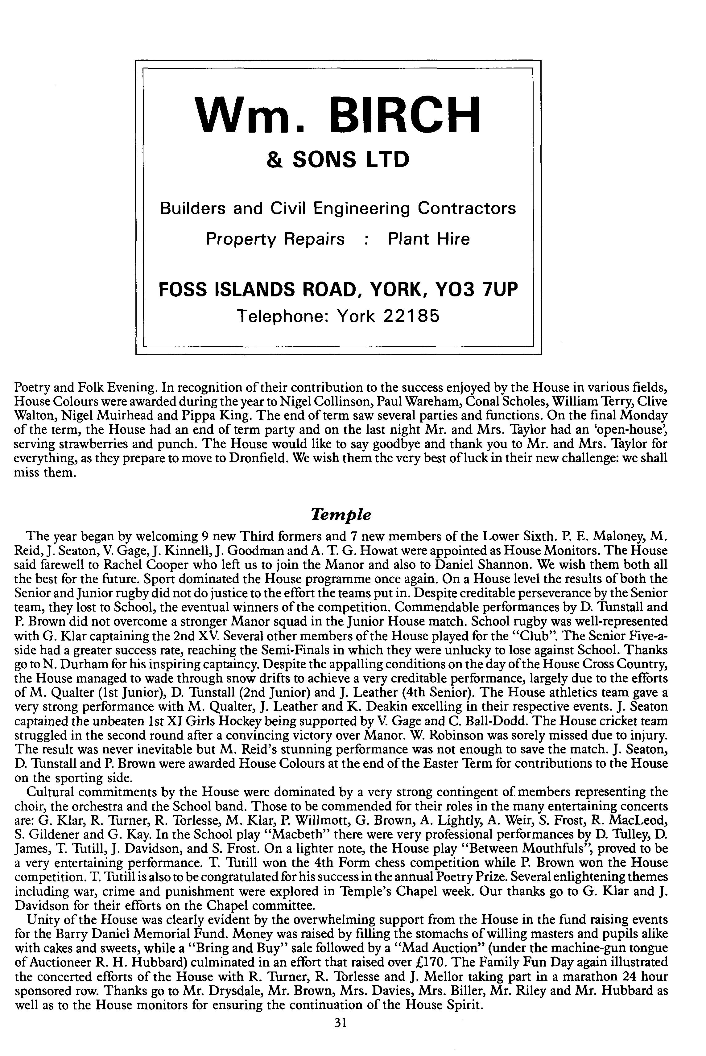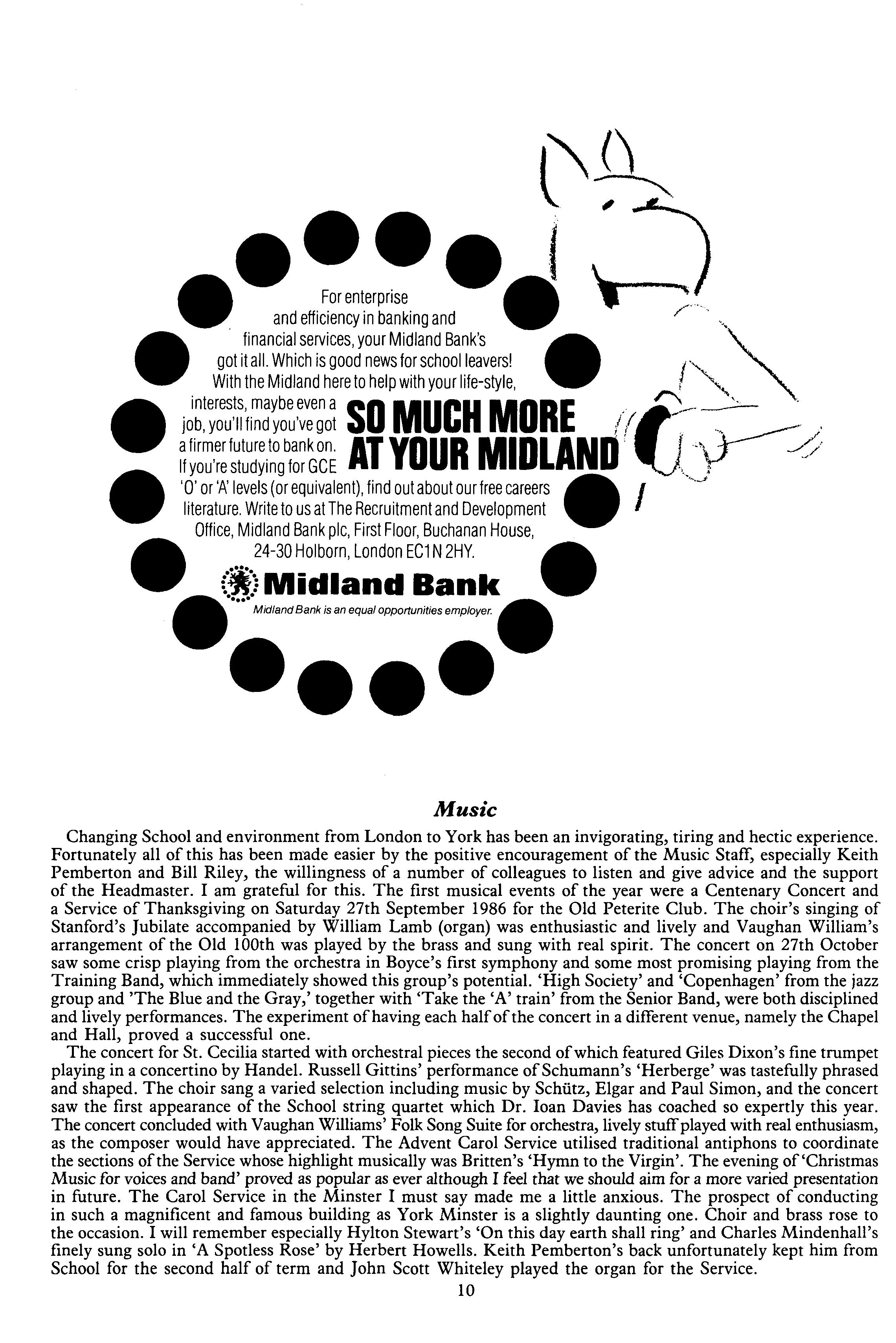 In September 1985 Mr. D. M. Crook, B.A. (Hull), joined the Staff to teach French, Mr. R. G. Shread, M.Sc. (York), to teach Chemistry, and for one year, Mr. P. R. Kingsbury, B.Sc. (York), to teach Mathematics. They are happily making their mark in many areas. During the year Mrs. J. Dawson and Mrs. J. C. Dench have left and we congratulate them on the birth of their children. Mr. D. J. Raggett has gone to Fulford School to look after Computer Studies. Major P. B. Jelbert has succeeded Colonel J. P. F. Abbott asBursar. Wewish all these ladies and gentlemen well, and thank the leavers for what they have done, especially Colonel Abbott who has served the School untiringly for twelve yearsin a most important role.