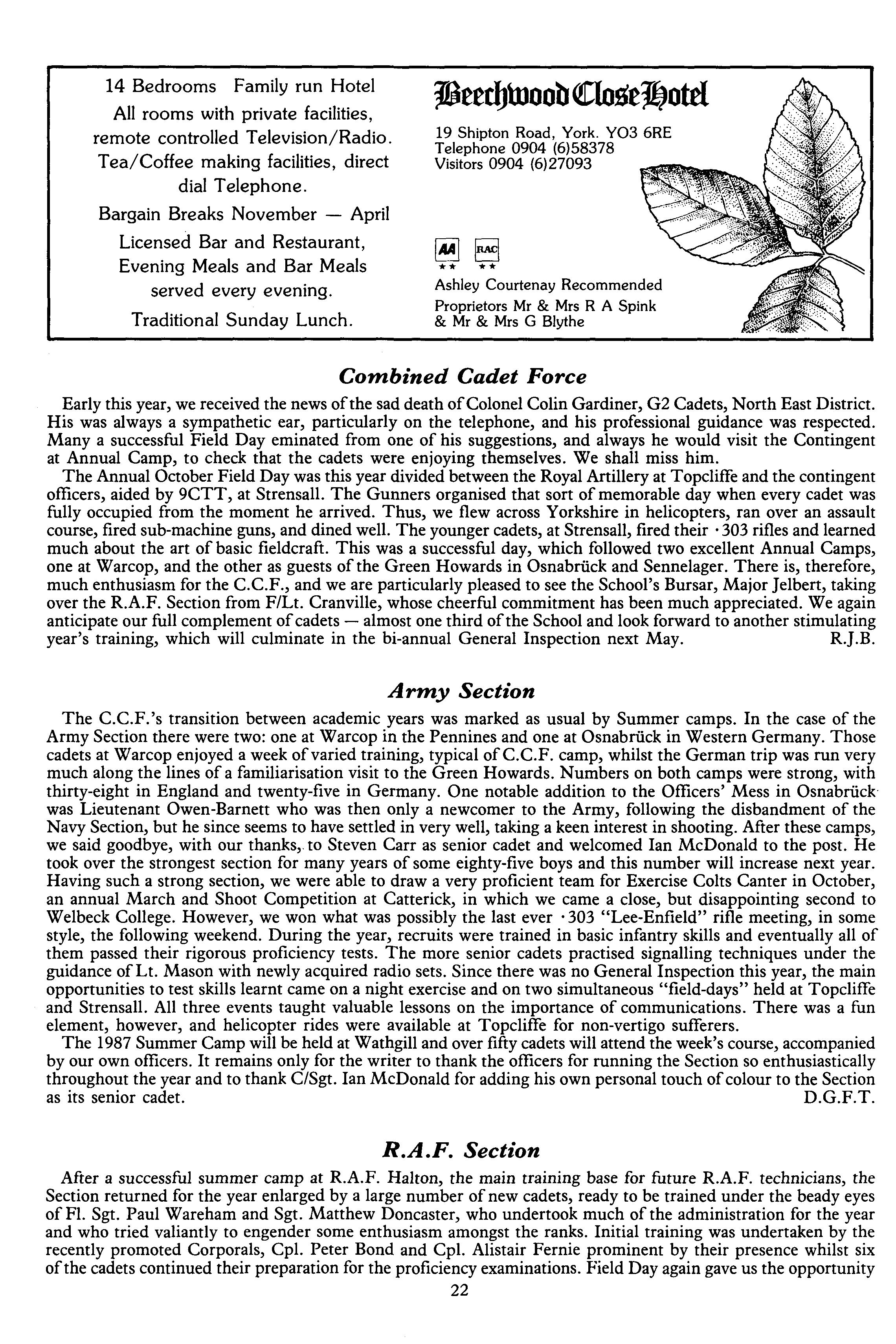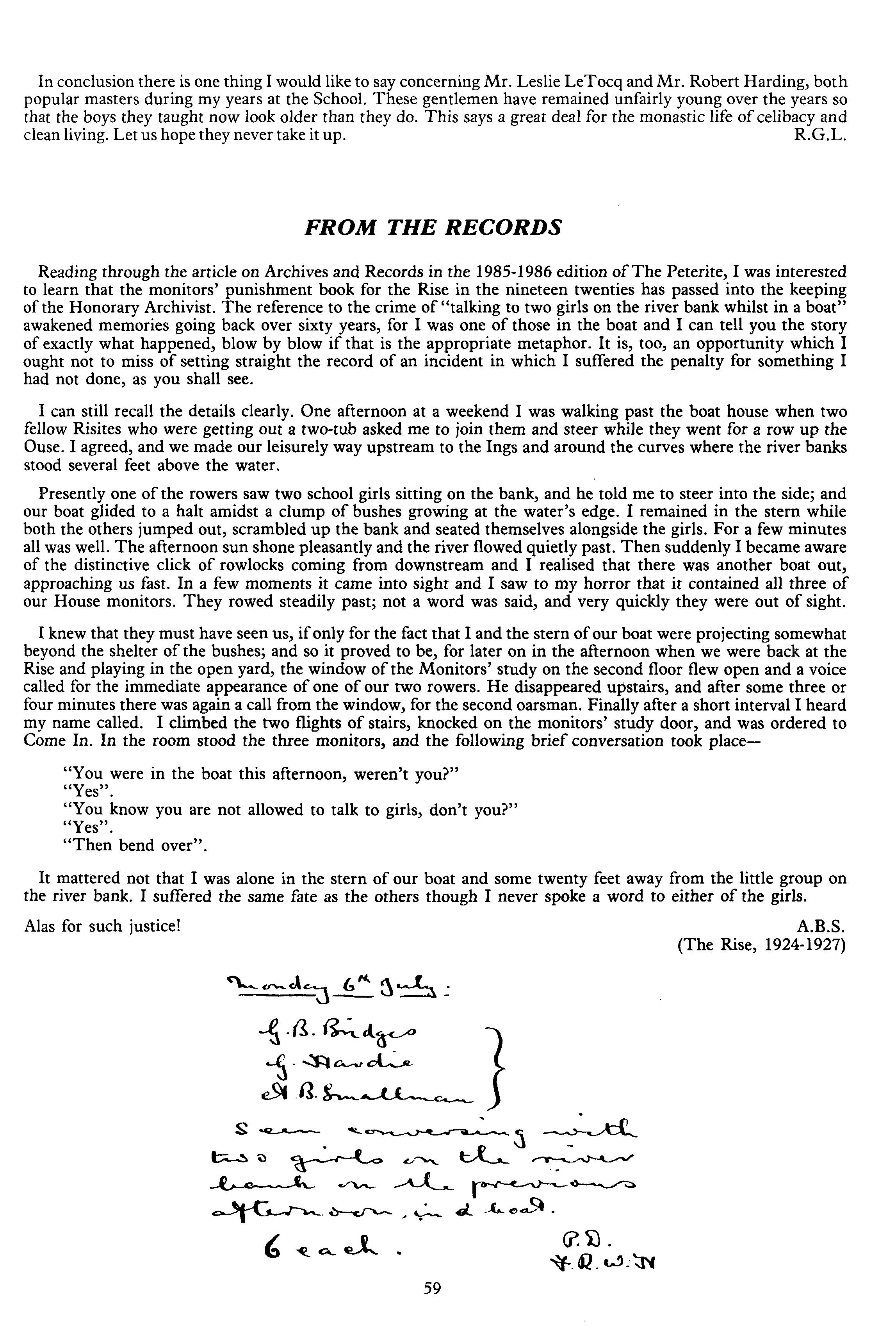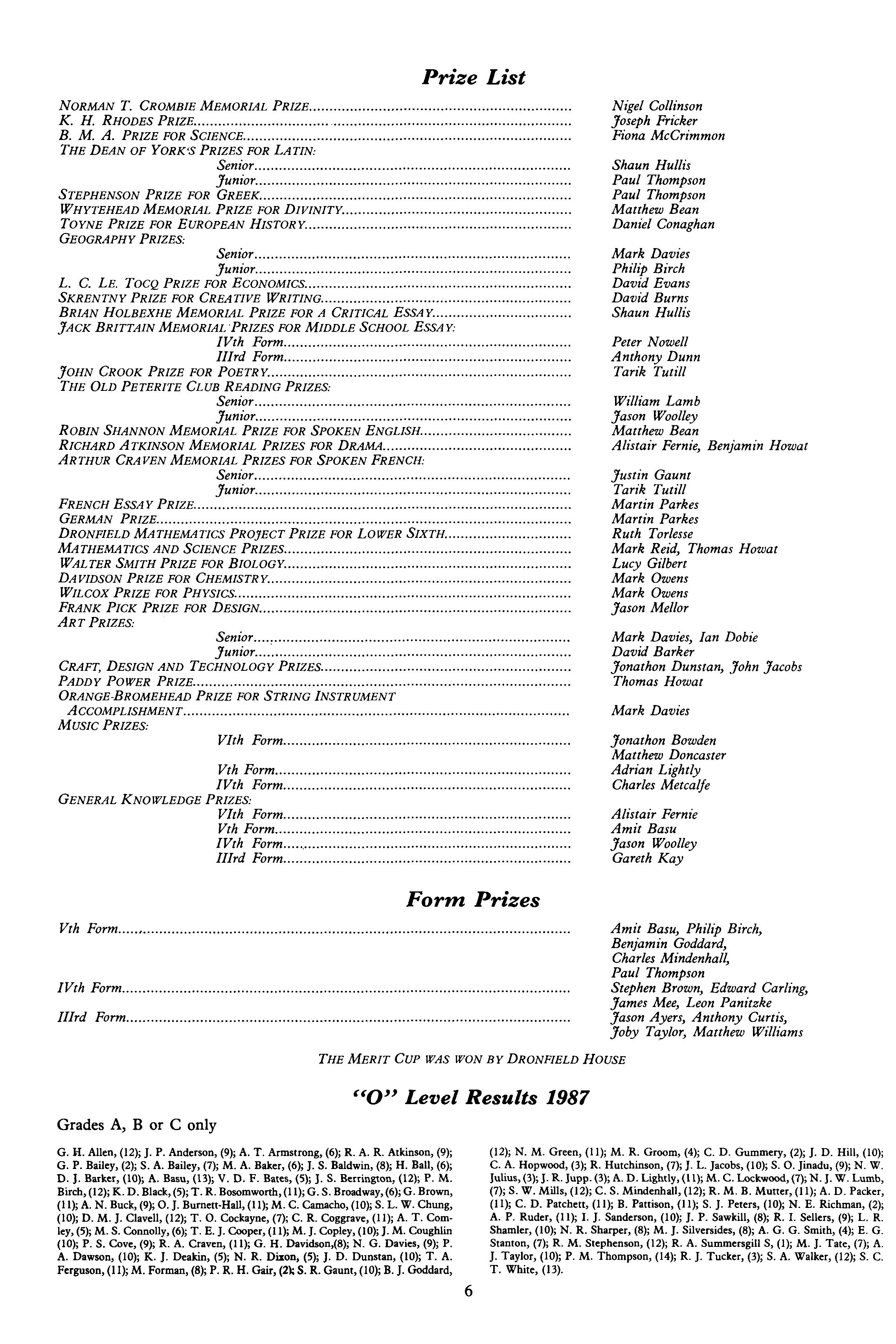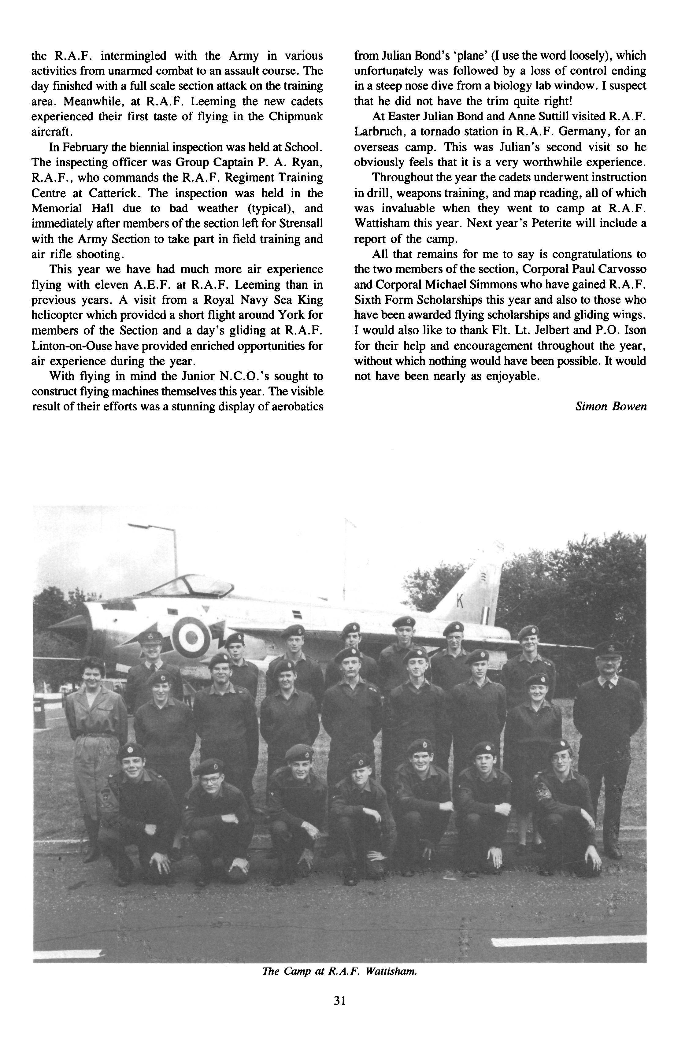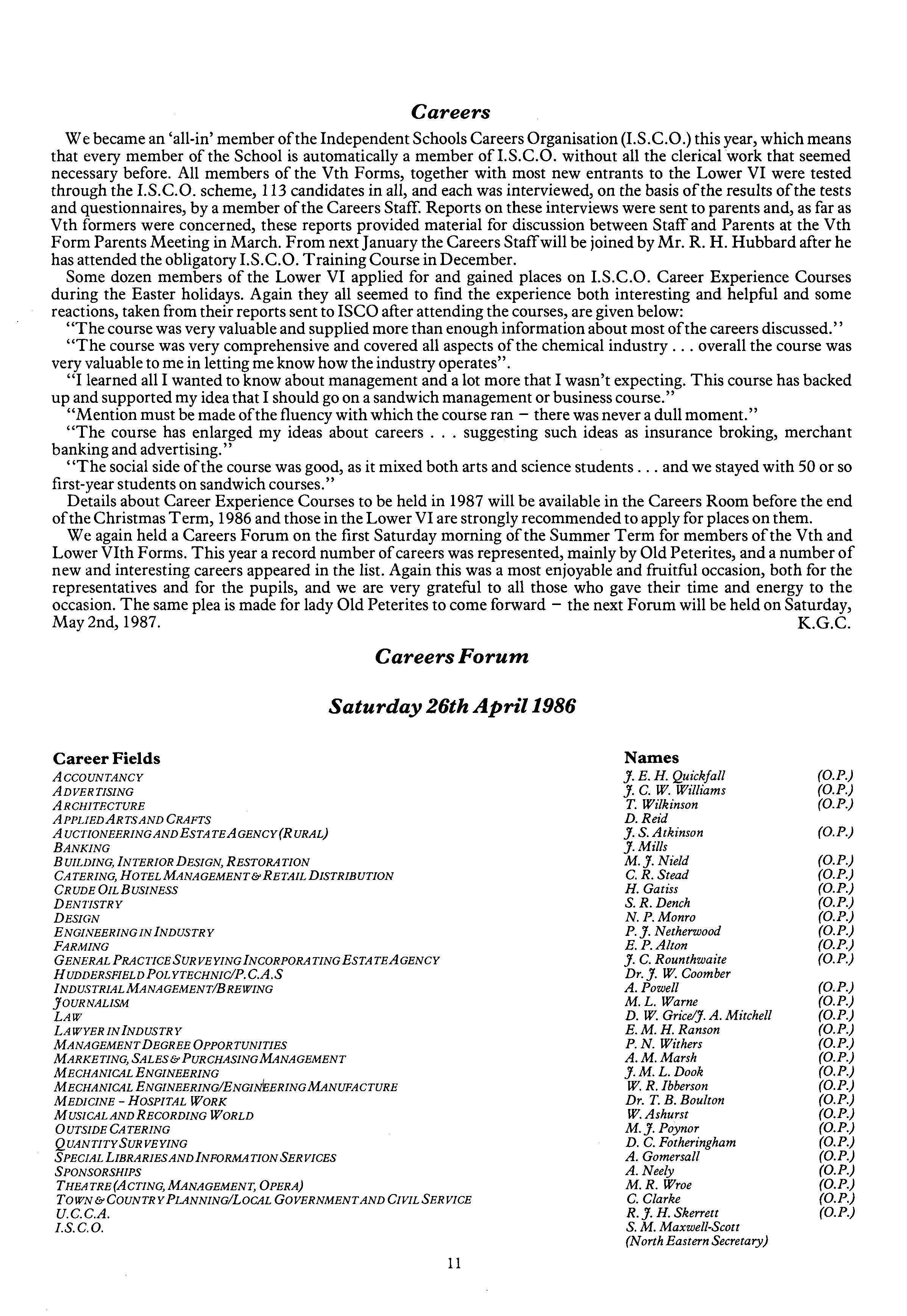 In September 1985 Mr. D. M. Crook, B.A. (Hull), joined the Staff to teach French, Mr. R. G. Shread, M.Sc. (York), to teach Chemistry, and for one year, Mr. P. R. Kingsbury, B.Sc. (York), to teach Mathematics. They are happily making their mark in many areas. During the year Mrs. J. Dawson and Mrs. J. C. Dench have left and we congratulate them on the birth of their children. Mr. D. J. Raggett has gone to Fulford School to look after Computer Studies. Major P. B. Jelbert has succeeded Colonel J. P. F. Abbott asBursar. Wewish all these ladies and gentlemen well, and thank the leavers for what they have done, especially Colonel Abbott who has served the School untiringly for twelve yearsin a most important role.