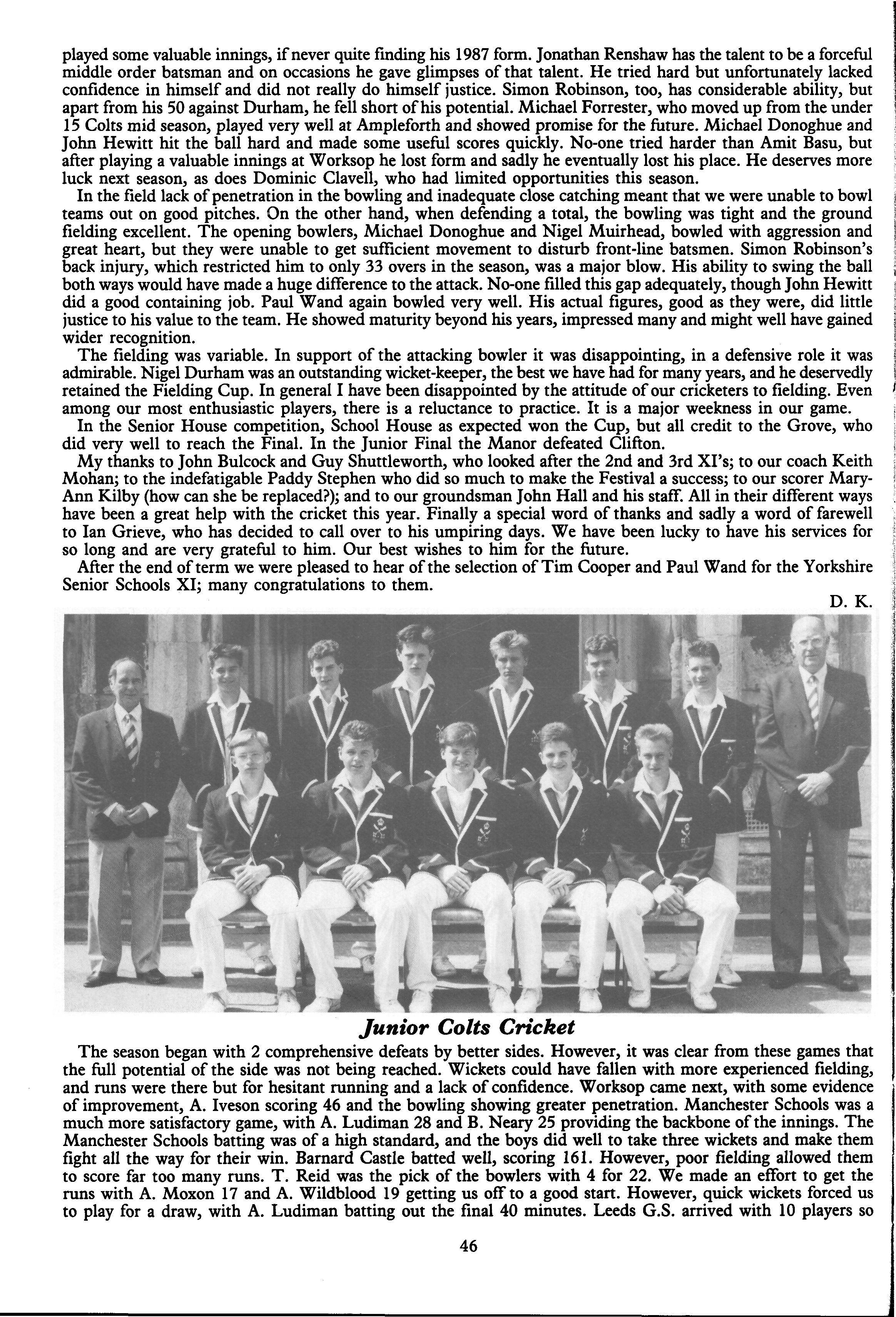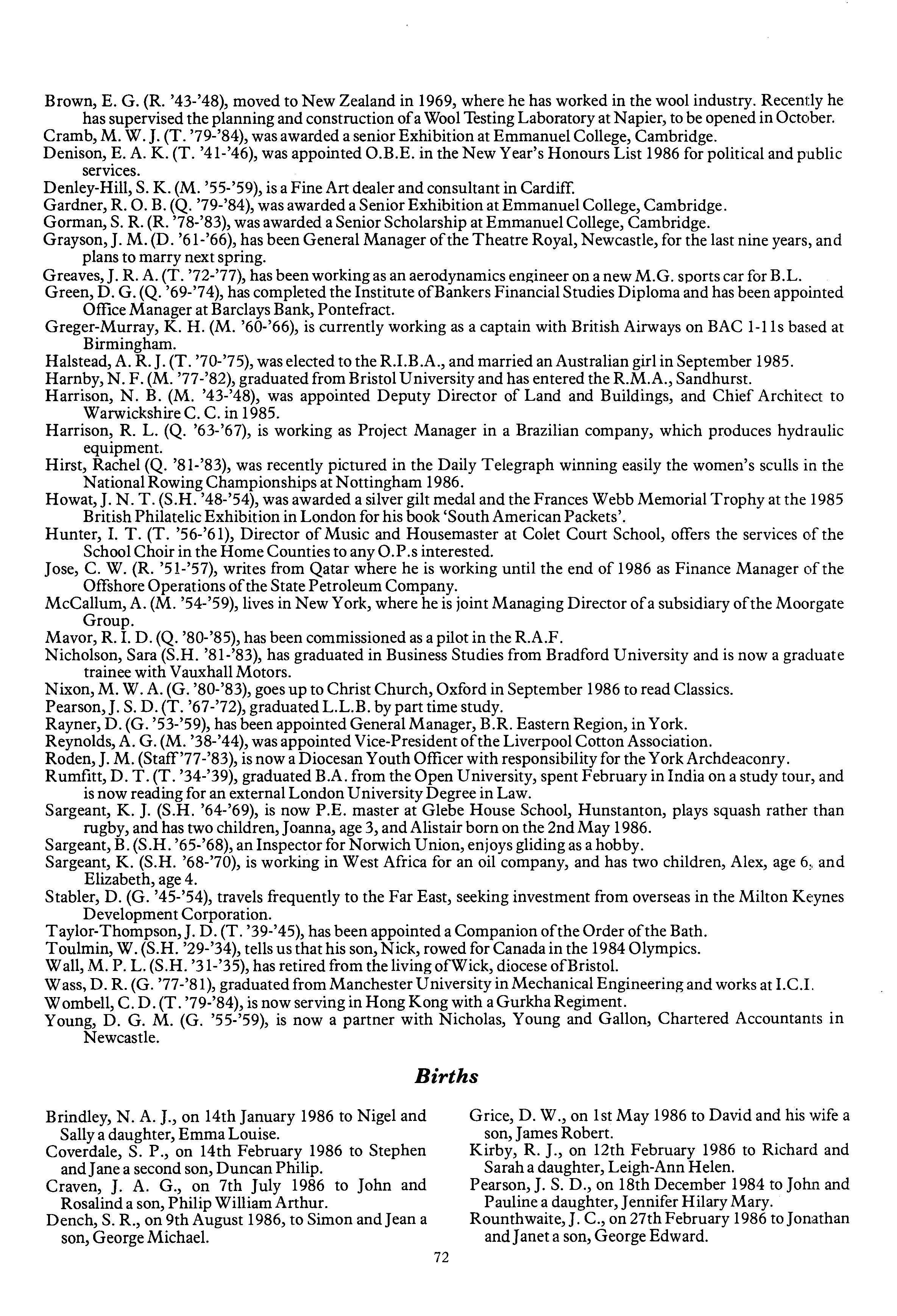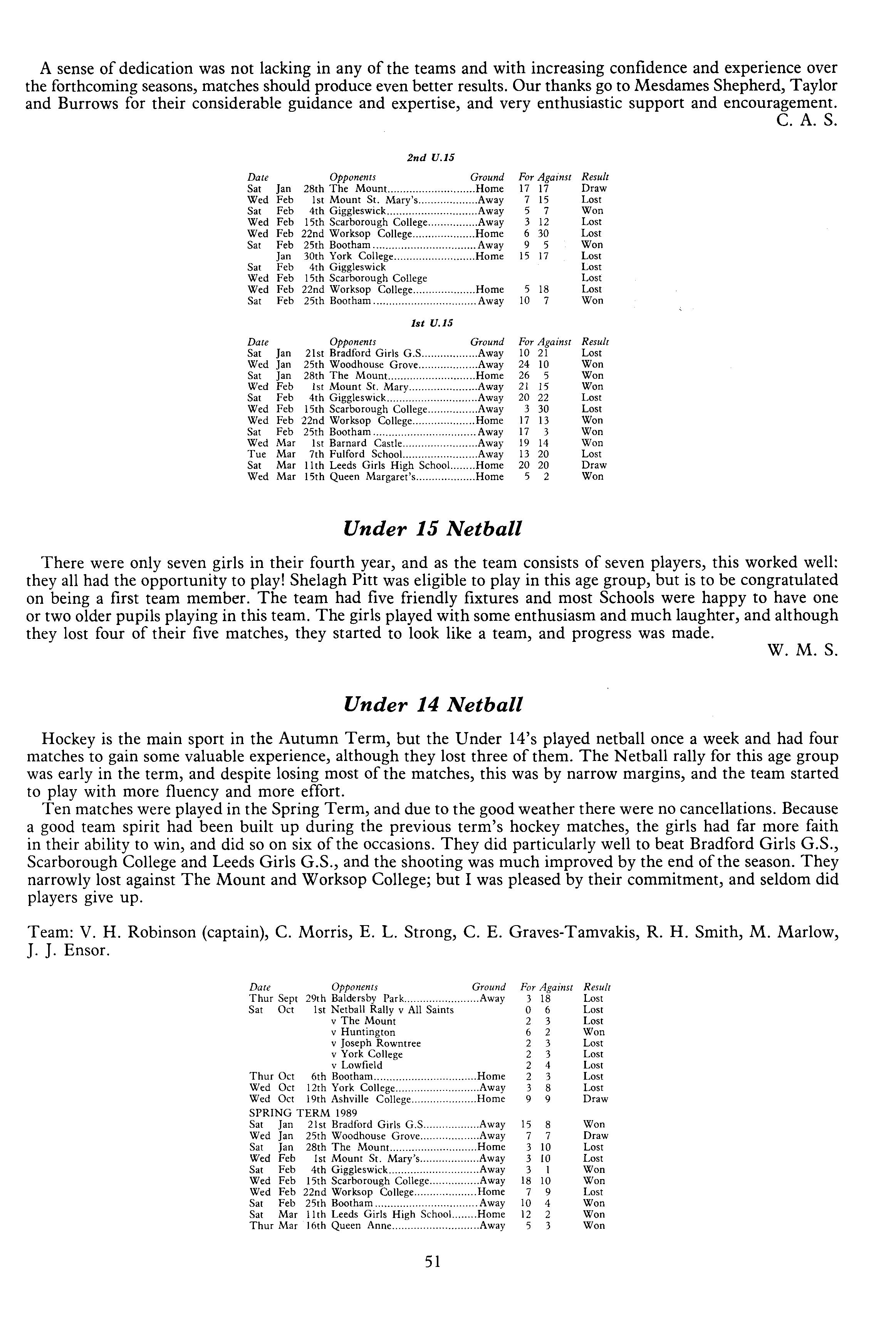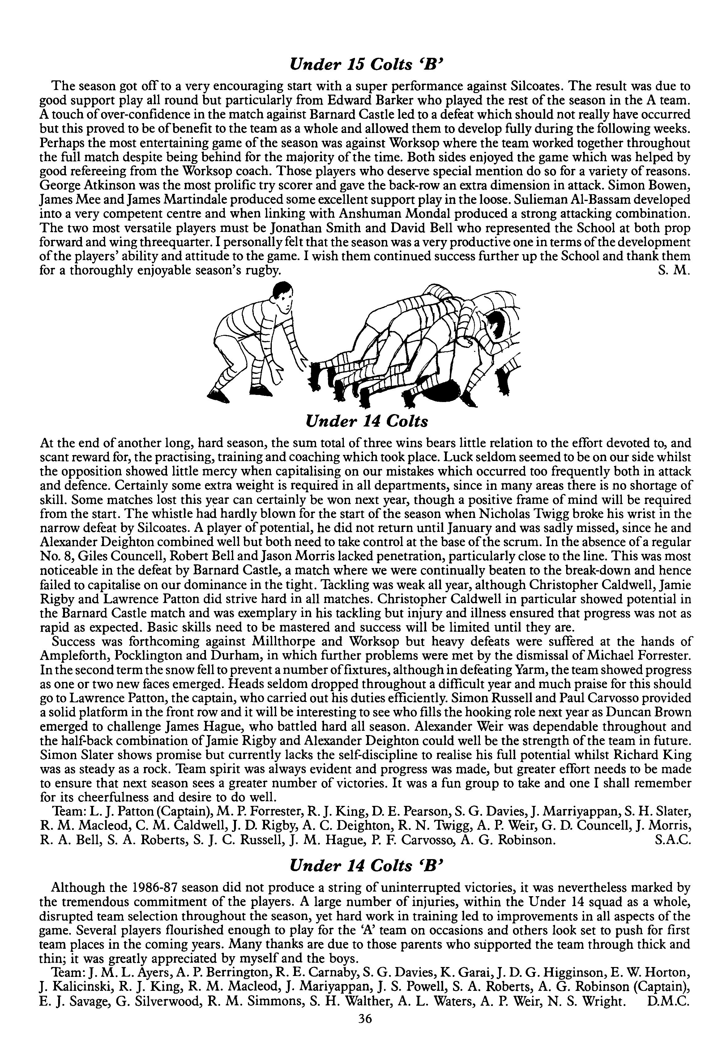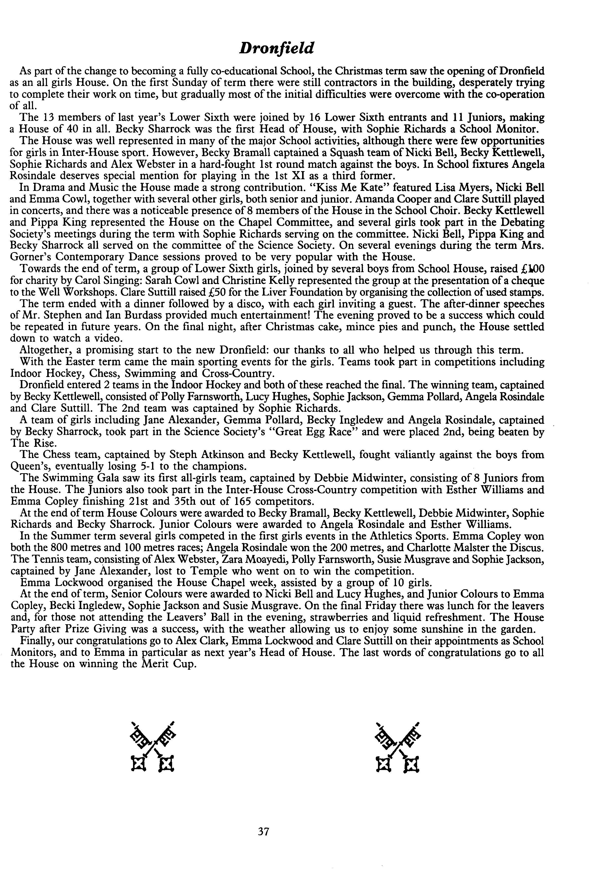 In September 1985 Mr. D. M. Crook, B.A. (Hull), joined the Staff to teach French, Mr. R. G. Shread, M.Sc. (York), to teach Chemistry, and for one year, Mr. P. R. Kingsbury, B.Sc. (York), to teach Mathematics. They are happily making their mark in many areas. During the year Mrs. J. Dawson and Mrs. J. C. Dench have left and we congratulate them on the birth of their children. Mr. D. J. Raggett has gone to Fulford School to look after Computer Studies. Major P. B. Jelbert has succeeded Colonel J. P. F. Abbott asBursar. Wewish all these ladies and gentlemen well, and thank the leavers for what they have done, especially Colonel Abbott who has served the School untiringly for twelve yearsin a most important role.