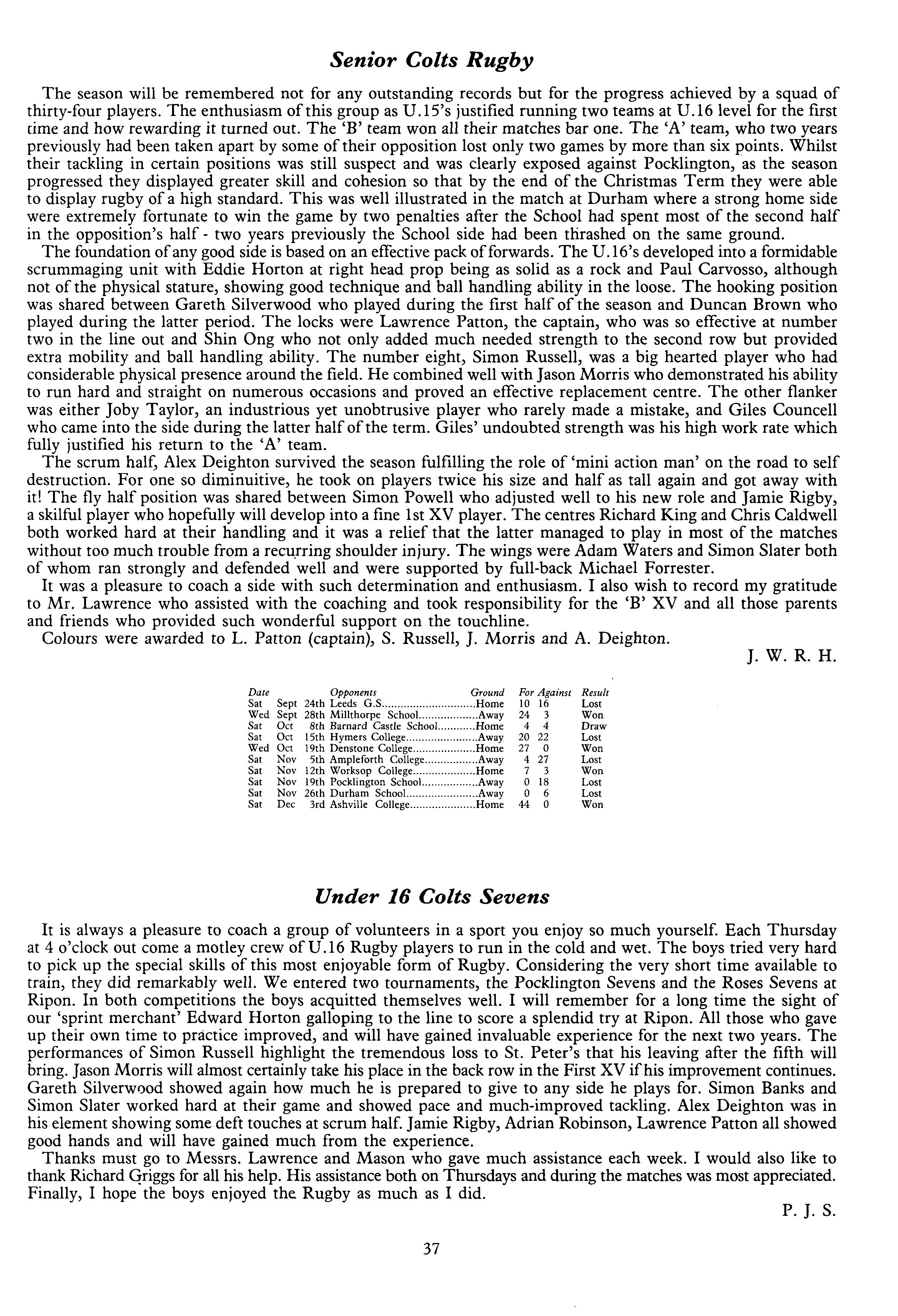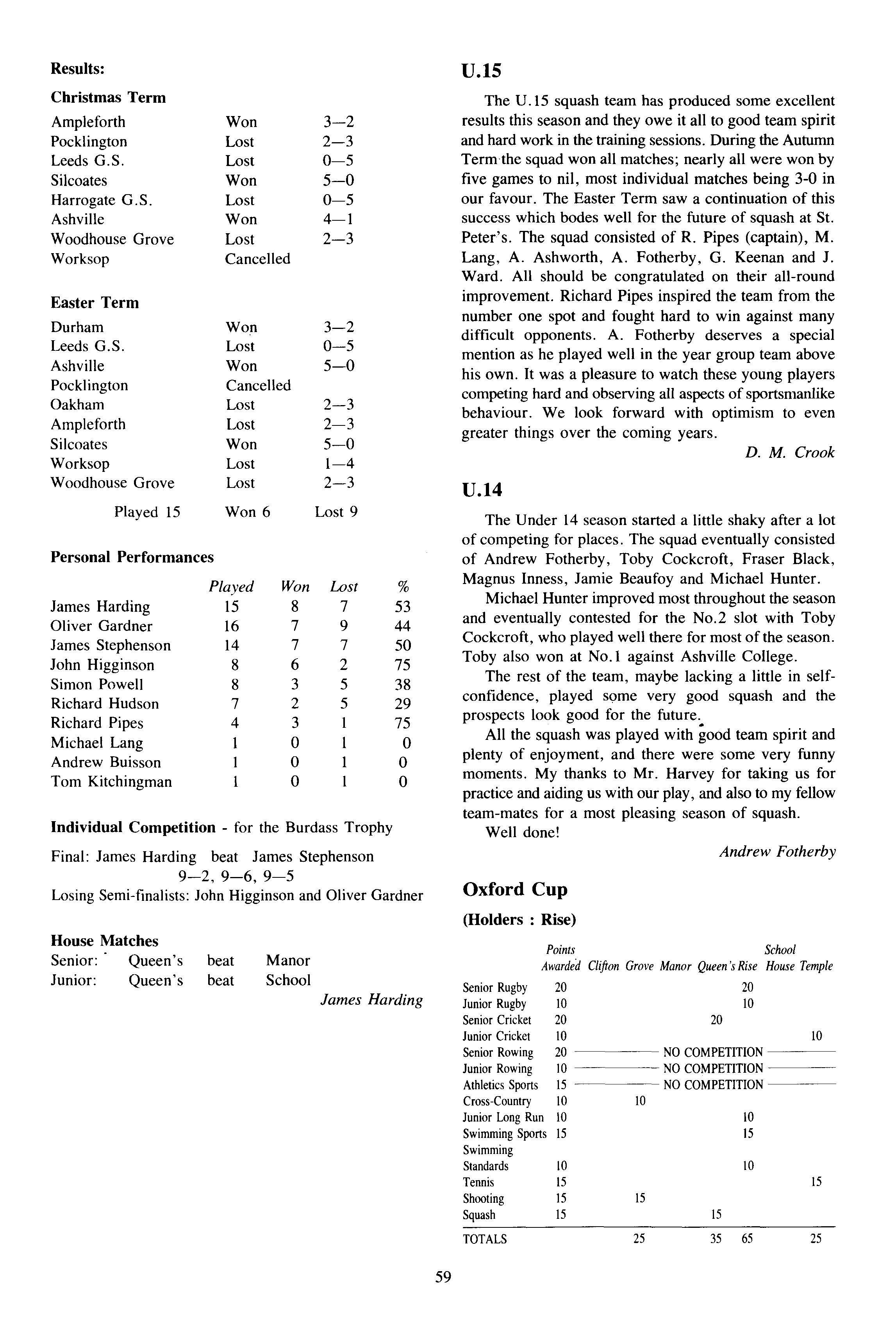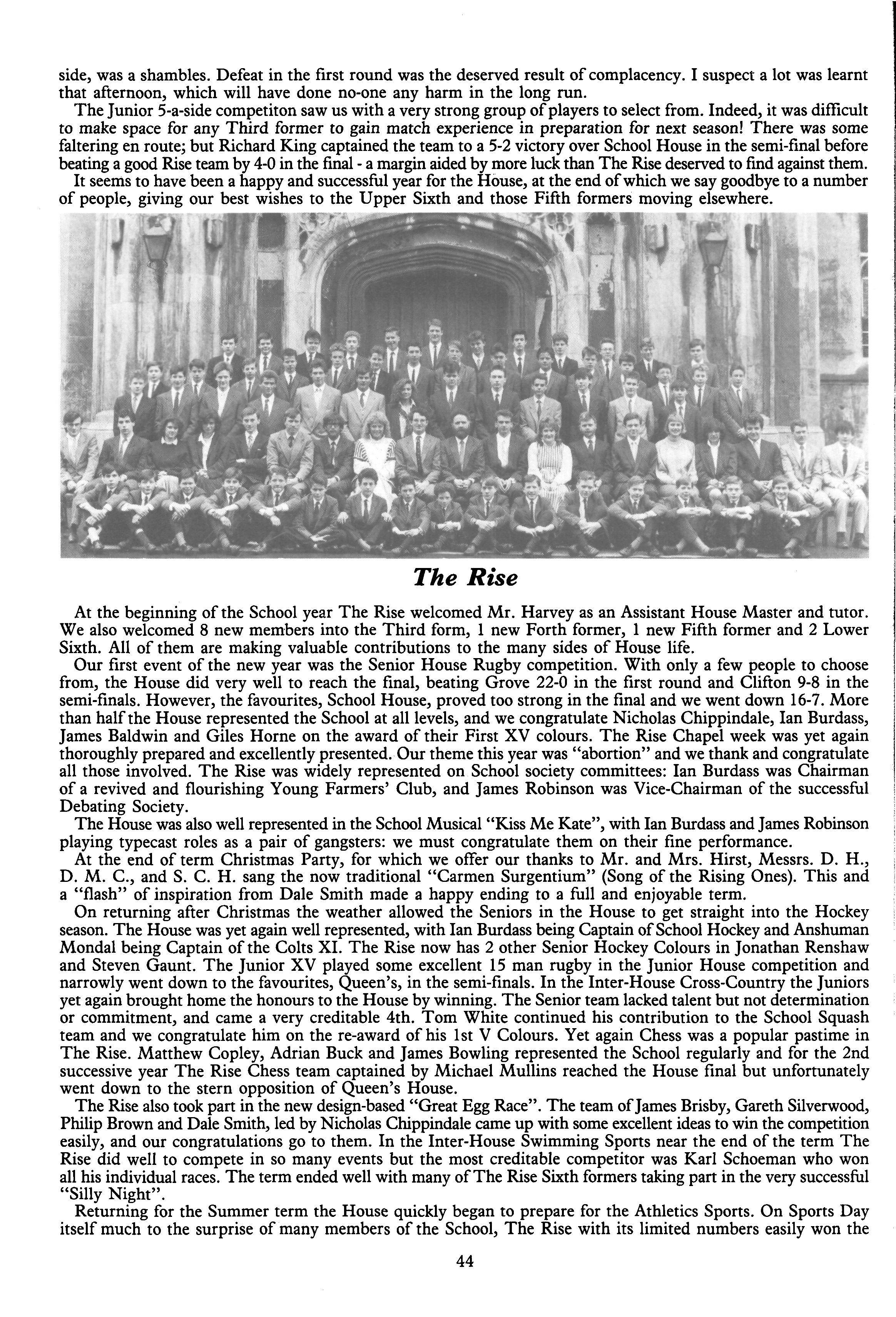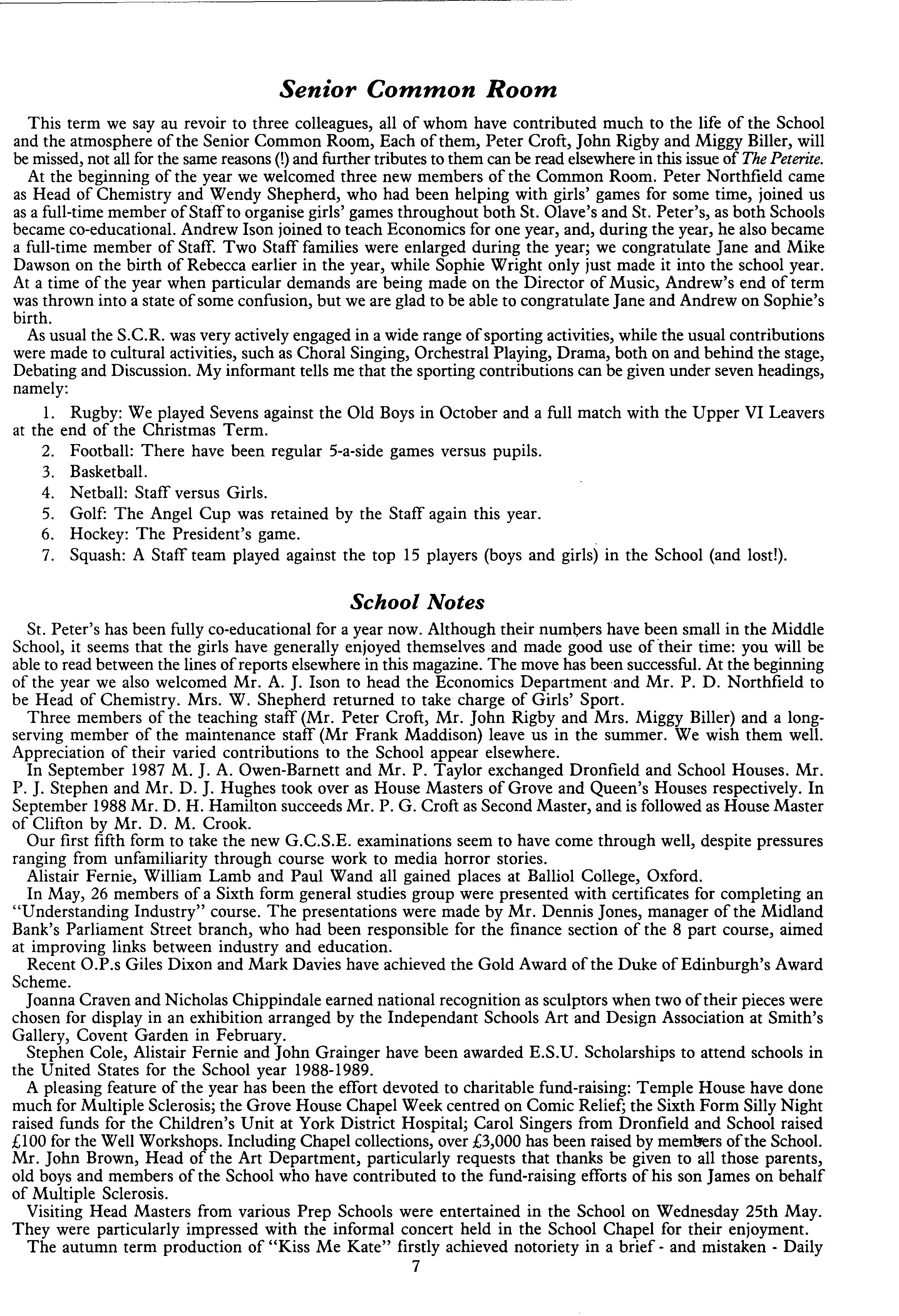 The usual wide range of sporting activities can also be recorded, while the older and/or less athletic of us could only sit and admire. Activities included numerous 5-a-side football games and an 11-a-side match against leavers, a 7-a-side rugby match against Old Peterites in the Christmas Term and a full 15-a-side match against the Old Peterites in the Easter Term - in this match the S.C.R team was grateful for the help given by members ofthe 1st XV in making up the numbers The S.C.R was also involved in hockey and basket-ball while a number of cricket matches arepending at the time ofwriting these notes.