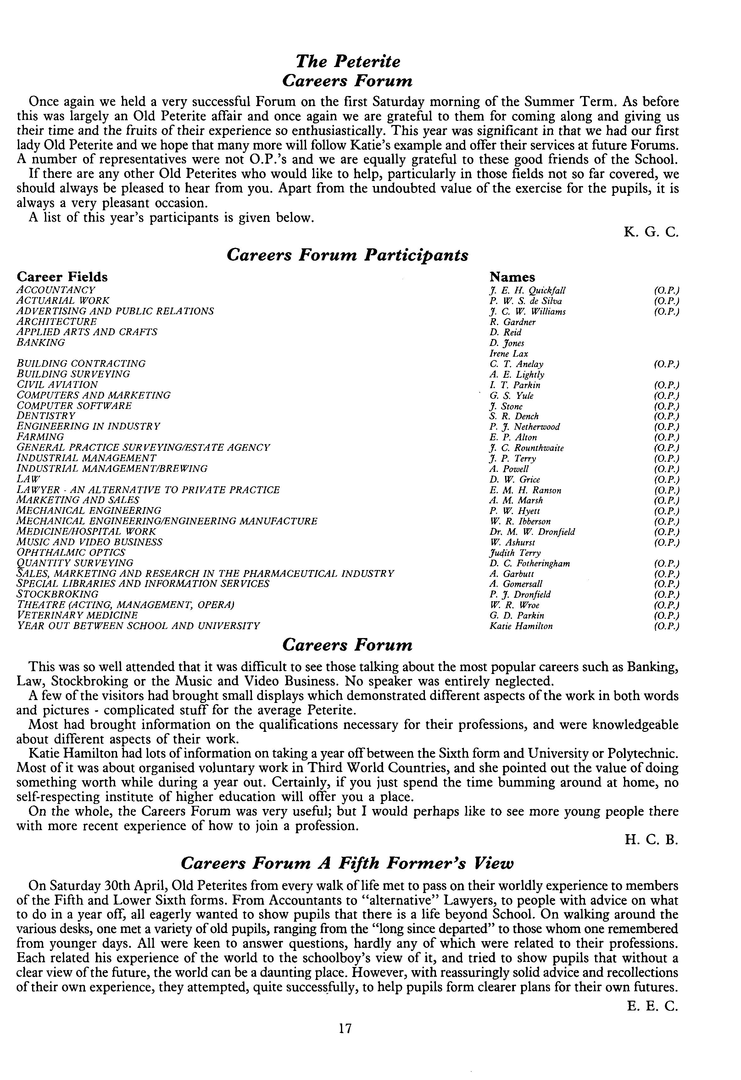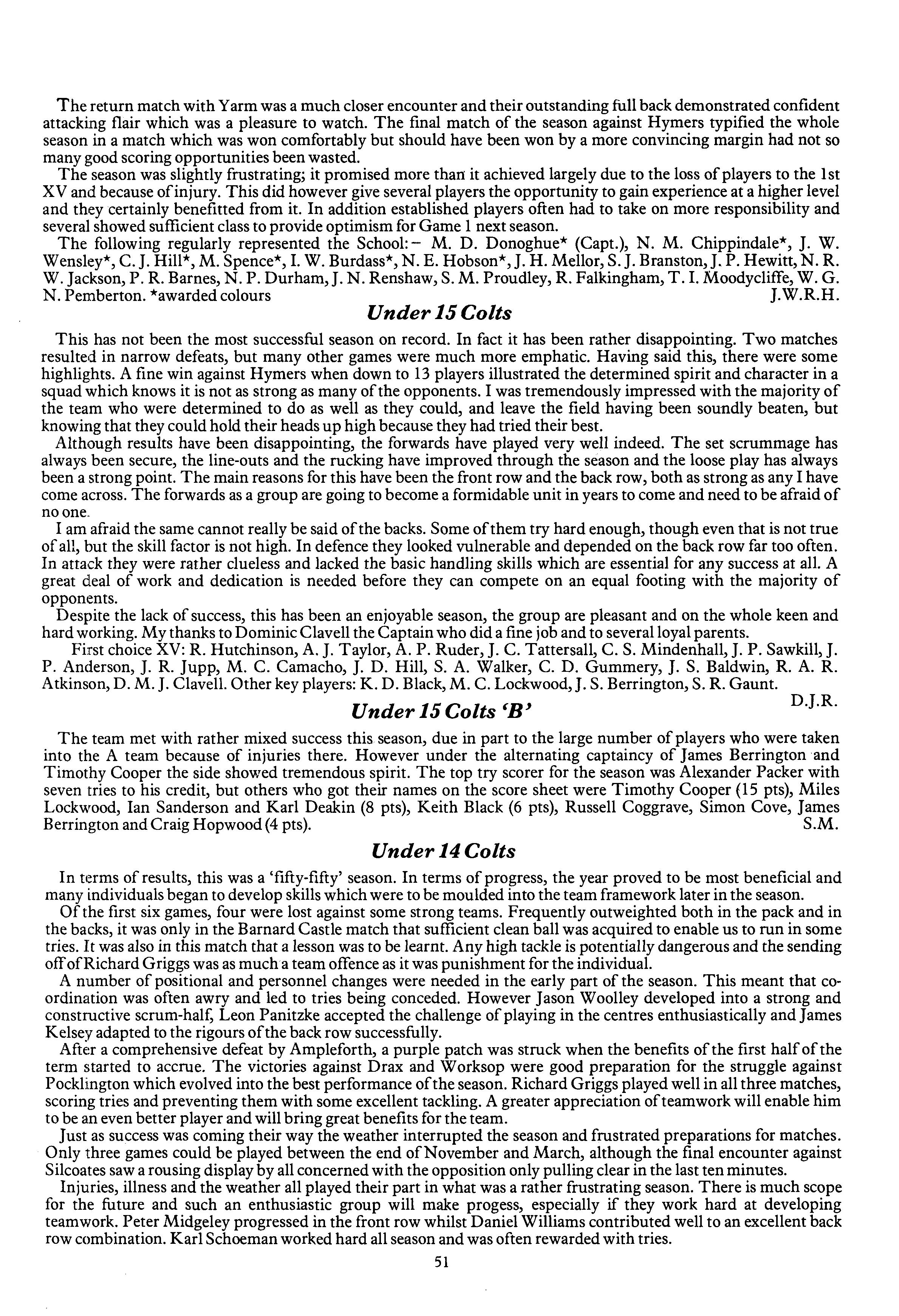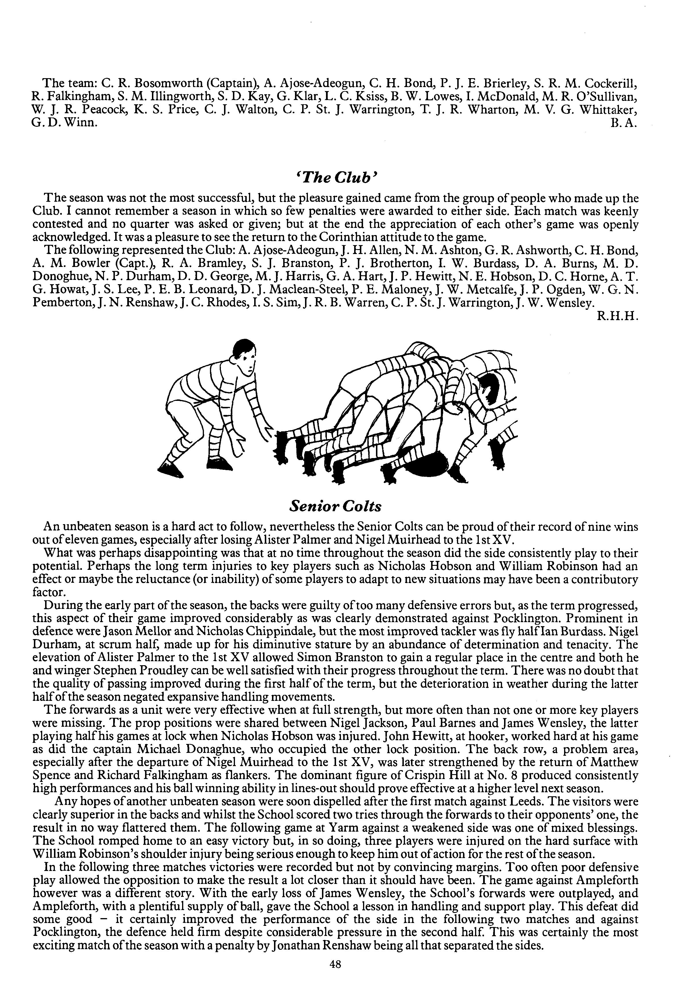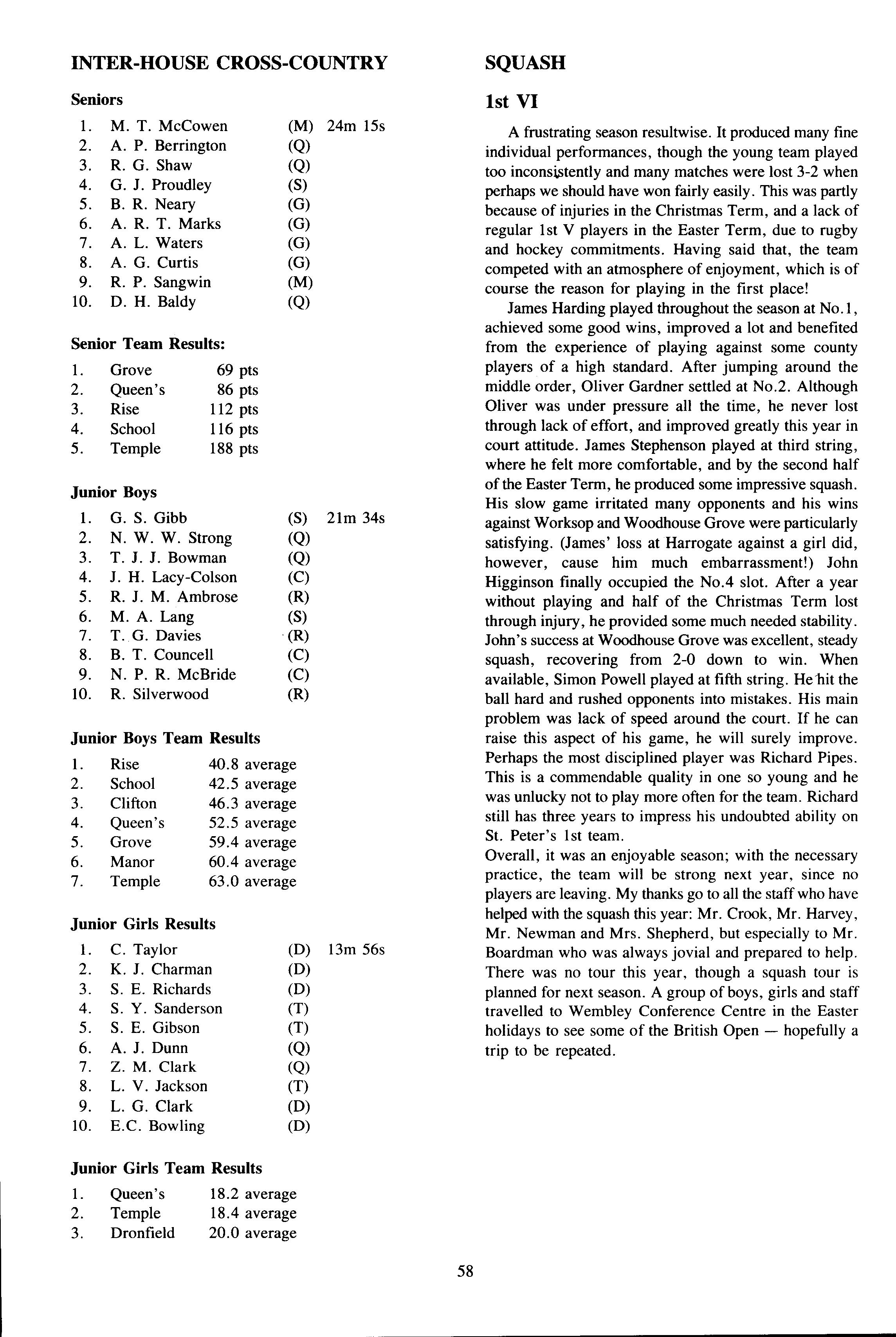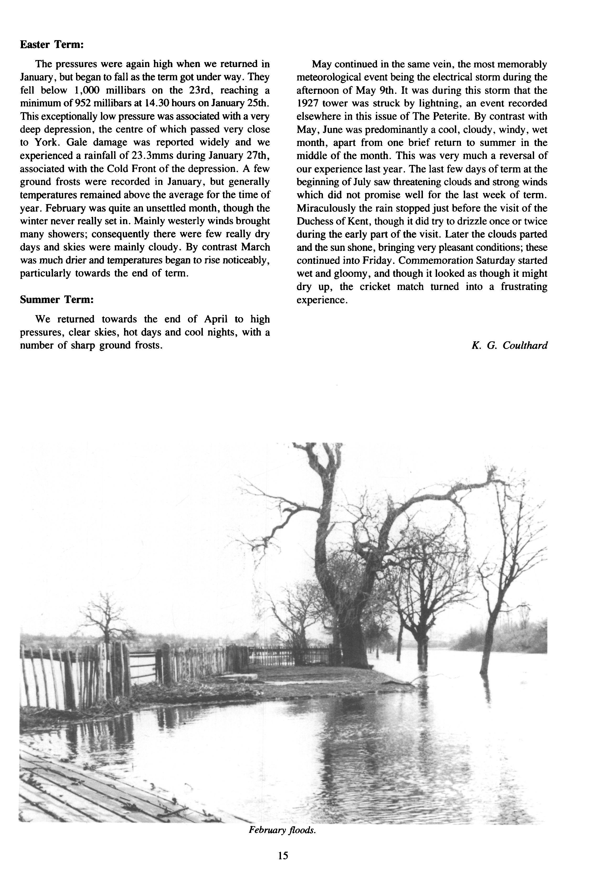 The usual wide range of sporting activities can also be recorded, while the older and/or less athletic of us could only sit and admire. Activities included numerous 5-a-side football games and an 11-a-side match against leavers, a 7-a-side rugby match against Old Peterites in the Christmas Term and a full 15-a-side match against the Old Peterites in the Easter Term - in this match the S.C.R team was grateful for the help given by members ofthe 1st XV in making up the numbers The S.C.R was also involved in hockey and basket-ball while a number of cricket matches arepending at the time ofwriting these notes.