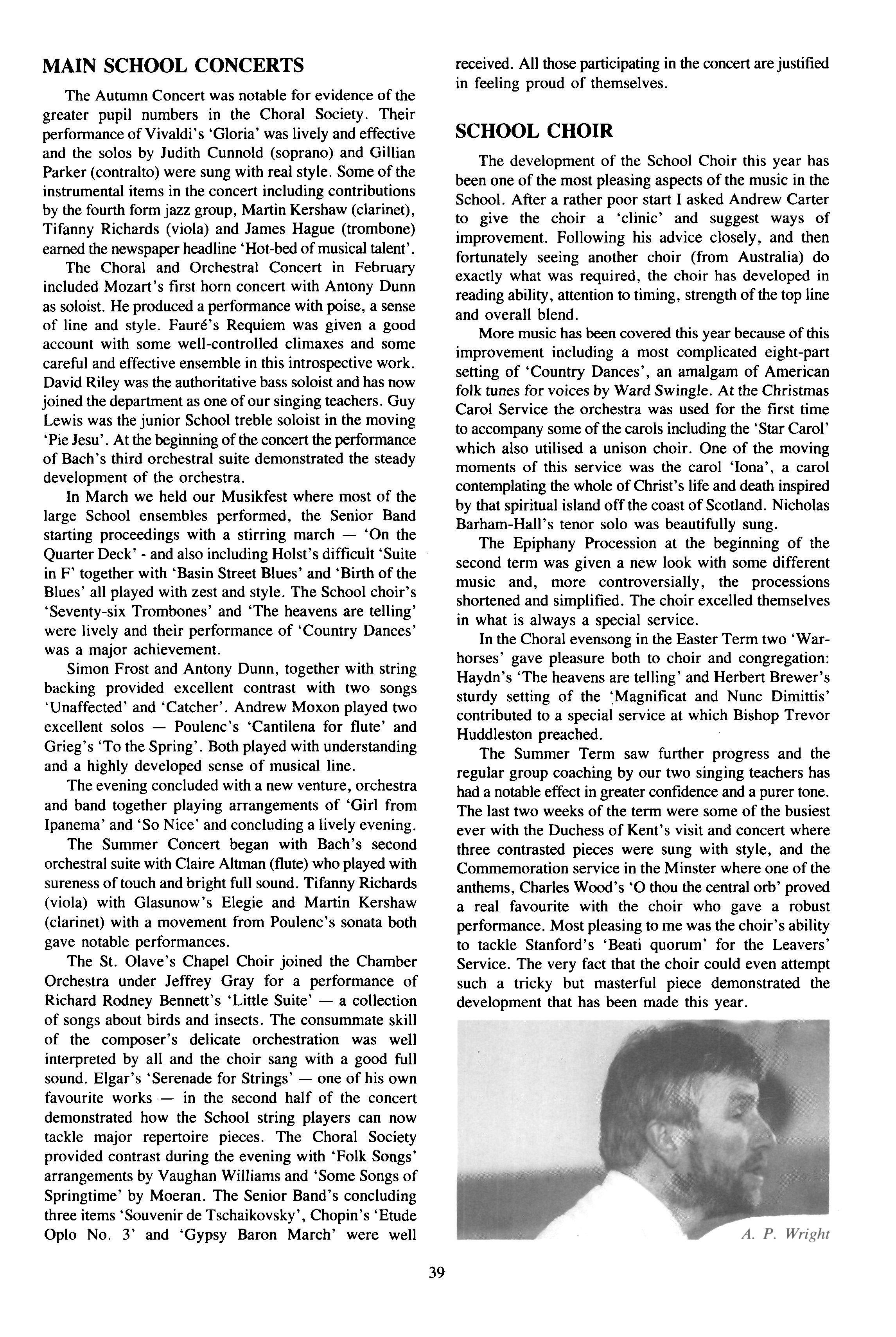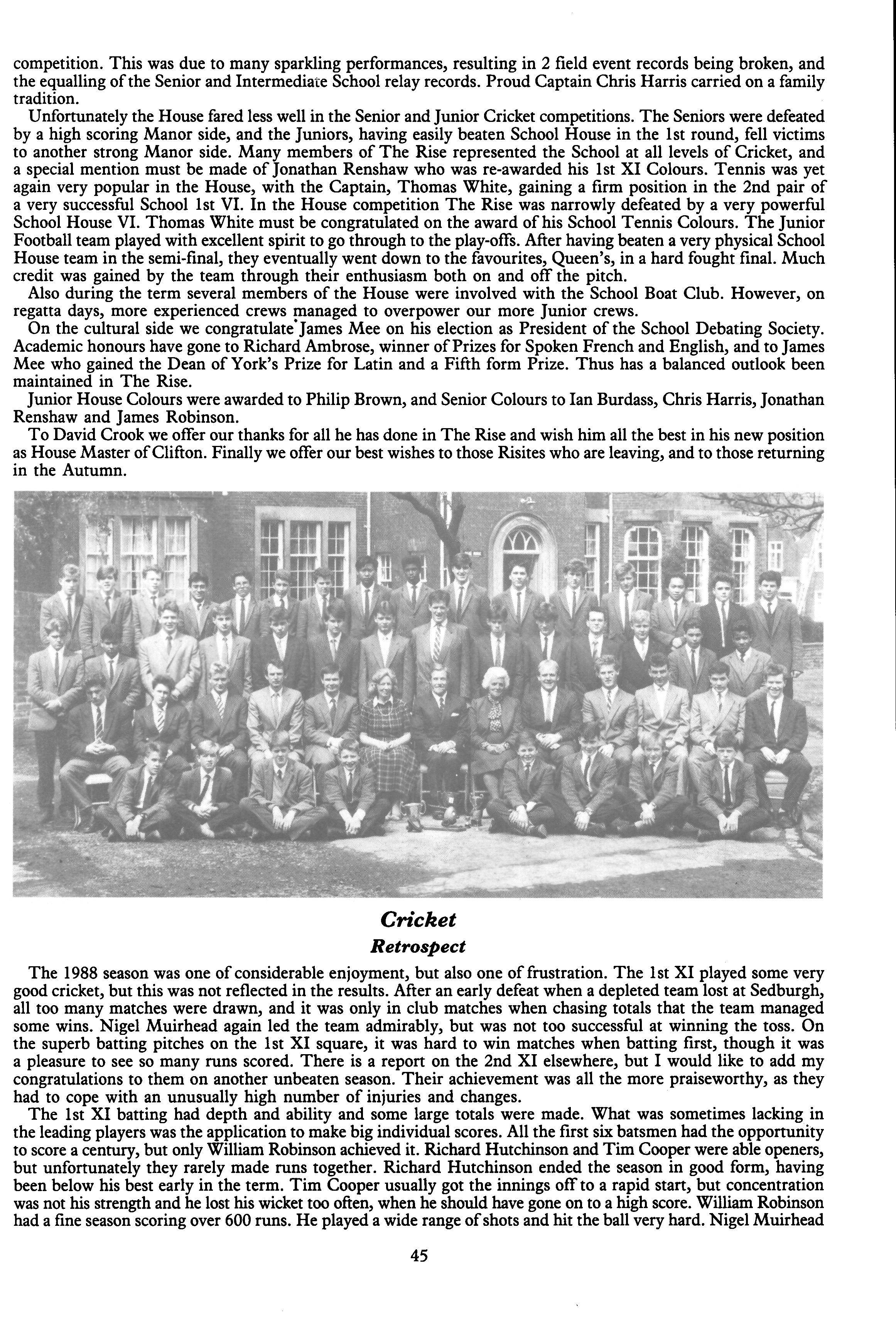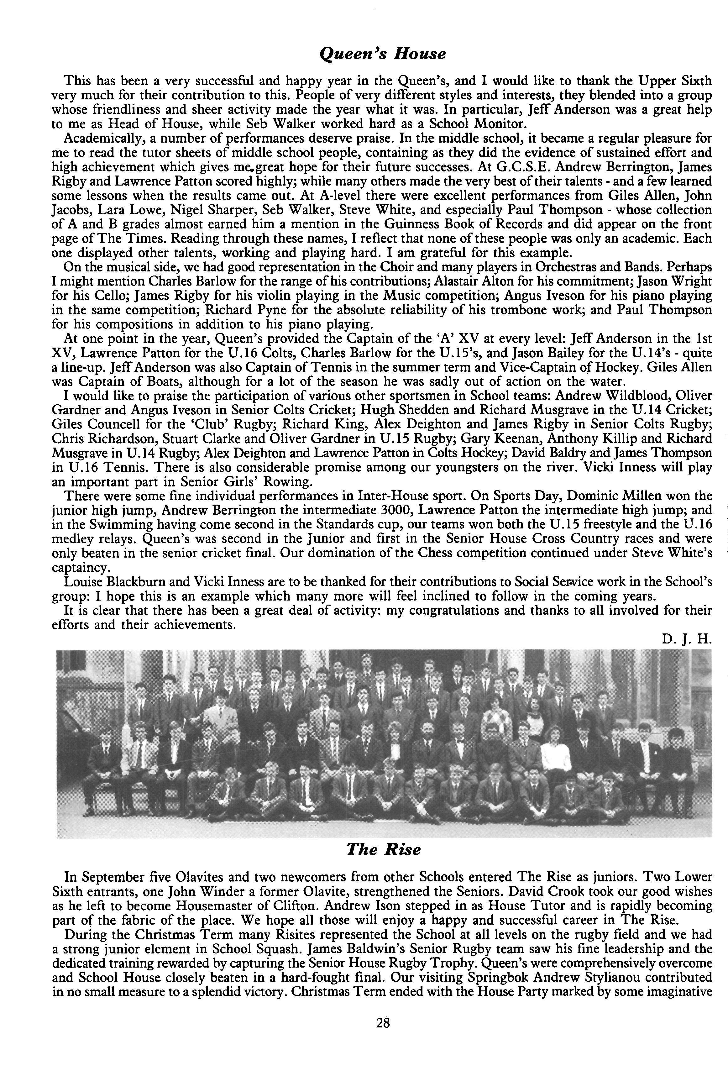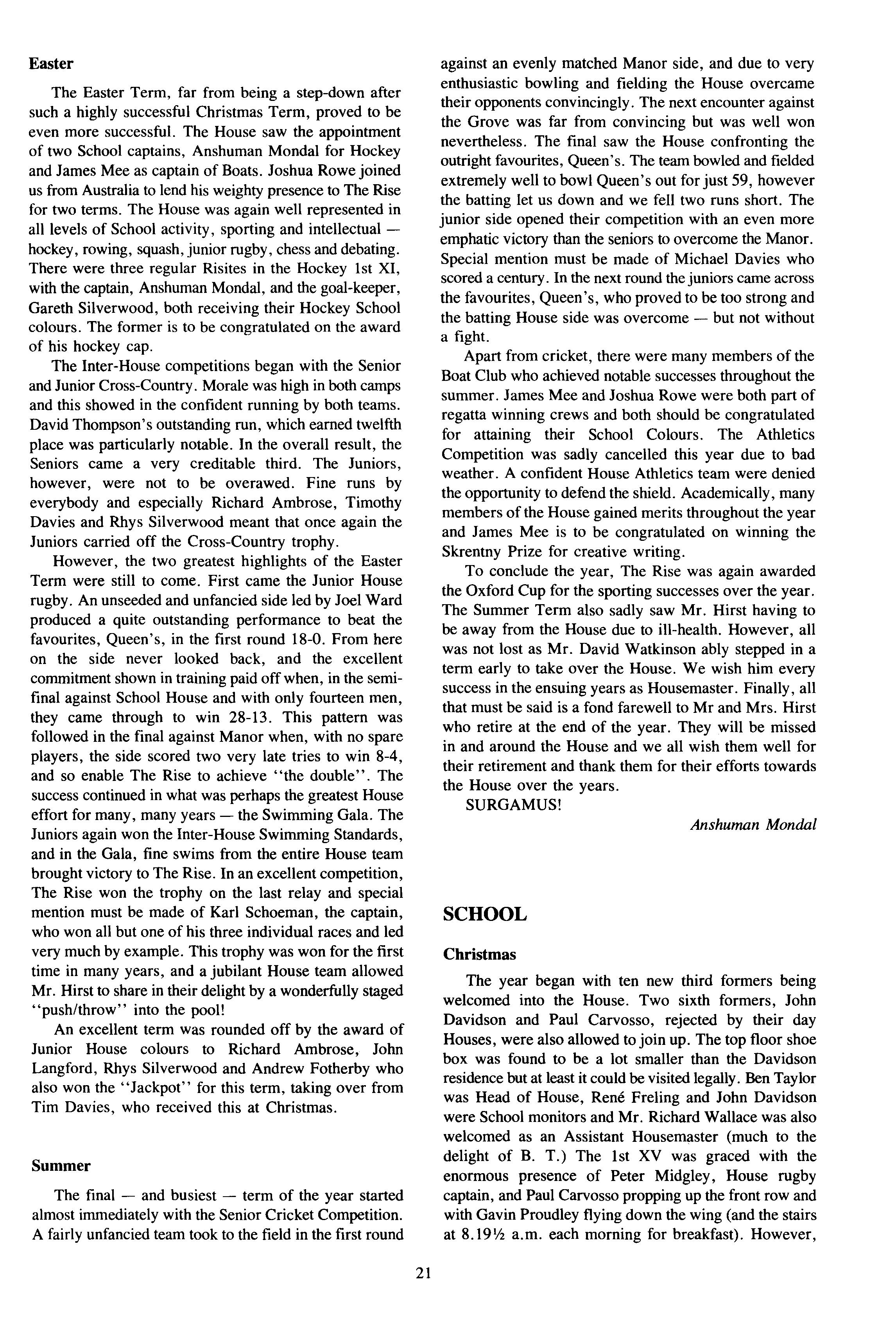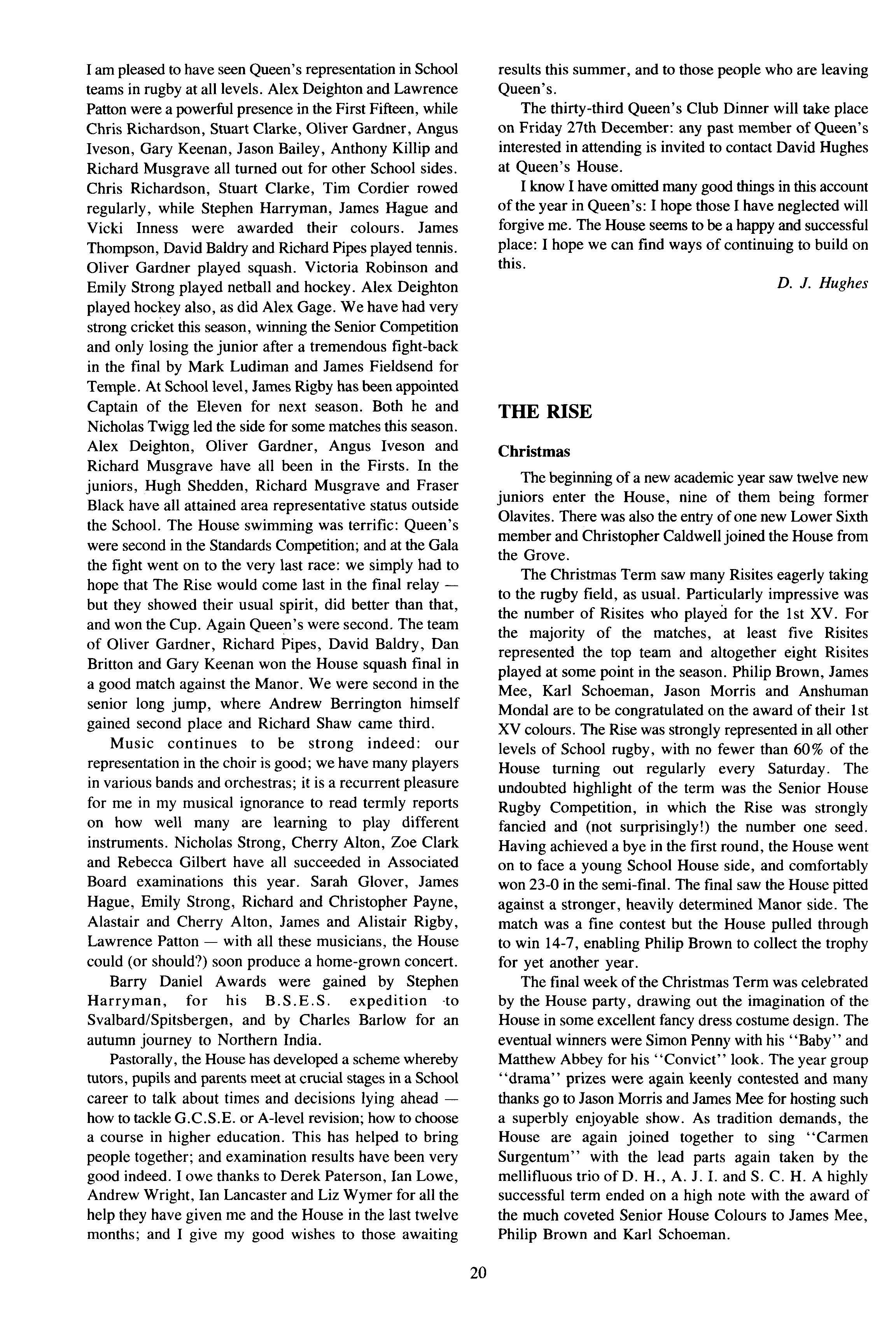 It is customary on these occasions to list a large number of activities and events to illustrate the breadth of the School's extra-curricular life. This 'hidden curriculum' should surely be a very important part of what any good school has to offer, and I was glad to discover that much which is both worthwhile and enjoyable flourished here outside the timetabled lessons. I firmly hold the view that it is the boy or girl who works hard and successfully at his or her studies and is also involved fully in all that the School offers outside the classroom who receives the truly fulfilling education Gibbon had the right ideawhen hewrote this ofthe Emperor Gordian: