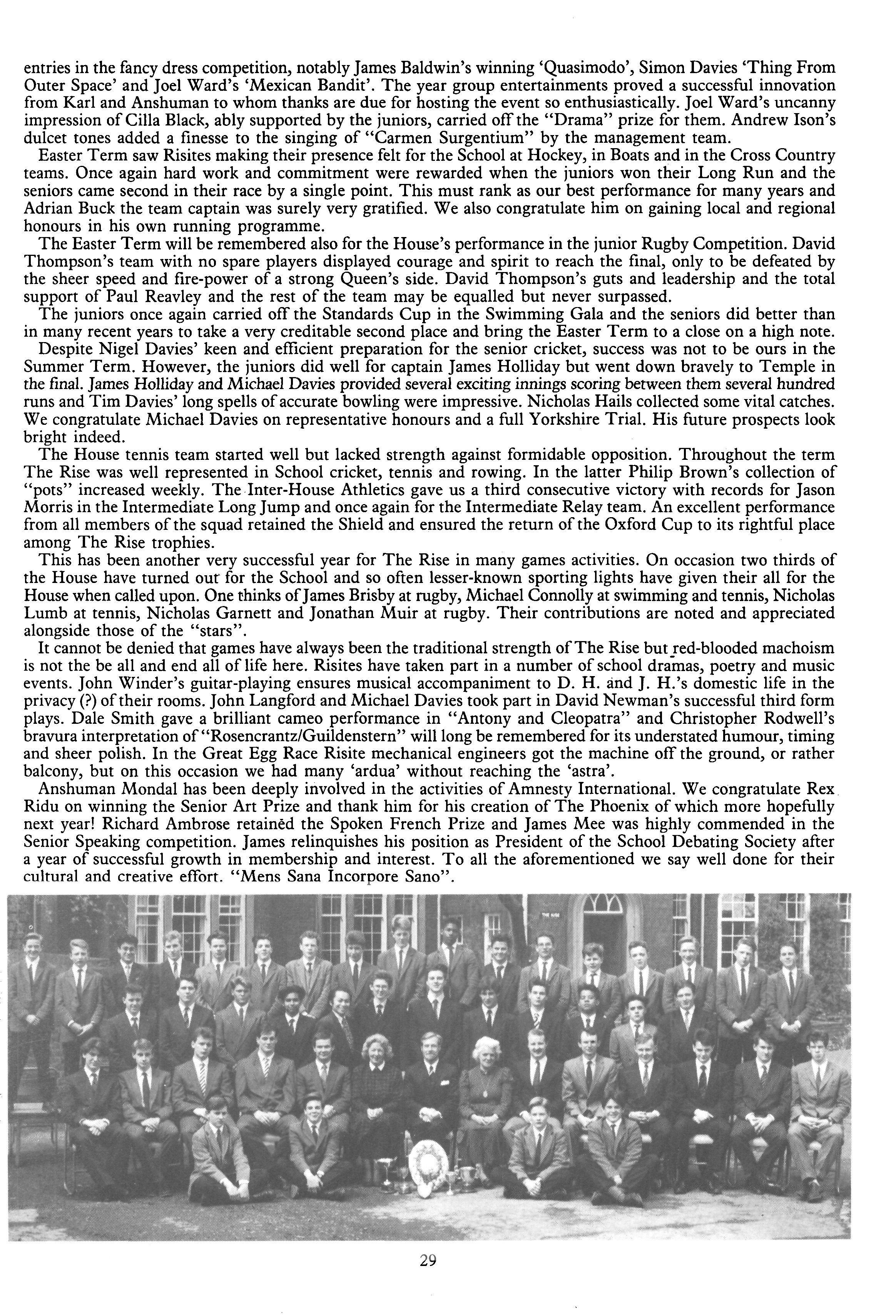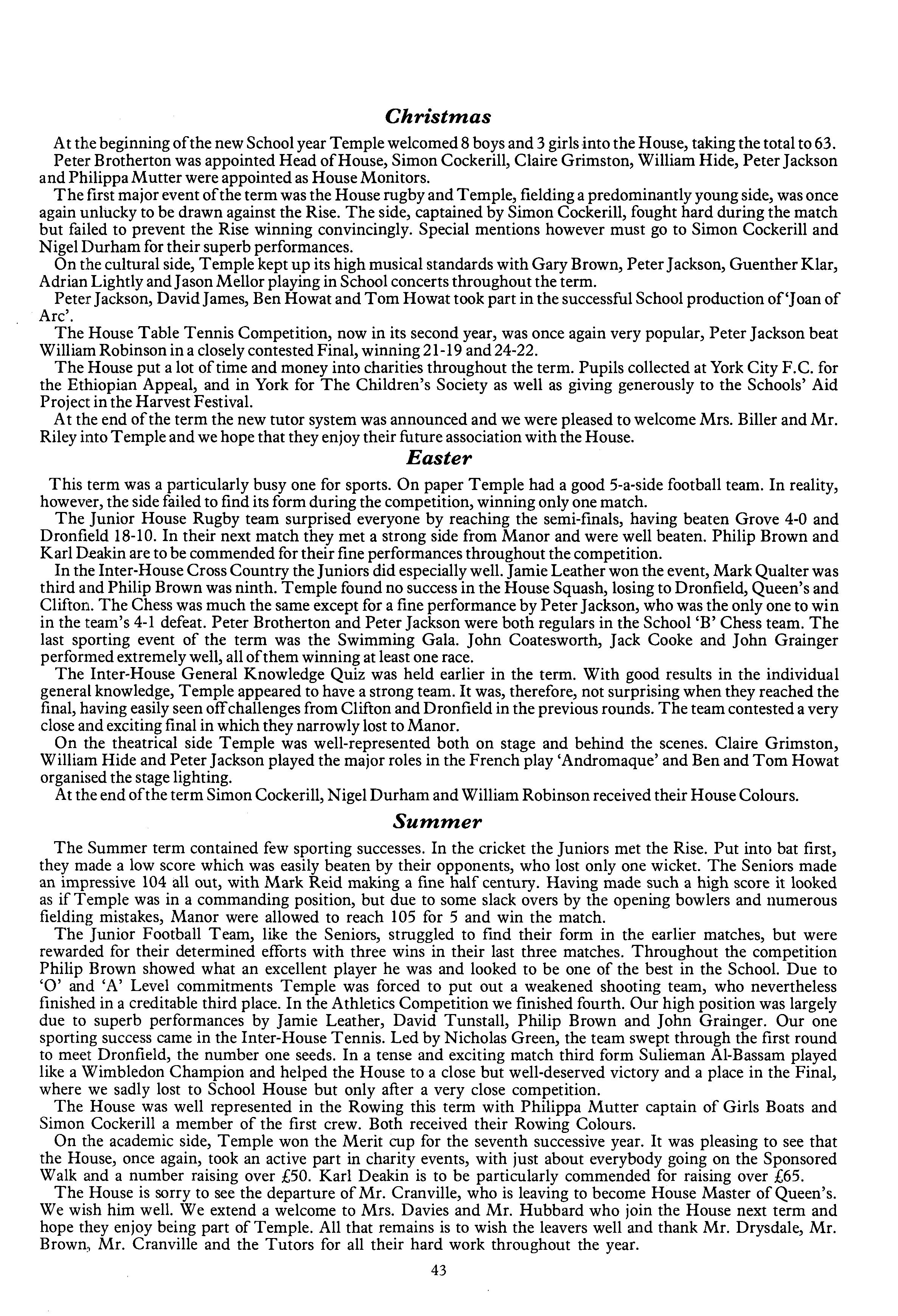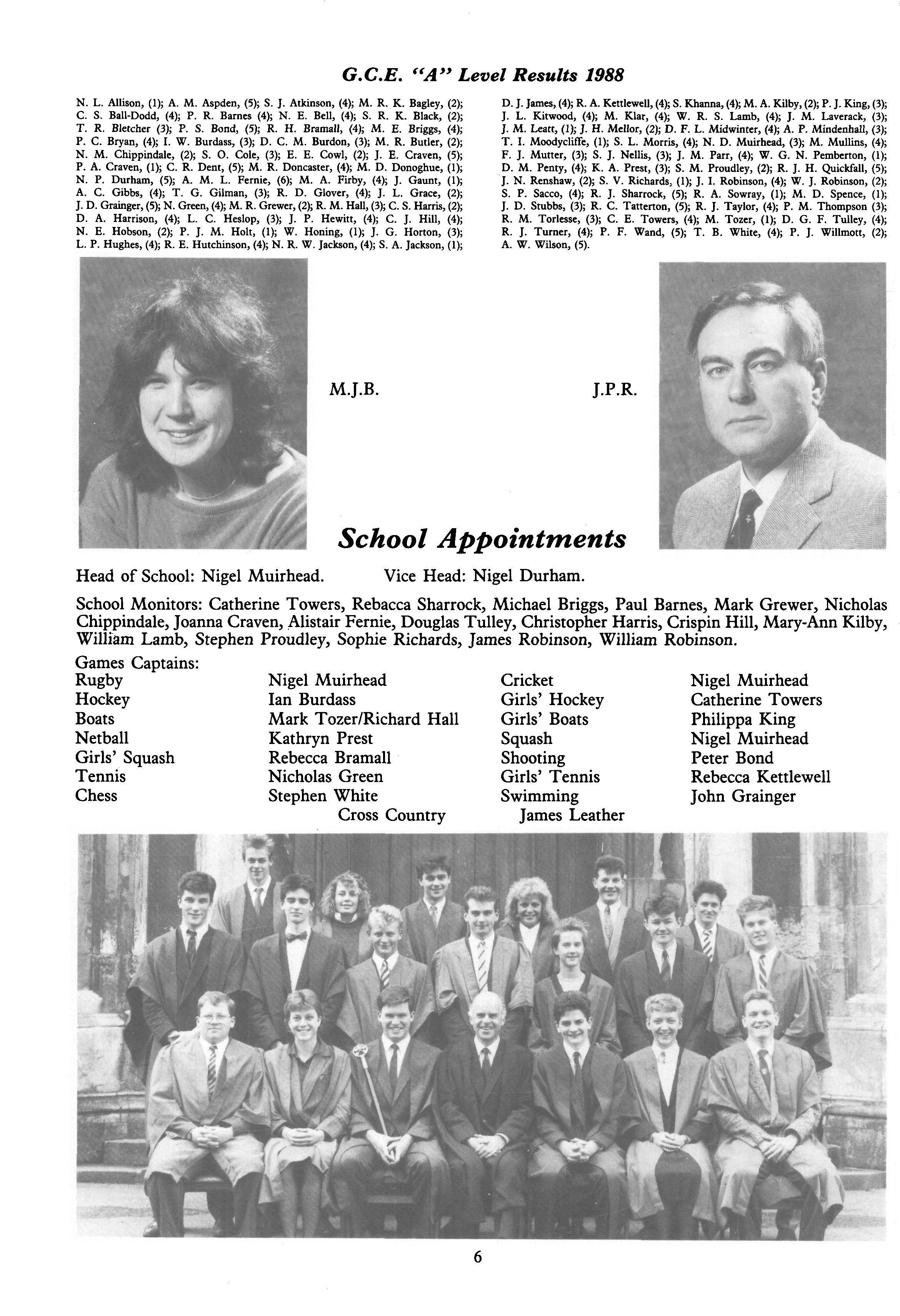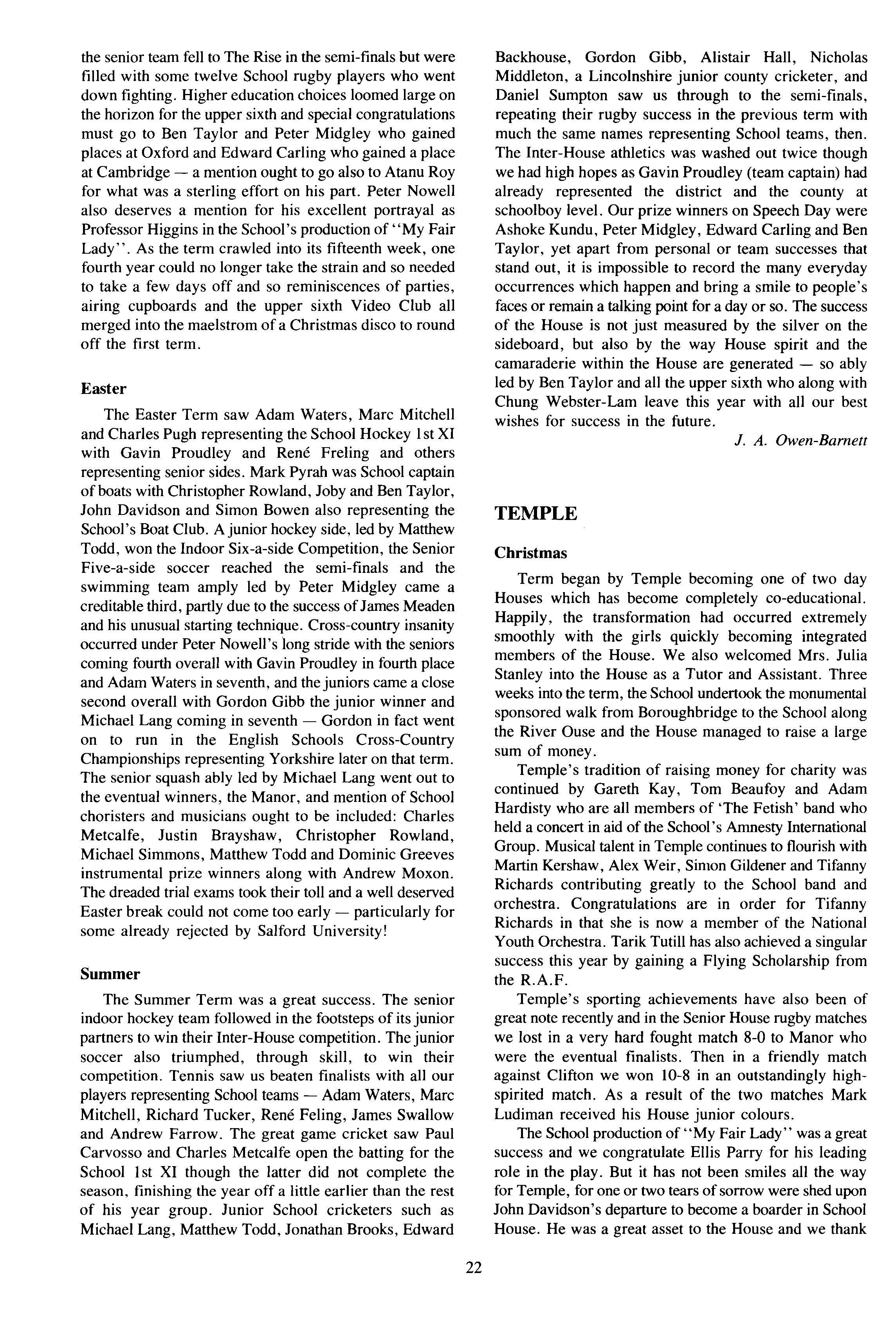 It is customary on these occasions to list a large number of activities and events to illustrate the breadth of the School's extra-curricular life. This 'hidden curriculum' should surely be a very important part of what any good school has to offer, and I was glad to discover that much which is both worthwhile and enjoyable flourished here outside the timetabled lessons. I firmly hold the view that it is the boy or girl who works hard and successfully at his or her studies and is also involved fully in all that the School offers outside the classroom who receives the truly fulfilling education Gibbon had the right ideawhen hewrote this ofthe Emperor Gordian: