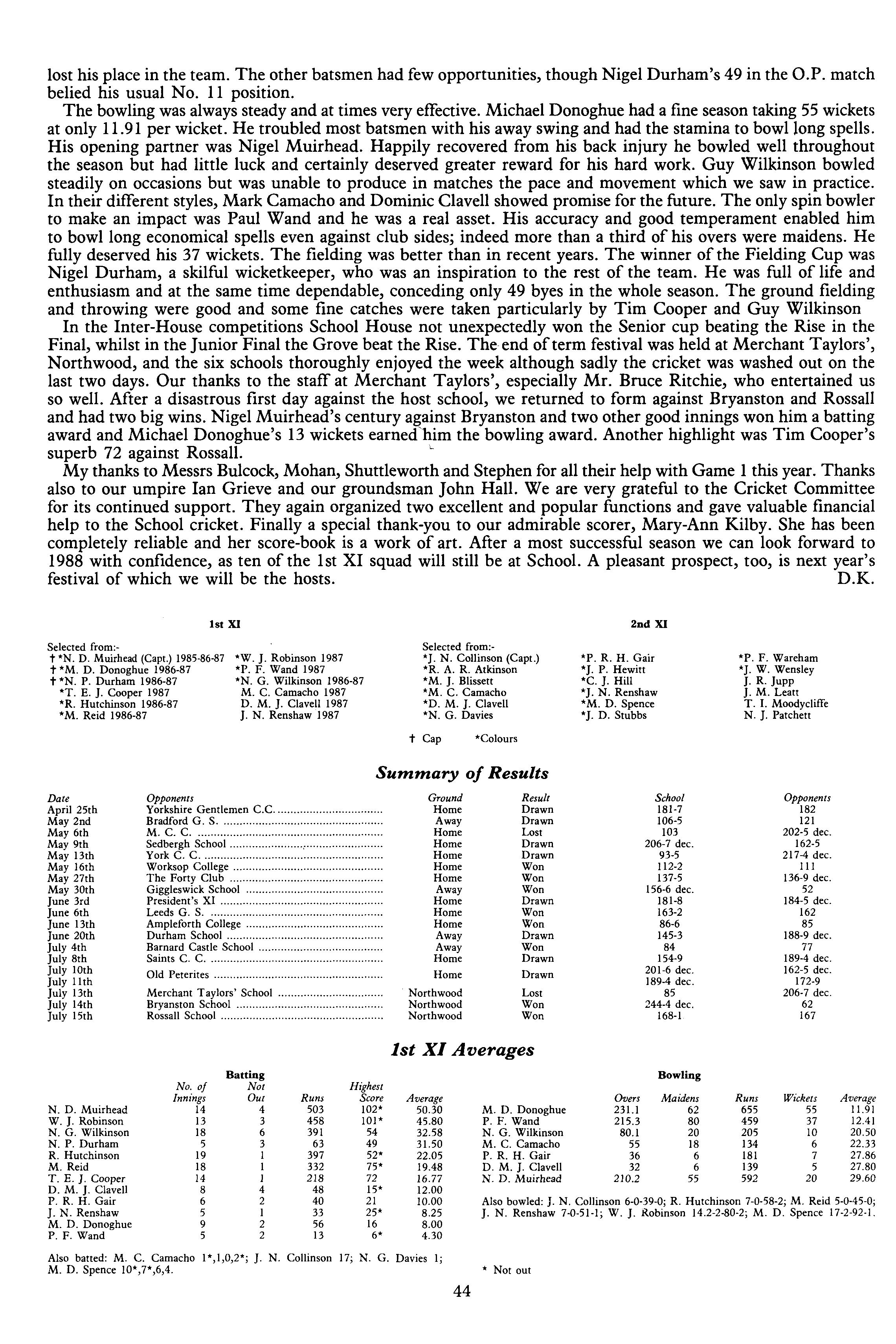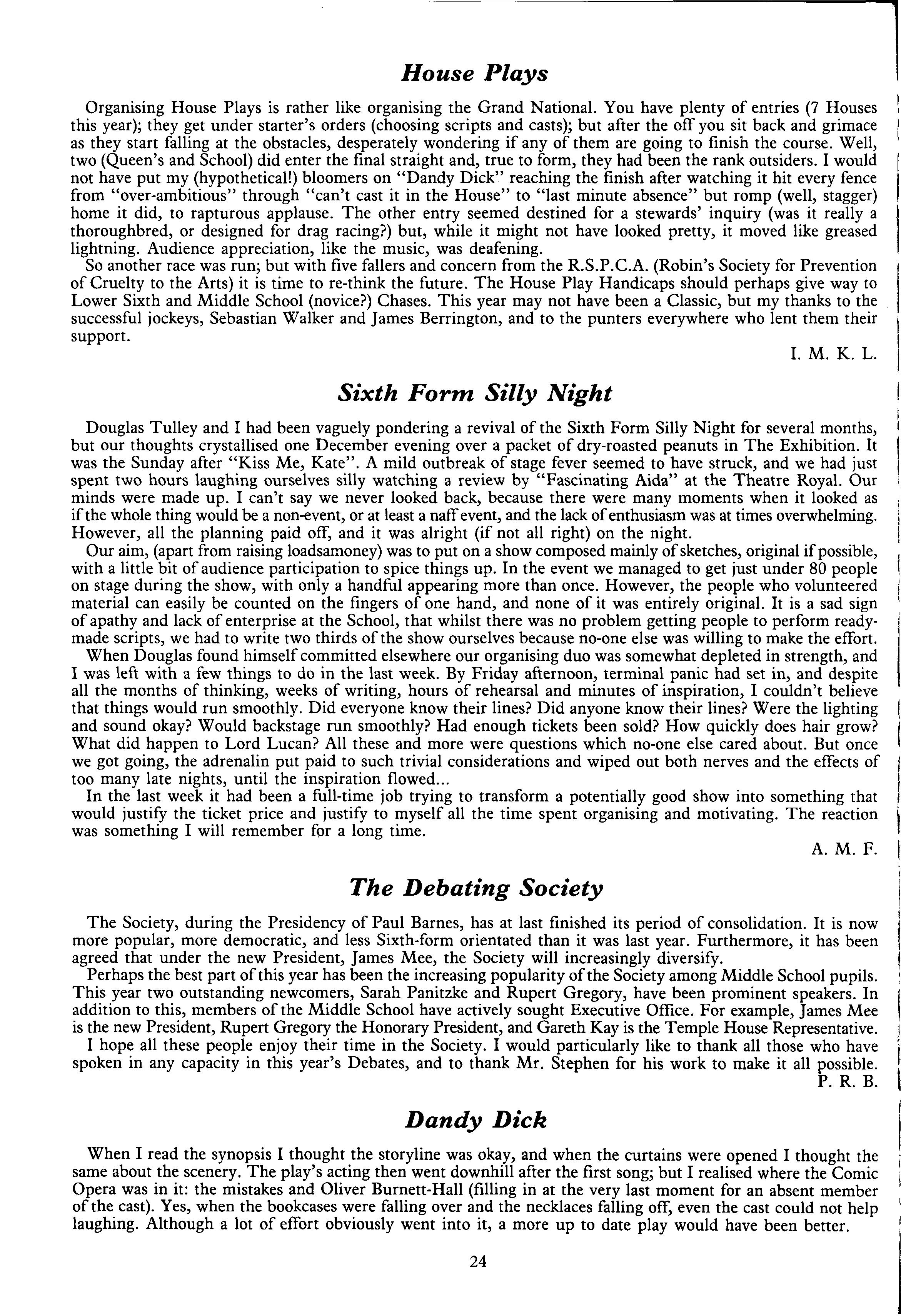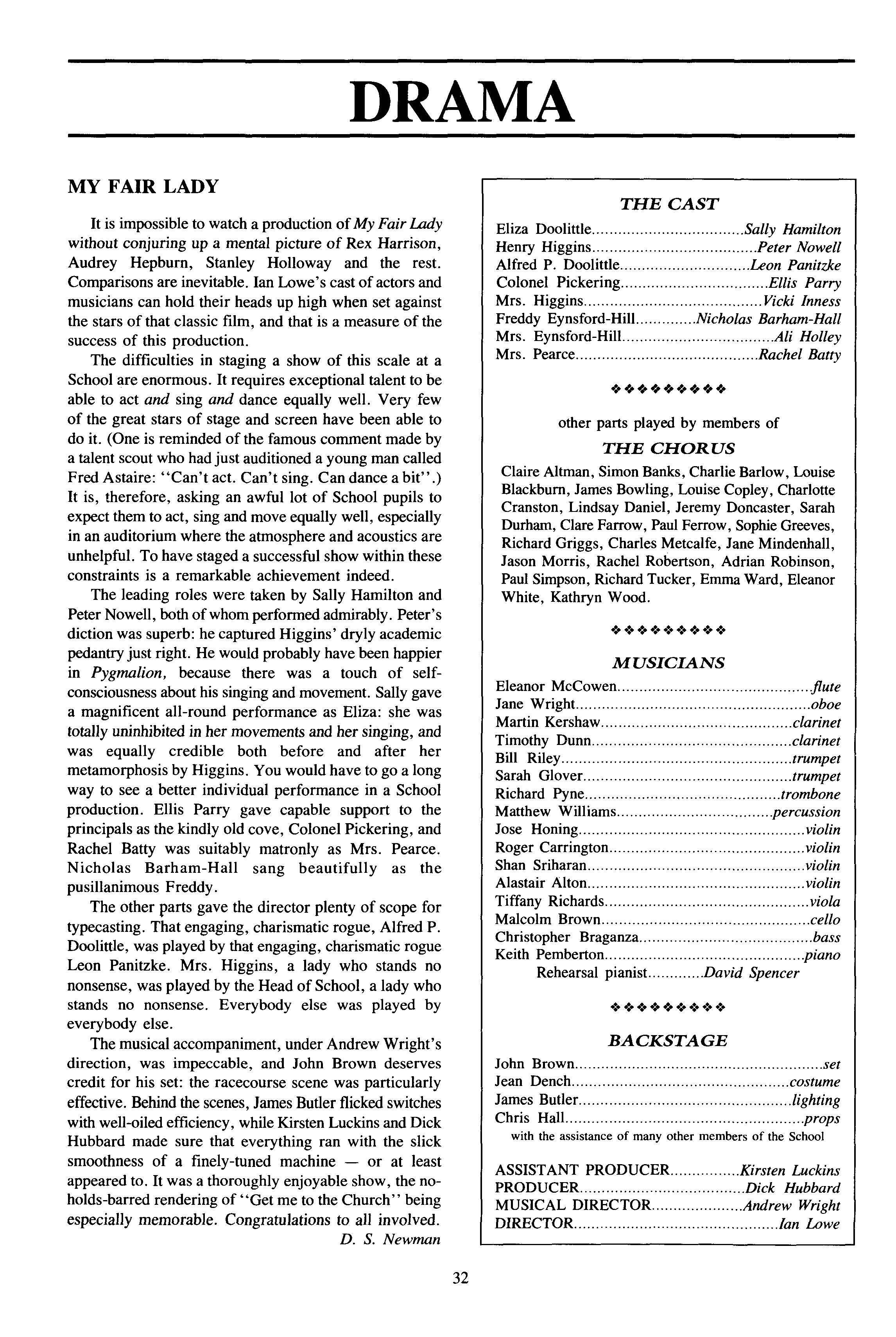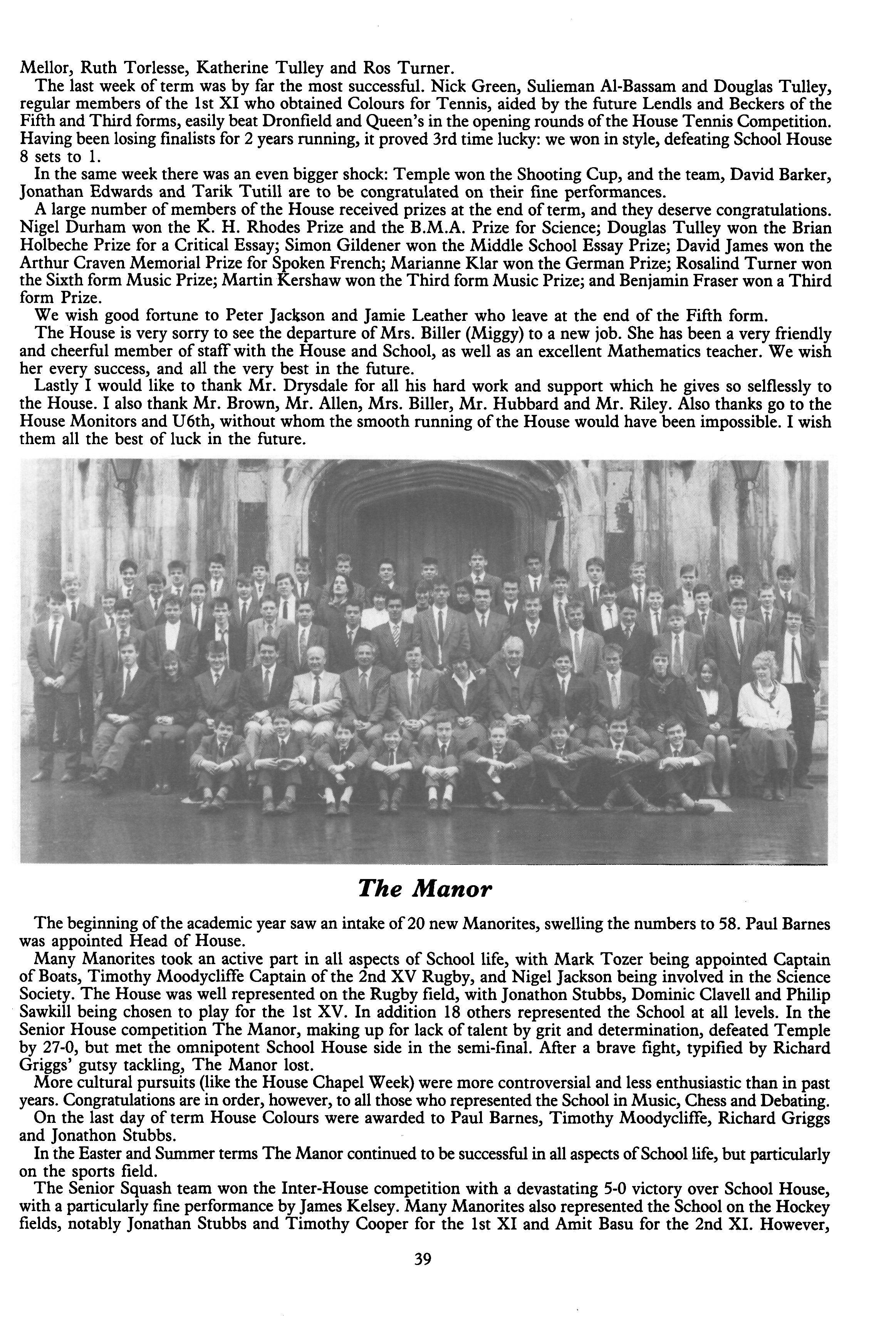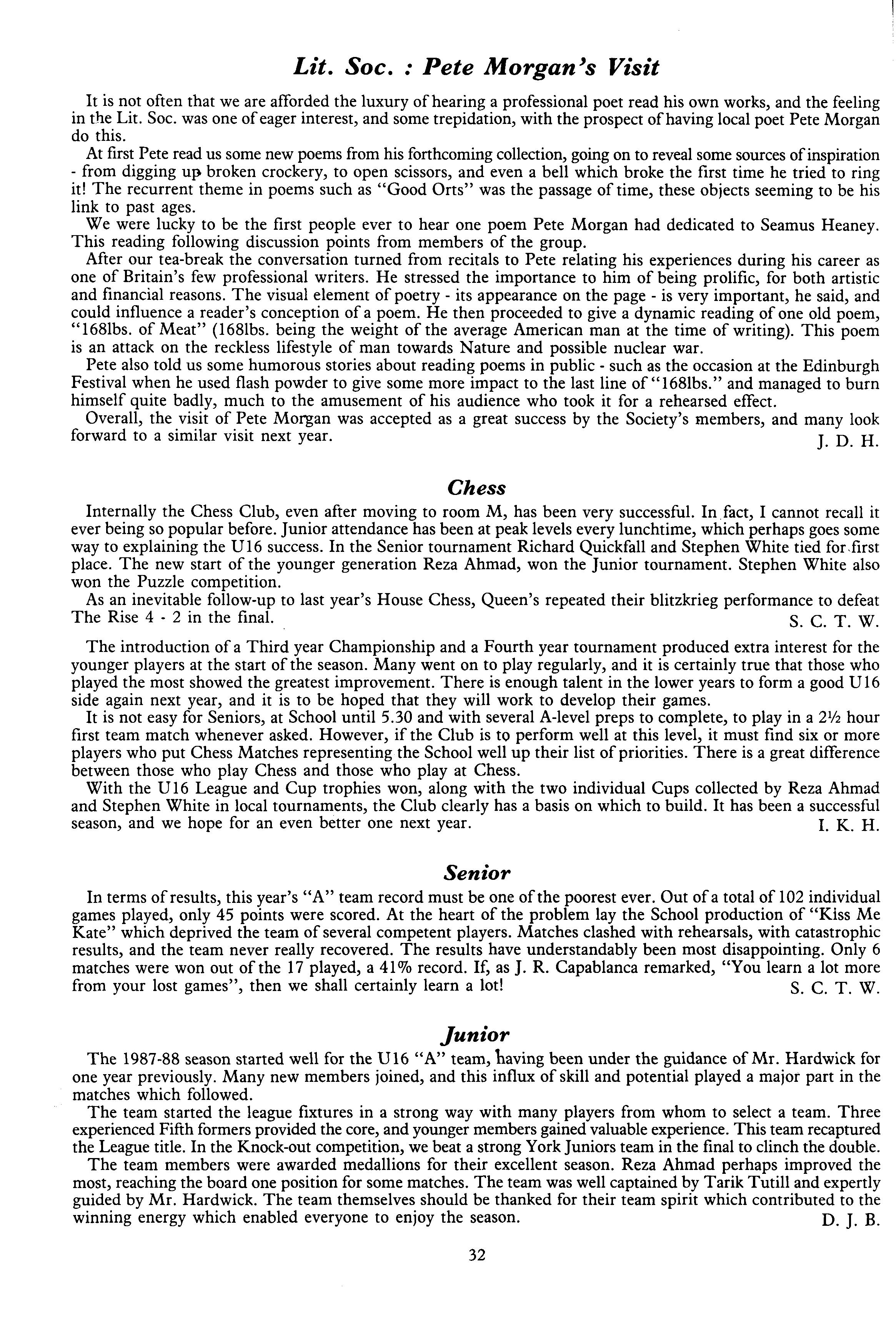 It is customary on these occasions to list a large number of activities and events to illustrate the breadth of the School's extra-curricular life. This 'hidden curriculum' should surely be a very important part of what any good school has to offer, and I was glad to discover that much which is both worthwhile and enjoyable flourished here outside the timetabled lessons. I firmly hold the view that it is the boy or girl who works hard and successfully at his or her studies and is also involved fully in all that the School offers outside the classroom who receives the truly fulfilling education Gibbon had the right ideawhen hewrote this ofthe Emperor Gordian: