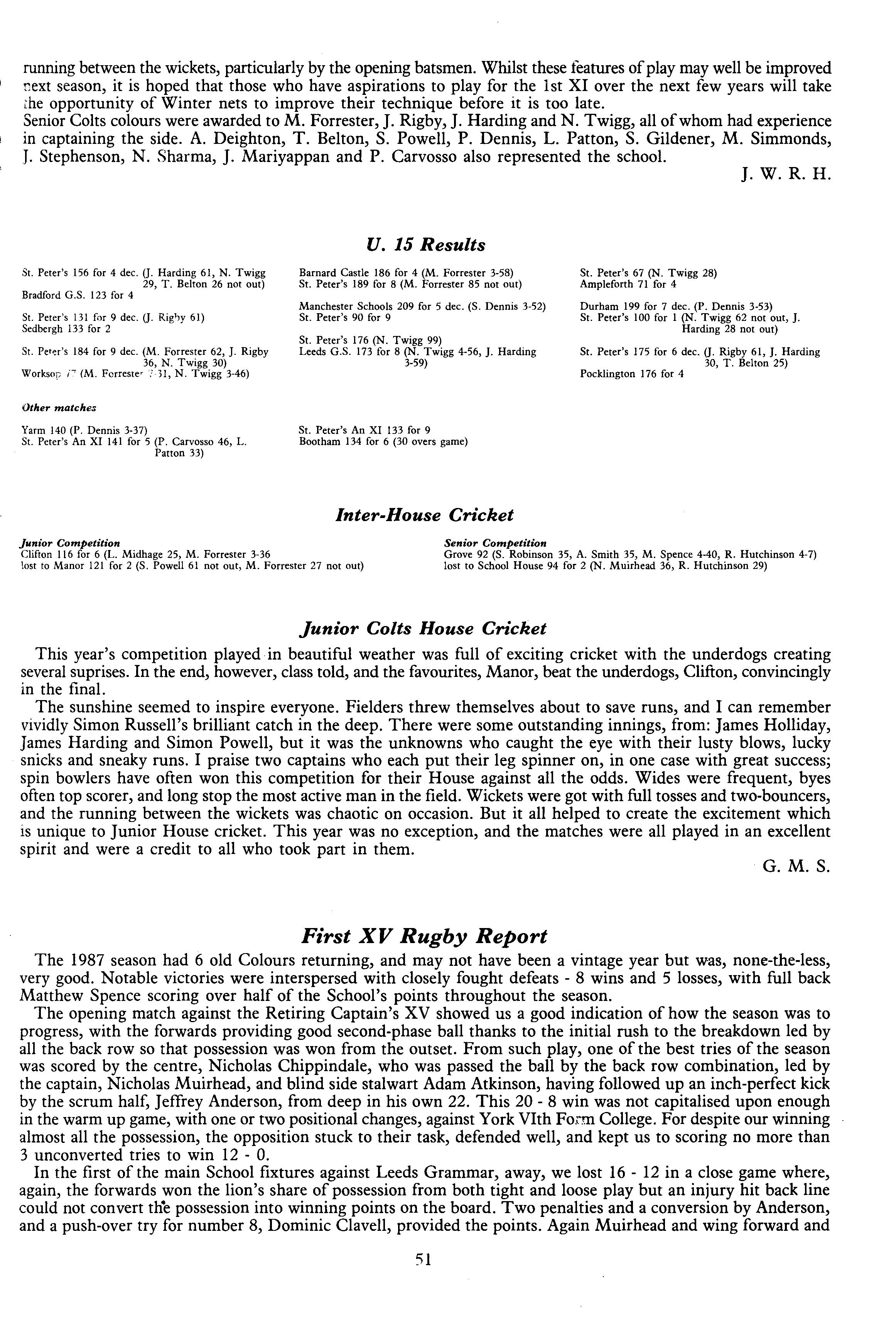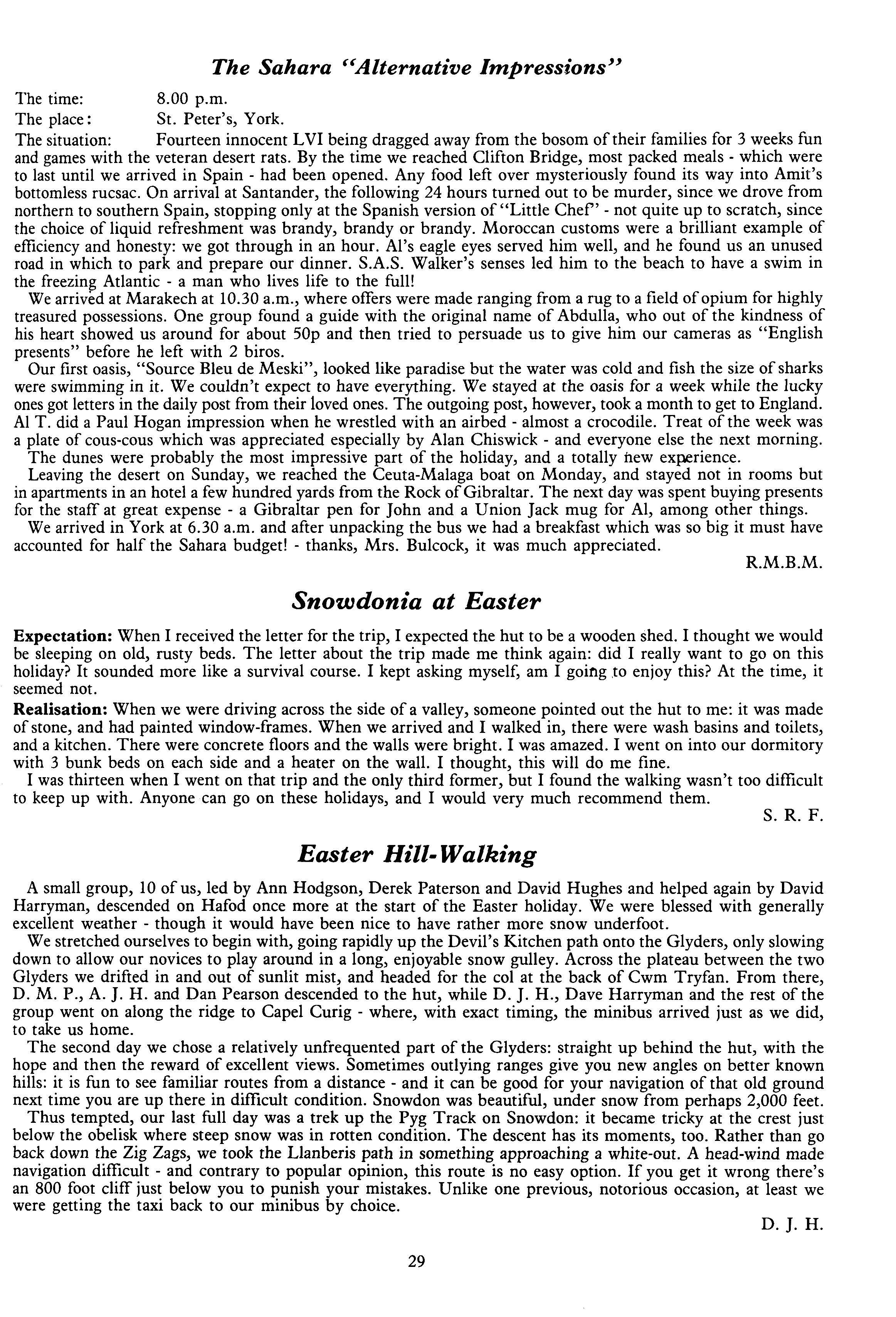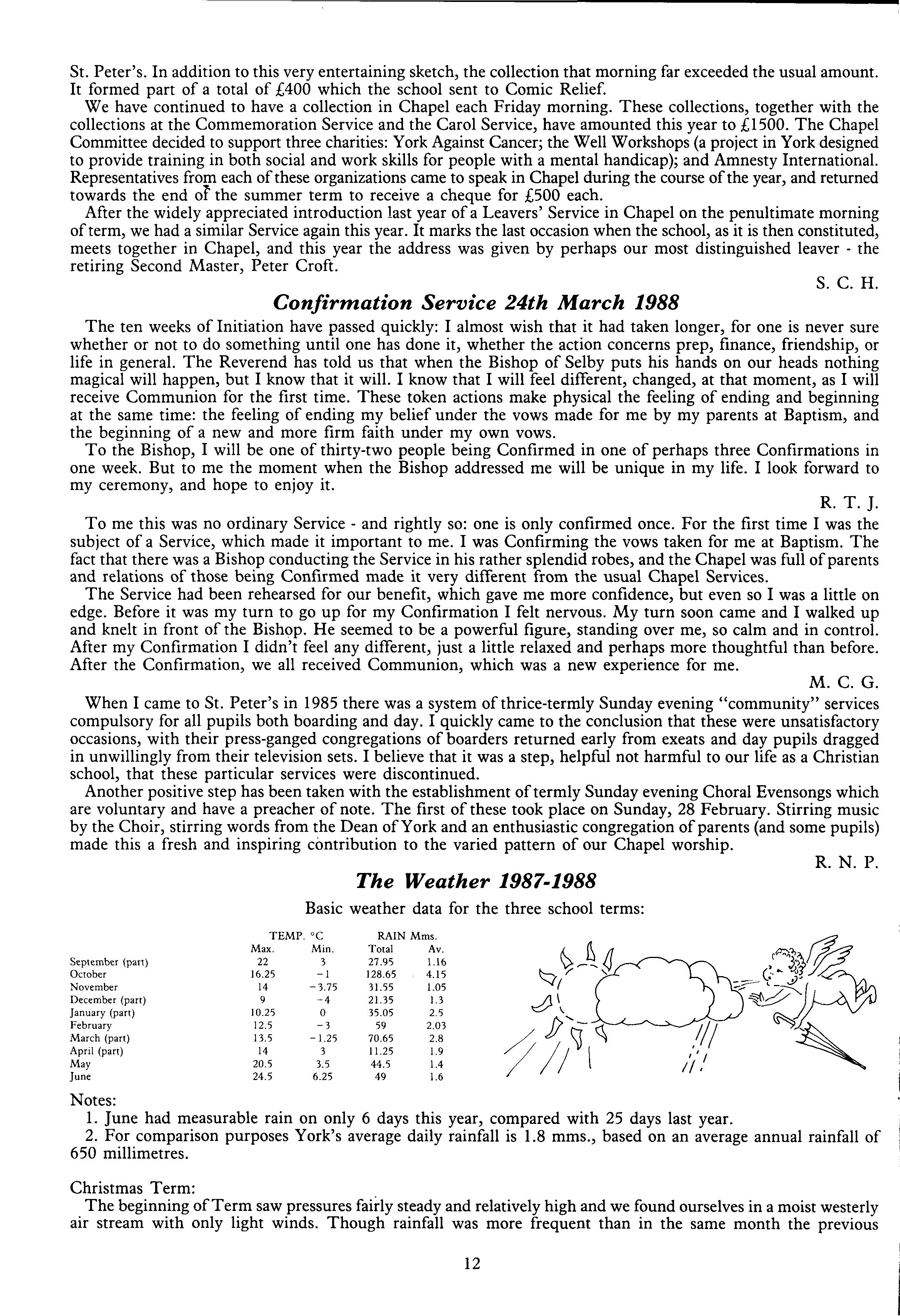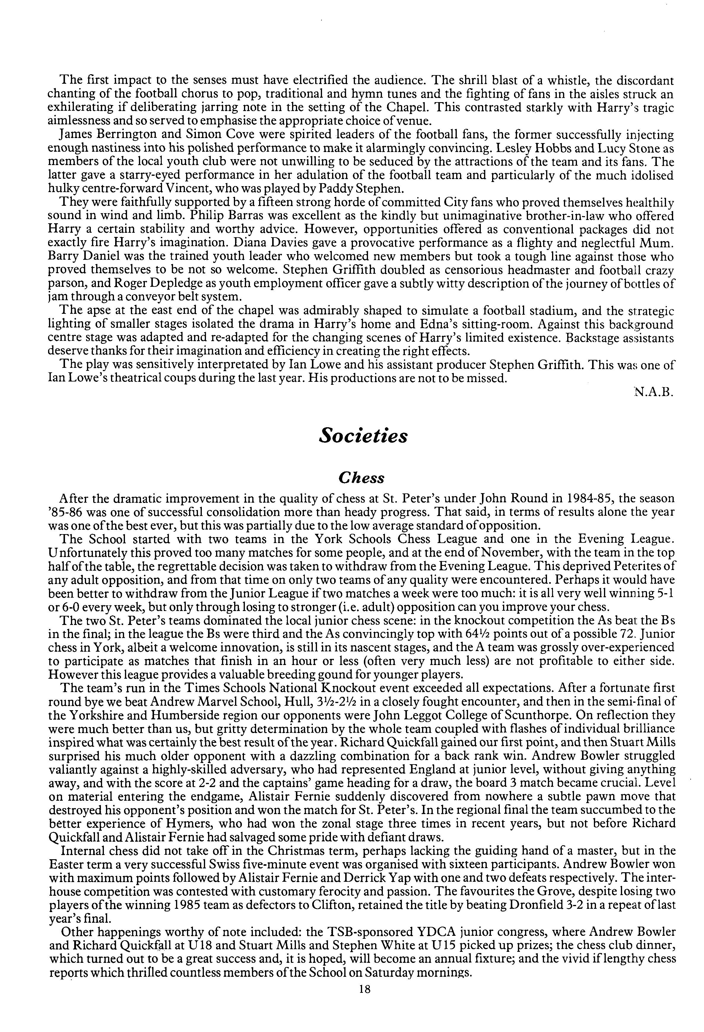 If for 'concubines' you substitute 'clubs, teams and societies' you will roughly get the idea ofwhat I am trying to say What then has been happening in the extra-curricular area? We have a fine sporting tradition which should surely be maintained: considerable success in rugby, with the first XV having had a particularly good season with notable wins against Leeds Grammar School, Ampleforth and Pocklington; and a cricket XI which has played entertainingly and well. I am pleased that our sports flourish and that our games options offer a relatively wide choice. Our chess teams have been successful, with an appearance in the regional finals ofthe Times national knockout competition. Our C.C.F. shooting team once again carried off the north-east cadet trophy. We were again top school in theYorkJunior Chamber ofCommerce quiz. Those who sawJoan ofArc or, more recently, Zigger Zagger, will know that we have much dramatic talent, and those who have cometo our concerts know that within the School there are many fine instrumental players Staff resource and commitment have inspired much holiday activity as well: a Rugby tour to Yugoslavia, skiing in the Alps, Snowdonia and the Highlands in winter conditions, C.C.F camps and expeditions, and trips this summer to Norway and the U.S.S.R Nor can I let pass without mention the twobigcharity fund-raising projects ofthe year: theRotaryEmergency BoxScheme organised by Guy Shuttleworth and that huge undertaking, the sponsored walk, with Barry Daniel in the part of Hannibal (I won't say who were playing the elephants) guiding the School across the North Yorkshire Moors, with that splendid sum of money raised for the hospital paediatrics department. Before I leave this, just a few thoughts and reflections on this hidden curriculum. AsI said earlier, the School should surely be averybusy place. Sport should be an important element in the School's life: it is a means to physical well-being ('mens sana in corpore sano' may be an old tag but is not to be sneered at); it can develop poise, self-knowledge and self-confidence; above all it can be fun. But just a cautionary word: sport, games, should not be rated more highly than academic excellence for which above all else the School should strive, and it should never so dominate that those are not good at games and whose talents lie elsewhere should be judged inferior I hope that things artistic will flourish alongside things sporting: our drama is excitingperhaps there is room for a little more; we have many musical opportunities which will, I hope, be developed in the future; the enterprising sixth form dicussion group could perhaps have some companions, societies which in aless formal manner complement the 'A' level classroom courses In other words there is surely room at St Peter's for a few more activities which can touch the spirit and provide an intellectual zest to match the physical rewards of the gamesfield and the sports hall.