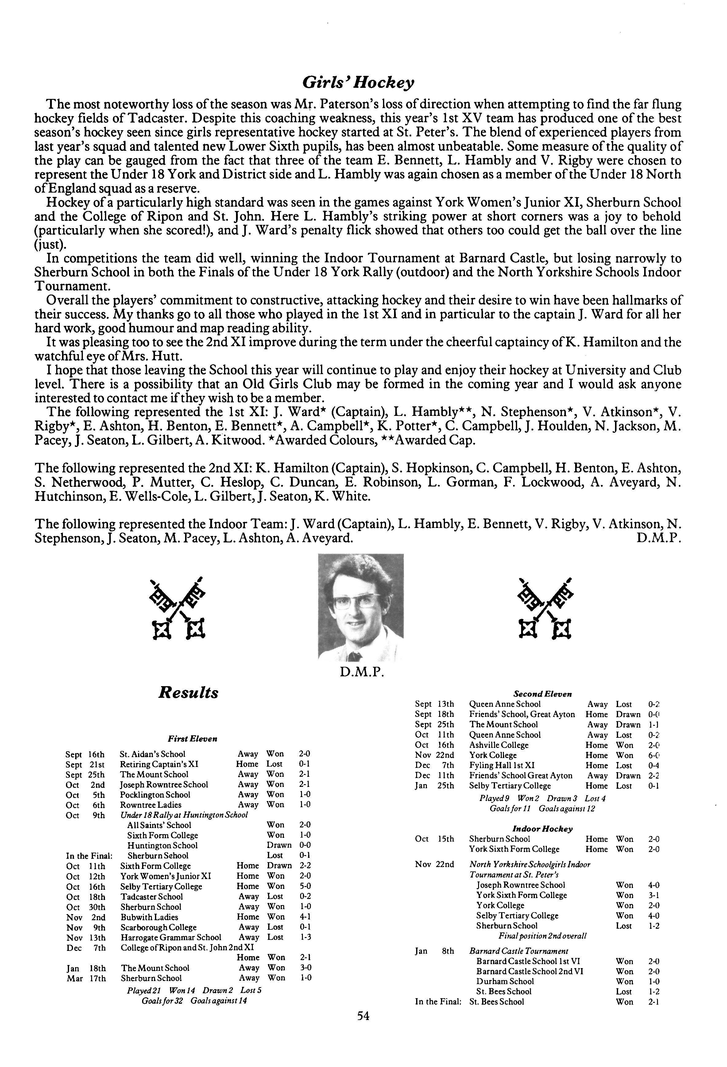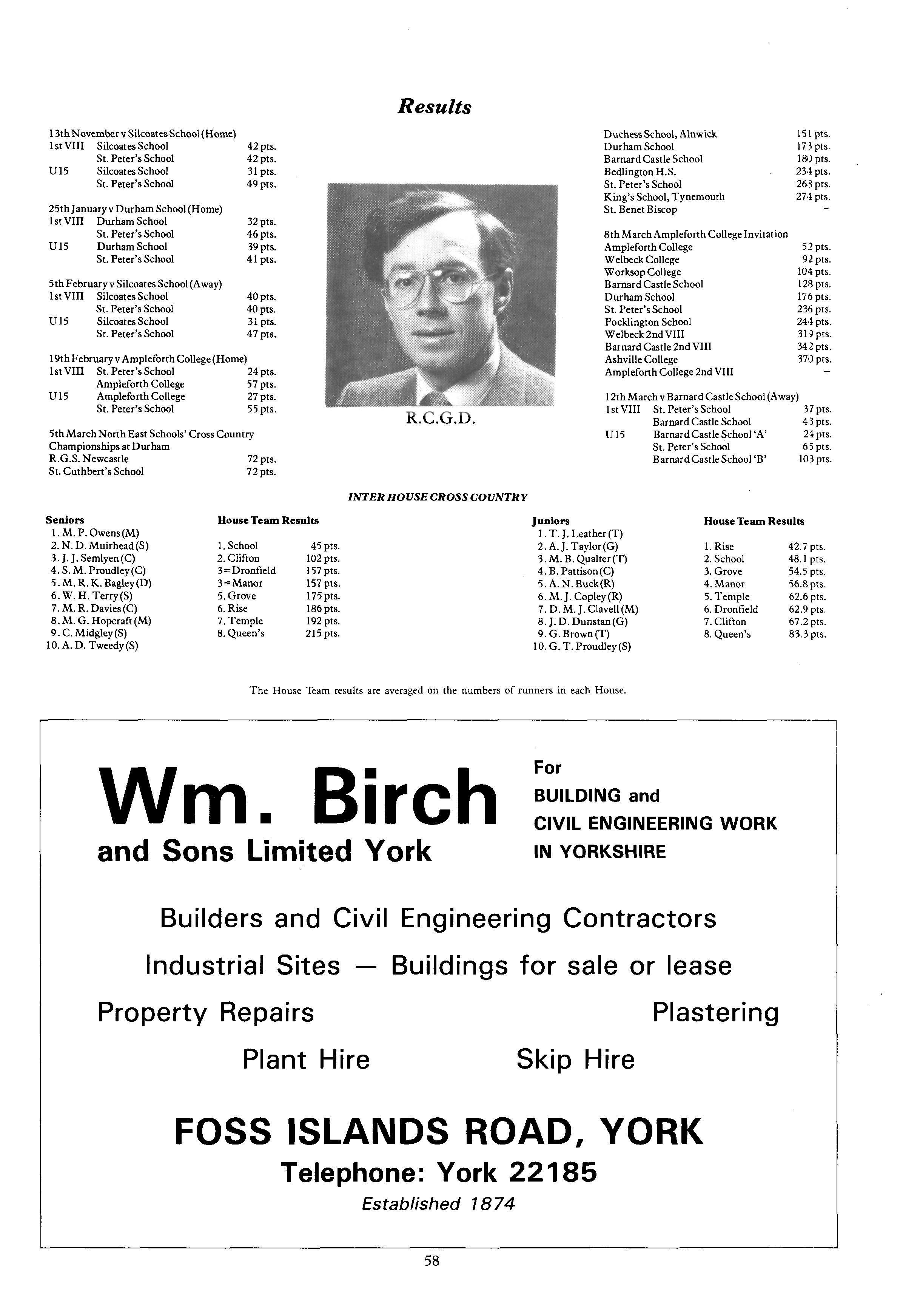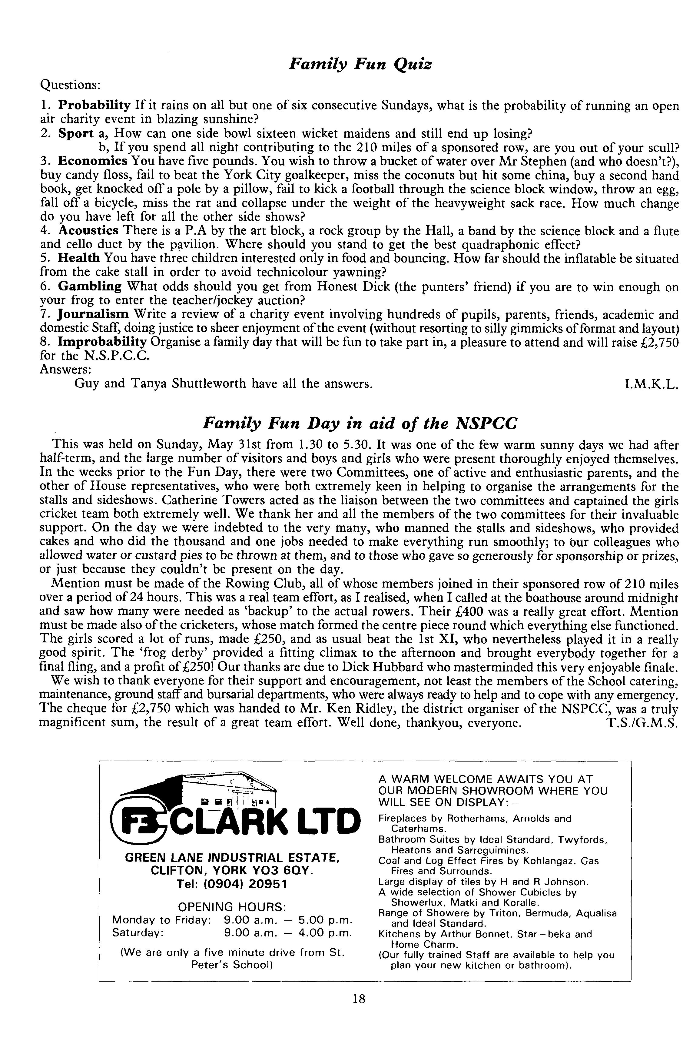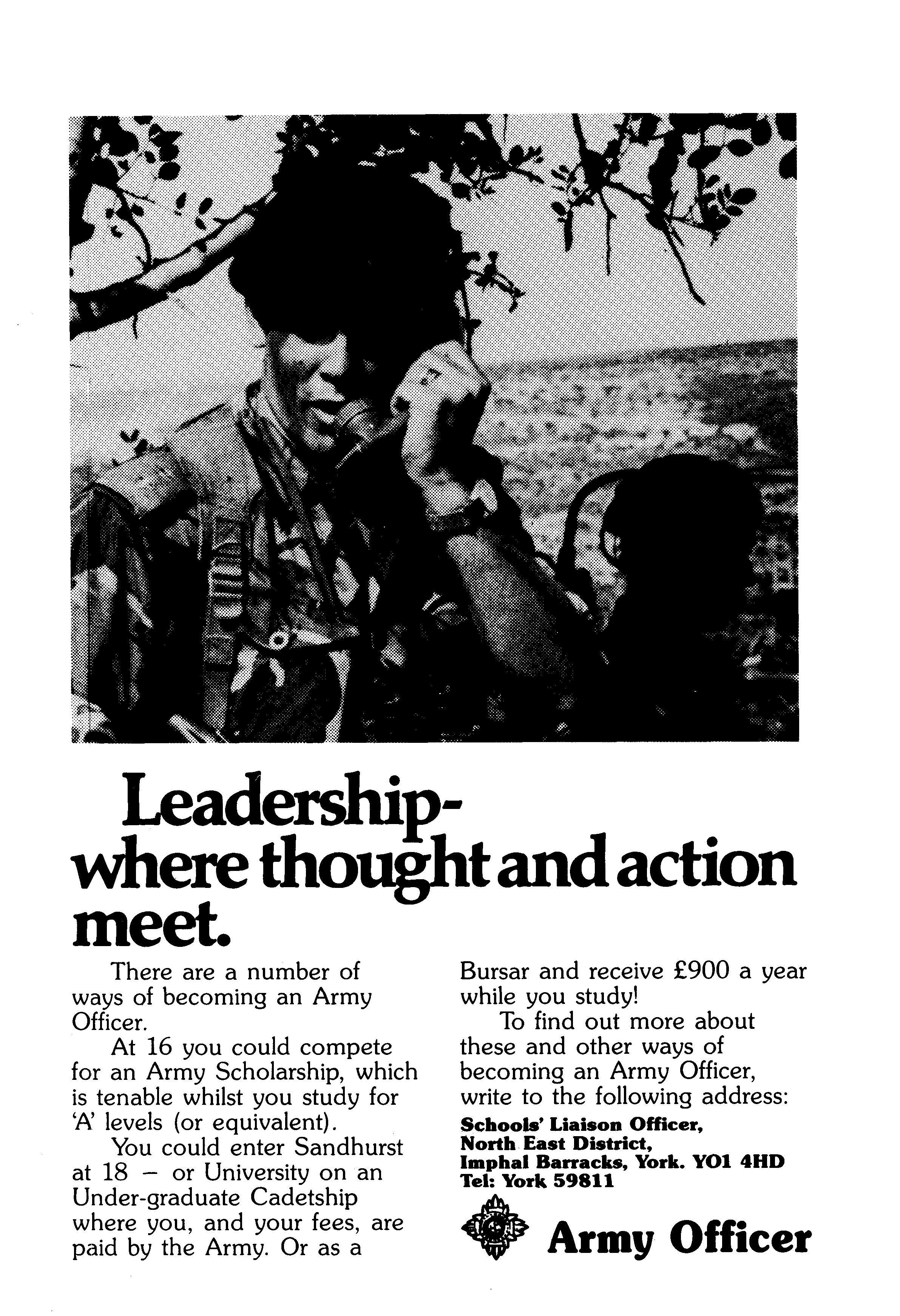 If for 'concubines' you substitute 'clubs, teams and societies' you will roughly get the idea ofwhat I am trying to say What then has been happening in the extra-curricular area? We have a fine sporting tradition which should surely be maintained: considerable success in rugby, with the first XV having had a particularly good season with notable wins against Leeds Grammar School, Ampleforth and Pocklington; and a cricket XI which has played entertainingly and well. I am pleased that our sports flourish and that our games options offer a relatively wide choice. Our chess teams have been successful, with an appearance in the regional finals ofthe Times national knockout competition. Our C.C.F. shooting team once again carried off the north-east cadet trophy. We were again top school in theYorkJunior Chamber ofCommerce quiz. Those who sawJoan ofArc or, more recently, Zigger Zagger, will know that we have much dramatic talent, and those who have cometo our concerts know that within the School there are many fine instrumental players Staff resource and commitment have inspired much holiday activity as well: a Rugby tour to Yugoslavia, skiing in the Alps, Snowdonia and the Highlands in winter conditions, C.C.F camps and expeditions, and trips this summer to Norway and the U.S.S.R Nor can I let pass without mention the twobigcharity fund-raising projects ofthe year: theRotaryEmergency BoxScheme organised by Guy Shuttleworth and that huge undertaking, the sponsored walk, with Barry Daniel in the part of Hannibal (I won't say who were playing the elephants) guiding the School across the North Yorkshire Moors, with that splendid sum of money raised for the hospital paediatrics department. Before I leave this, just a few thoughts and reflections on this hidden curriculum. AsI said earlier, the School should surely be averybusy place. Sport should be an important element in the School's life: it is a means to physical well-being ('mens sana in corpore sano' may be an old tag but is not to be sneered at); it can develop poise, self-knowledge and self-confidence; above all it can be fun. But just a cautionary word: sport, games, should not be rated more highly than academic excellence for which above all else the School should strive, and it should never so dominate that those are not good at games and whose talents lie elsewhere should be judged inferior I hope that things artistic will flourish alongside things sporting: our drama is excitingperhaps there is room for a little more; we have many musical opportunities which will, I hope, be developed in the future; the enterprising sixth form dicussion group could perhaps have some companions, societies which in aless formal manner complement the 'A' level classroom courses In other words there is surely room at St Peter's for a few more activities which can touch the spirit and provide an intellectual zest to match the physical rewards of the gamesfield and the sports hall.