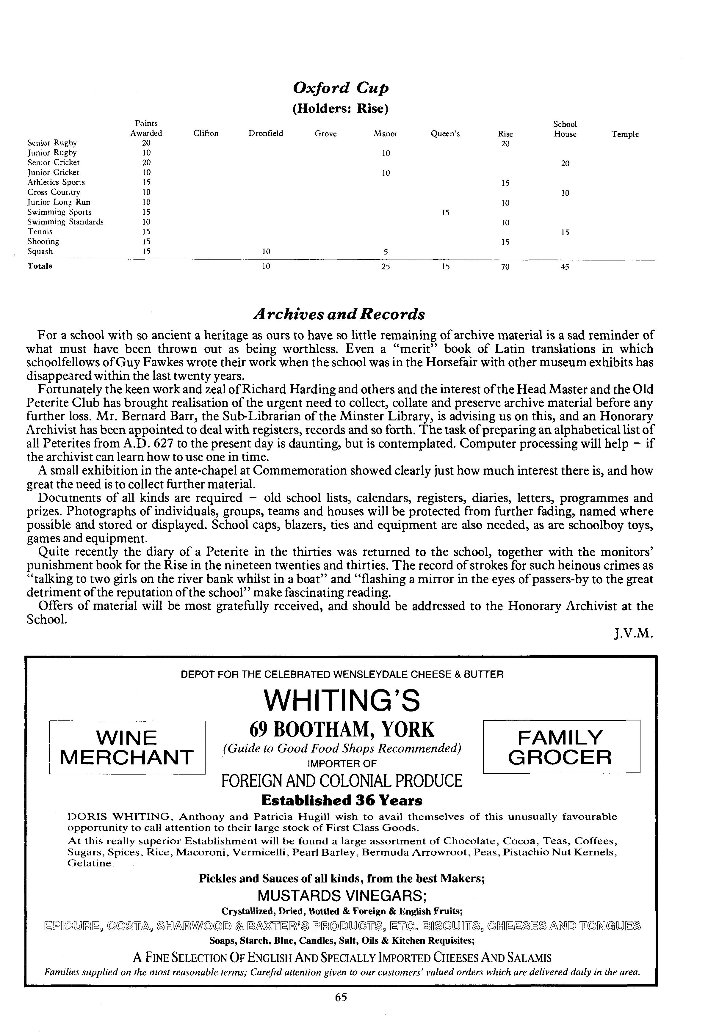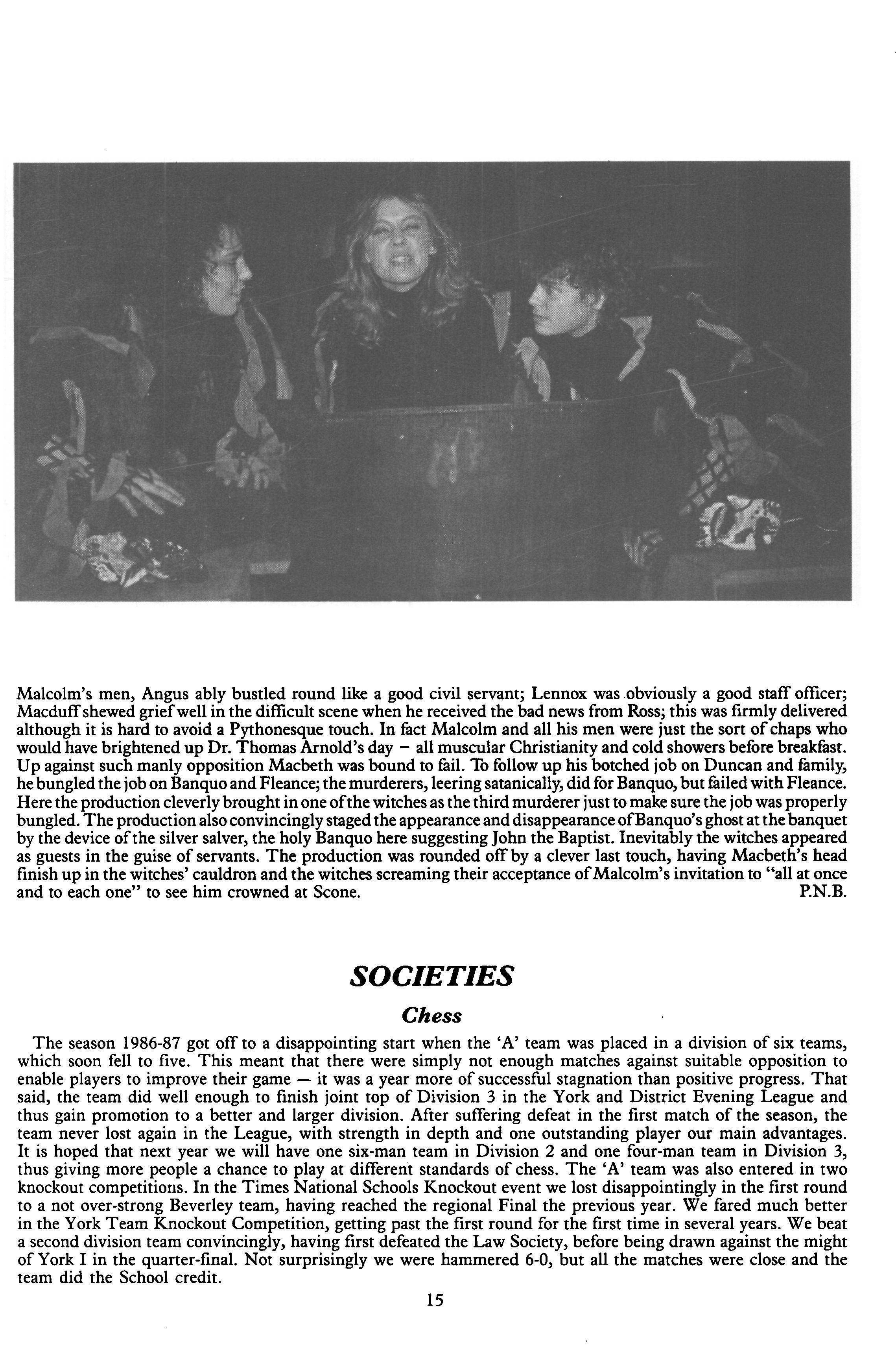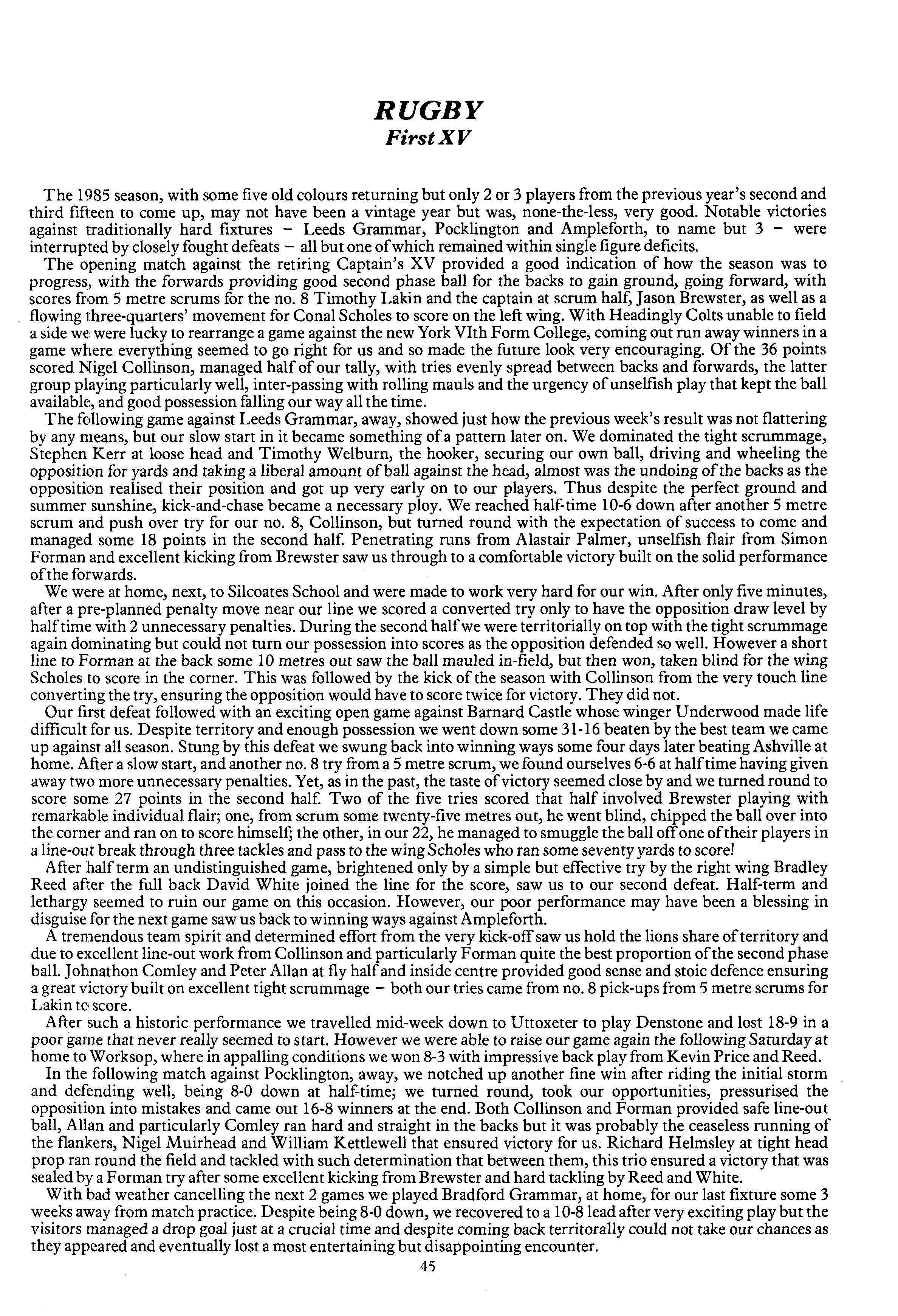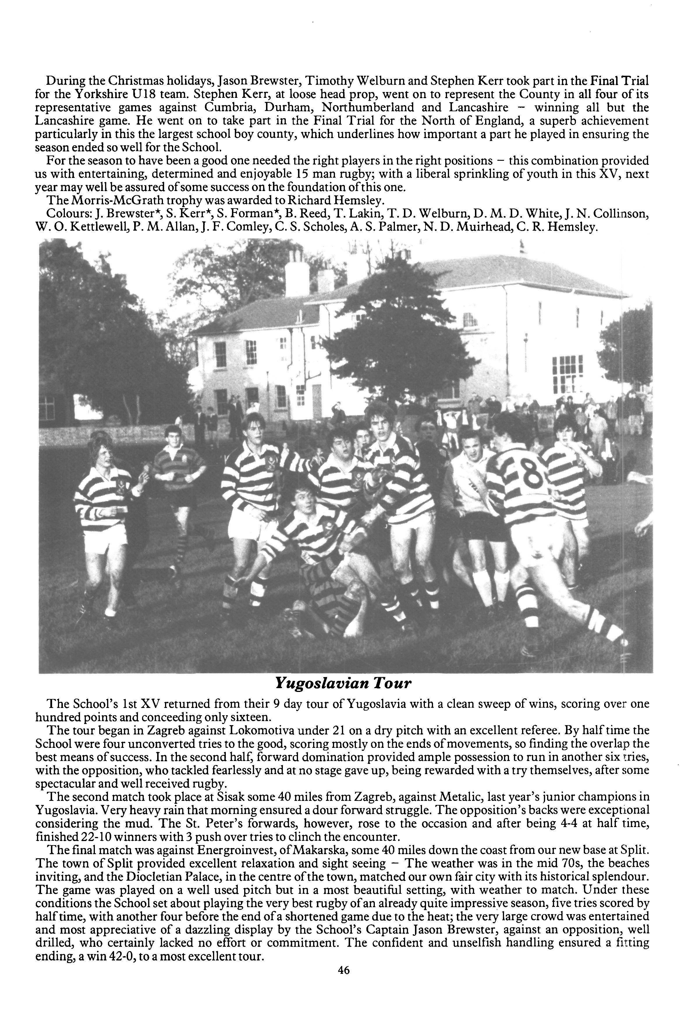 If for 'concubines' you substitute 'clubs, teams and societies' you will roughly get the idea ofwhat I am trying to say What then has been happening in the extra-curricular area? We have a fine sporting tradition which should surely be maintained: considerable success in rugby, with the first XV having had a particularly good season with notable wins against Leeds Grammar School, Ampleforth and Pocklington; and a cricket XI which has played entertainingly and well. I am pleased that our sports flourish and that our games options offer a relatively wide choice. Our chess teams have been successful, with an appearance in the regional finals ofthe Times national knockout competition. Our C.C.F. shooting team once again carried off the north-east cadet trophy. We were again top school in theYorkJunior Chamber ofCommerce quiz. Those who sawJoan ofArc or, more recently, Zigger Zagger, will know that we have much dramatic talent, and those who have cometo our concerts know that within the School there are many fine instrumental players Staff resource and commitment have inspired much holiday activity as well: a Rugby tour to Yugoslavia, skiing in the Alps, Snowdonia and the Highlands in winter conditions, C.C.F camps and expeditions, and trips this summer to Norway and the U.S.S.R Nor can I let pass without mention the twobigcharity fund-raising projects ofthe year: theRotaryEmergency BoxScheme organised by Guy Shuttleworth and that huge undertaking, the sponsored walk, with Barry Daniel in the part of Hannibal (I won't say who were playing the elephants) guiding the School across the North Yorkshire Moors, with that splendid sum of money raised for the hospital paediatrics department. Before I leave this, just a few thoughts and reflections on this hidden curriculum. AsI said earlier, the School should surely be averybusy place. Sport should be an important element in the School's life: it is a means to physical well-being ('mens sana in corpore sano' may be an old tag but is not to be sneered at); it can develop poise, self-knowledge and self-confidence; above all it can be fun. But just a cautionary word: sport, games, should not be rated more highly than academic excellence for which above all else the School should strive, and it should never so dominate that those are not good at games and whose talents lie elsewhere should be judged inferior I hope that things artistic will flourish alongside things sporting: our drama is excitingperhaps there is room for a little more; we have many musical opportunities which will, I hope, be developed in the future; the enterprising sixth form dicussion group could perhaps have some companions, societies which in aless formal manner complement the 'A' level classroom courses In other words there is surely room at St Peter's for a few more activities which can touch the spirit and provide an intellectual zest to match the physical rewards of the gamesfield and the sports hall.
