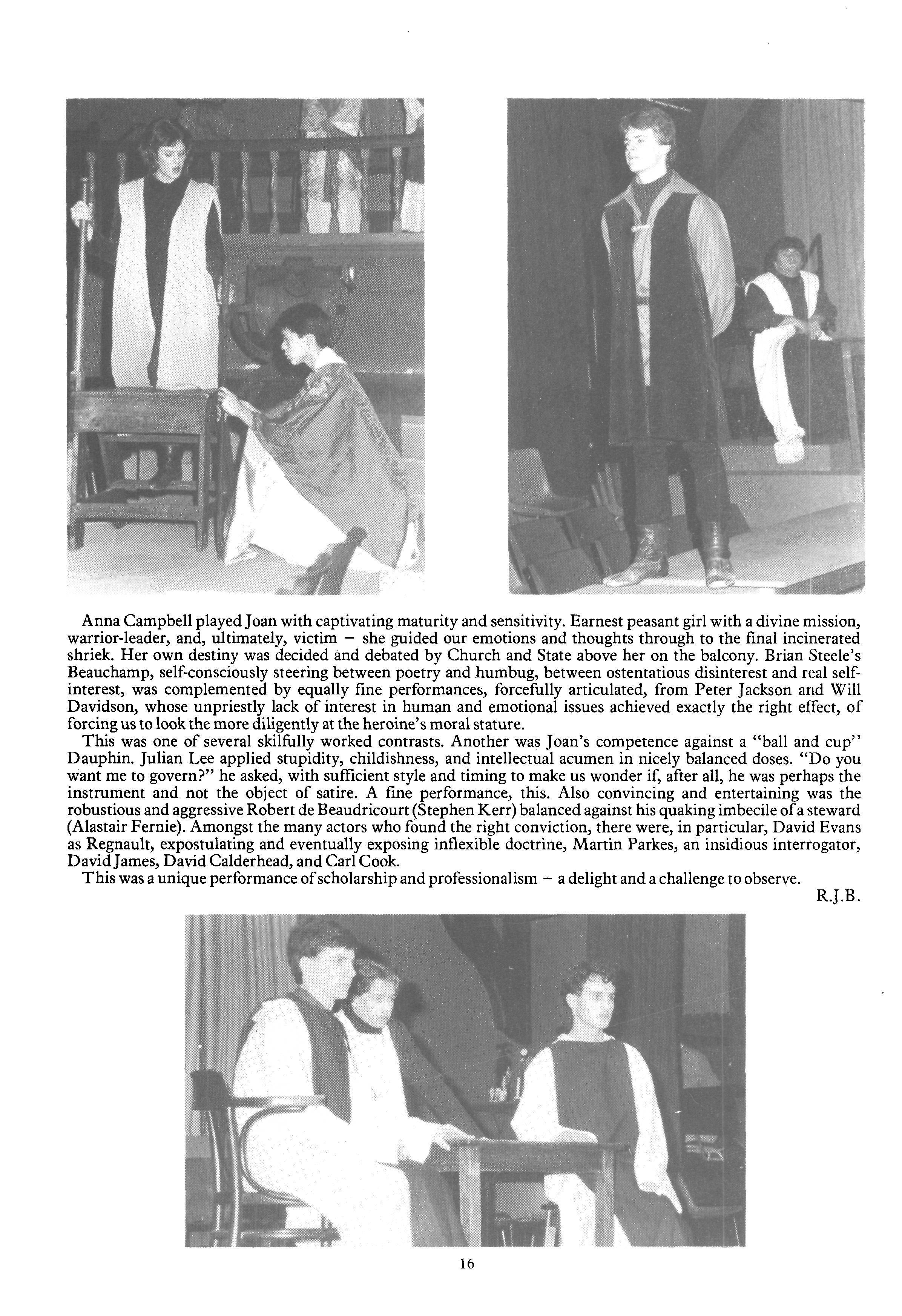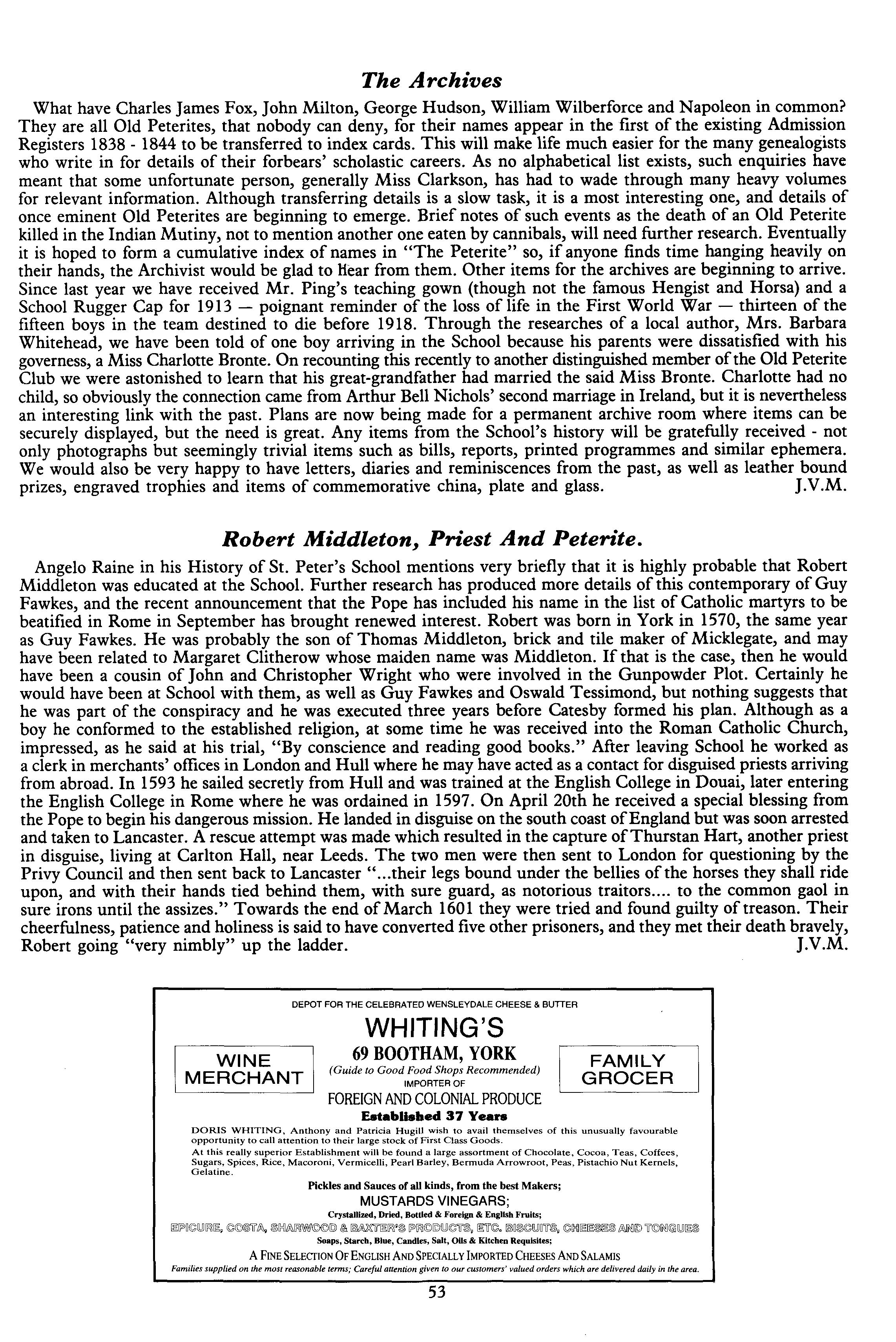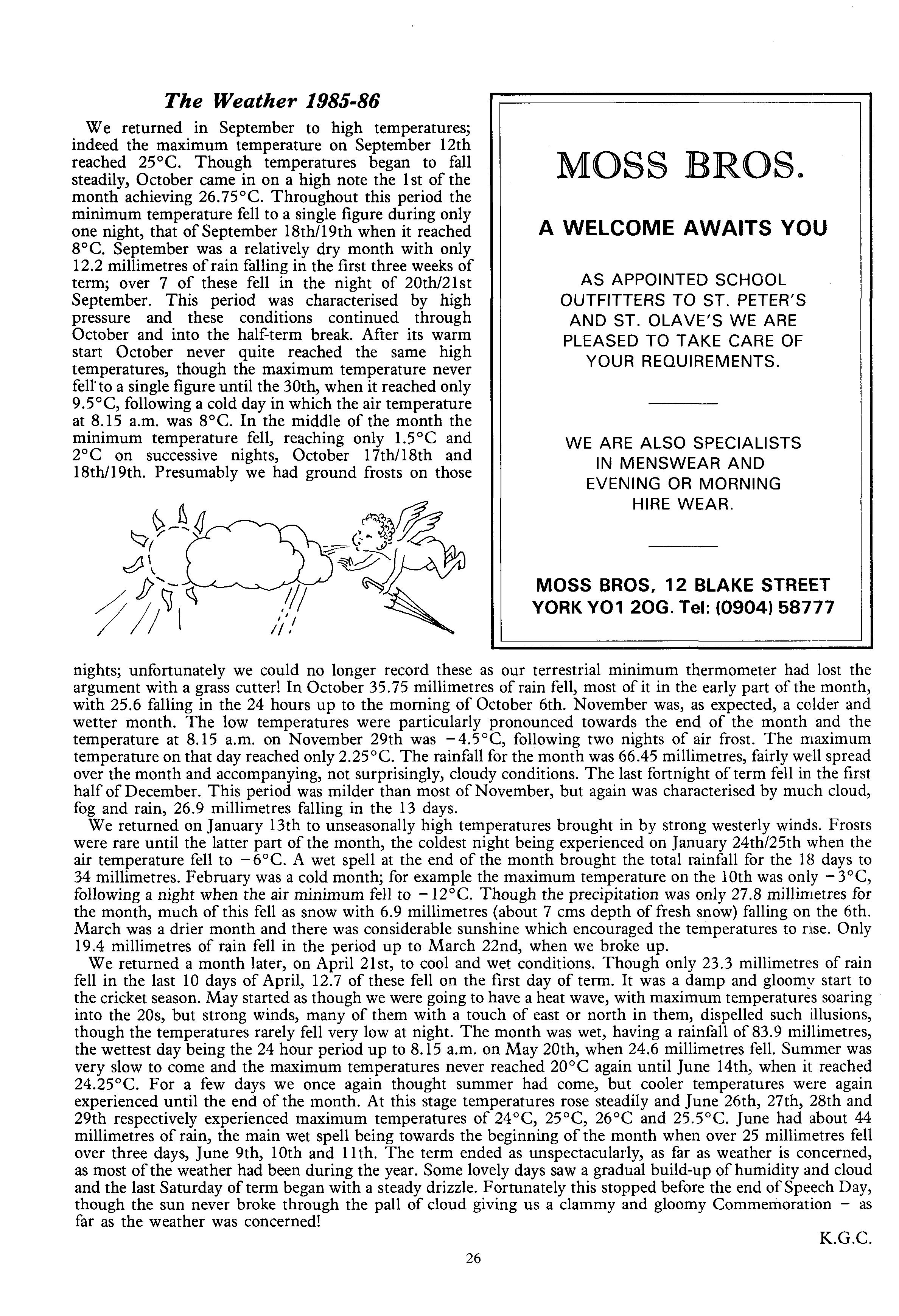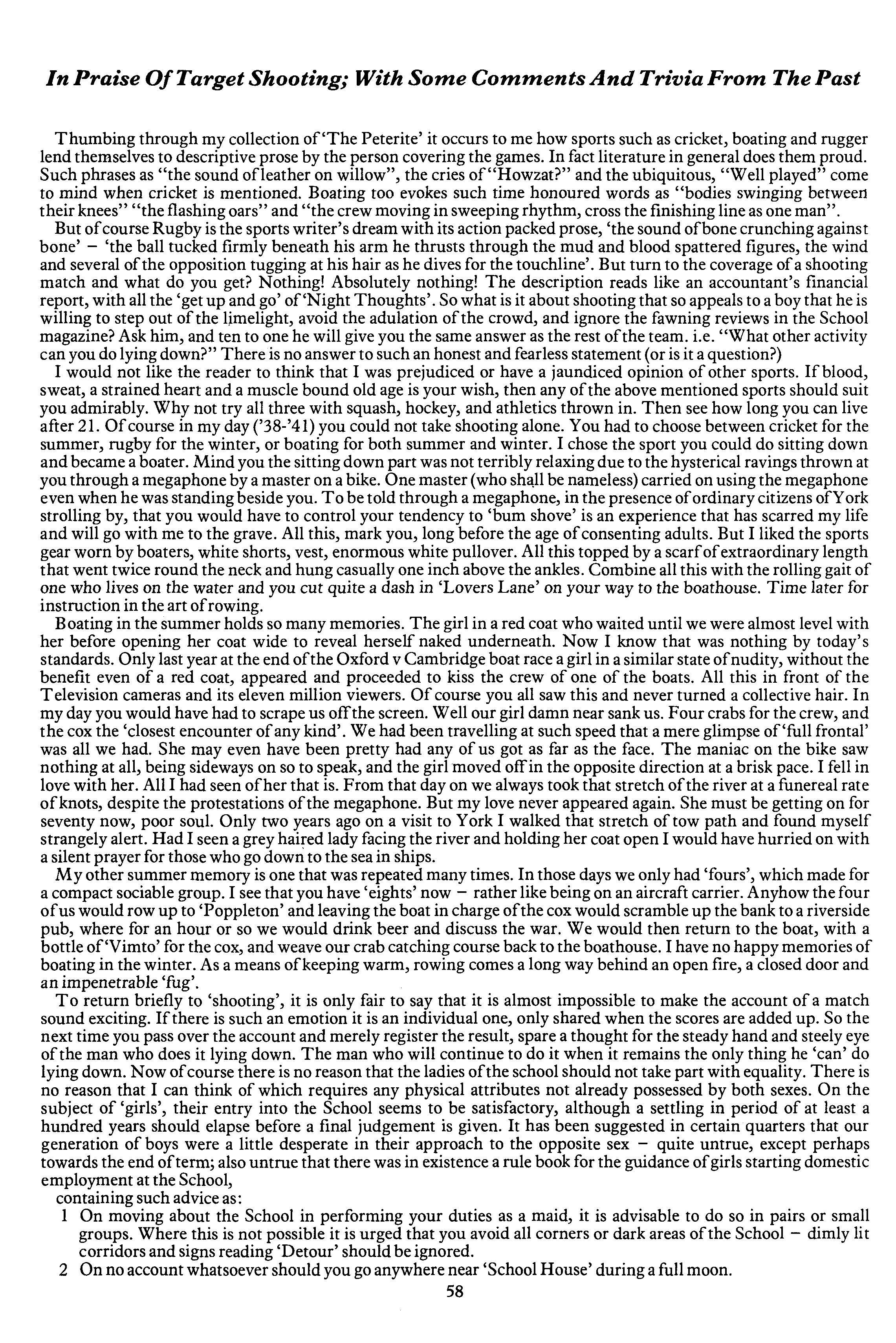 If for 'concubines' you substitute 'clubs, teams and societies' you will roughly get the idea ofwhat I am trying to say What then has been happening in the extra-curricular area? We have a fine sporting tradition which should surely be maintained: considerable success in rugby, with the first XV having had a particularly good season with notable wins against Leeds Grammar School, Ampleforth and Pocklington; and a cricket XI which has played entertainingly and well. I am pleased that our sports flourish and that our games options offer a relatively wide choice. Our chess teams have been successful, with an appearance in the regional finals ofthe Times national knockout competition. Our C.C.F. shooting team once again carried off the north-east cadet trophy. We were again top school in theYorkJunior Chamber ofCommerce quiz. Those who sawJoan ofArc or, more recently, Zigger Zagger, will know that we have much dramatic talent, and those who have cometo our concerts know that within the School there are many fine instrumental players Staff resource and commitment have inspired much holiday activity as well: a Rugby tour to Yugoslavia, skiing in the Alps, Snowdonia and the Highlands in winter conditions, C.C.F camps and expeditions, and trips this summer to Norway and the U.S.S.R Nor can I let pass without mention the twobigcharity fund-raising projects ofthe year: theRotaryEmergency BoxScheme organised by Guy Shuttleworth and that huge undertaking, the sponsored walk, with Barry Daniel in the part of Hannibal (I won't say who were playing the elephants) guiding the School across the North Yorkshire Moors, with that splendid sum of money raised for the hospital paediatrics department. Before I leave this, just a few thoughts and reflections on this hidden curriculum. AsI said earlier, the School should surely be averybusy place. Sport should be an important element in the School's life: it is a means to physical well-being ('mens sana in corpore sano' may be an old tag but is not to be sneered at); it can develop poise, self-knowledge and self-confidence; above all it can be fun. But just a cautionary word: sport, games, should not be rated more highly than academic excellence for which above all else the School should strive, and it should never so dominate that those are not good at games and whose talents lie elsewhere should be judged inferior I hope that things artistic will flourish alongside things sporting: our drama is excitingperhaps there is room for a little more; we have many musical opportunities which will, I hope, be developed in the future; the enterprising sixth form dicussion group could perhaps have some companions, societies which in aless formal manner complement the 'A' level classroom courses In other words there is surely room at St Peter's for a few more activities which can touch the spirit and provide an intellectual zest to match the physical rewards of the gamesfield and the sports hall.