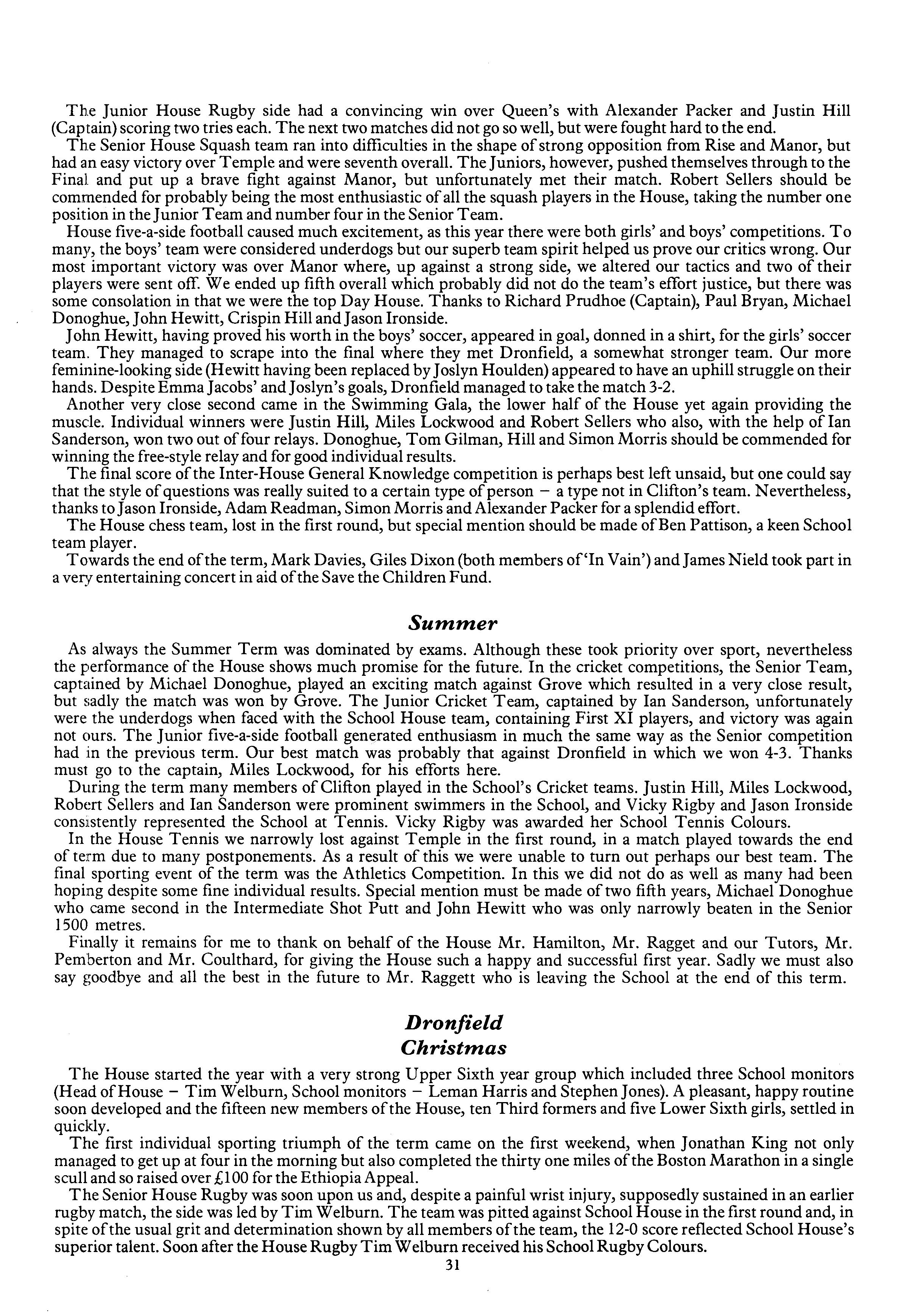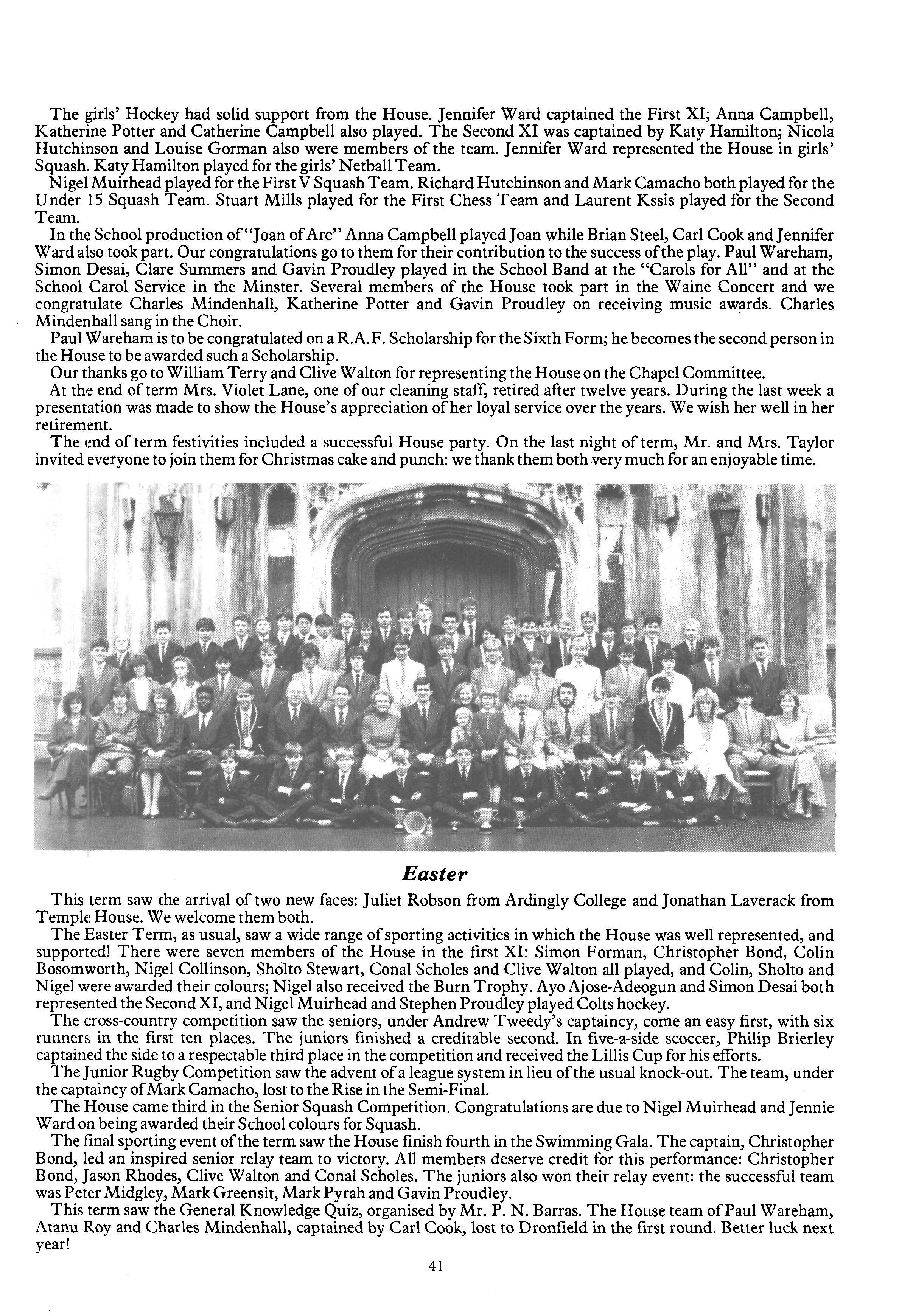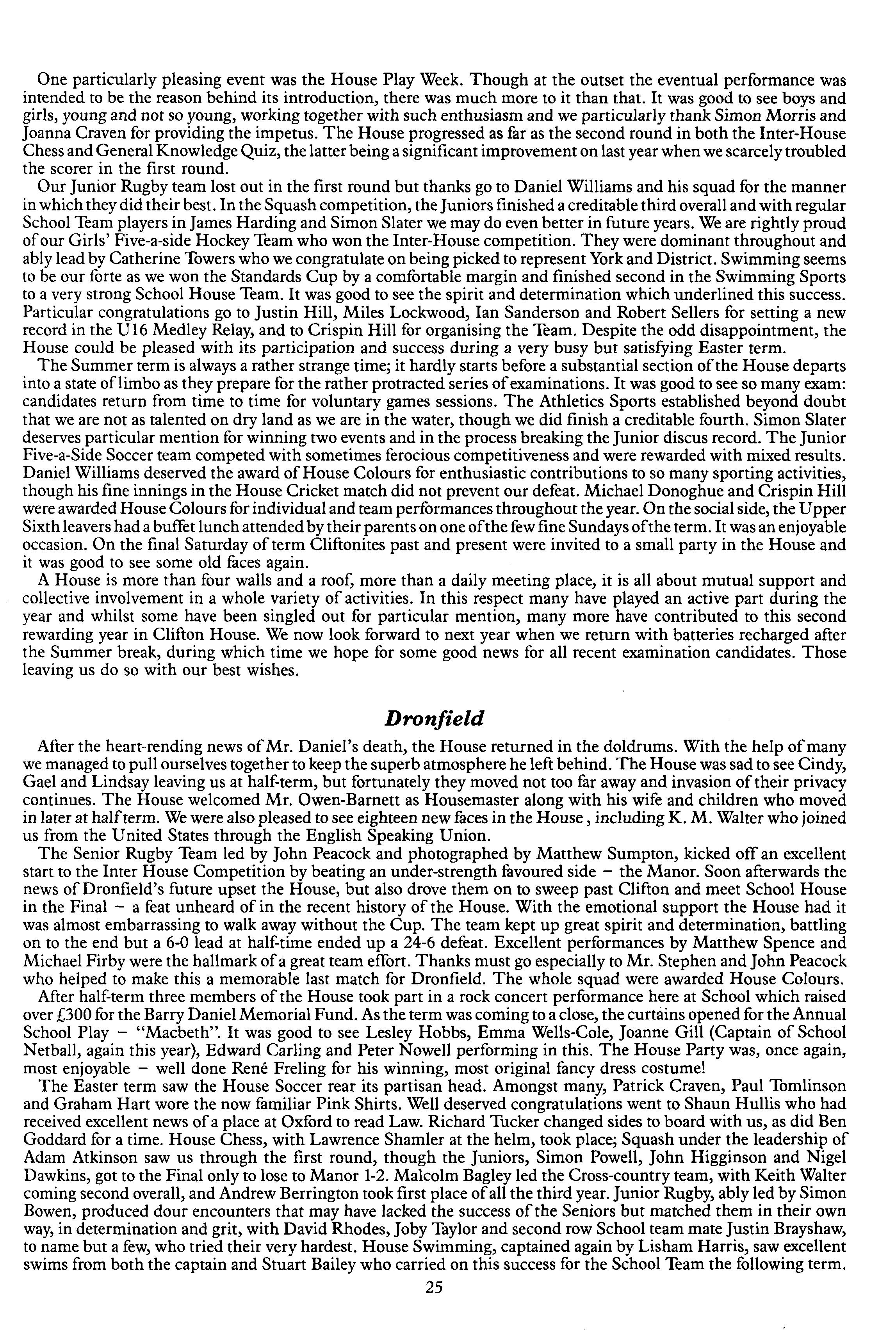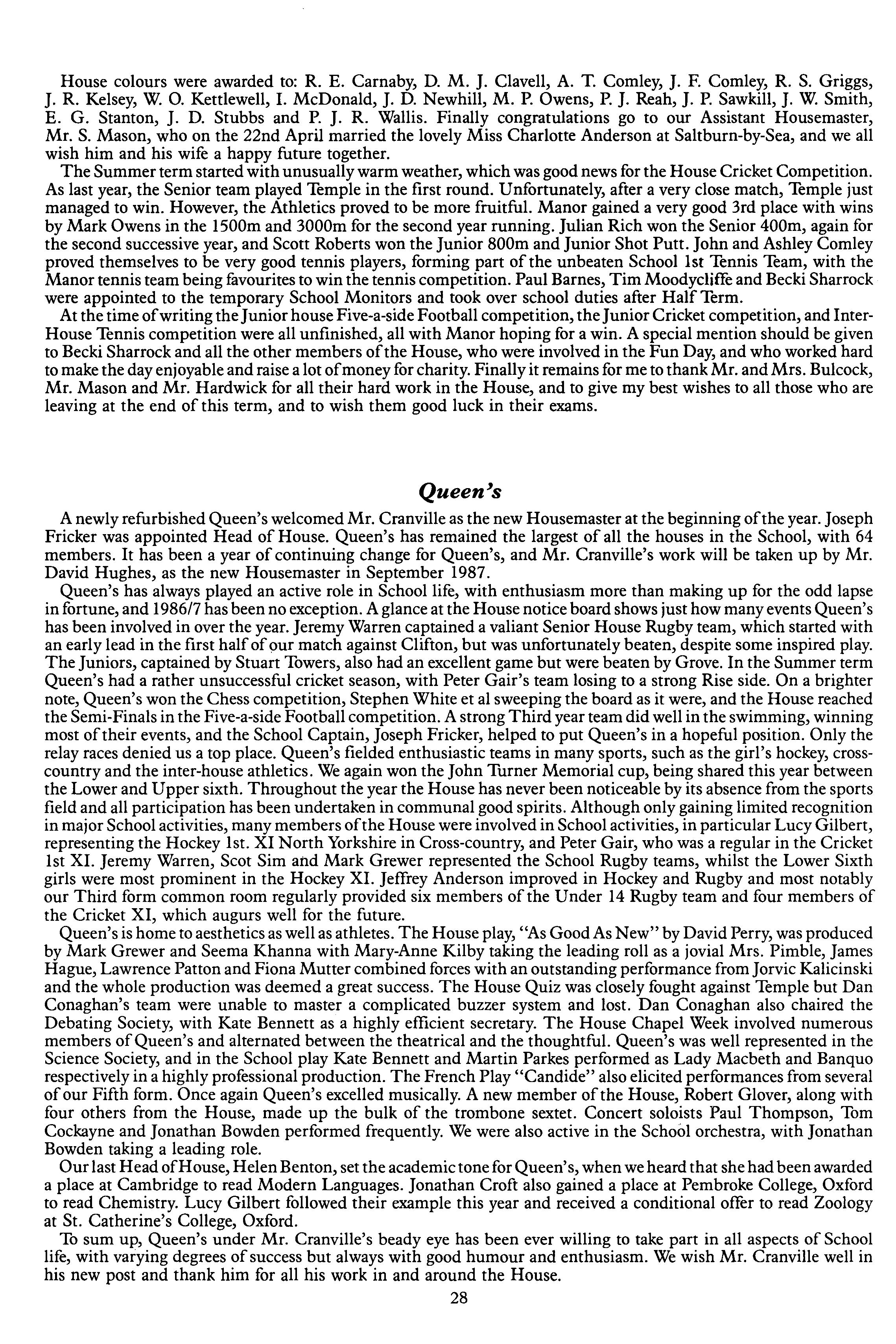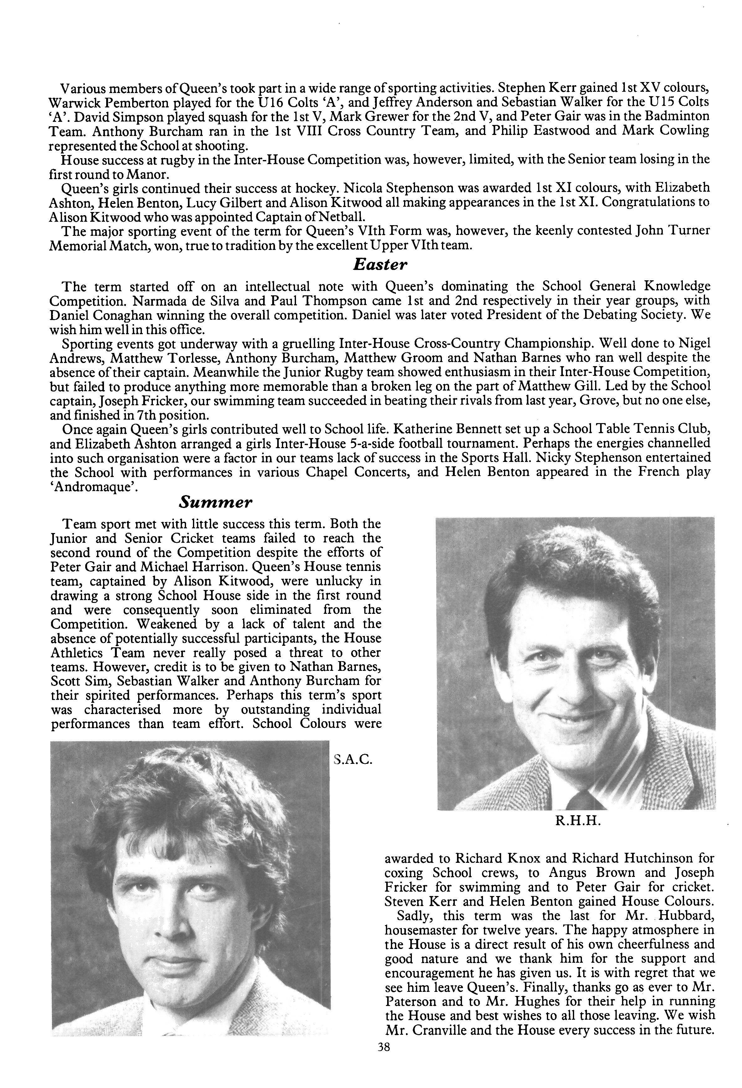 Outside the classroom he was always busy He was a very keen and noisy rugger coach and ran the U 15 team for many years with tremendous enthusiasm; in 1984-85 histeam achieved the rare feat ofbeingunbeaten!His interests were many, but whether it was acourse in car maintenance, playing soccer or basketball against the boys, helping to run the athletics, or organising a small but enthusiastic lunchtime bridge club, he did everything with tremendous zest He even found time tobetheAssistant in the new House, Clifton