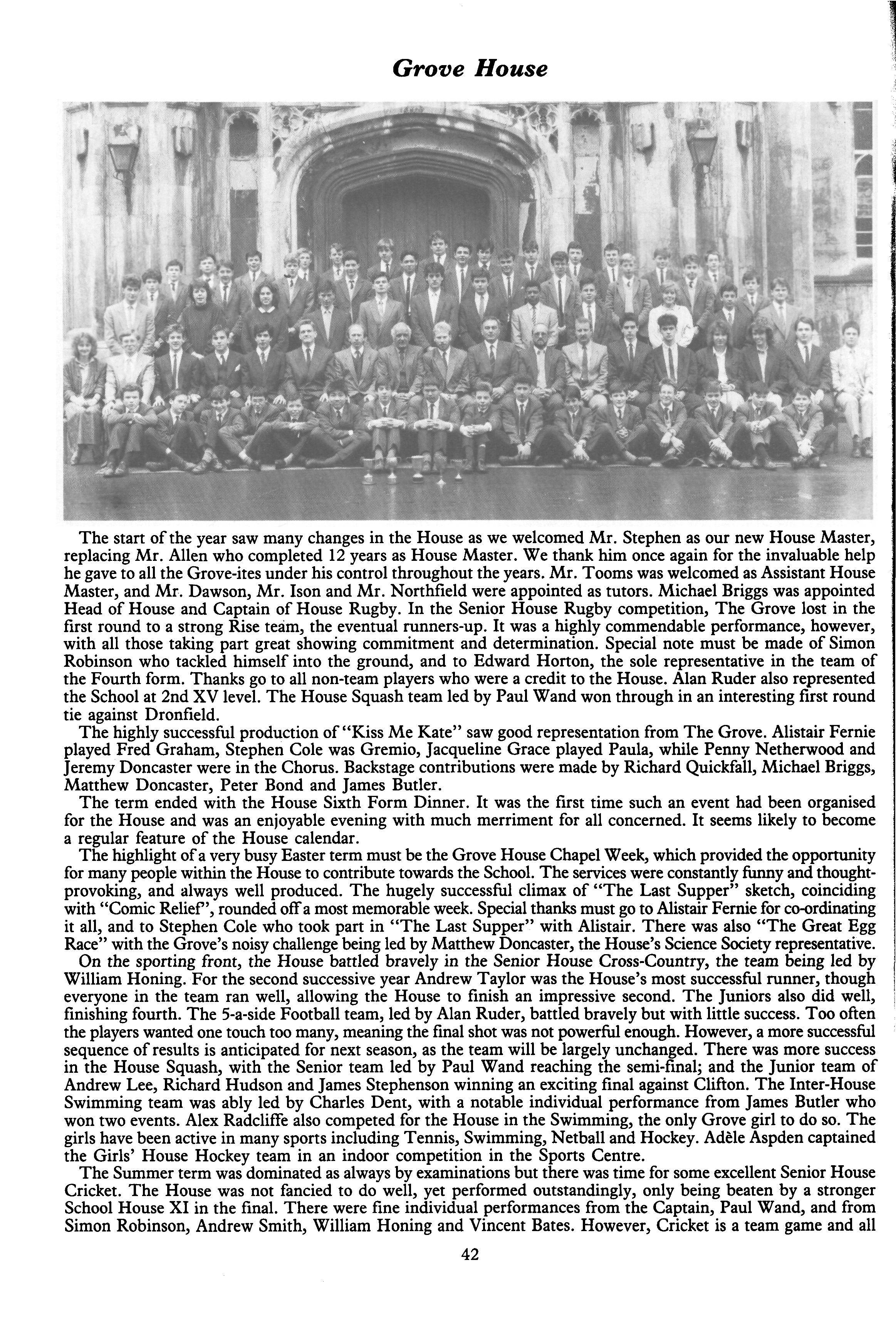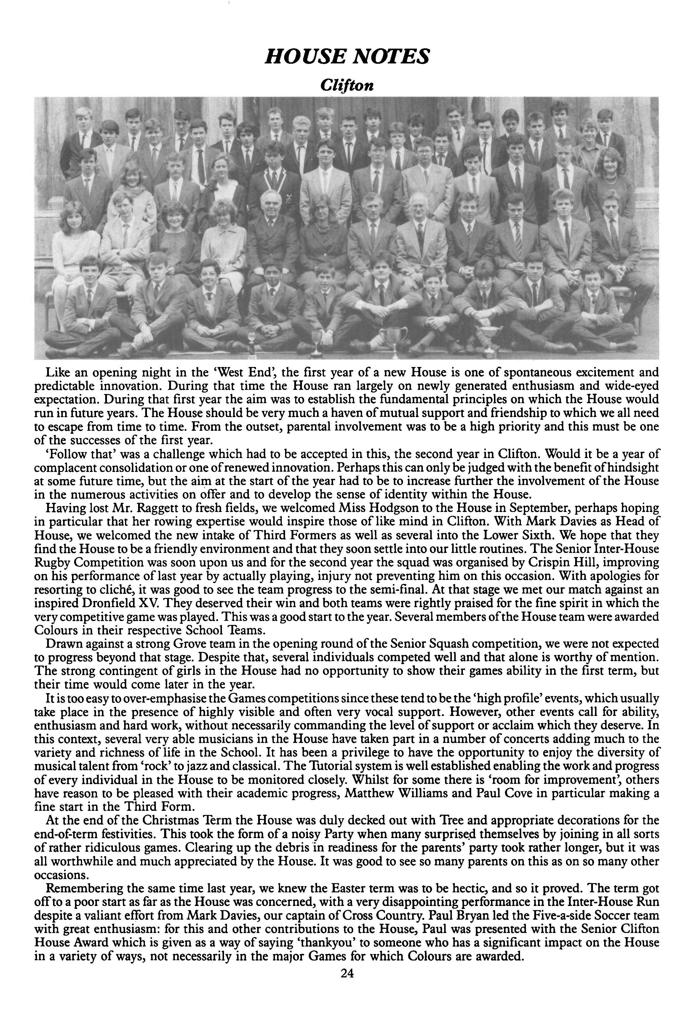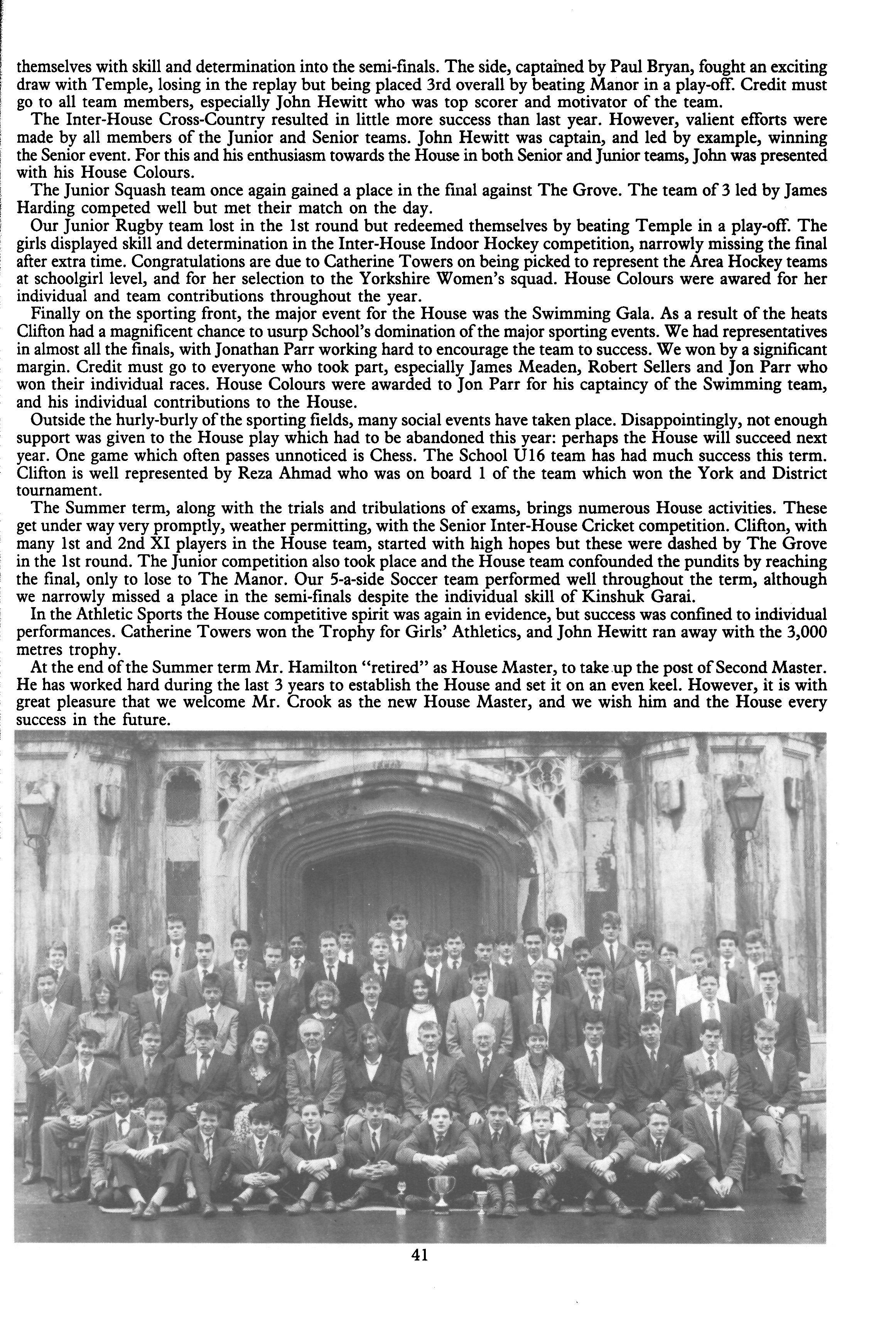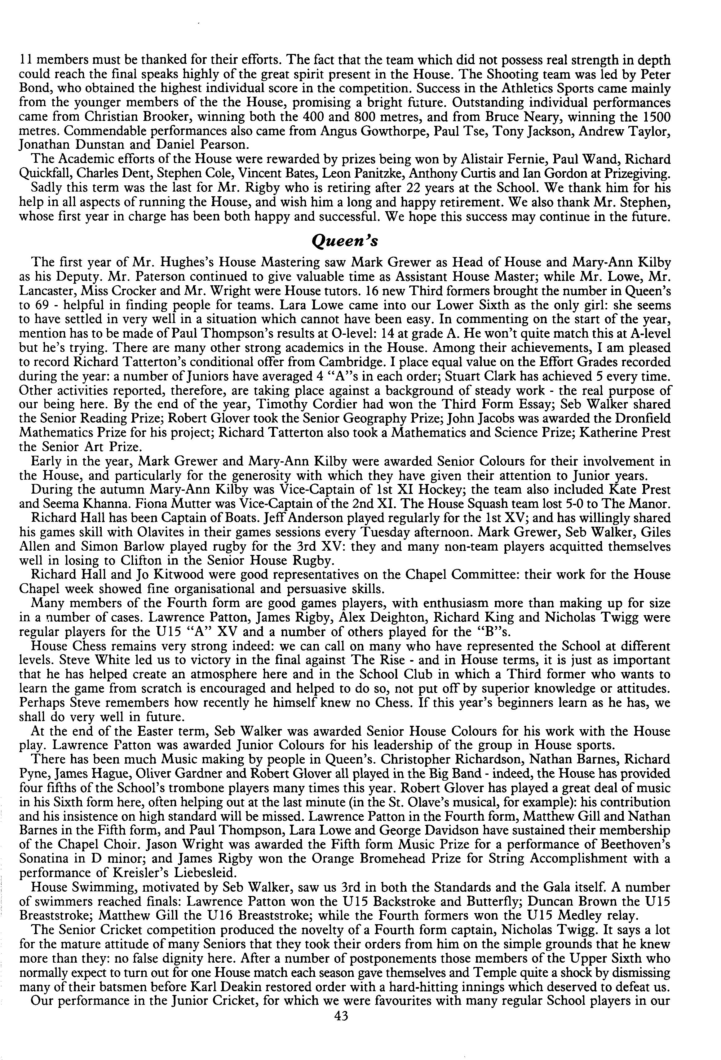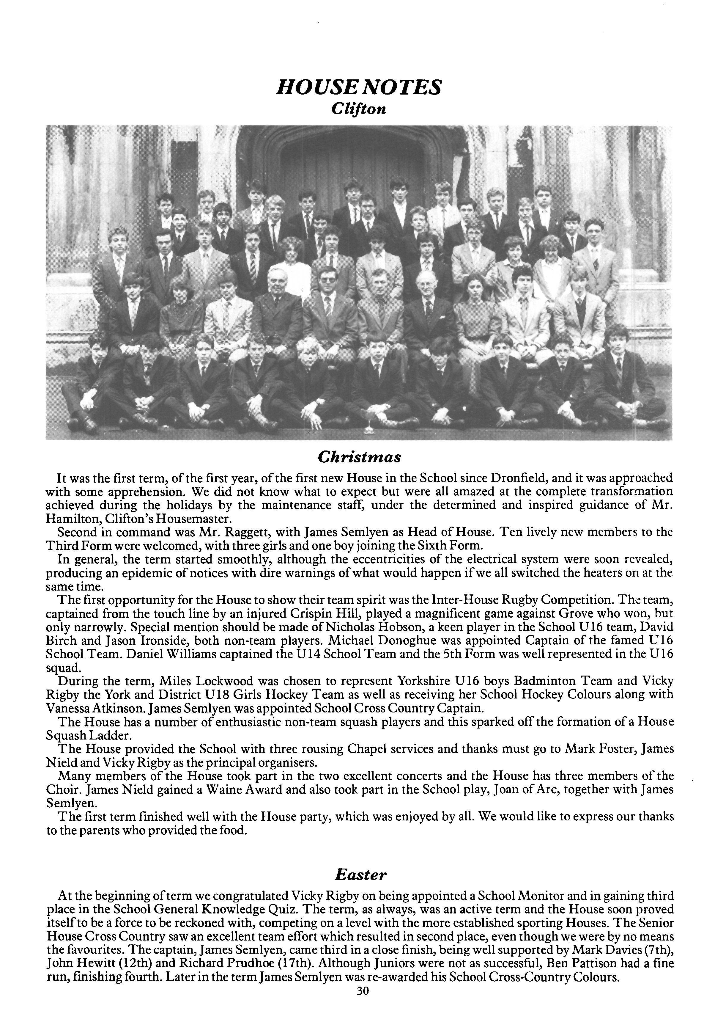Outside the classroom he was always busy He was a very keen and noisy rugger coach and ran the U 15 team for many years with tremendous enthusiasm; in 1984-85 histeam achieved the rare feat ofbeingunbeaten!His interests were many, but whether it was acourse in car maintenance, playing soccer or basketball against the boys, helping to run the athletics, or organising a small but enthusiastic lunchtime bridge club, he did everything with tremendous zest He even found time tobetheAssistant in the new House, Clifton