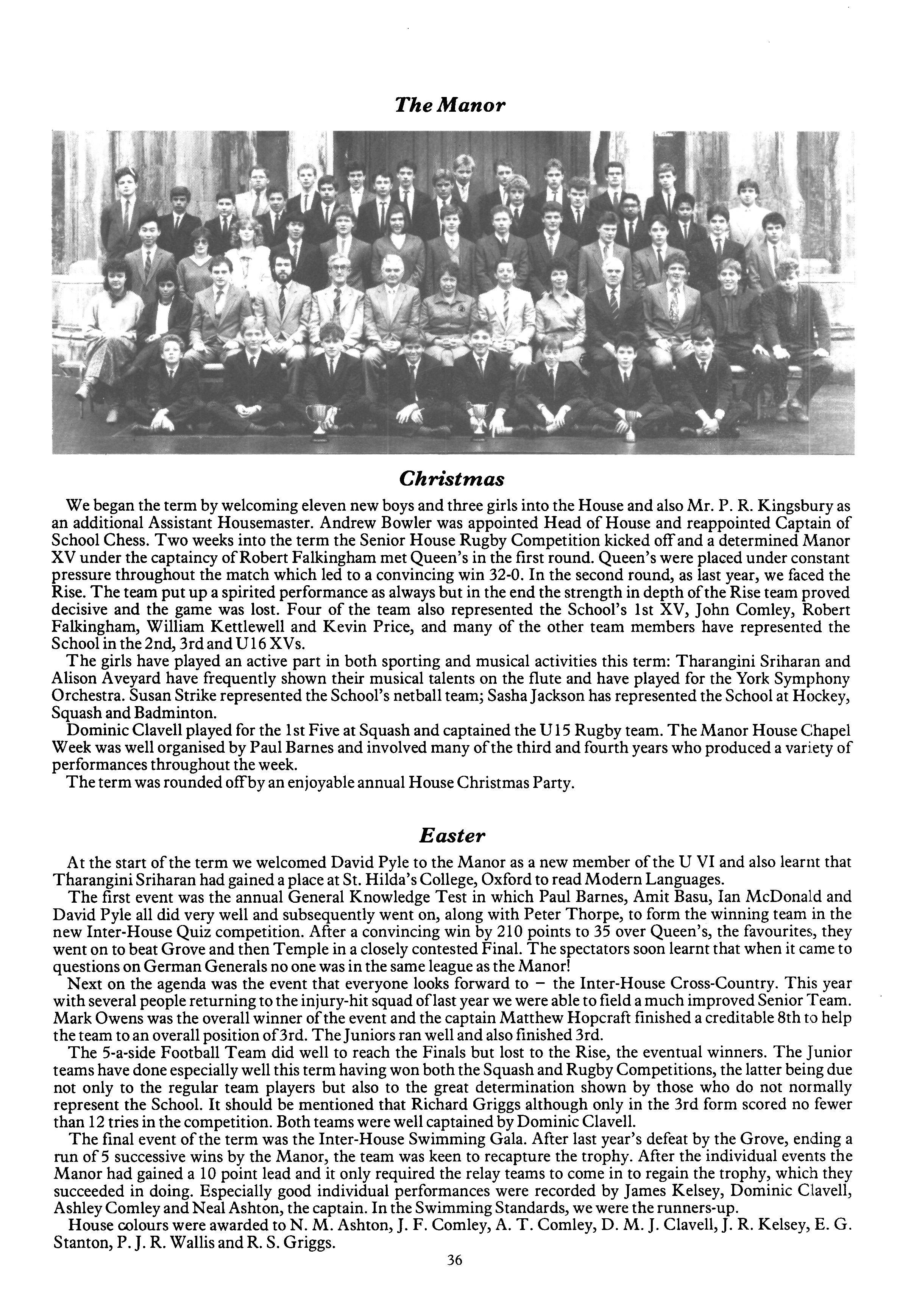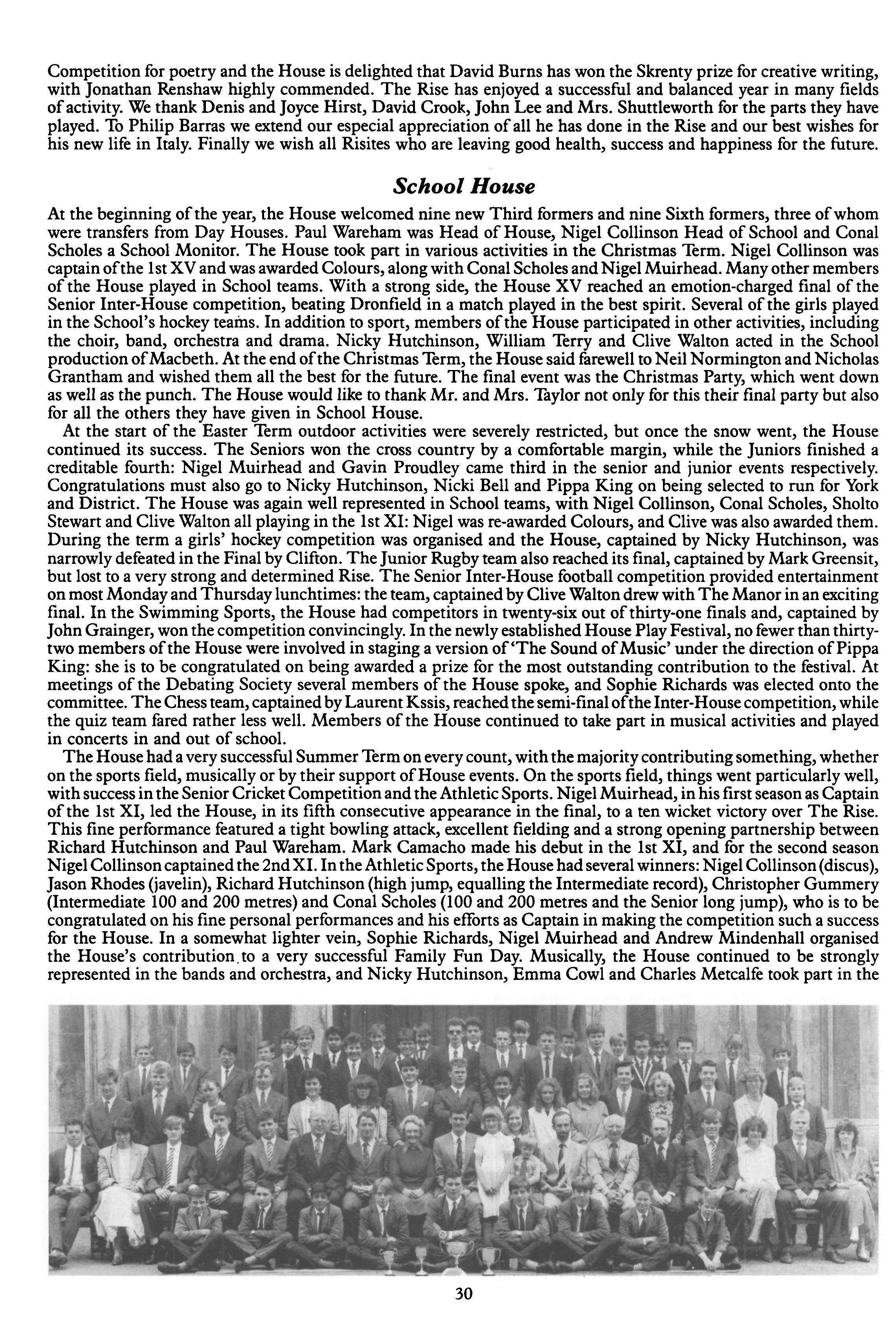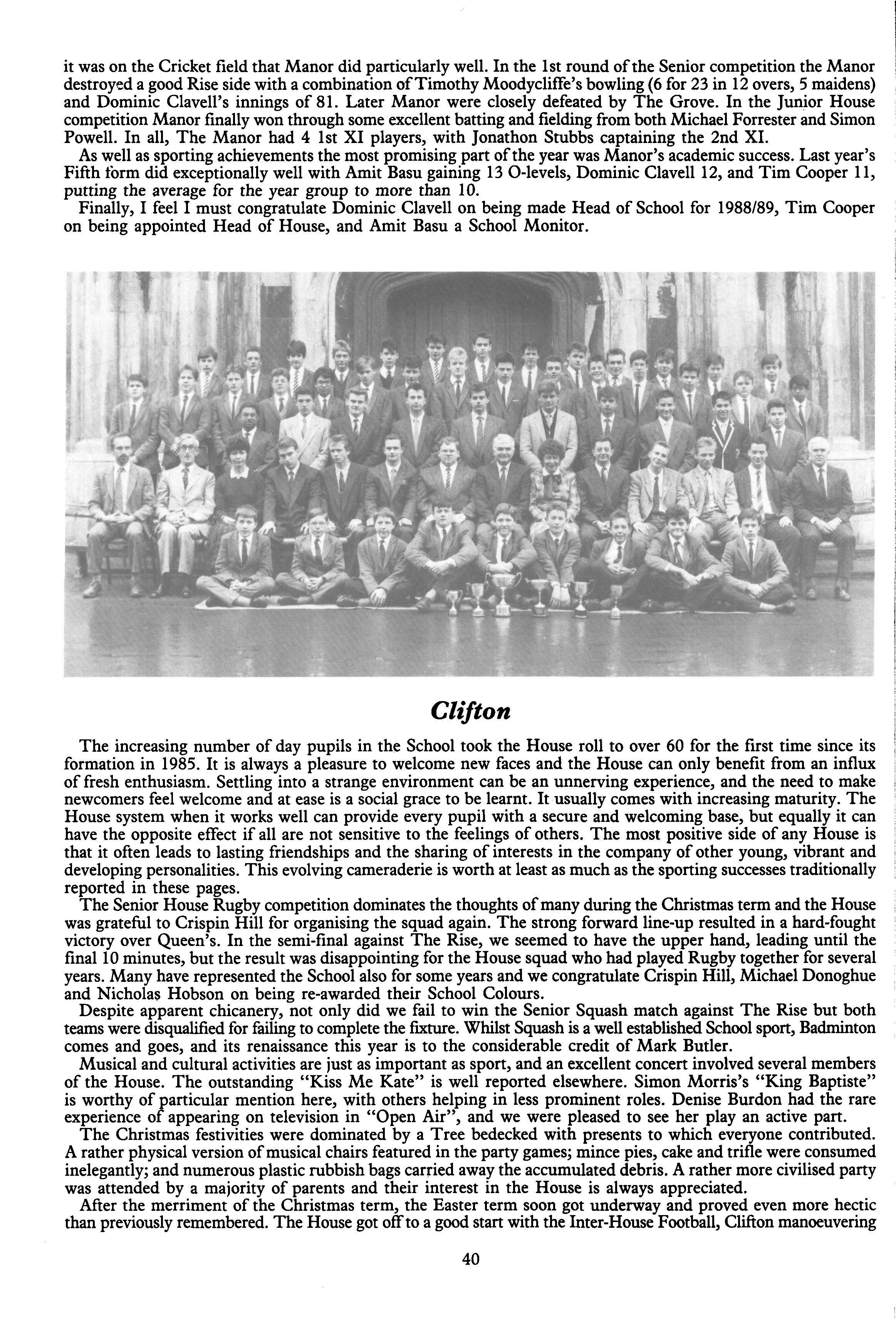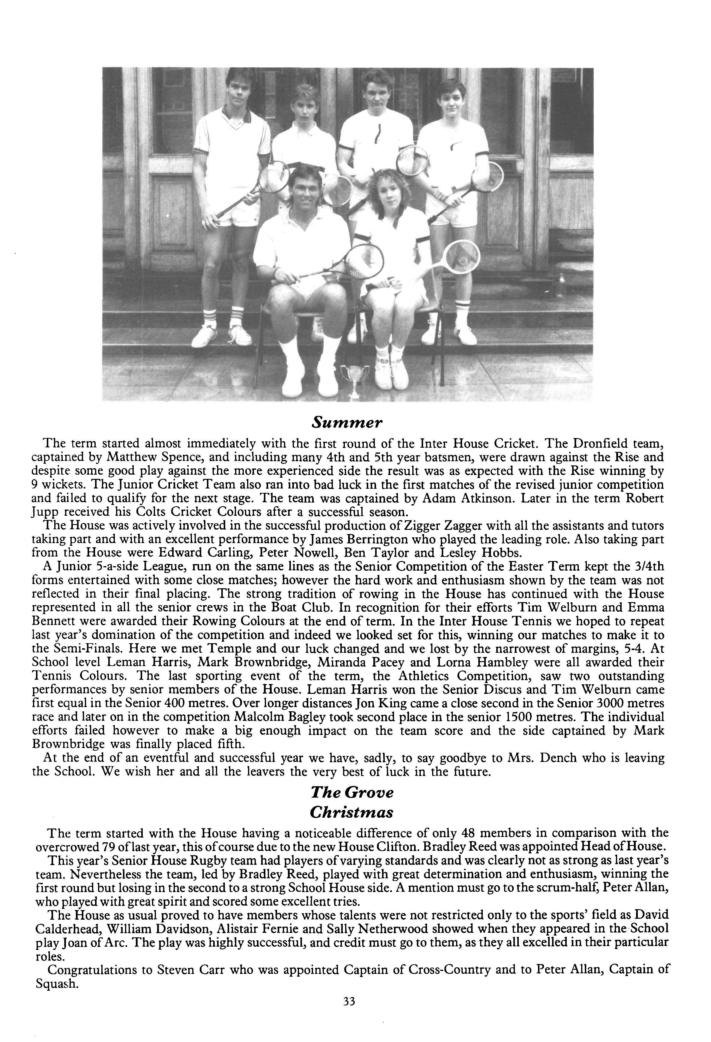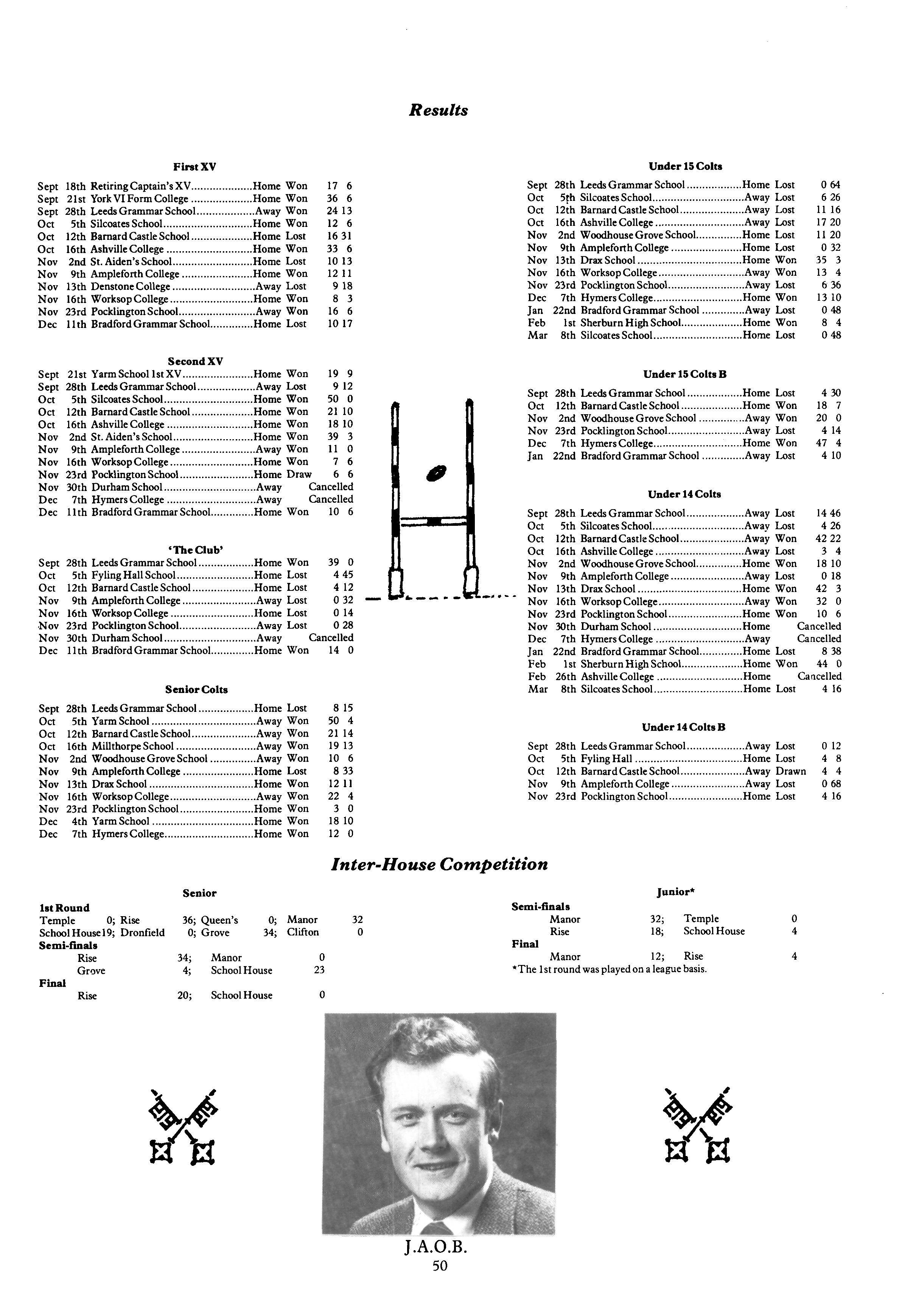 Outside the classroom he was always busy He was a very keen and noisy rugger coach and ran the U 15 team for many years with tremendous enthusiasm; in 1984-85 histeam achieved the rare feat ofbeingunbeaten!His interests were many, but whether it was acourse in car maintenance, playing soccer or basketball against the boys, helping to run the athletics, or organising a small but enthusiastic lunchtime bridge club, he did everything with tremendous zest He even found time tobetheAssistant in the new House, Clifton