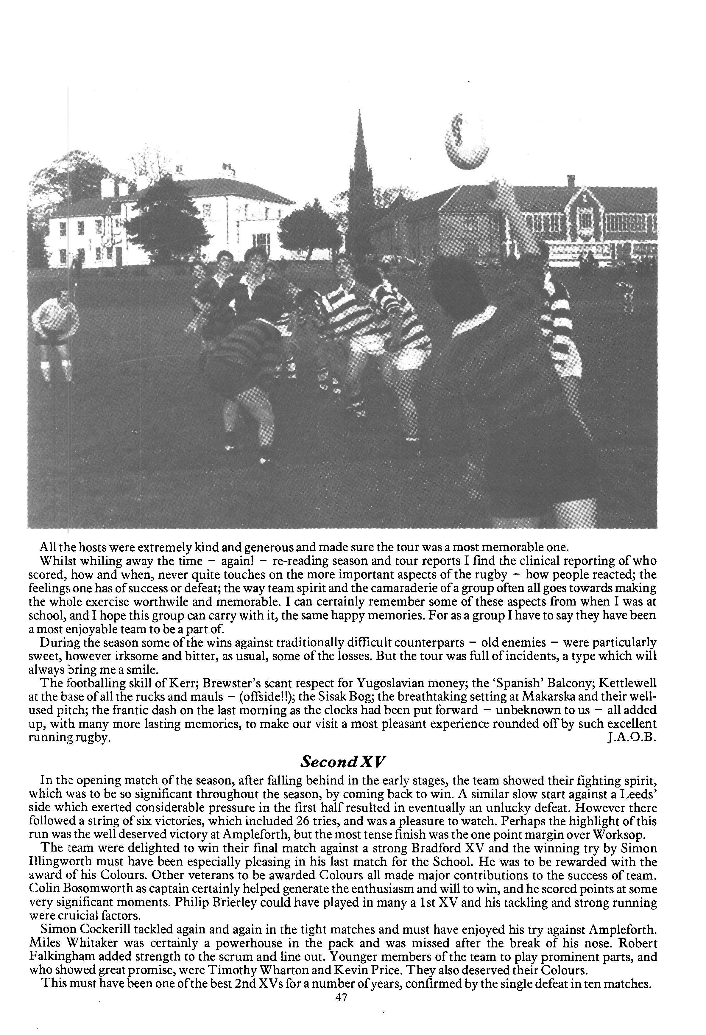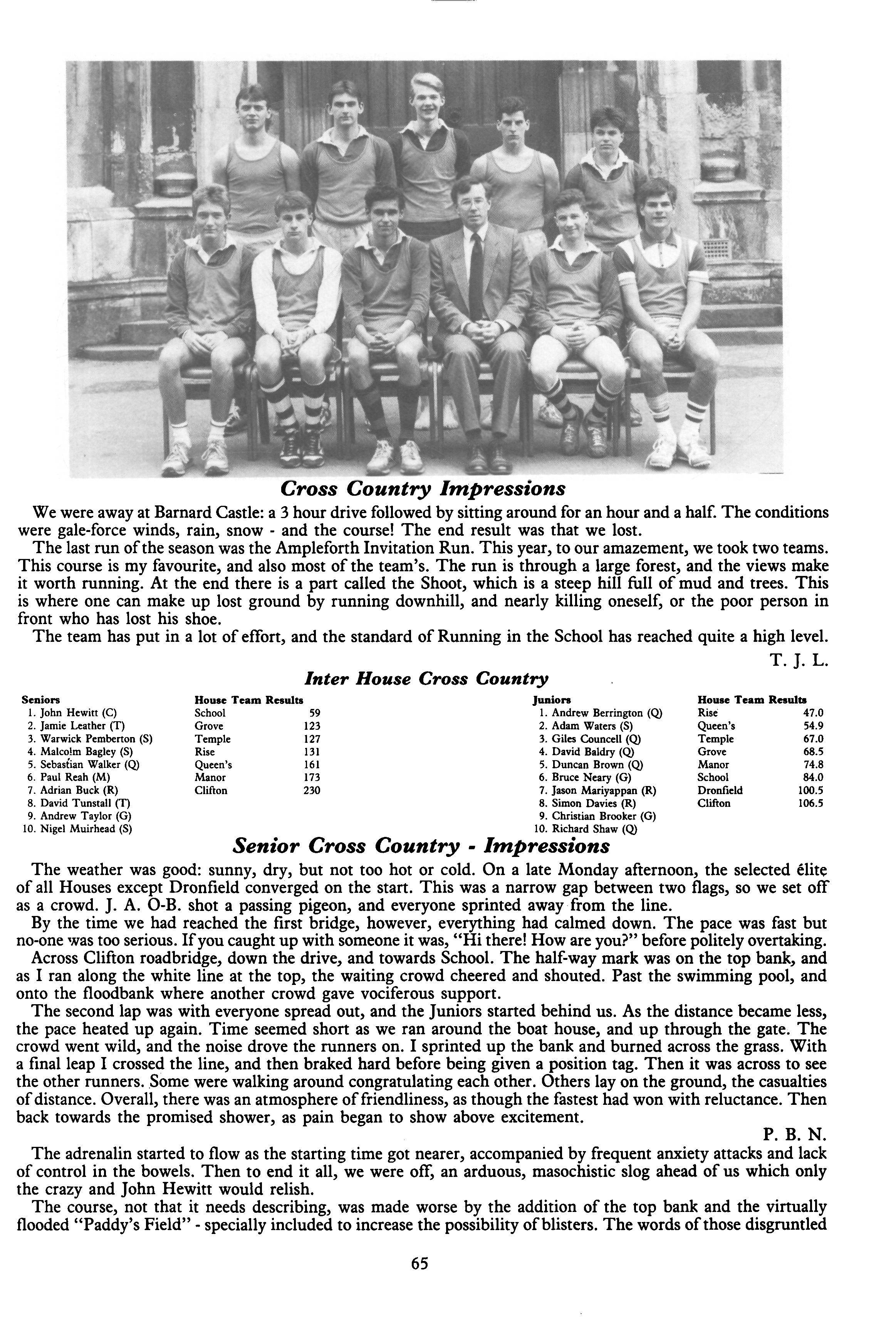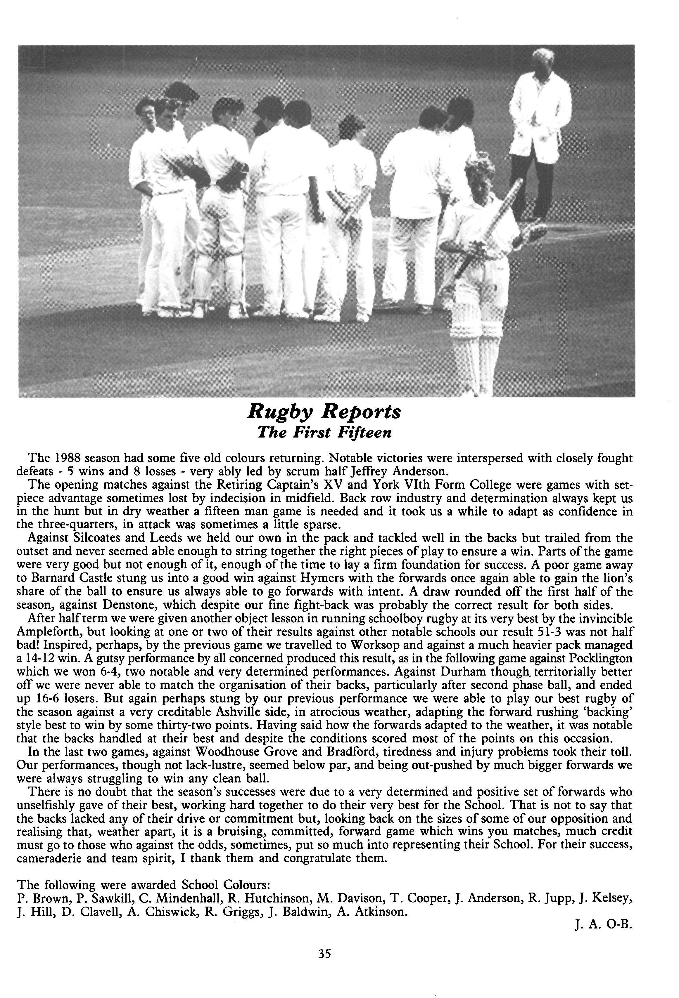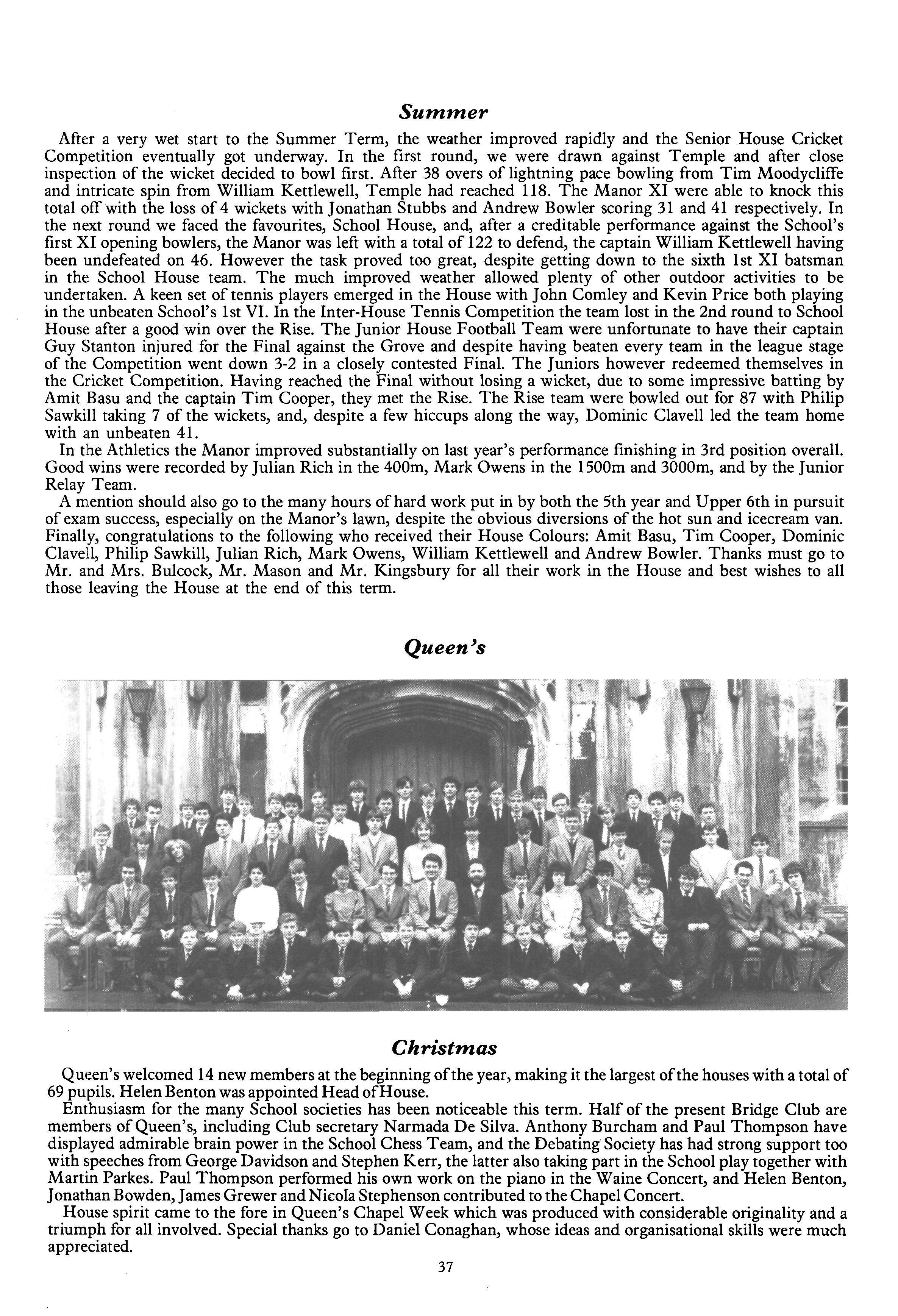 Outside the classroom he was always busy He was a very keen and noisy rugger coach and ran the U 15 team for many years with tremendous enthusiasm; in 1984-85 histeam achieved the rare feat ofbeingunbeaten!His interests were many, but whether it was acourse in car maintenance, playing soccer or basketball against the boys, helping to run the athletics, or organising a small but enthusiastic lunchtime bridge club, he did everything with tremendous zest He even found time tobetheAssistant in the new House, Clifton