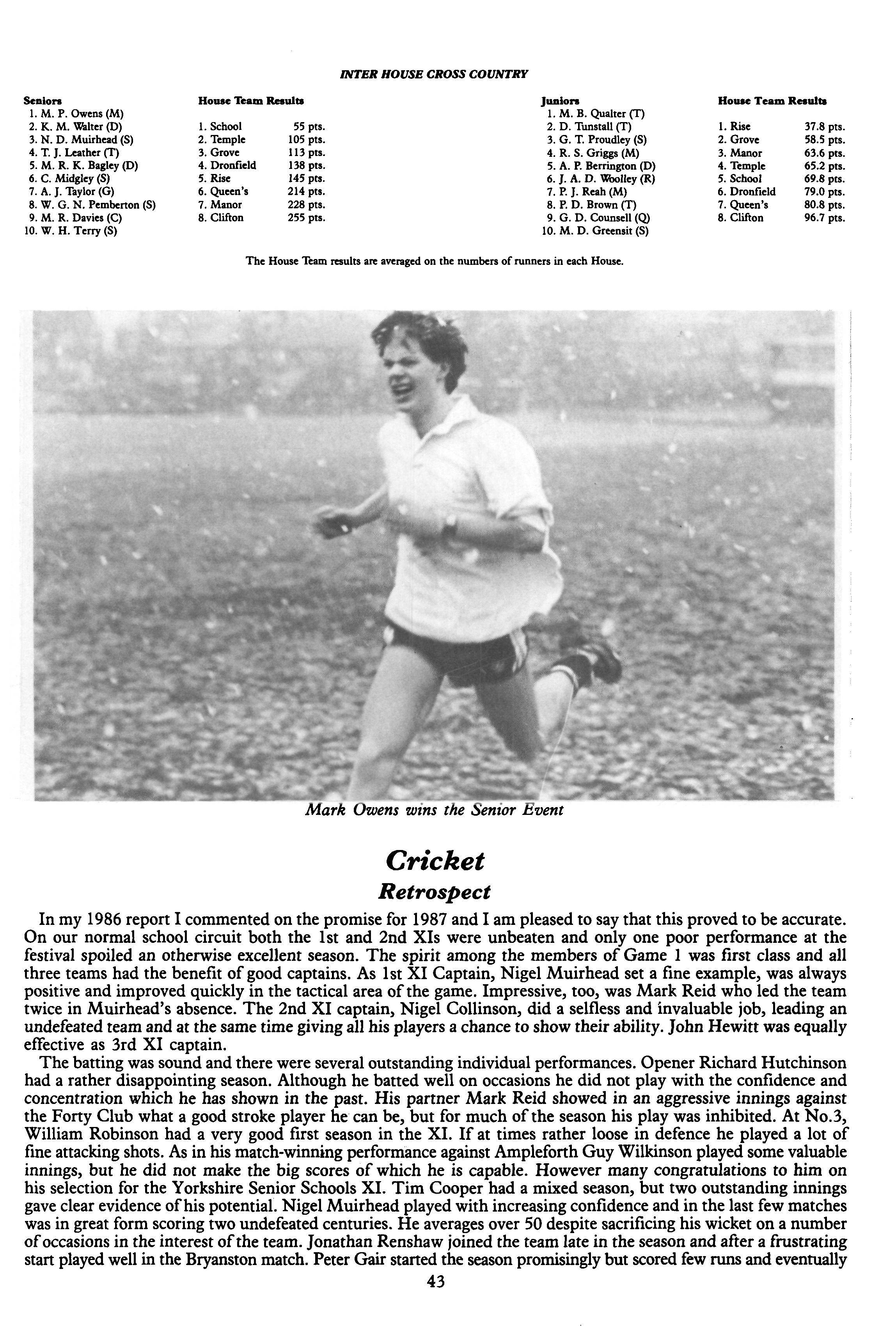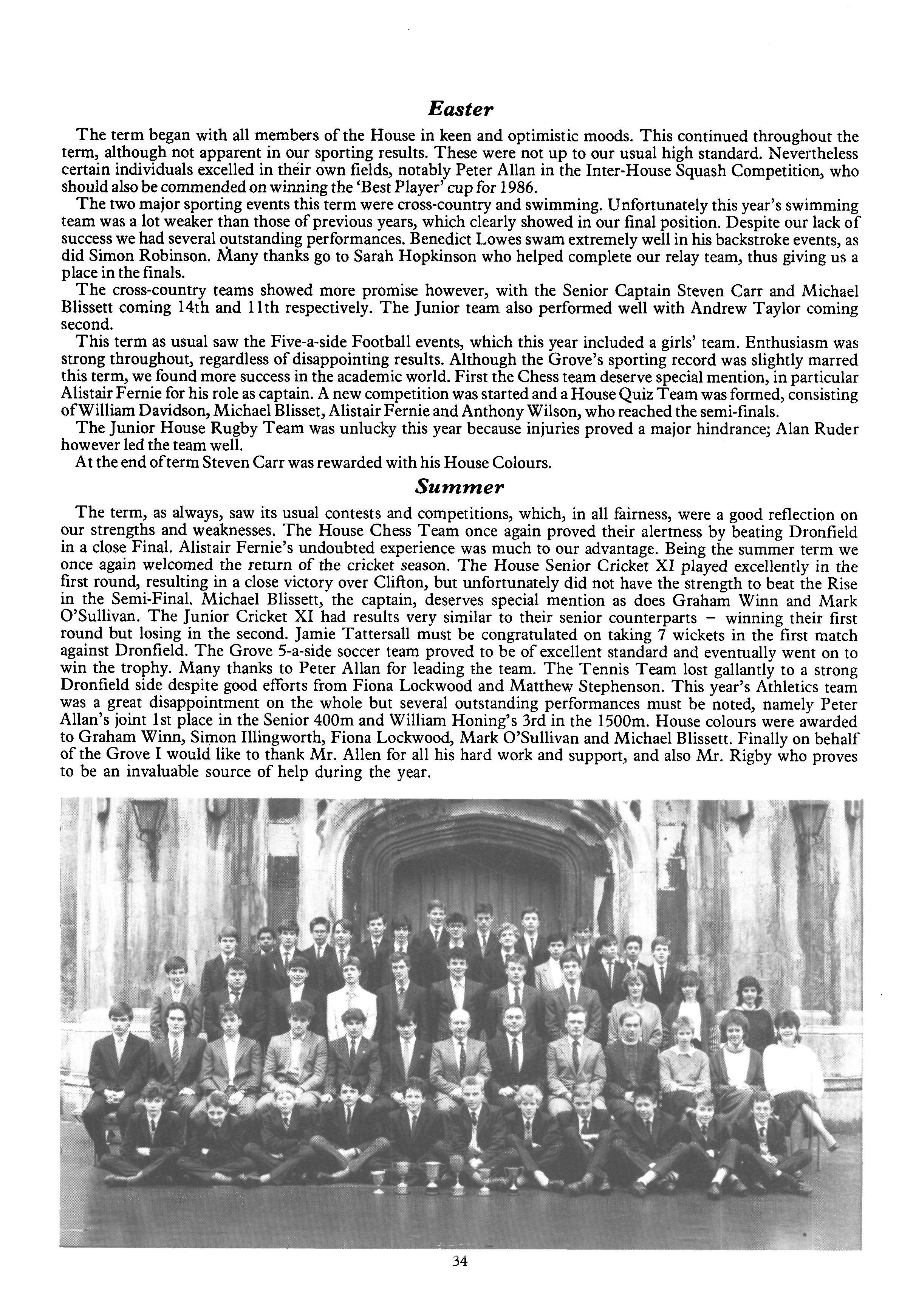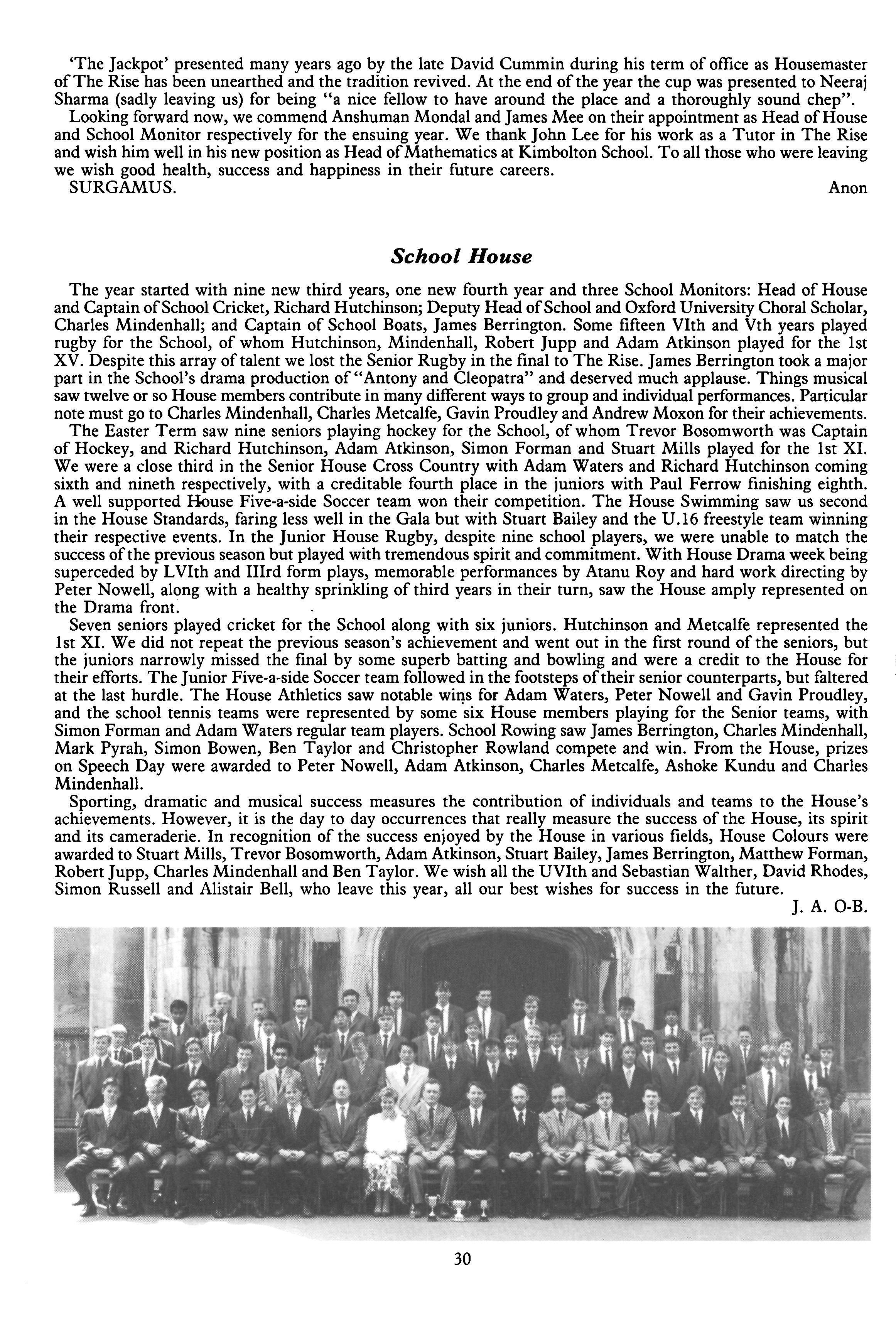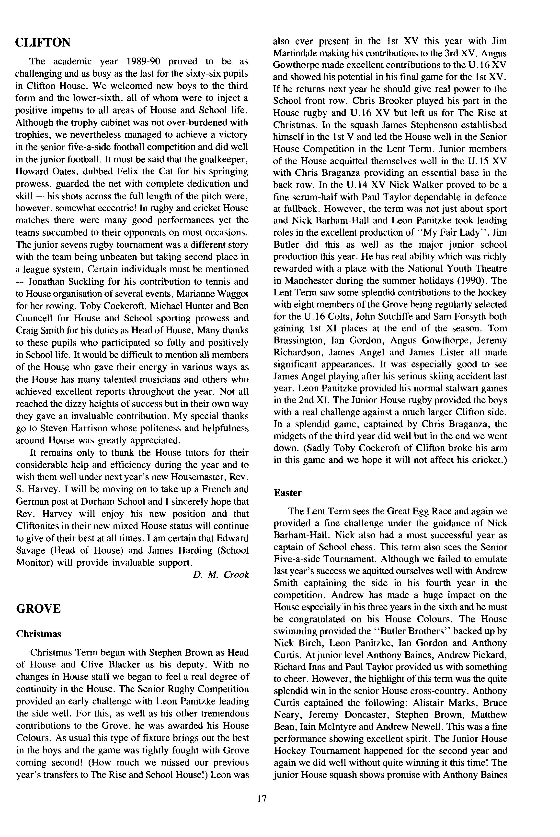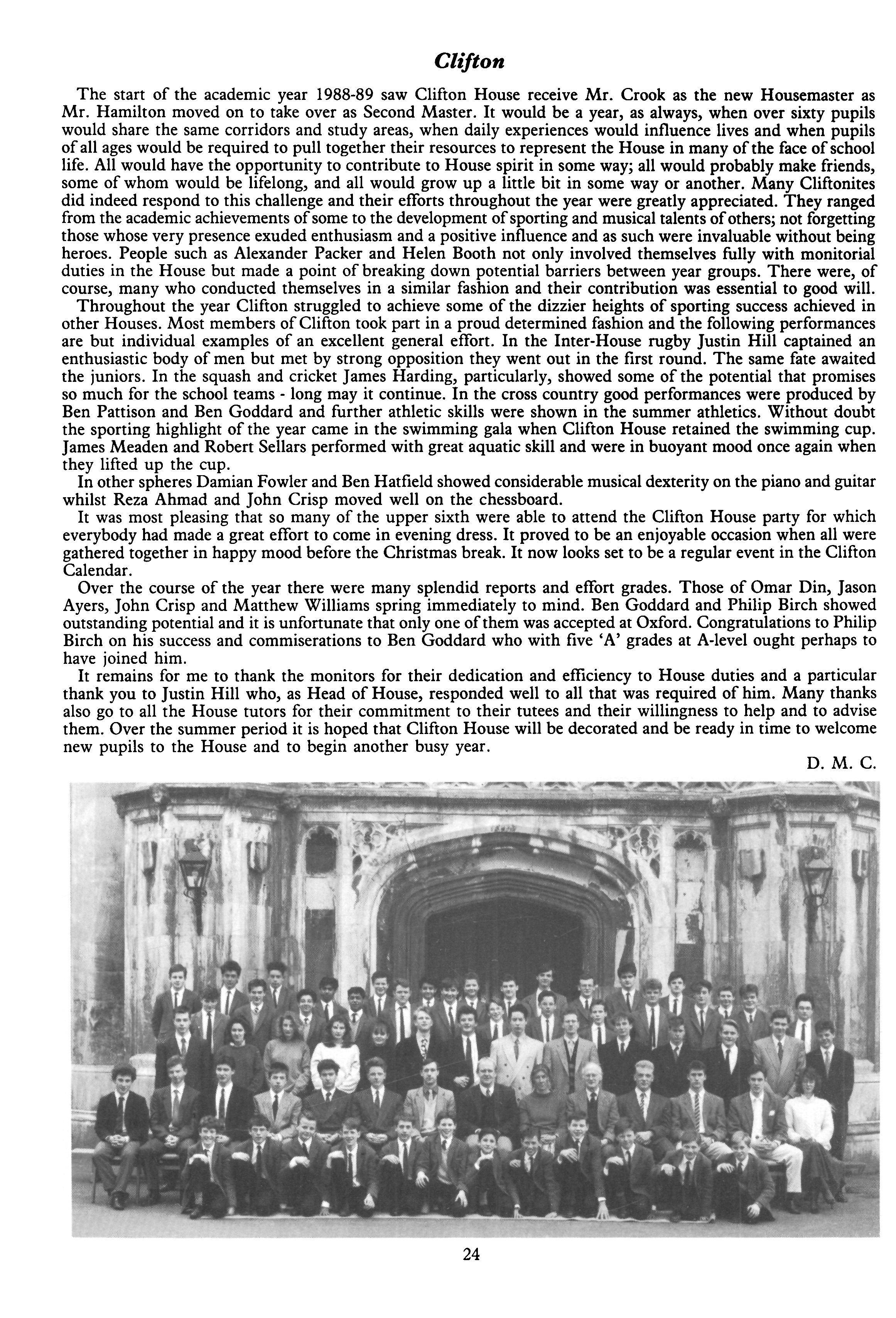Outside the classroom he was always busy He was a very keen and noisy rugger coach and ran the U 15 team for many years with tremendous enthusiasm; in 1984-85 histeam achieved the rare feat ofbeingunbeaten!His interests were many, but whether it was acourse in car maintenance, playing soccer or basketball against the boys, helping to run the athletics, or organising a small but enthusiastic lunchtime bridge club, he did everything with tremendous zest He even found time tobetheAssistant in the new House, Clifton