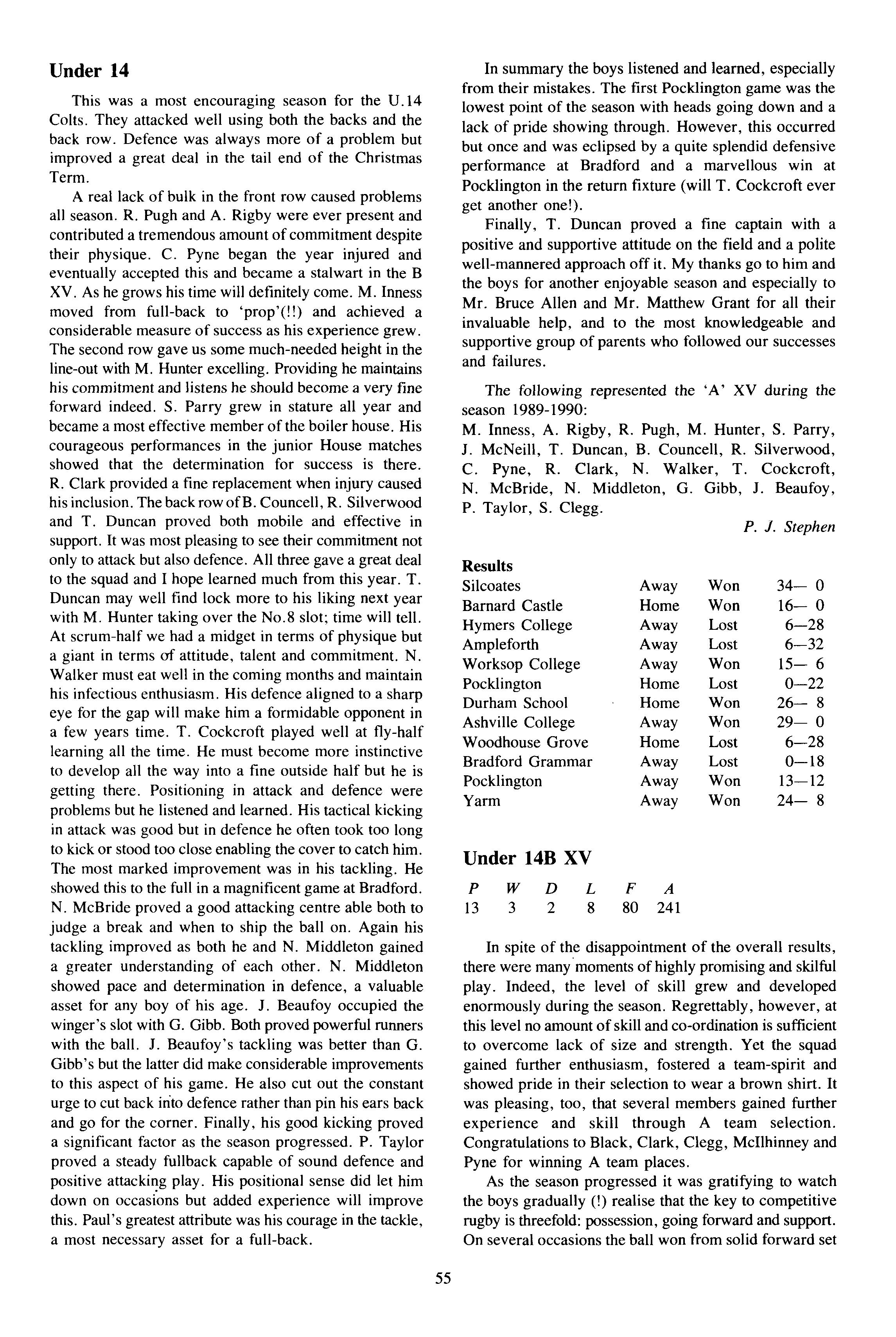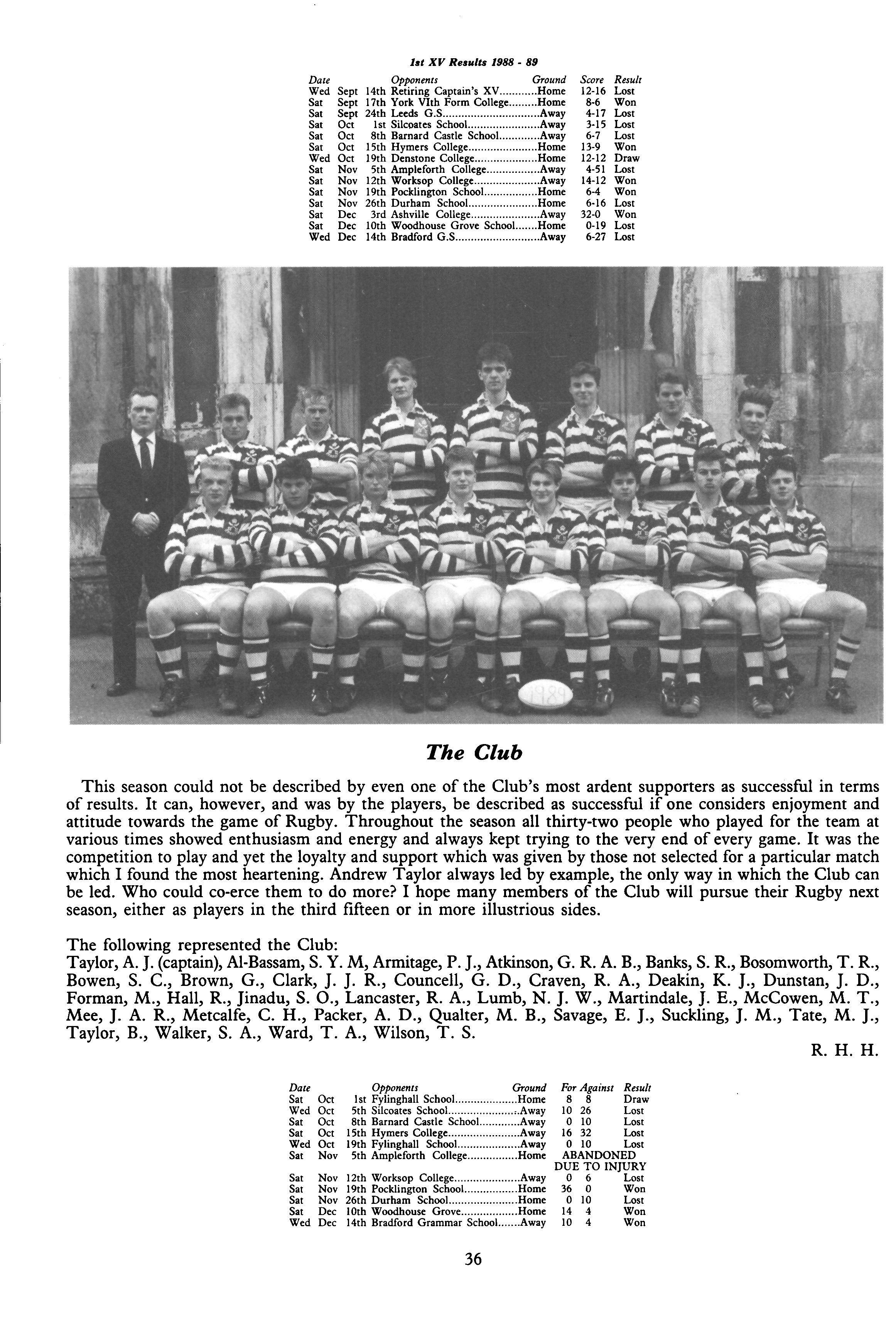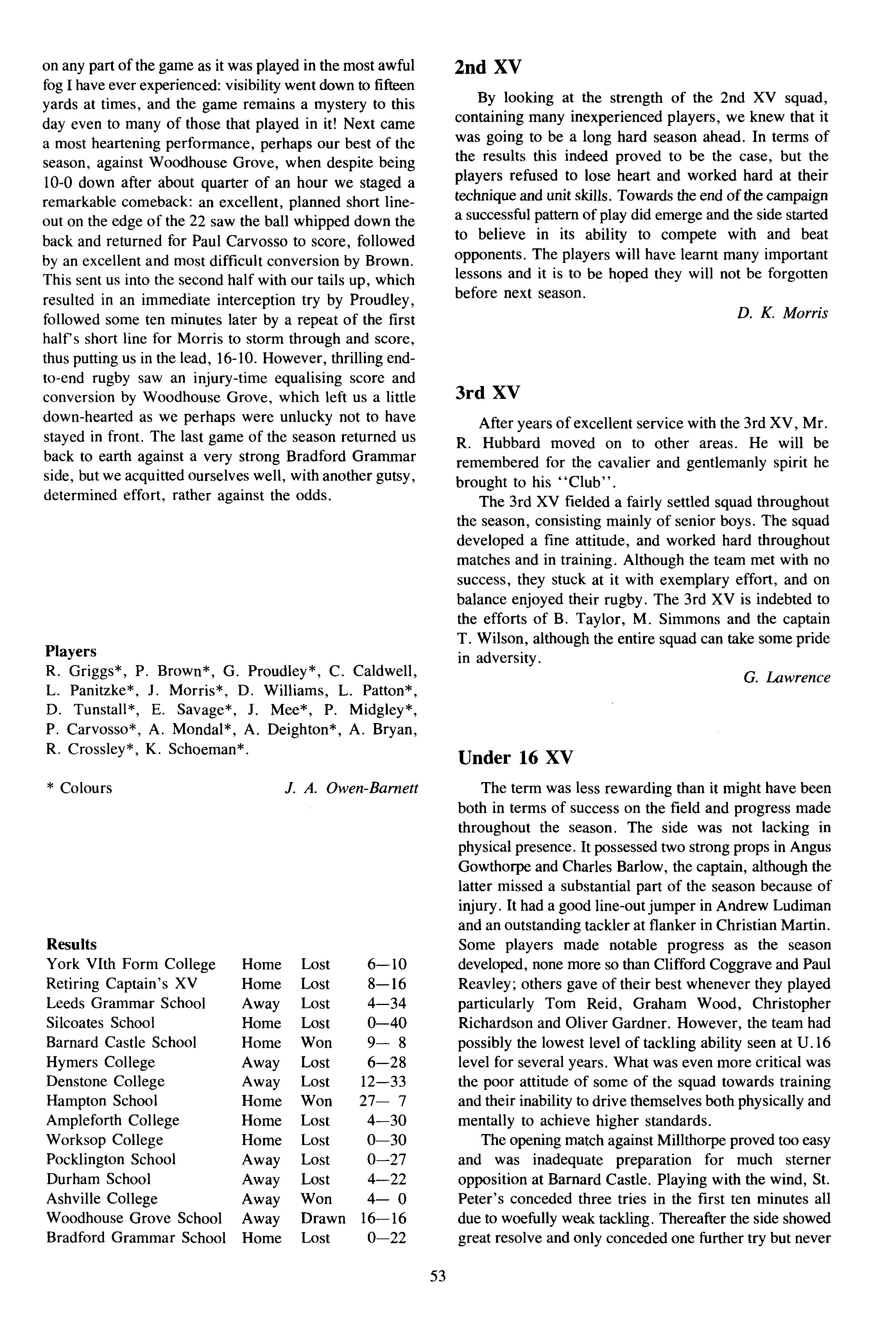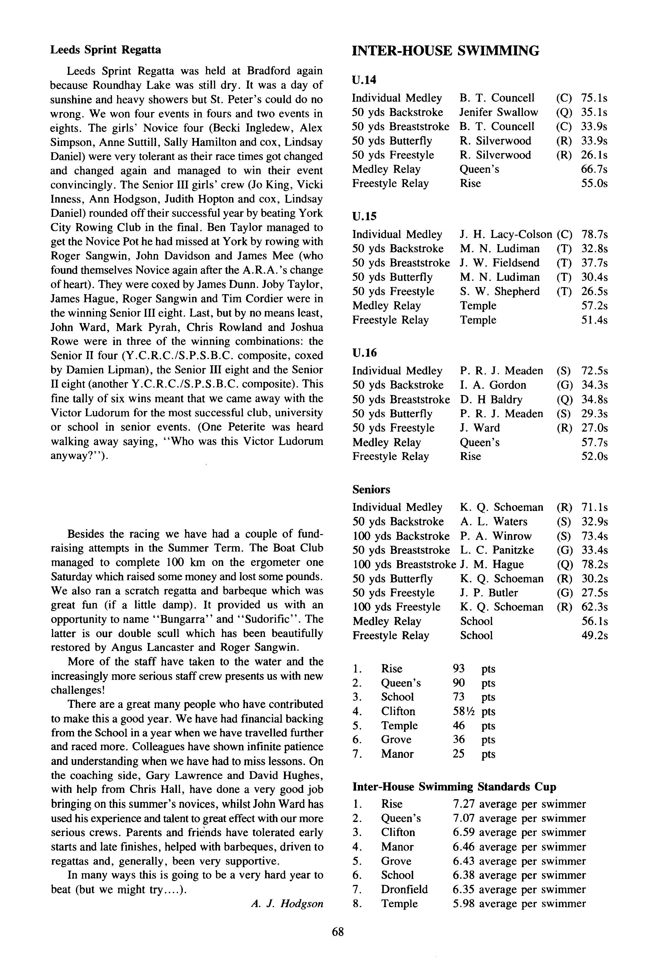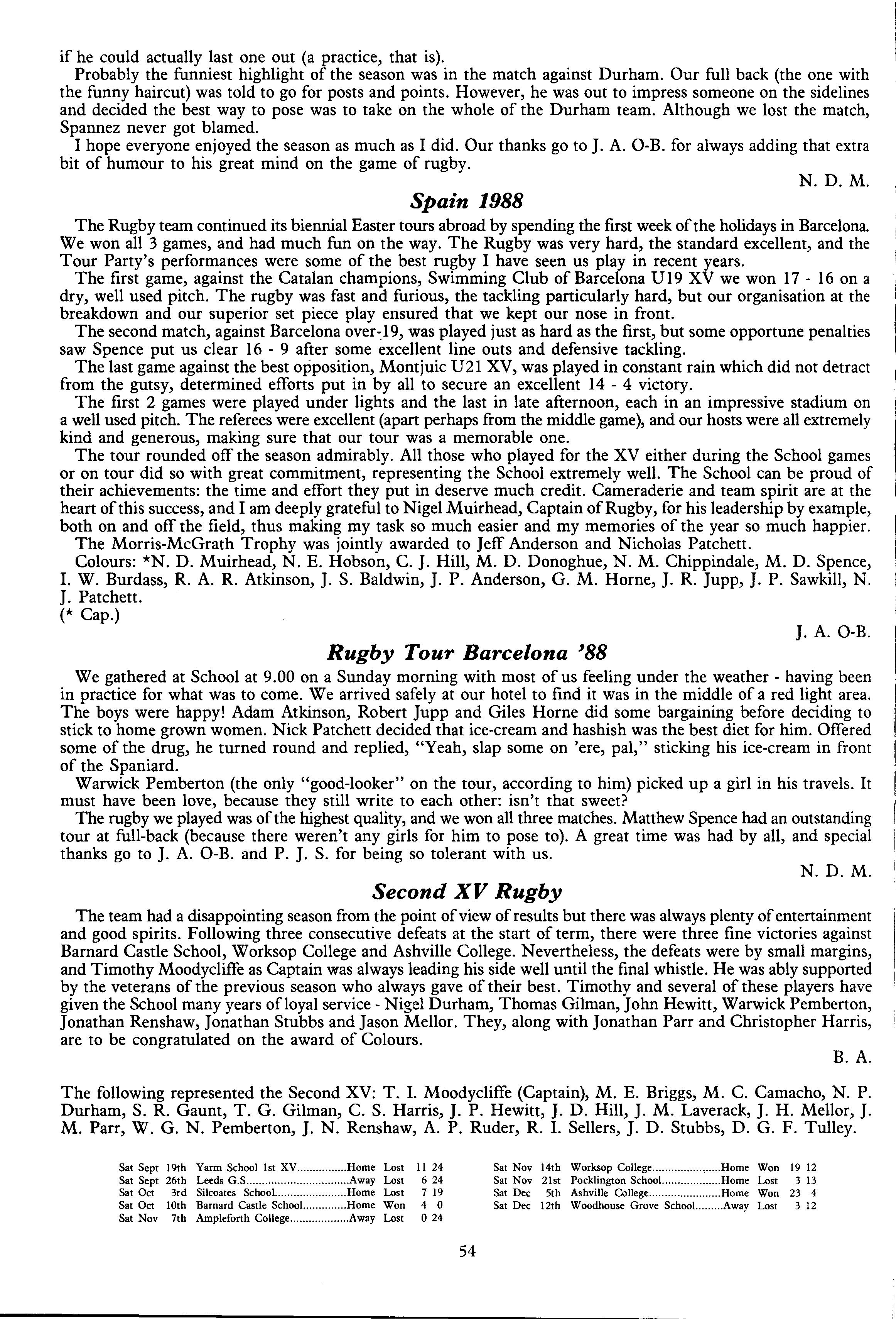 Outside the classroom he was always busy He was a very keen and noisy rugger coach and ran the U 15 team for many years with tremendous enthusiasm; in 1984-85 histeam achieved the rare feat ofbeingunbeaten!His interests were many, but whether it was acourse in car maintenance, playing soccer or basketball against the boys, helping to run the athletics, or organising a small but enthusiastic lunchtime bridge club, he did everything with tremendous zest He even found time tobetheAssistant in the new House, Clifton