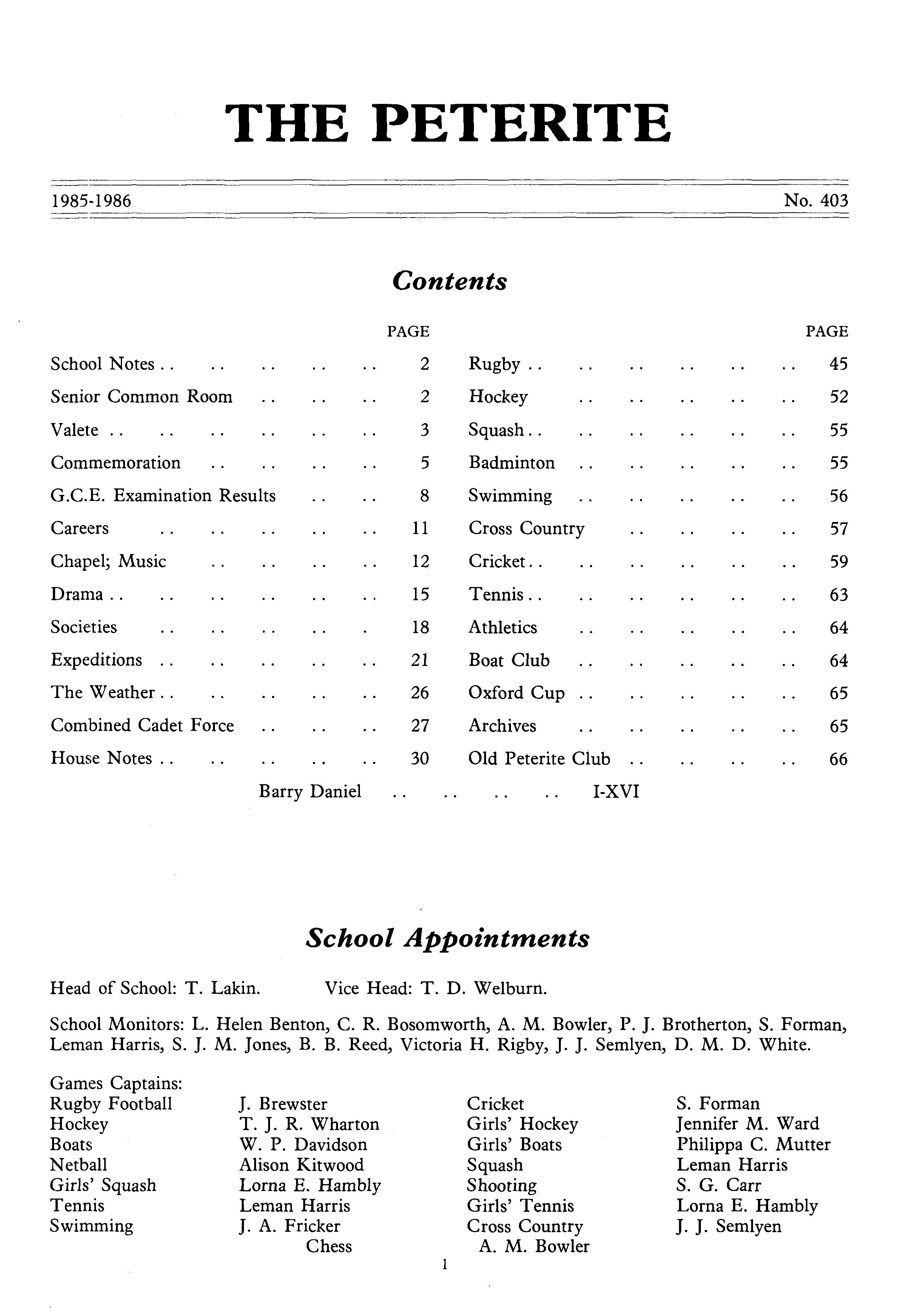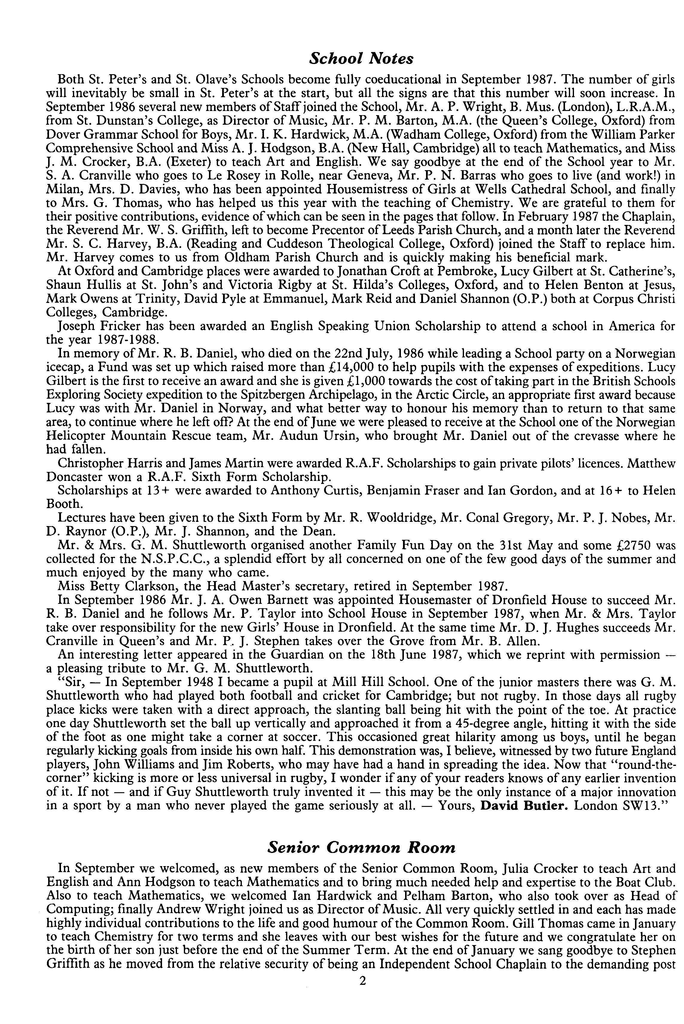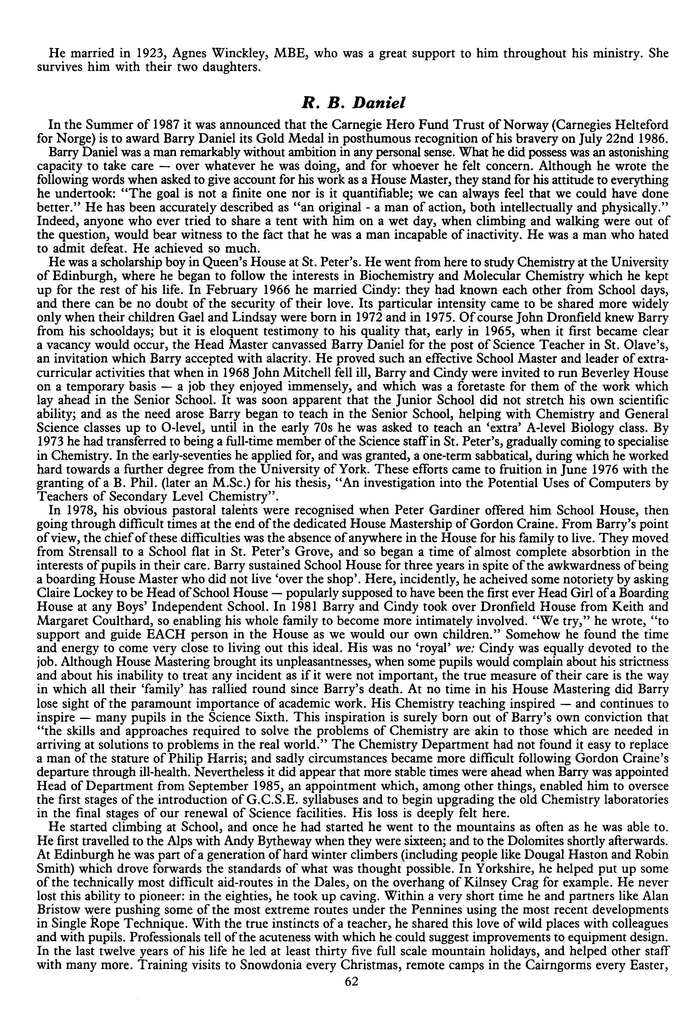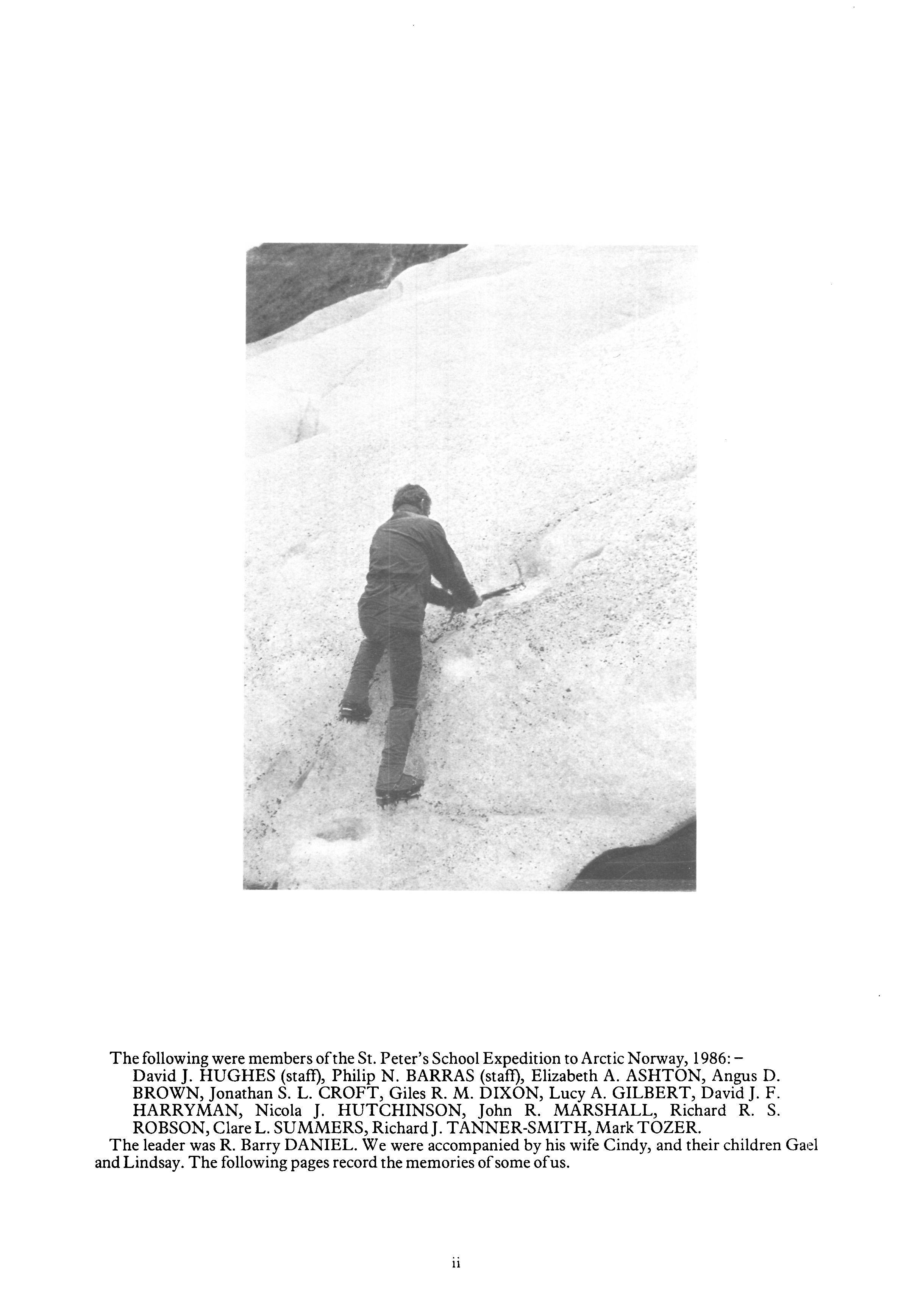 This number wasdesigned to celebrate the centenary ofthe foundation ofthe Old Peterite Club in 1886;and soit does But on the 22nd July 1986 came the dreadful news from Norway that Mr R B Daniel had been killed in a climbing accident on the Svartisen glacier, while leading a School group To him too we dedicate this edition asa tribute to his courage and skill as a mountaineer as well to the memory ofa fine and dedicated schoolmaster, whom weallmisswith aching hearts