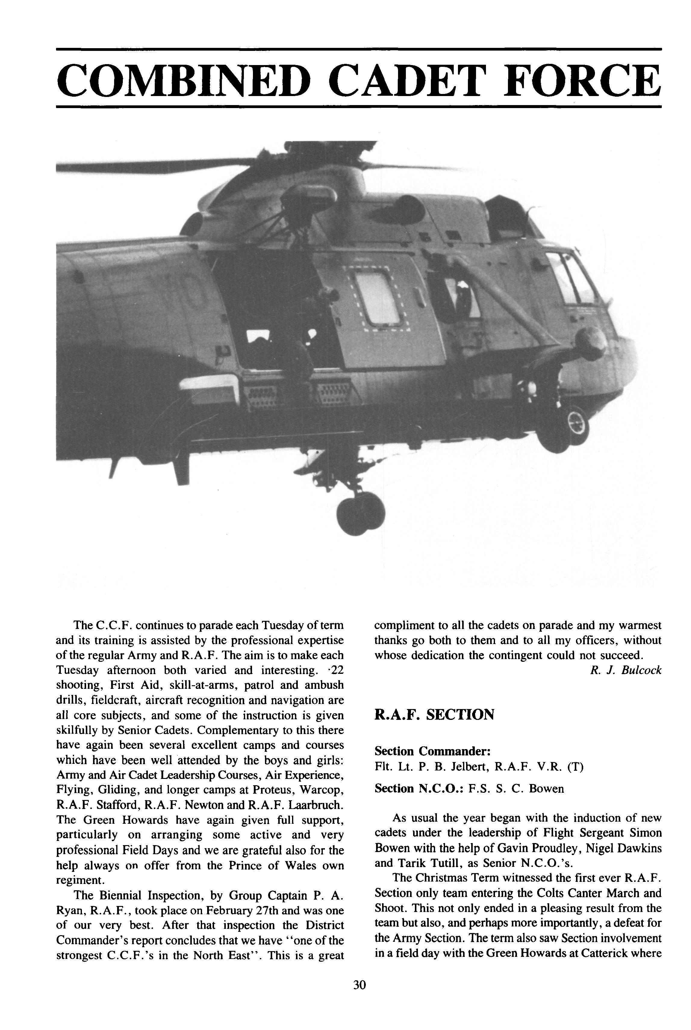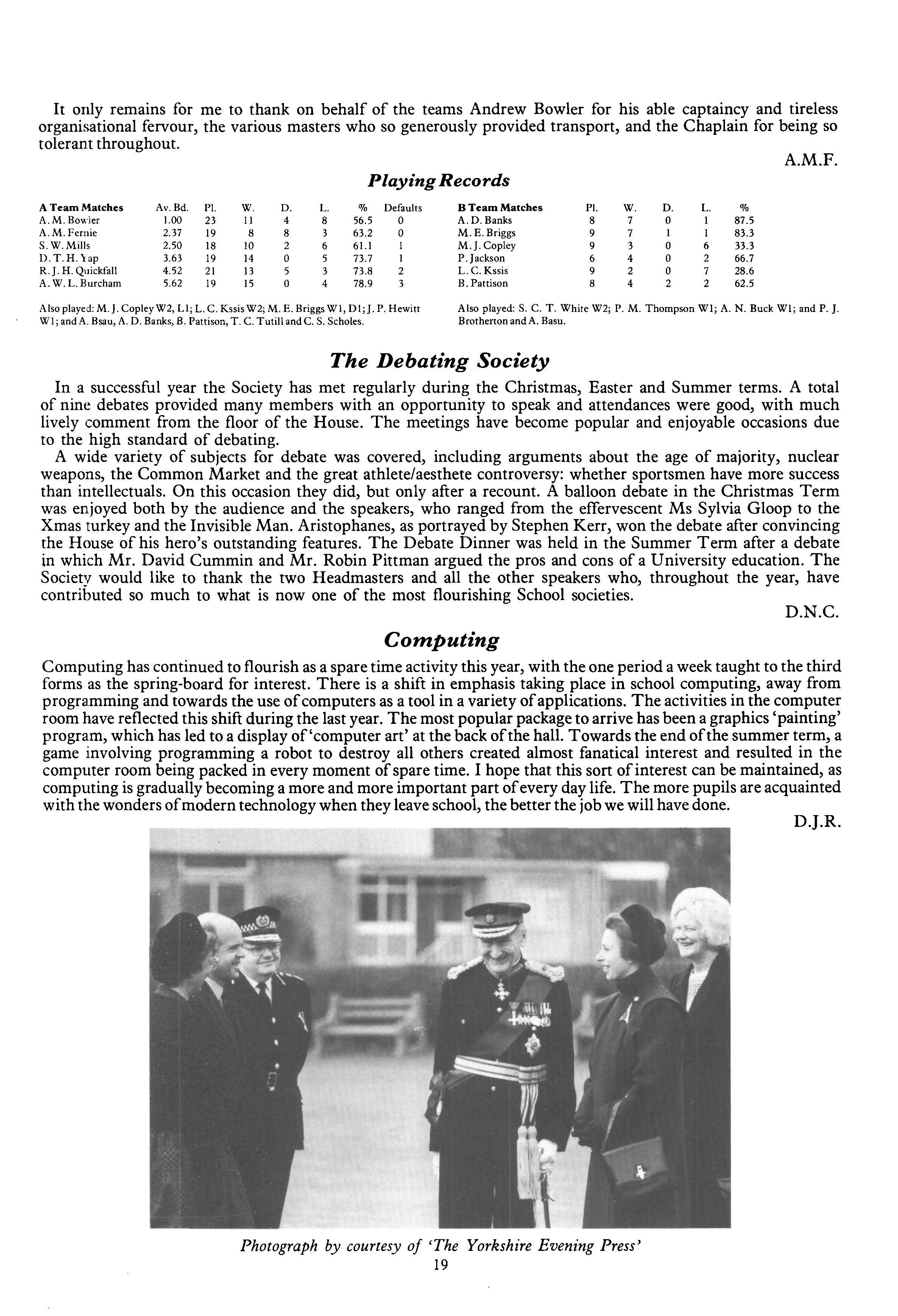 Princess Anne landed by helicopter at the School during the Christmas Term Half Term Holiday and was greeted by the Headmaster and Mrs Pittman The Princess wasfulfilling anengagement in York before flying to Catterick Mr J N Gaastra died in hospital on the 12th November 1985 He had retired only two years earlier after serving as Director ofArt for many years We send our sympathy tohiswife and family