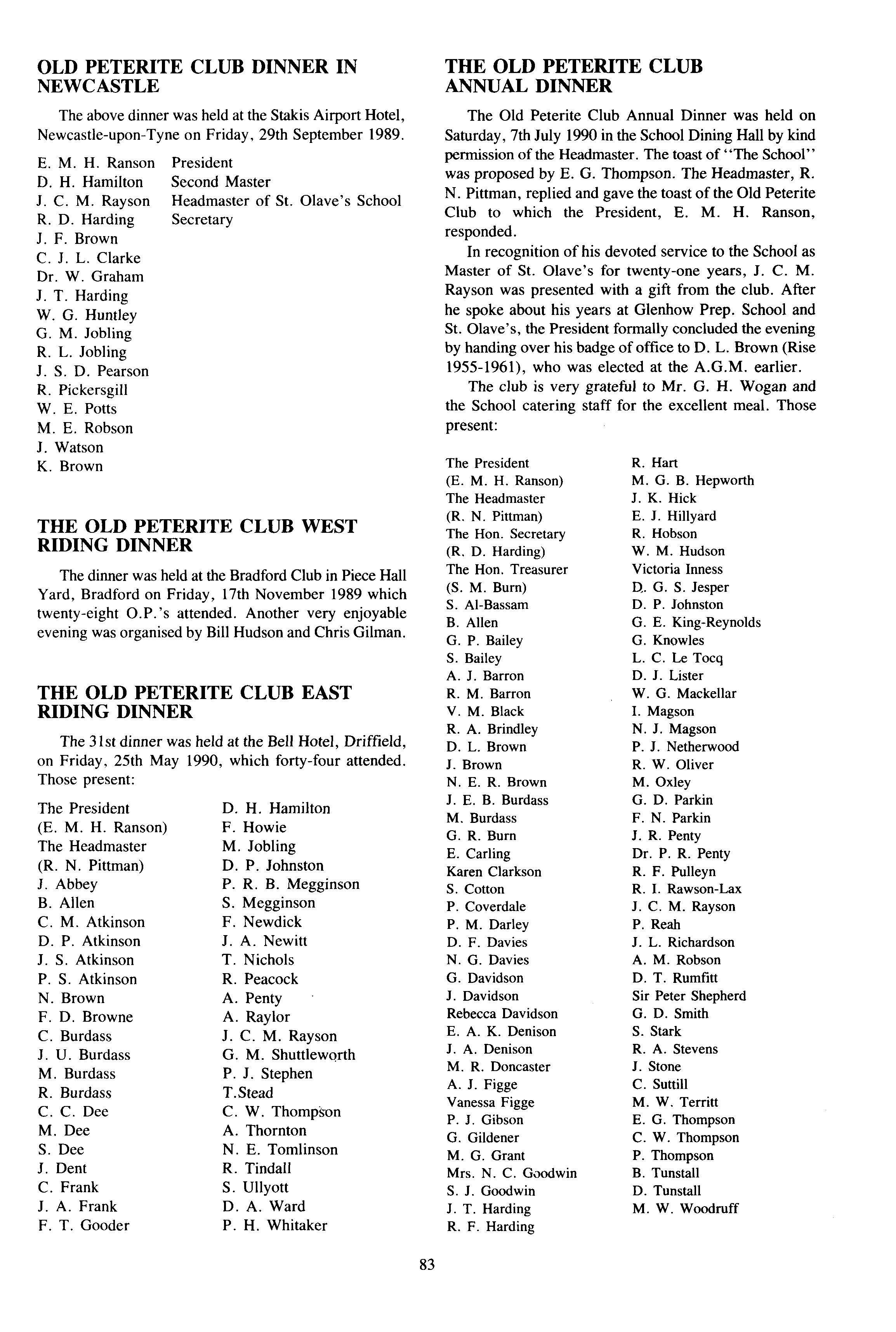 Friday 22nd March 1991: O.P Spring Ball at St Peter's Friday26th April: North East Dinner - Hardwick Hall Hotel, Sedgefield, Co. Durham. Hotel Tel: 0740-20253. 7.30 p.m. for 8.00 p.m. Organiser: David Brown. Tel. (Home) 0325-465543), (Office) 0325-381600.