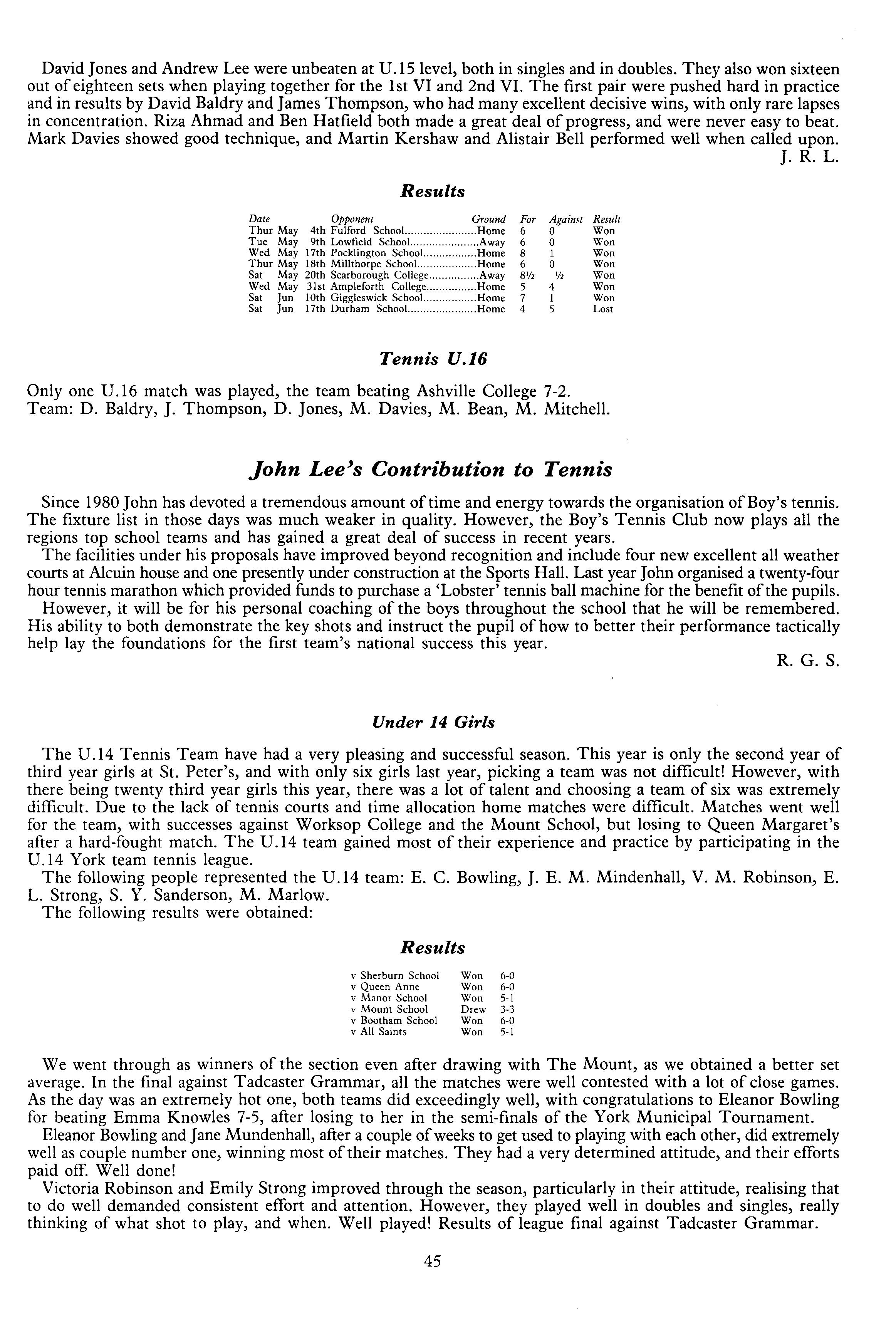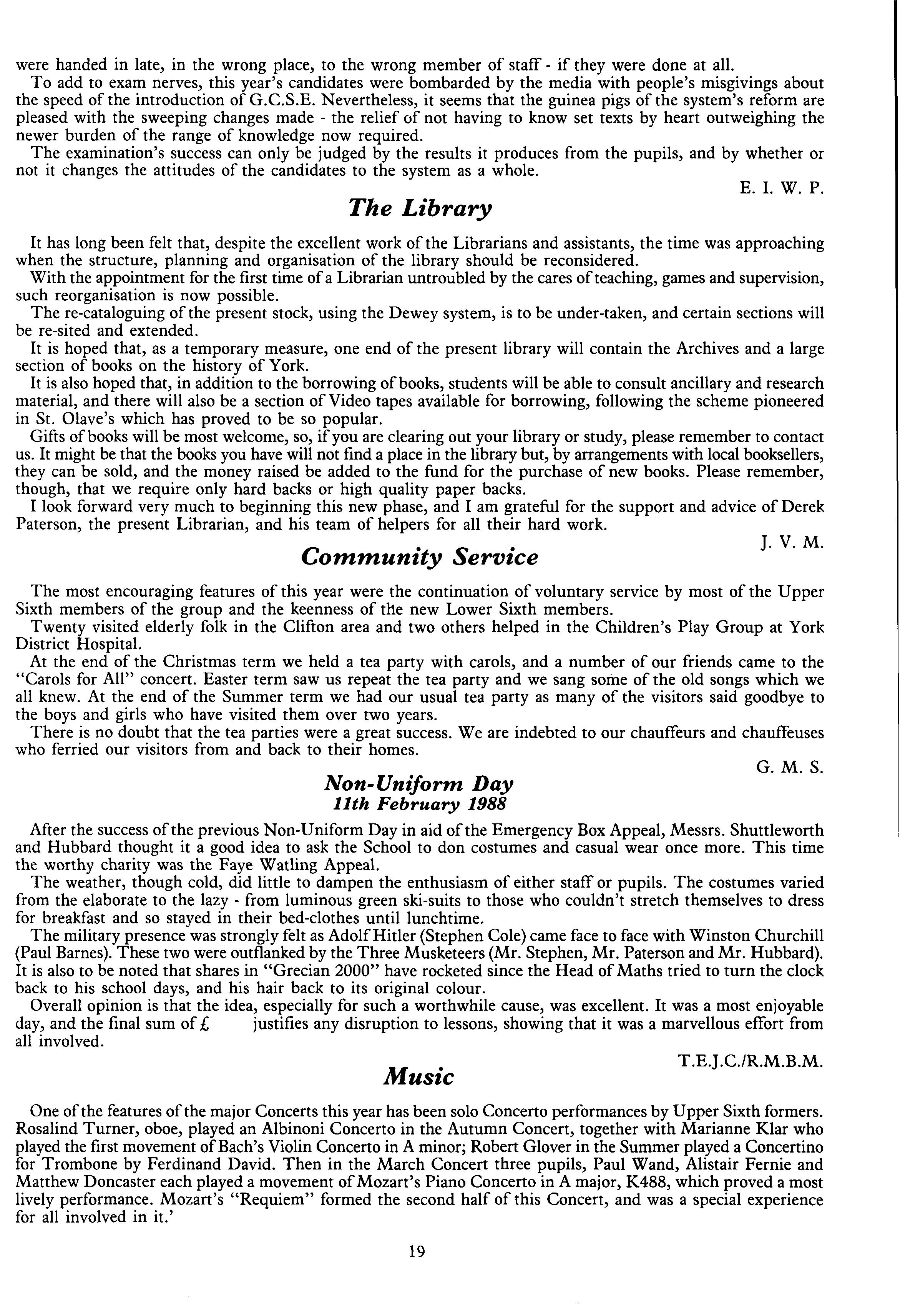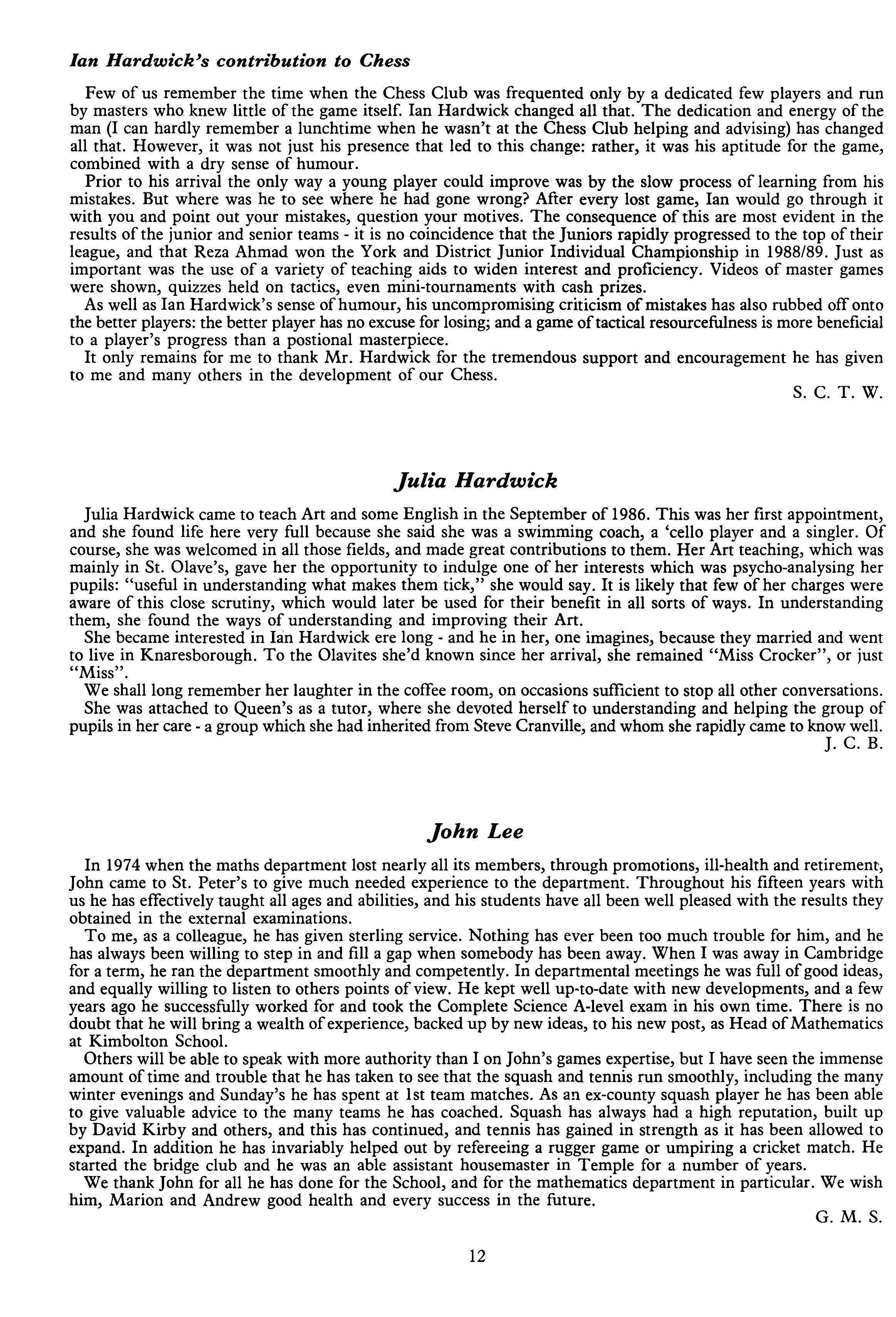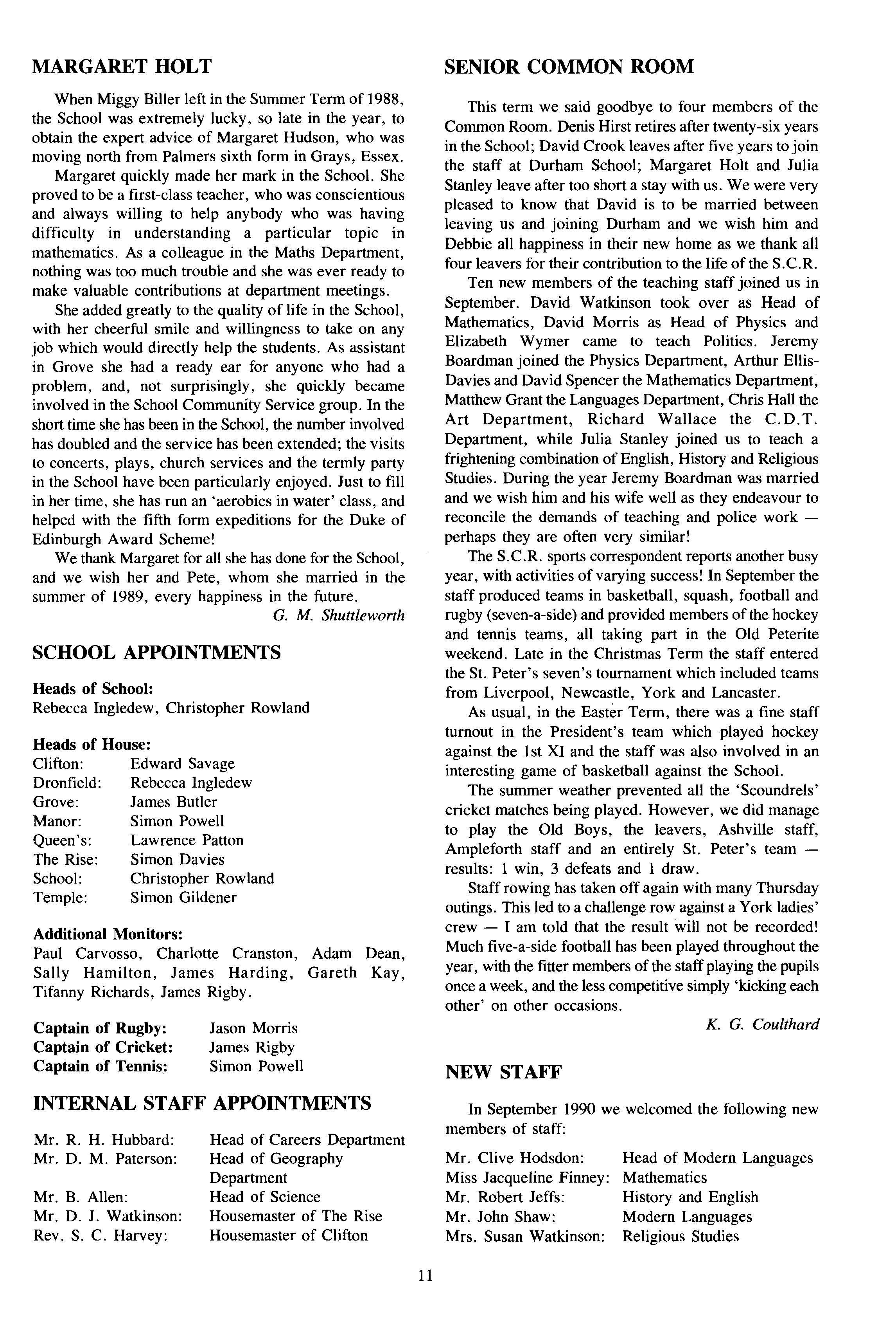 At the beginning of the year we welcomed Robert Shread (Chemistry), David Crook (French) and Peter Kingsbury (Mathematics), who is leaving us after a year to enter the preparatory school world At the end of the Easter Term Jane Dawson left and wewere very happy to learn ofthe arrival, soon after the Summer Term began, of a son toJane and Michael. Jane's place was taken by Robert Worsnop who came temporarily to teach Mathematics for the Summer Term. It all seems tobe happening in theMathematics Department and David Raggett is moving to the other side of York next term when he becomes a Head of Computer Studies, having strongly established the place ofcomputers in this School Our final farewell istoJean Dench whose baby isdue during the Summer holidays and we wish her well for this event and look forward to seeing her and Jane with their respective infants when they revisit the S.C.R.