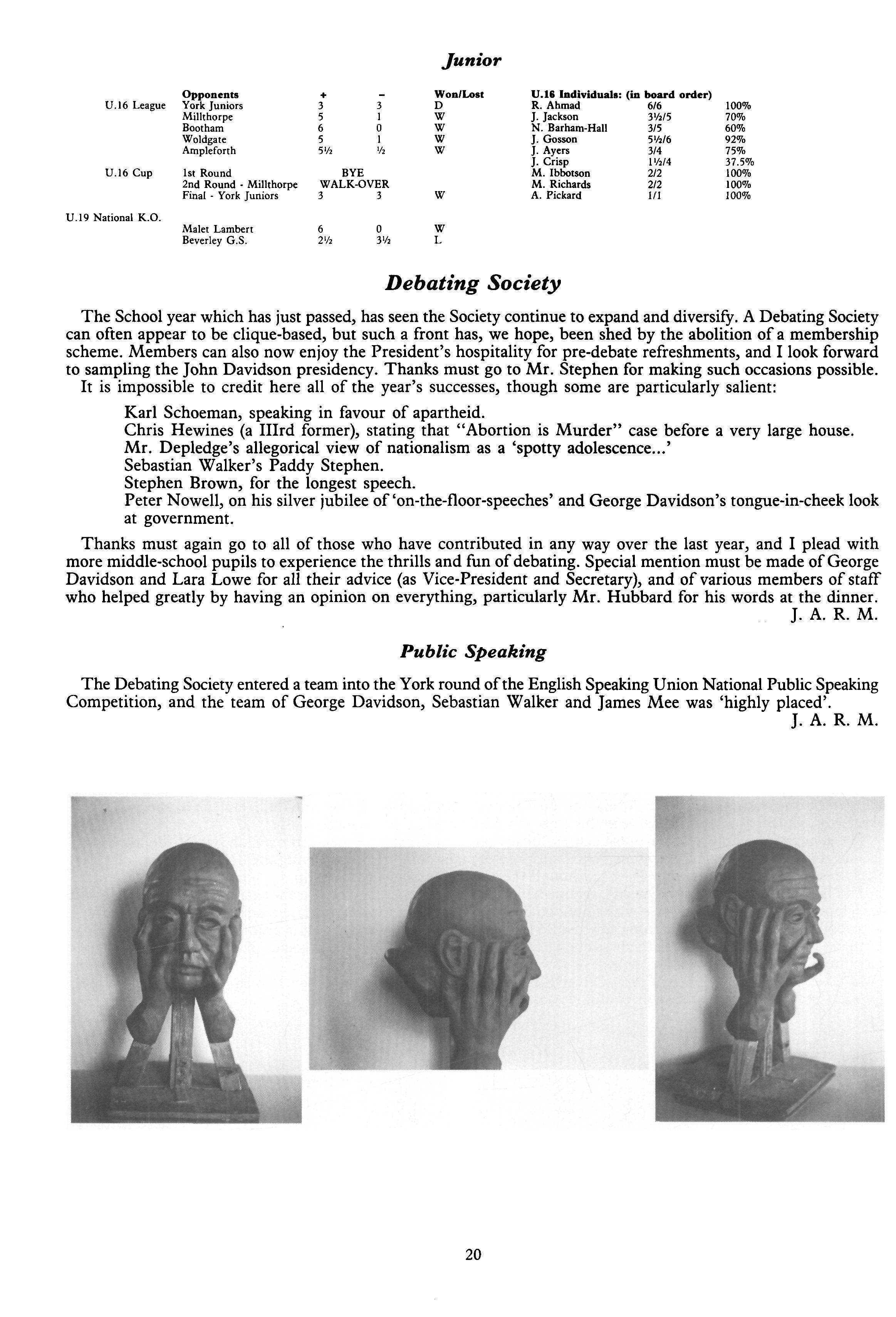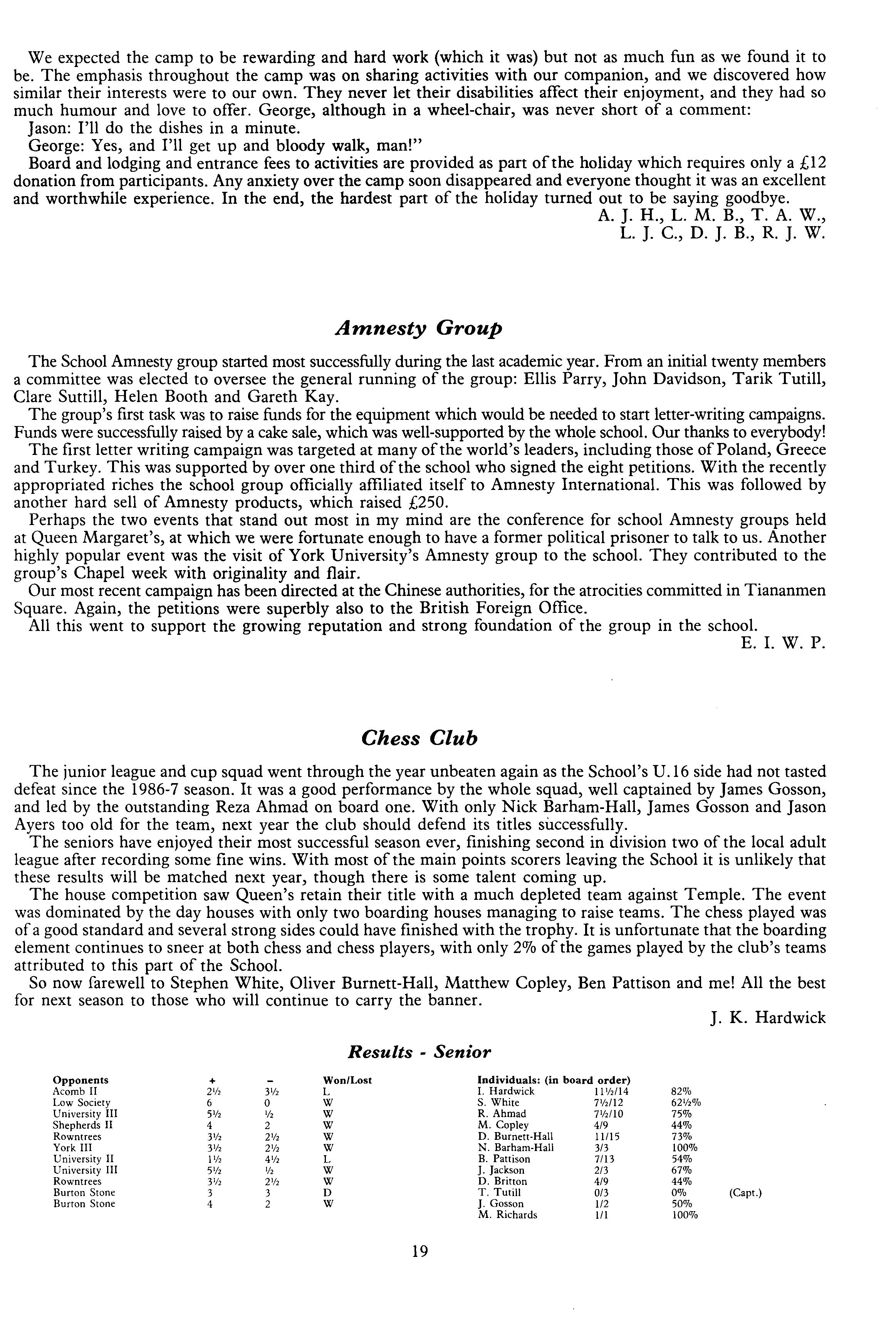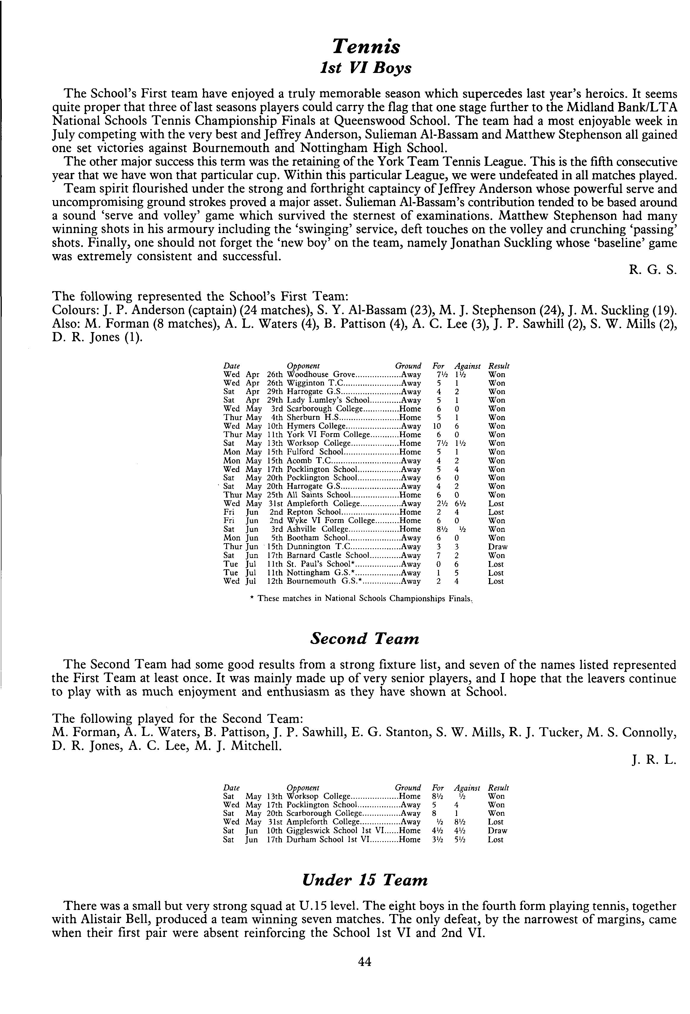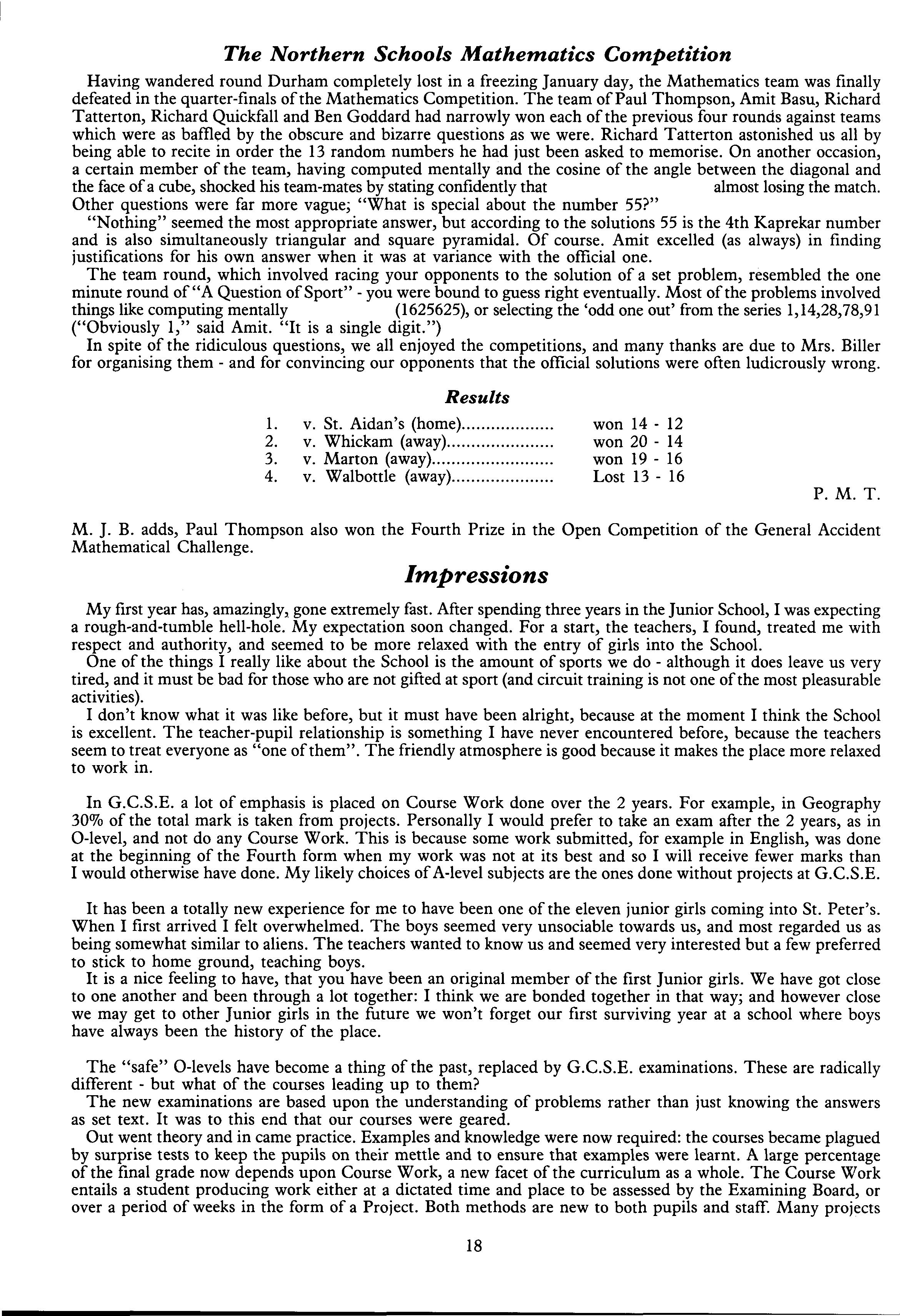 At the beginning of the year we welcomed Robert Shread (Chemistry), David Crook (French) and Peter Kingsbury (Mathematics), who is leaving us after a year to enter the preparatory school world At the end of the Easter Term Jane Dawson left and wewere very happy to learn ofthe arrival, soon after the Summer Term began, of a son toJane and Michael. Jane's place was taken by Robert Worsnop who came temporarily to teach Mathematics for the Summer Term. It all seems tobe happening in theMathematics Department and David Raggett is moving to the other side of York next term when he becomes a Head of Computer Studies, having strongly established the place ofcomputers in this School Our final farewell istoJean Dench whose baby isdue during the Summer holidays and we wish her well for this event and look forward to seeing her and Jane with their respective infants when they revisit the S.C.R.