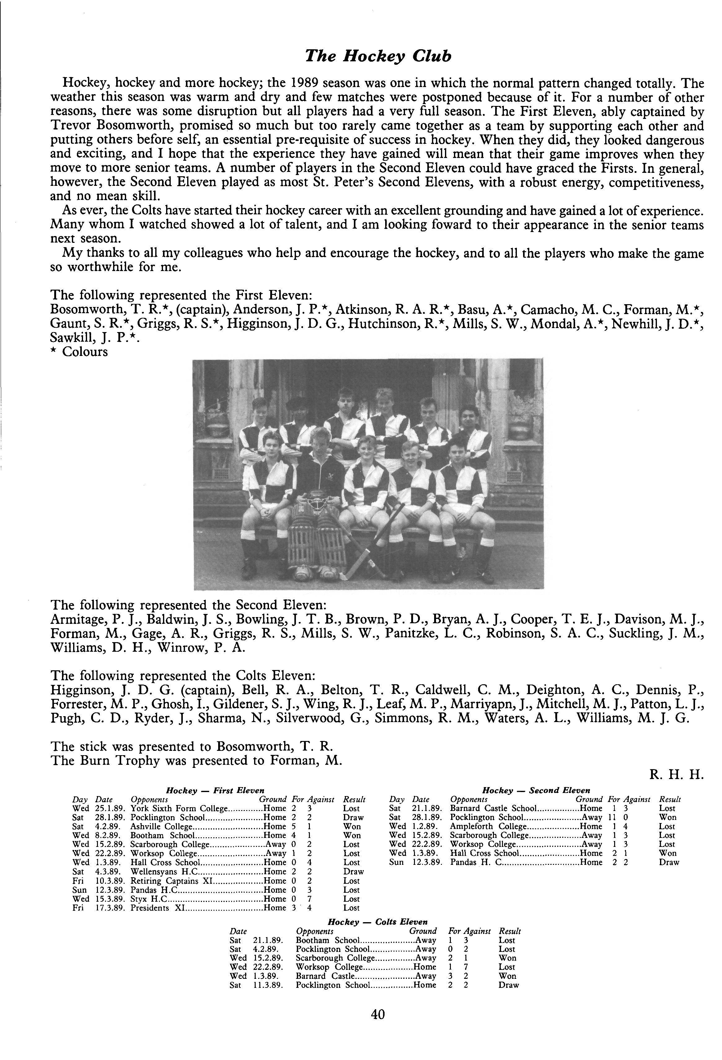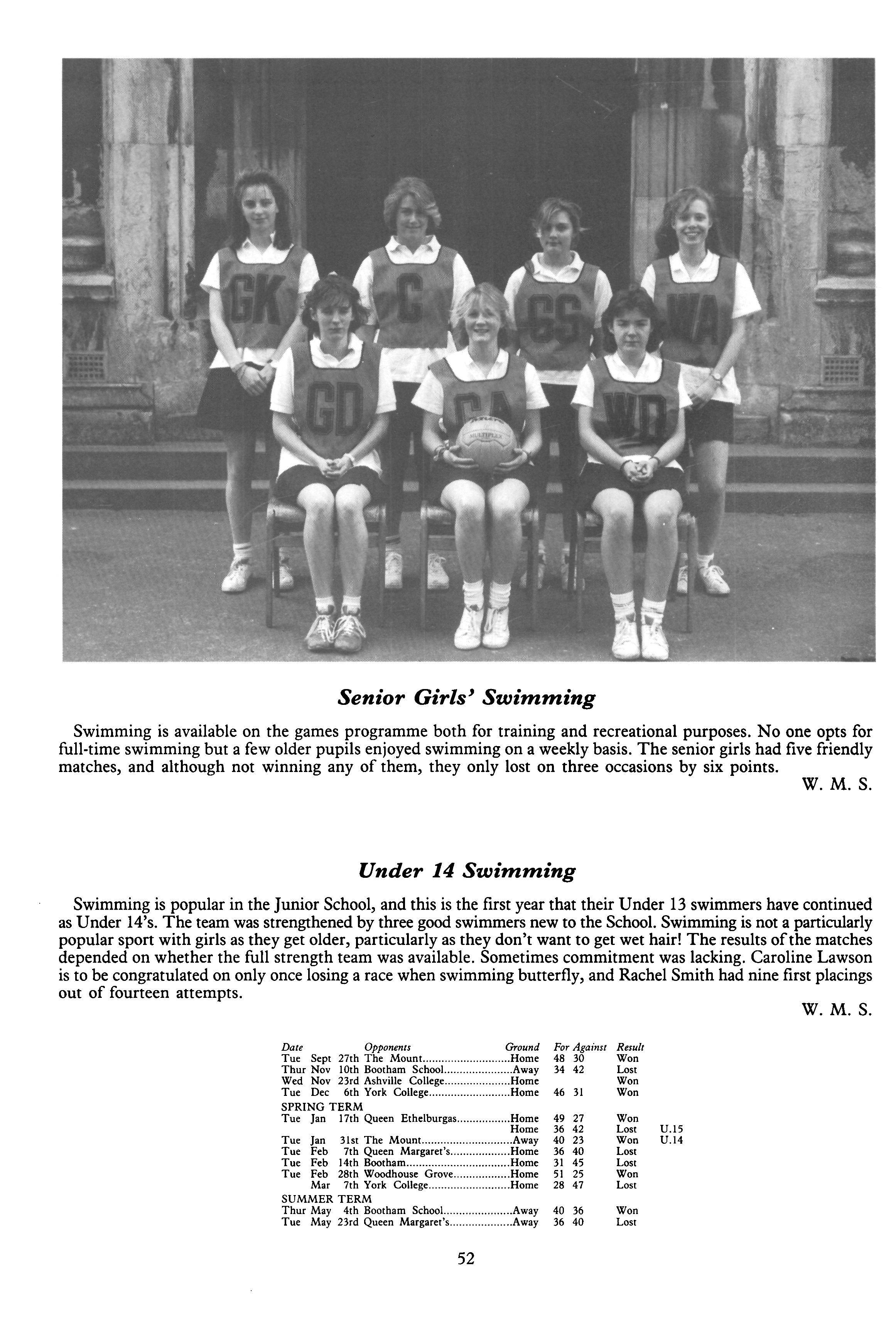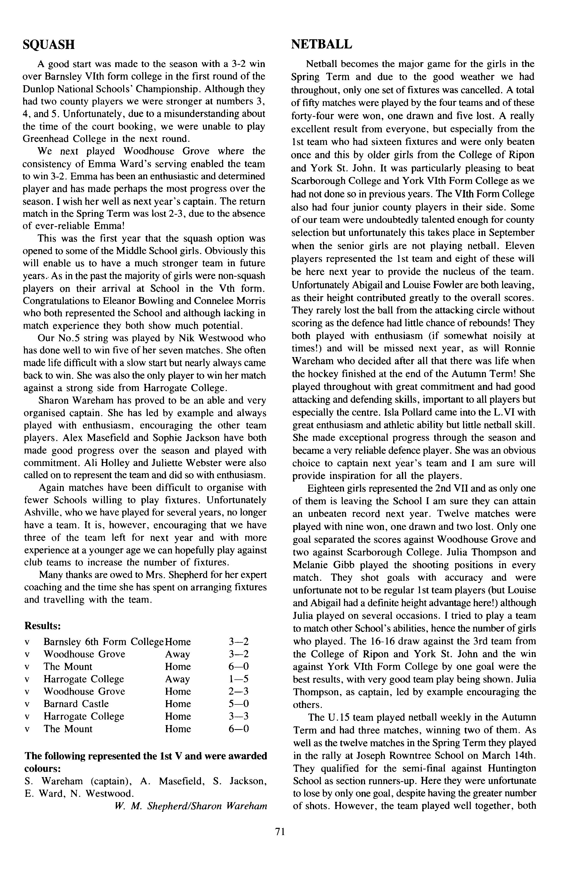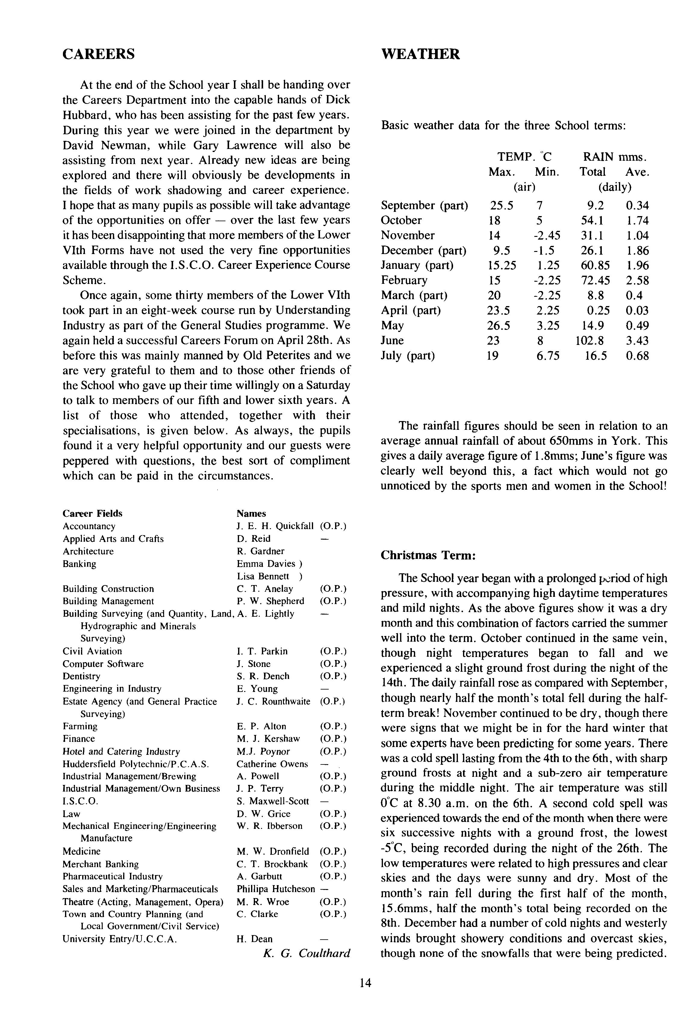 At the beginning of the year we welcomed Robert Shread (Chemistry), David Crook (French) and Peter Kingsbury (Mathematics), who is leaving us after a year to enter the preparatory school world At the end of the Easter Term Jane Dawson left and wewere very happy to learn ofthe arrival, soon after the Summer Term began, of a son toJane and Michael. Jane's place was taken by Robert Worsnop who came temporarily to teach Mathematics for the Summer Term. It all seems tobe happening in theMathematics Department and David Raggett is moving to the other side of York next term when he becomes a Head of Computer Studies, having strongly established the place ofcomputers in this School Our final farewell istoJean Dench whose baby isdue during the Summer holidays and we wish her well for this event and look forward to seeing her and Jane with their respective infants when they revisit the S.C.R.