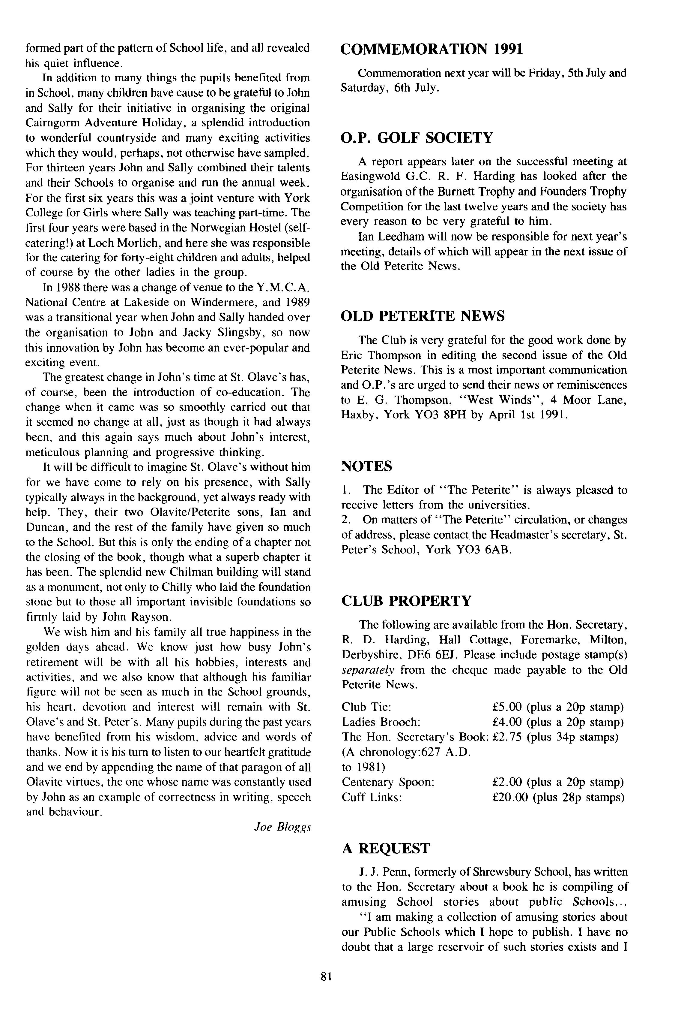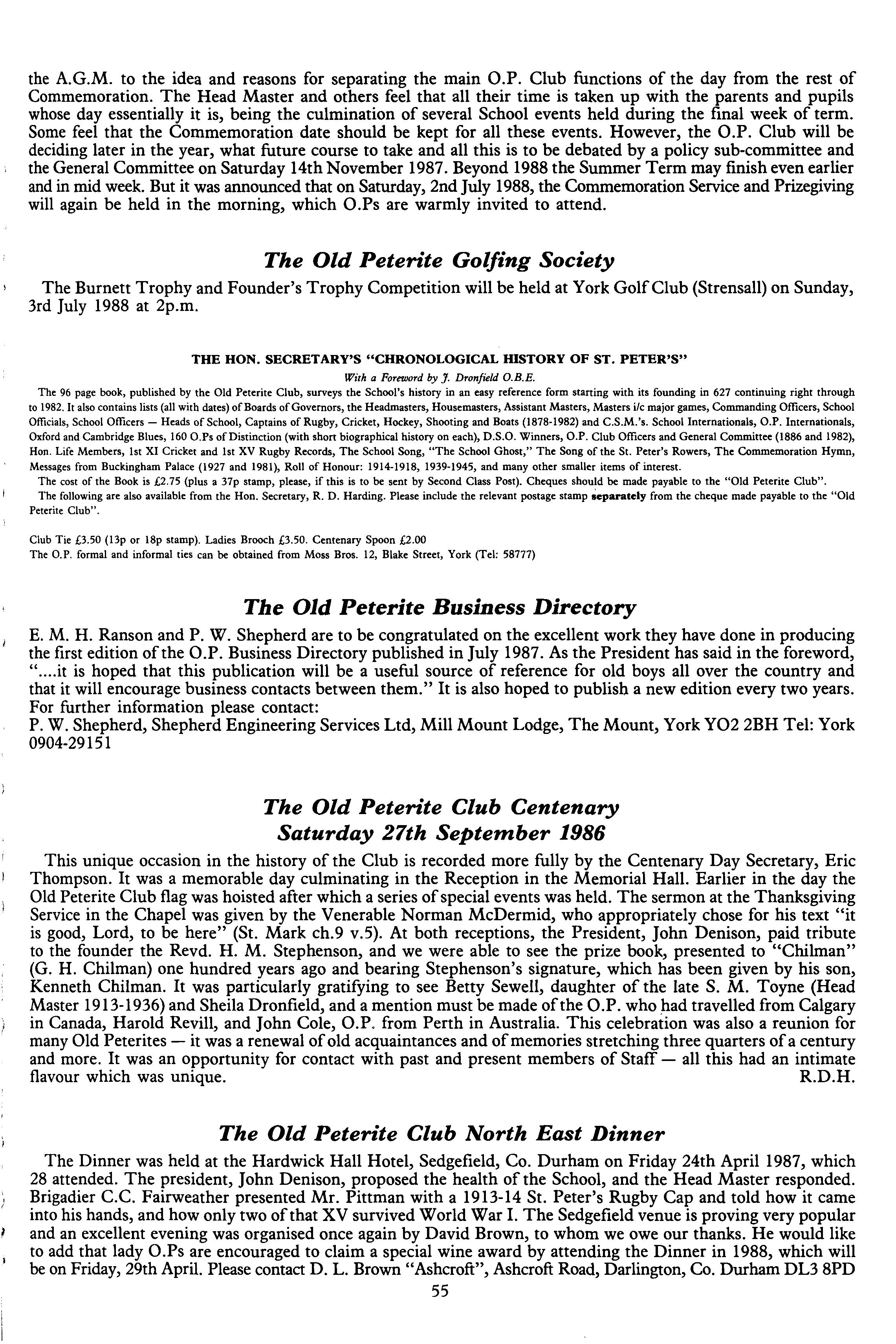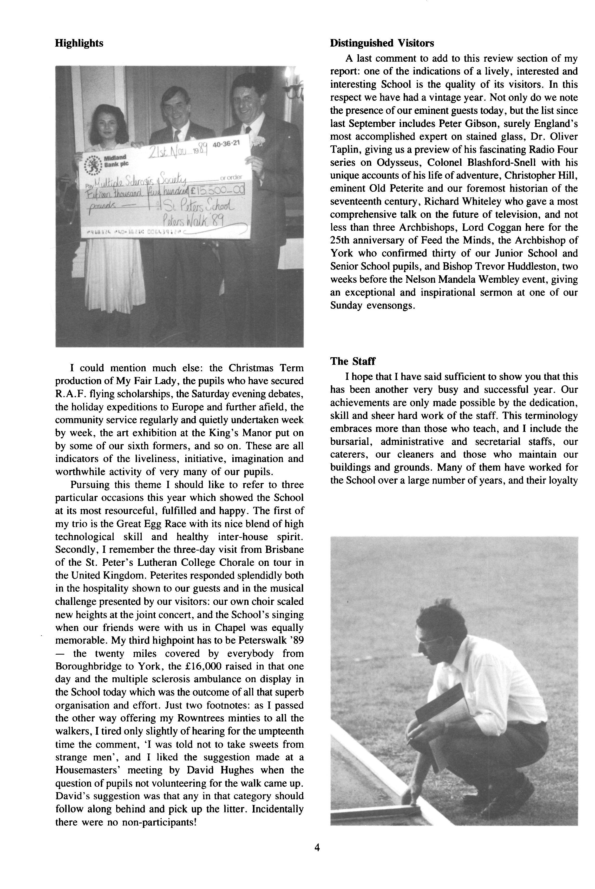 And now to theyear that has passed One ofmyfirst taskswasto produce new prospectuses for both St Peter's and St Olave's I am a believer in good publicity: my purpose is not to market the School as though it were a brand of washing powder, which would be a cynical excercise bringing to mind the remark made of Lord Kitchener that he may not have been a good general but he made a good poster However, it is surely right that this School's history, fine facilities, many educational opportunities are better known to those who are considering us for their children Better publicity then isimportant, but it iswellto remember that aschool's best ambassadors are its Old Boysand its parents I take this opportunity of congratulating the Old Peterite Club on reaching its centenary this year One of my agreeable duties in the last few months has been to attend the various O.P dinners, to meet O.Ps and to tell them what is happening back in York I thank them for their welcome on these occasions: we value their continuing affection and interest in us and wish them particularly well for their hundredth birthday celebration to be held here on 27th September.