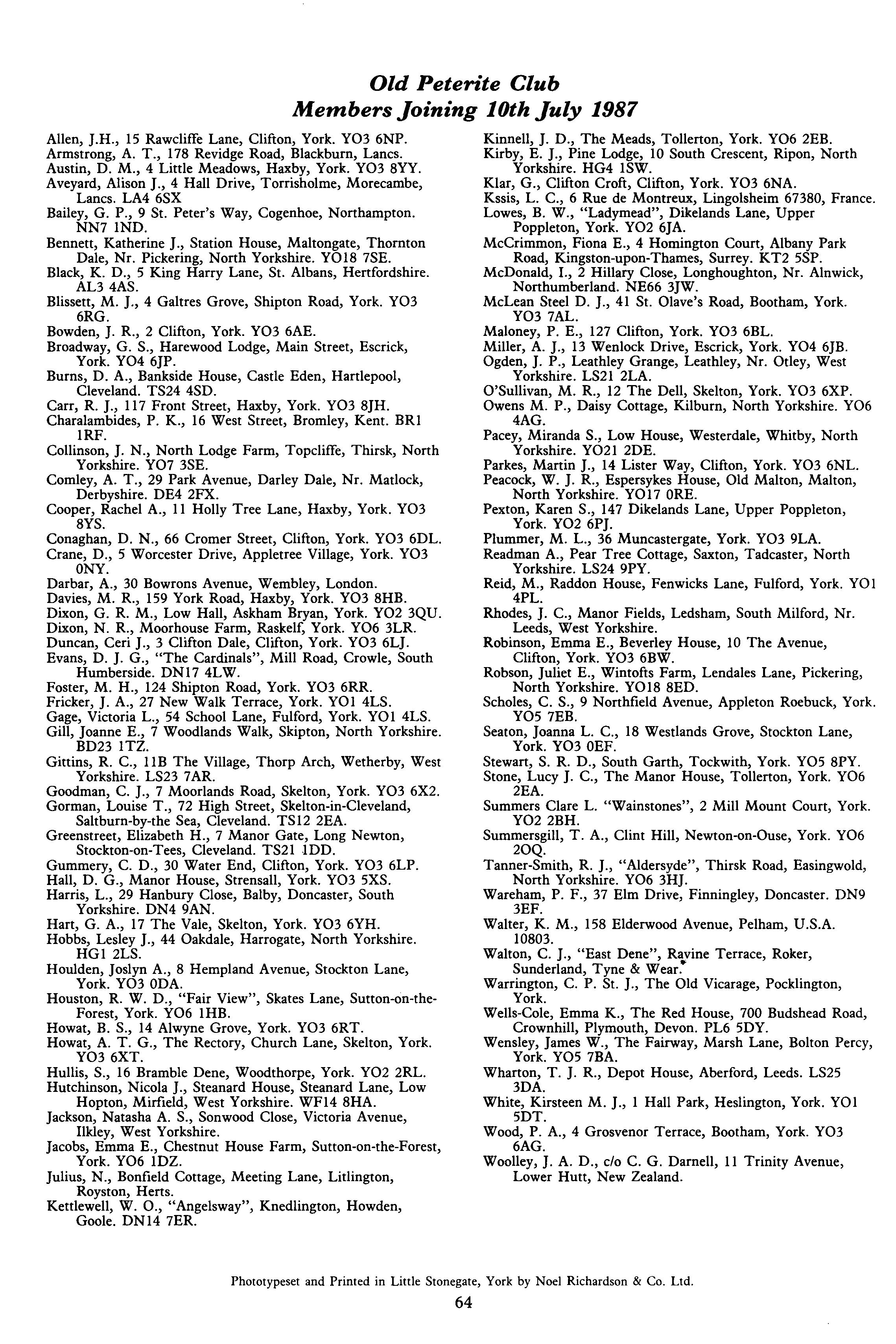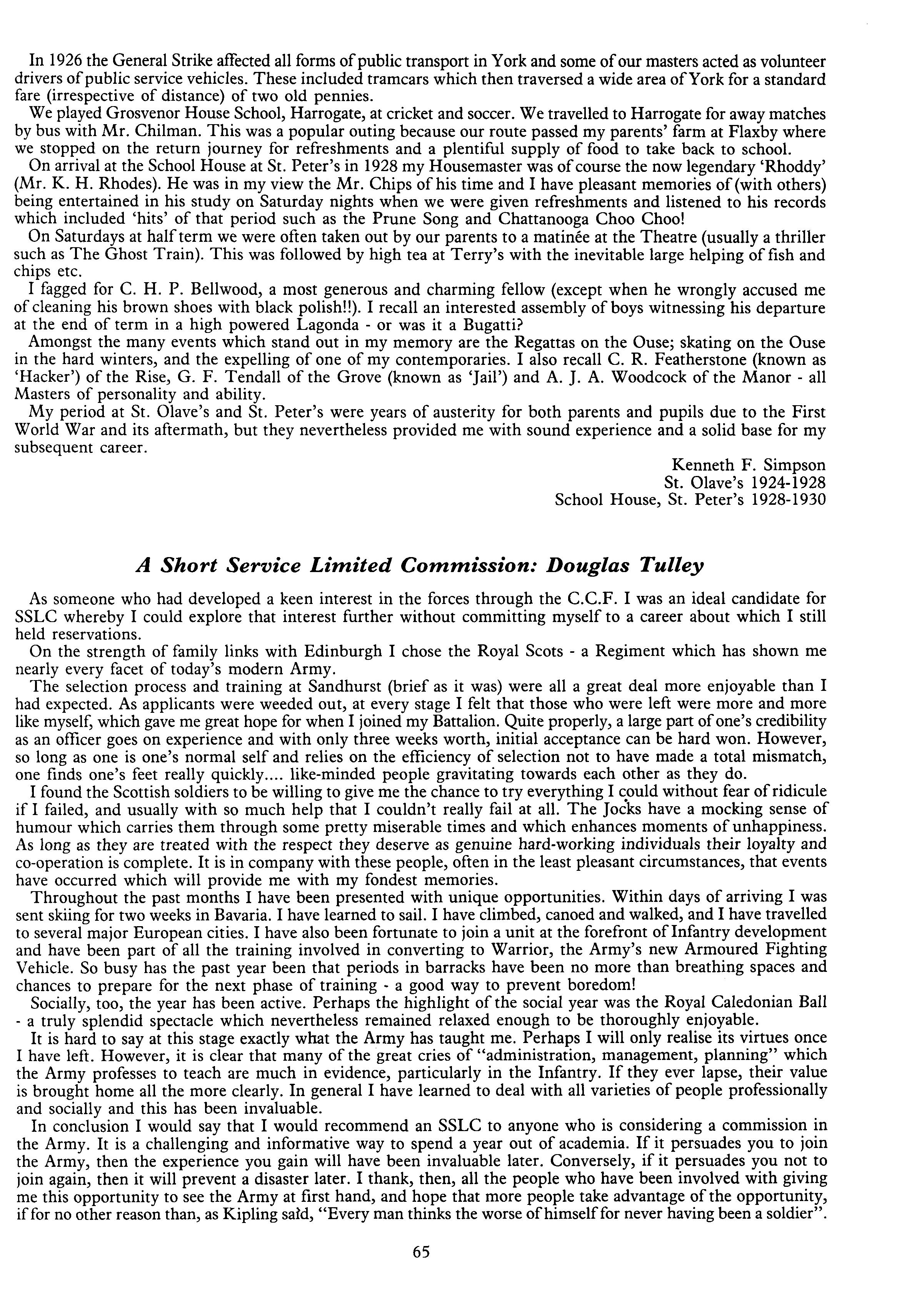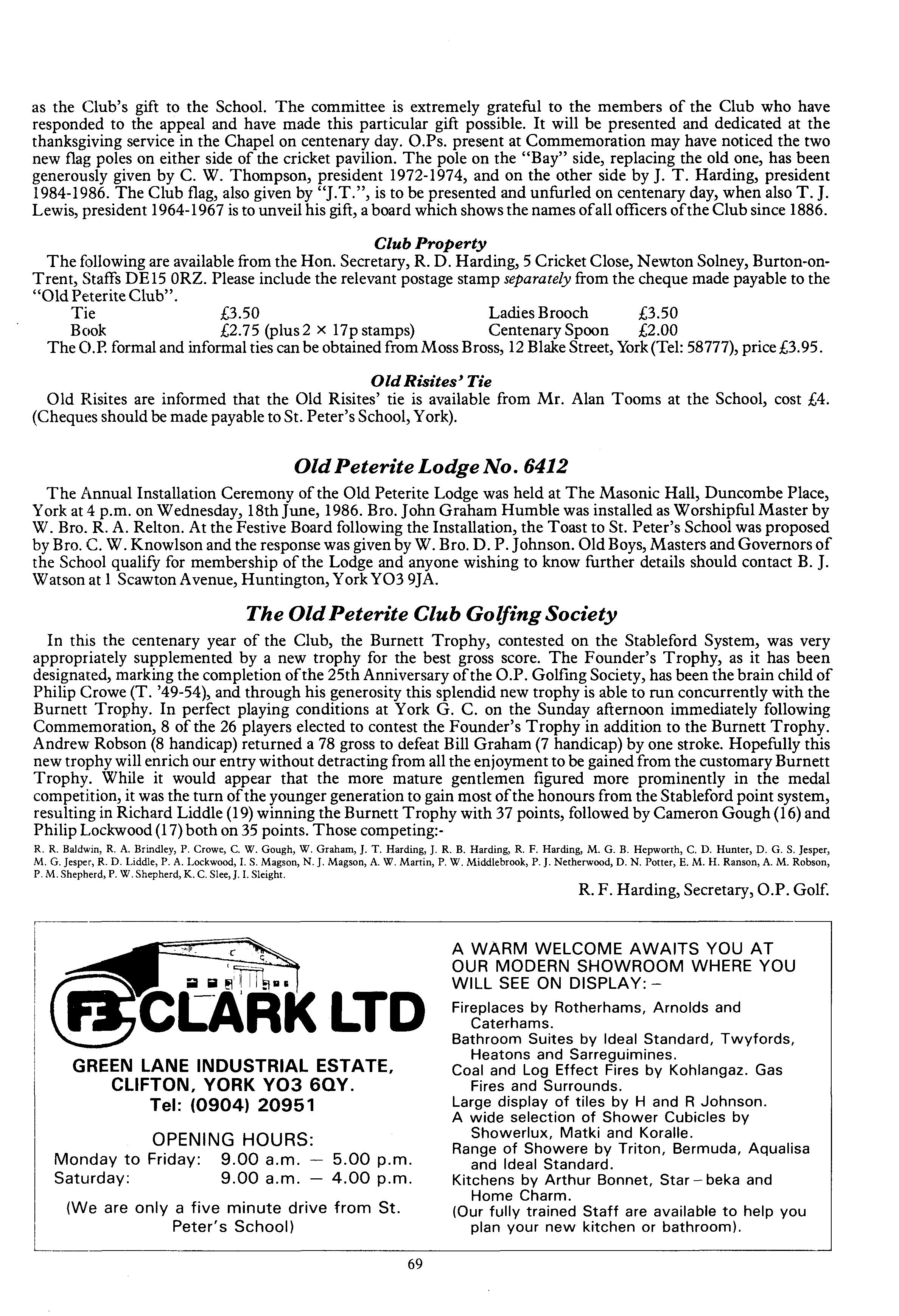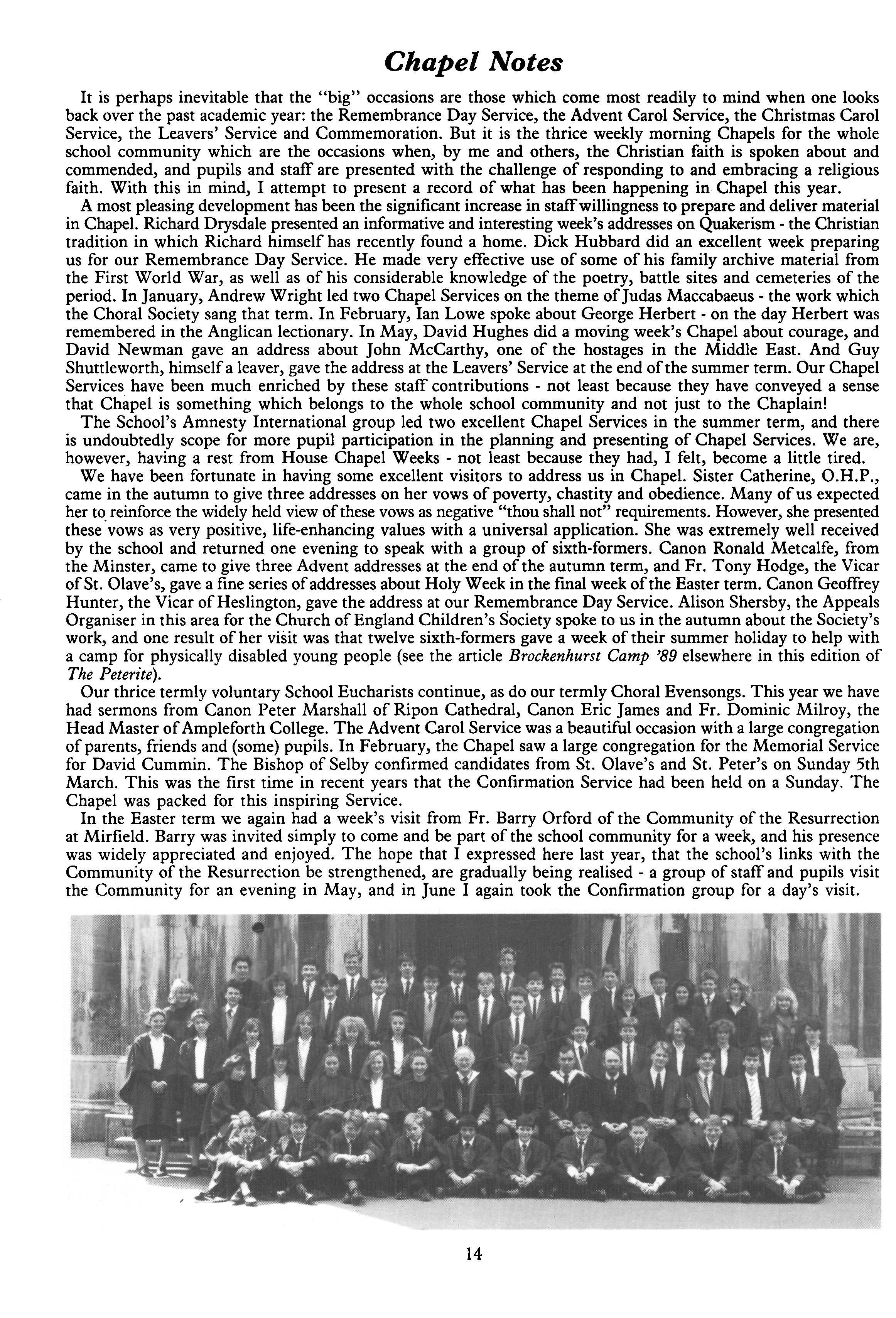 And now to theyear that has passed One ofmyfirst taskswasto produce new prospectuses for both St Peter's and St Olave's I am a believer in good publicity: my purpose is not to market the School as though it were a brand of washing powder, which would be a cynical excercise bringing to mind the remark made of Lord Kitchener that he may not have been a good general but he made a good poster However, it is surely right that this School's history, fine facilities, many educational opportunities are better known to those who are considering us for their children Better publicity then isimportant, but it iswellto remember that aschool's best ambassadors are its Old Boysand its parents I take this opportunity of congratulating the Old Peterite Club on reaching its centenary this year One of my agreeable duties in the last few months has been to attend the various O.P dinners, to meet O.Ps and to tell them what is happening back in York I thank them for their welcome on these occasions: we value their continuing affection and interest in us and wish them particularly well for their hundredth birthday celebration to be held here on 27th September.