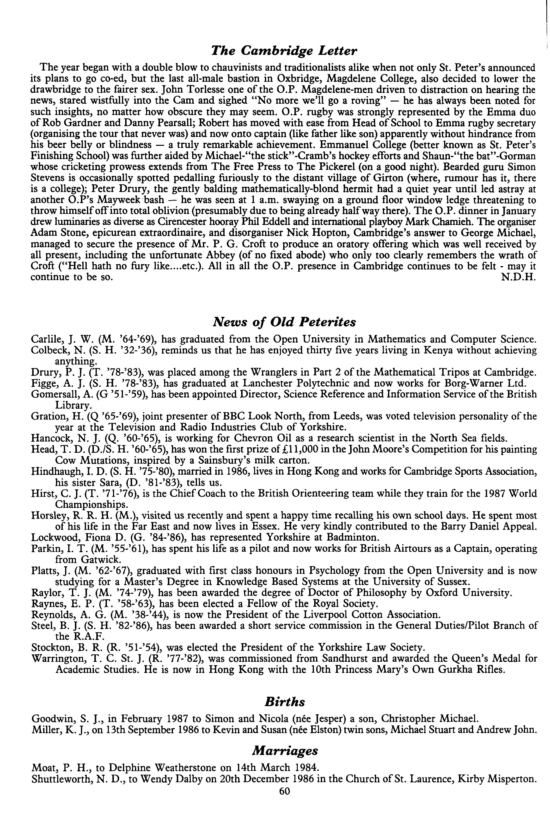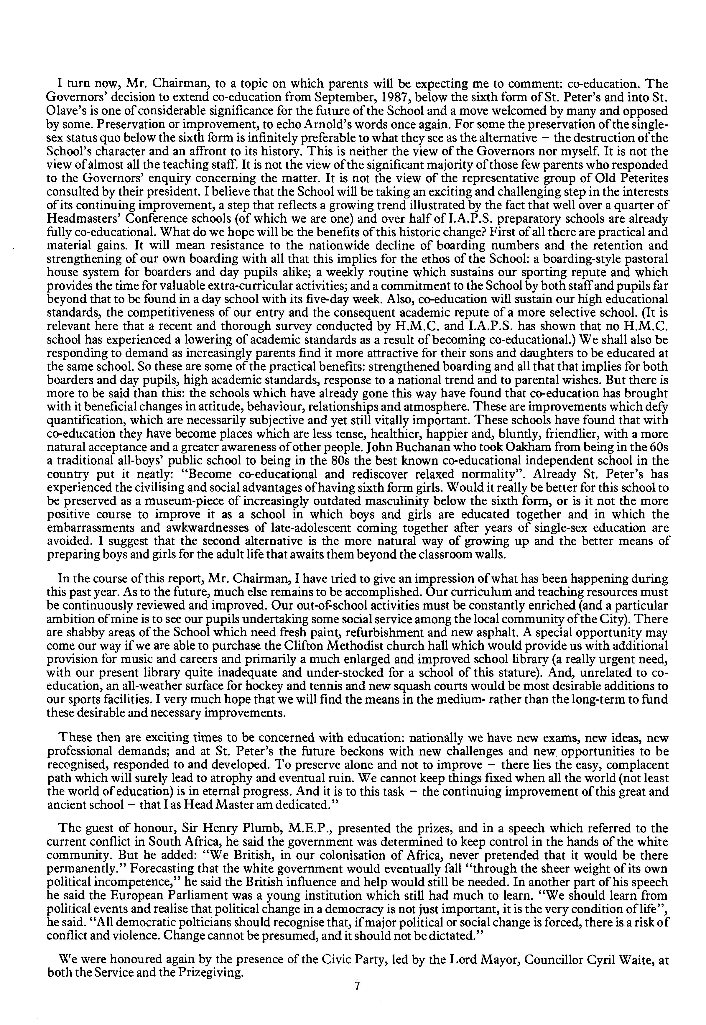 I turn now, Mr. Chairman, to a topic on which parents will be expecting me to comment: co-education. The Governors' decision to extend co-education from September, 1987, below the sixth form of St. Peter's and into St. Olave's is one of considerable significance for the future ofthe School and a move welcomed by many and opposed by some. Preservation or improvement, to echoArnold's words once again. For some the preservation ofthe singlesex status quo below the sixth form is infinitely preferable to what they see asthe alternative - the destruction ofthe School's character and an affront to its history. This is neither the view of the Governors nor myself. It is not the view ofalmost all the teaching staff. It is not the view ofthe significant majority ofthose few parents who responded to the Governors' enquiry concerning the matter It is not the view of the representative group of Old Peterites consulted by their president Ibelieve that the School will be taking an exciting and challenging step in the interests of its continuing improvement, a step that reflects a growing trend illustrated by the fact that well over aquarter of Headmasters' Conference schools (of which we are one) and over half of I.A.P.S preparatory schools are already fully co-educational What do we hope will be the benefits ofthis historic change? First ofall there are practical and material gains It will mean resistance to the nationwide decline of boarding numbers and the retention and strengthening of our own boarding with all that this implies for the ethos of the School: a boarding-style pastoral house system for boarders and day pupils alike; a weekly routine which sustains our sporting repute and which provides the time for valuable extra-curricular activities;and acommitment to the Schoolbyboth staffand pupils far beyond that to be found in aday school with itsfive-dayweek Also, co-education will sustain our high educational standards, the competitiveness of our entry and the consequent academic repute of a more selective school. (It is relevant here that a recent and thorough survey conducted by H.M.C. and I.A.P.S. has shown that no H.M.C. school has experienced a lowering of academic standards as a result of becoming co-educational.) We shall also be responding to demand as increasingly parents find it more attractive for their sons and daughters to be educated at the same school. So these are some ofthe practical benefits: strengthened boarding and all that that implies for both boarders and day pupils, high academic standards, response to a national trend and to parental wishes. But there is more to be said than this: the schools which have already gone this way have found that co-education has brought with itbeneficial changes in attitude, behaviour, relationships and atmosphere. These are improvements which defy quantification, which are necessarily subjective and yet still vitally important These schools have found that with co-education they have become places which are less tense, healthier, happier and, bluntly, friendlier, with a more natural acceptance and agreater awareness ofother people John Buchanan who took Oakham from being in the 60s a traditional all-boys' public school to being in the 80s the best known co-educational independent school in the country put it neatly: "Become co-educational and rediscover relaxed normality" Already St Peter's has experienced the civilising and social advantages ofhaving sixth form girls Would it really bebetter for this school to be preserved as a museum-piece of increasingly outdated masculinity below the sixth form, or is it not the more positive course to improve it as a school in which boys and girls are educated together and in which the embarrassments and awkwardnesses of late-adolescent coming together after years of single-sex education are avoided I suggest that the second alternative is the more natural way of growing up and the better means of preparing boys and girls for the adult life that awaitsthem beyond the classroom walls